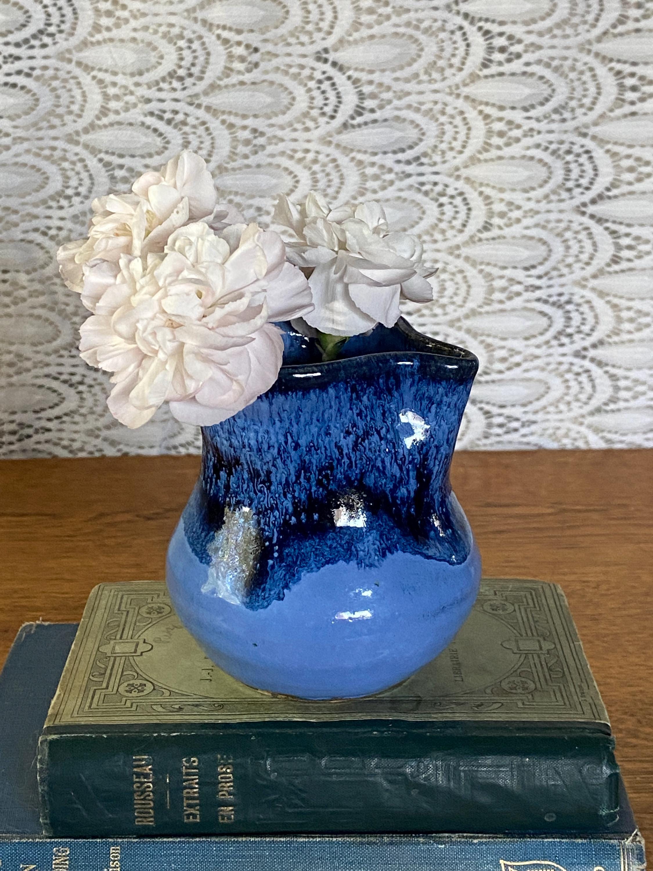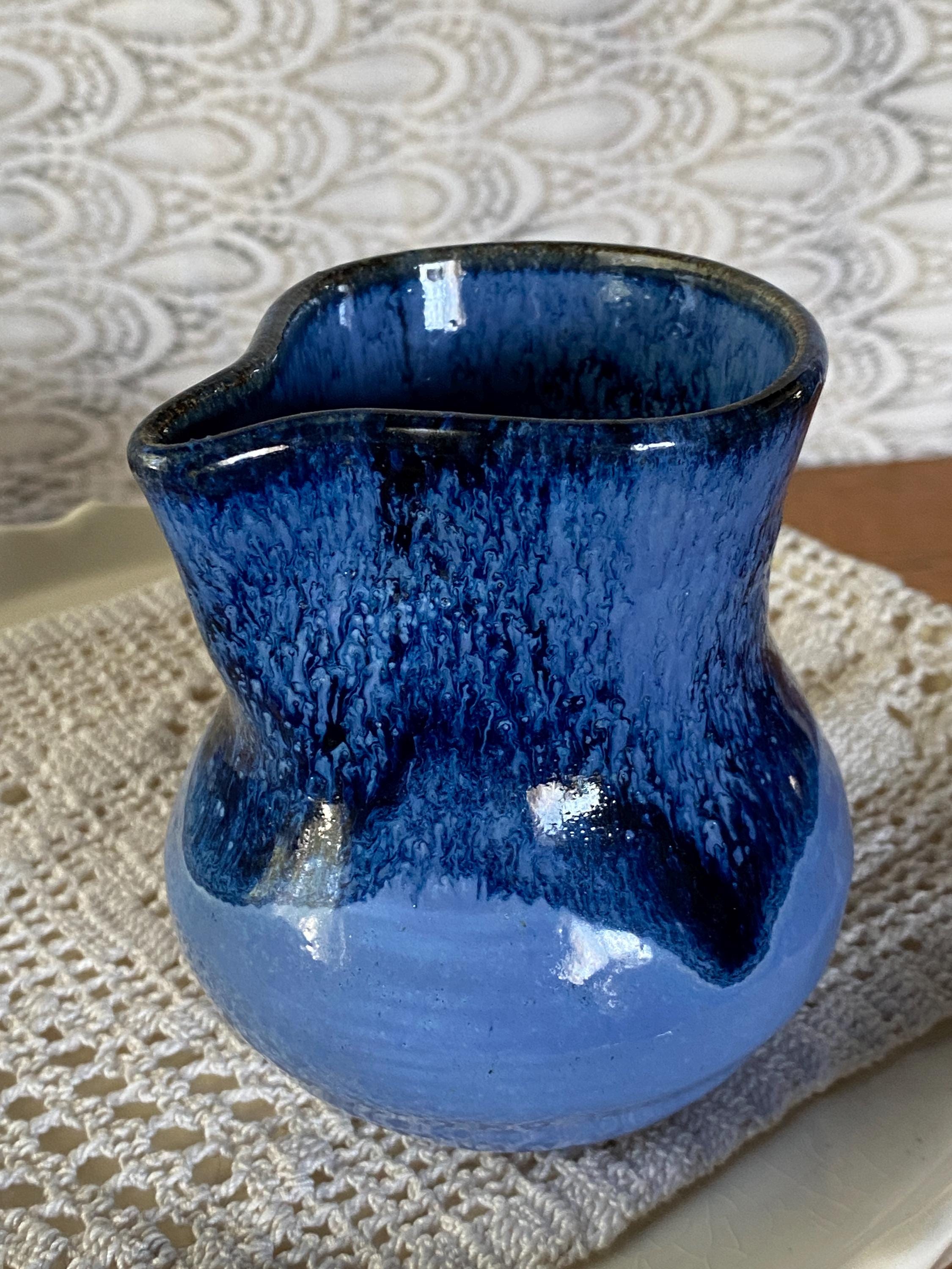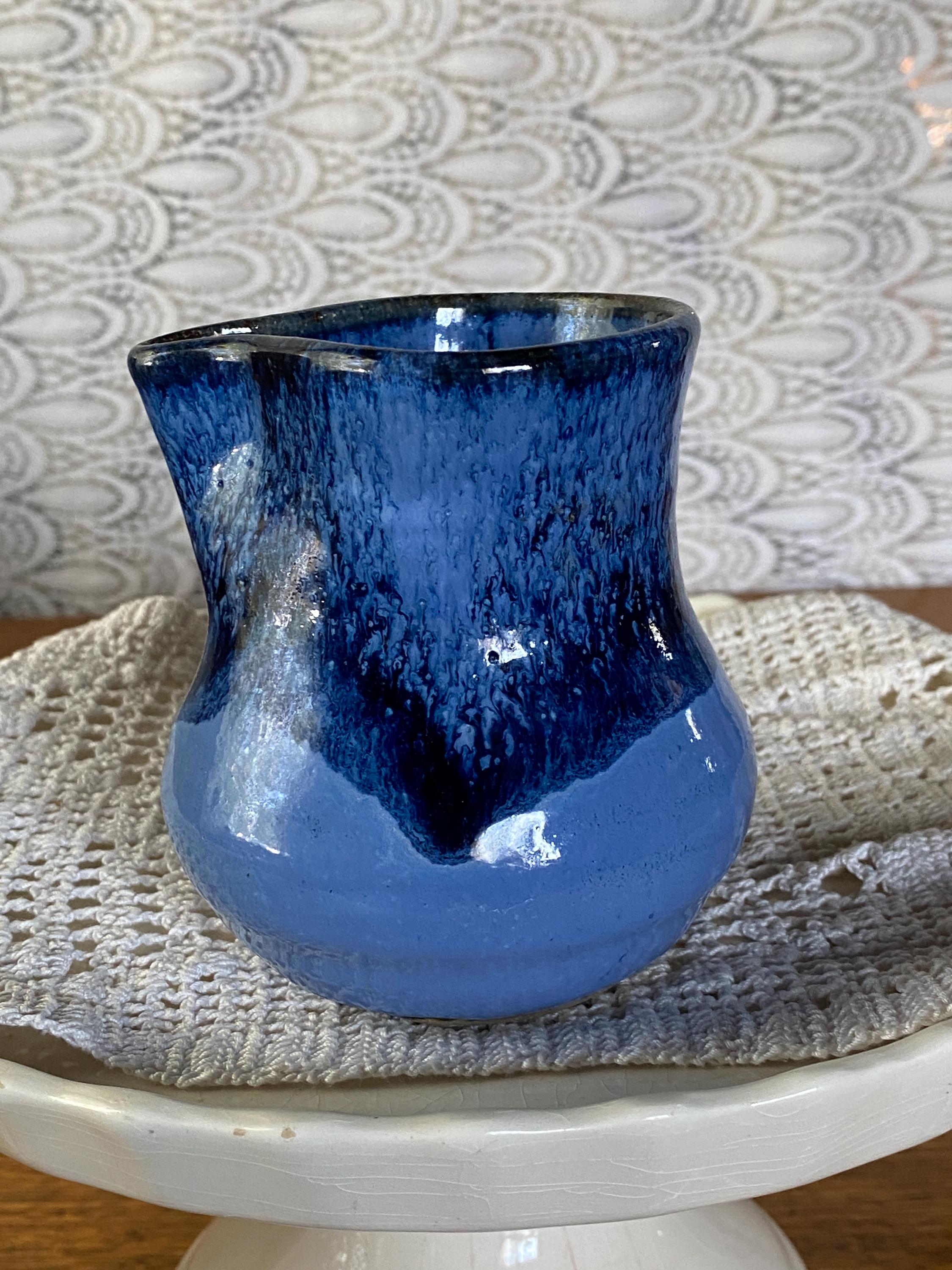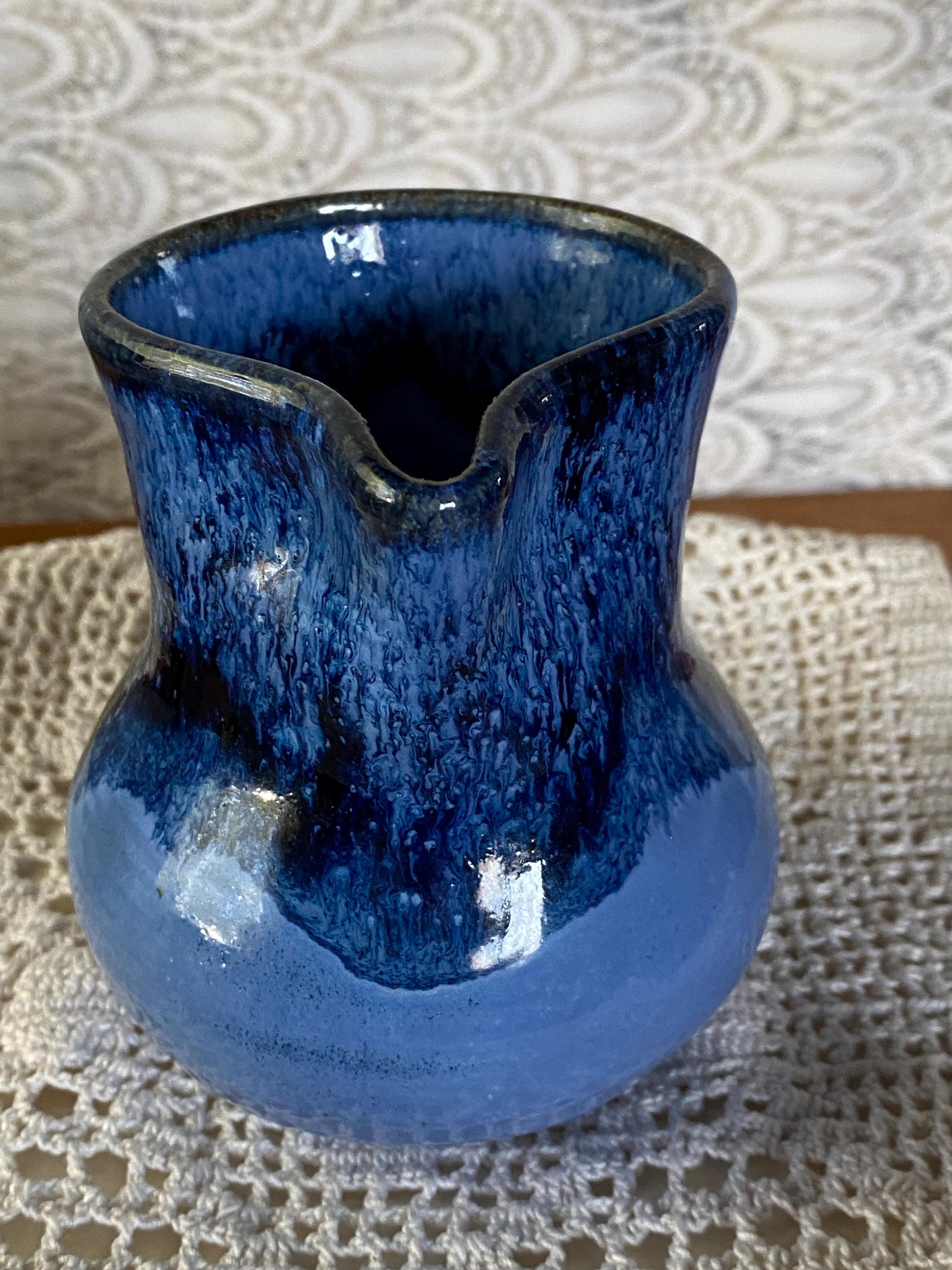 Cute little studio pottery piece that styles great as small pitcher, creamer, or vase. The glaze on this one is so pretty - a deep blue that is almost purple in places. Great in a cottage or farmhouse styled space. Approximately 3.25" X4" X 3."