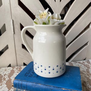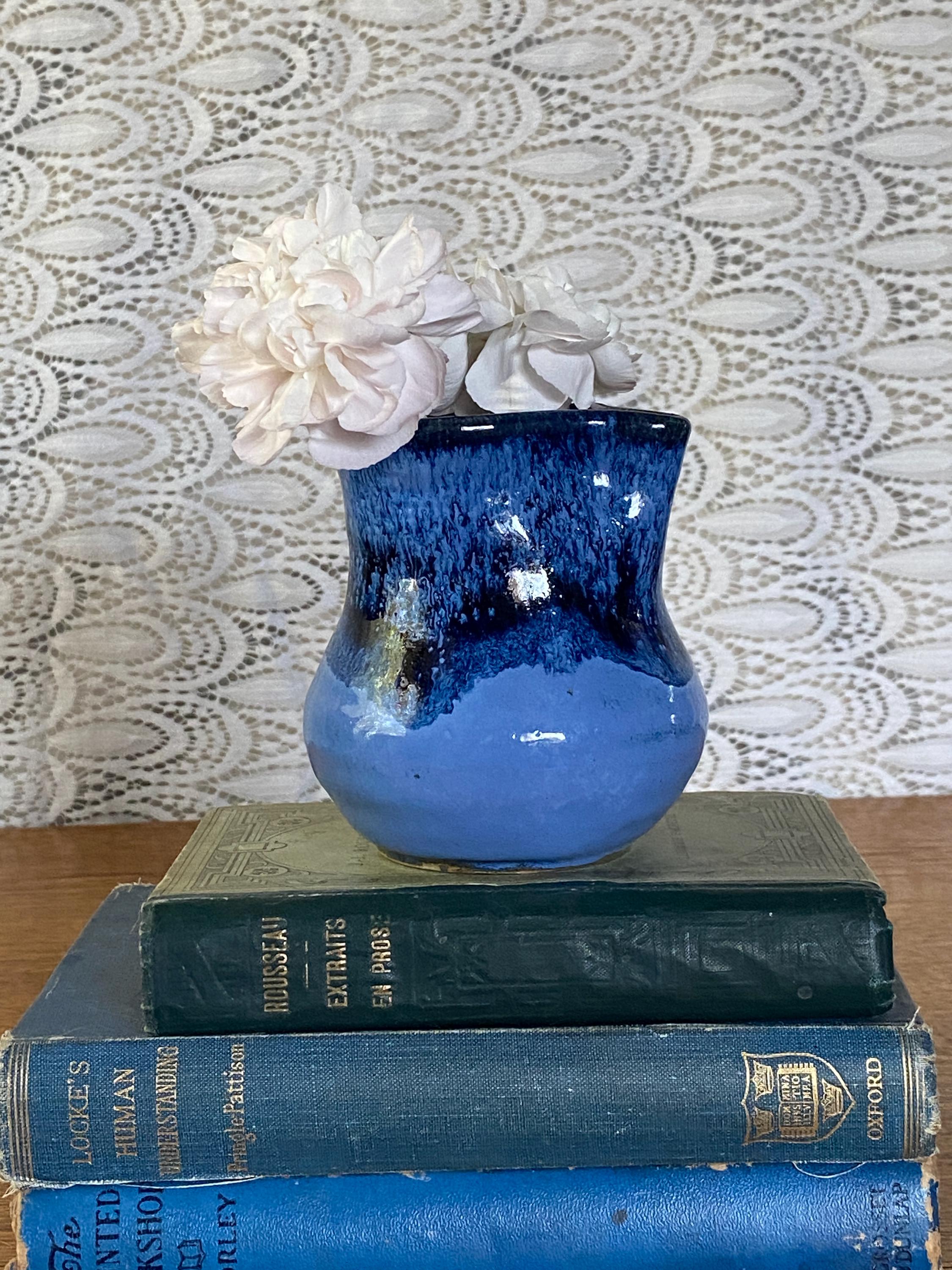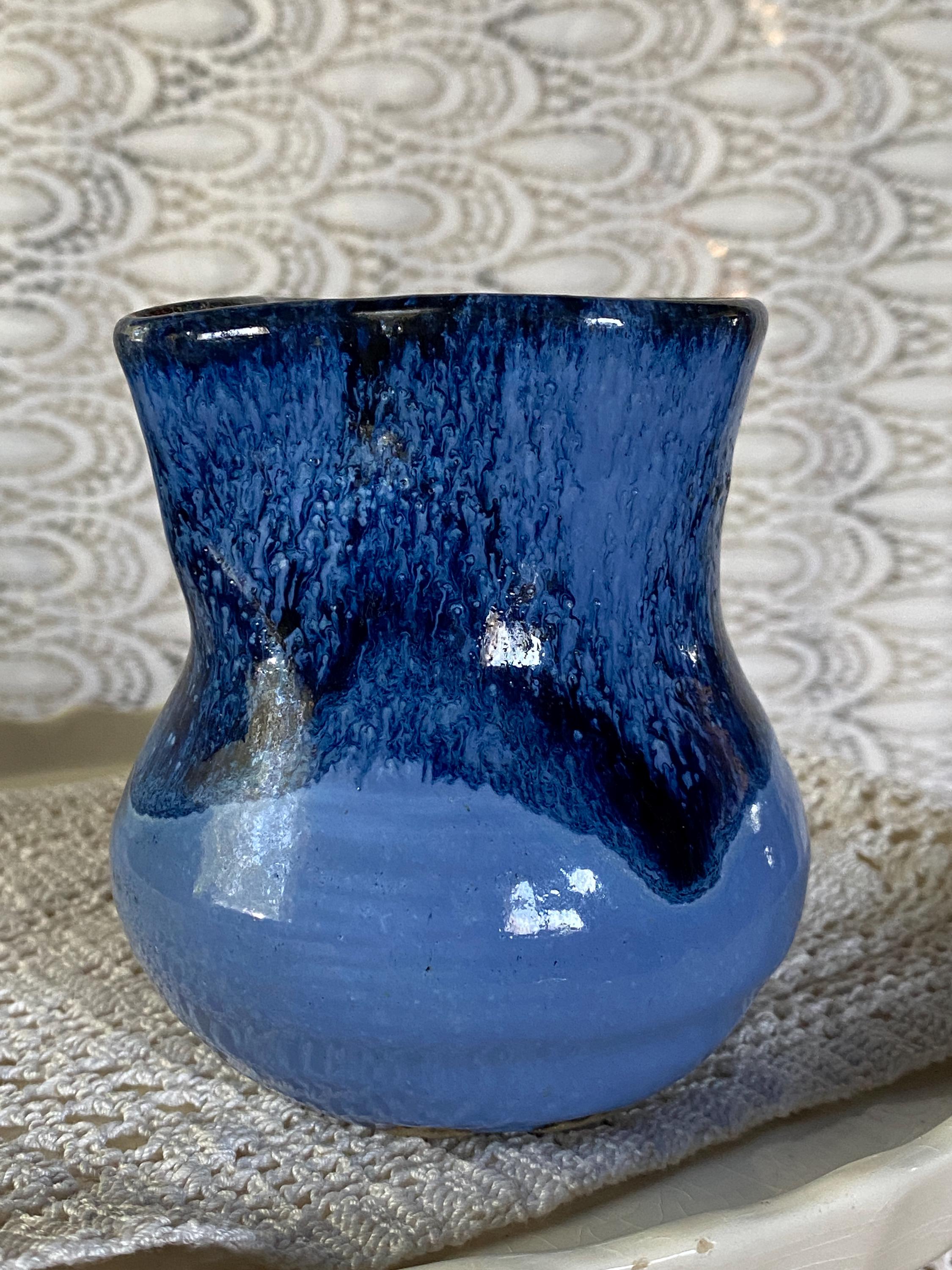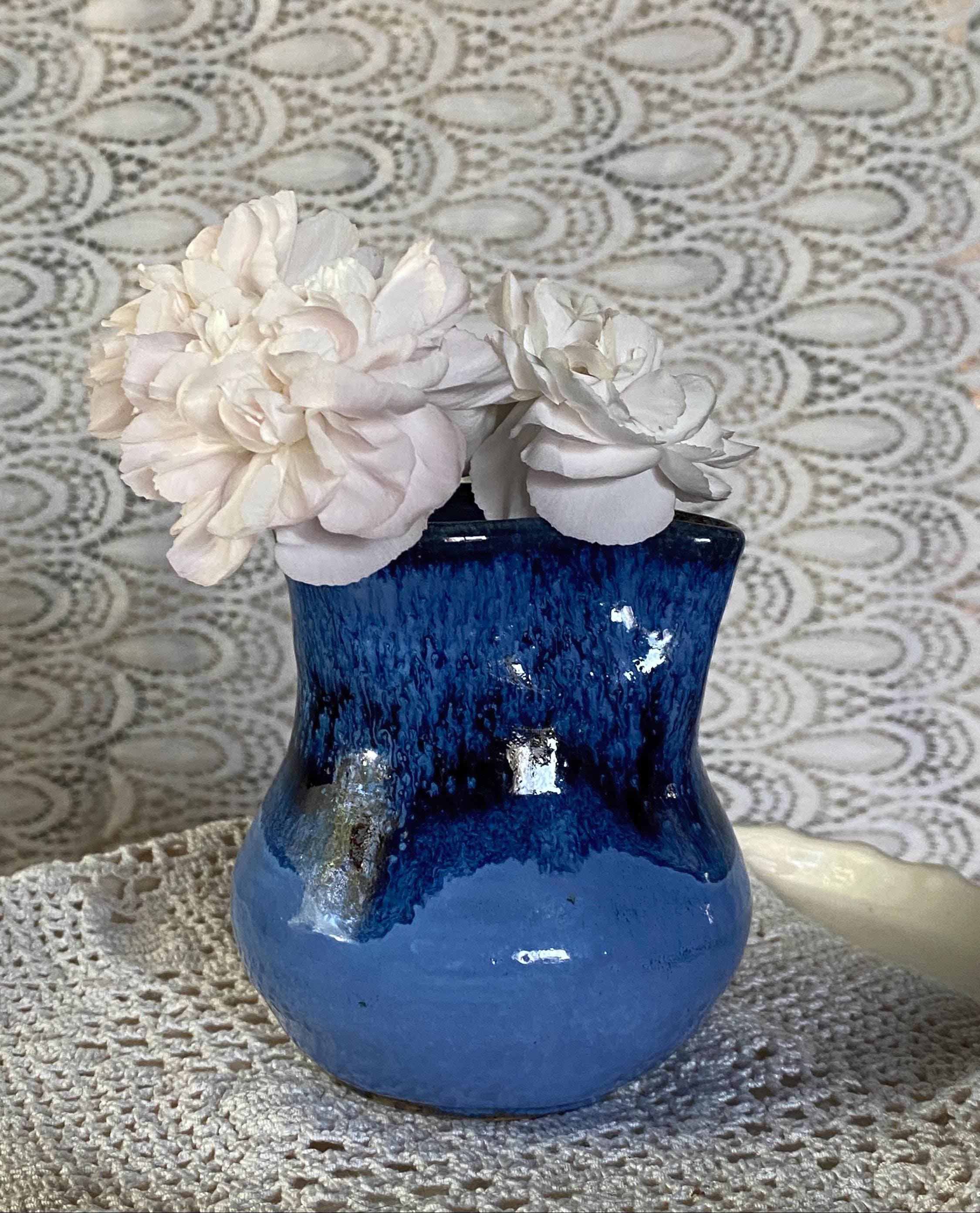 Cute little studio pottery piece that styles great as small pitcher, creamer, or vase. The glaze on this one is so pretty - a deep blue that is almost purple in places. Great in a cottage or farmhouse styled space. Approximately 3.25" X4" X 3."
