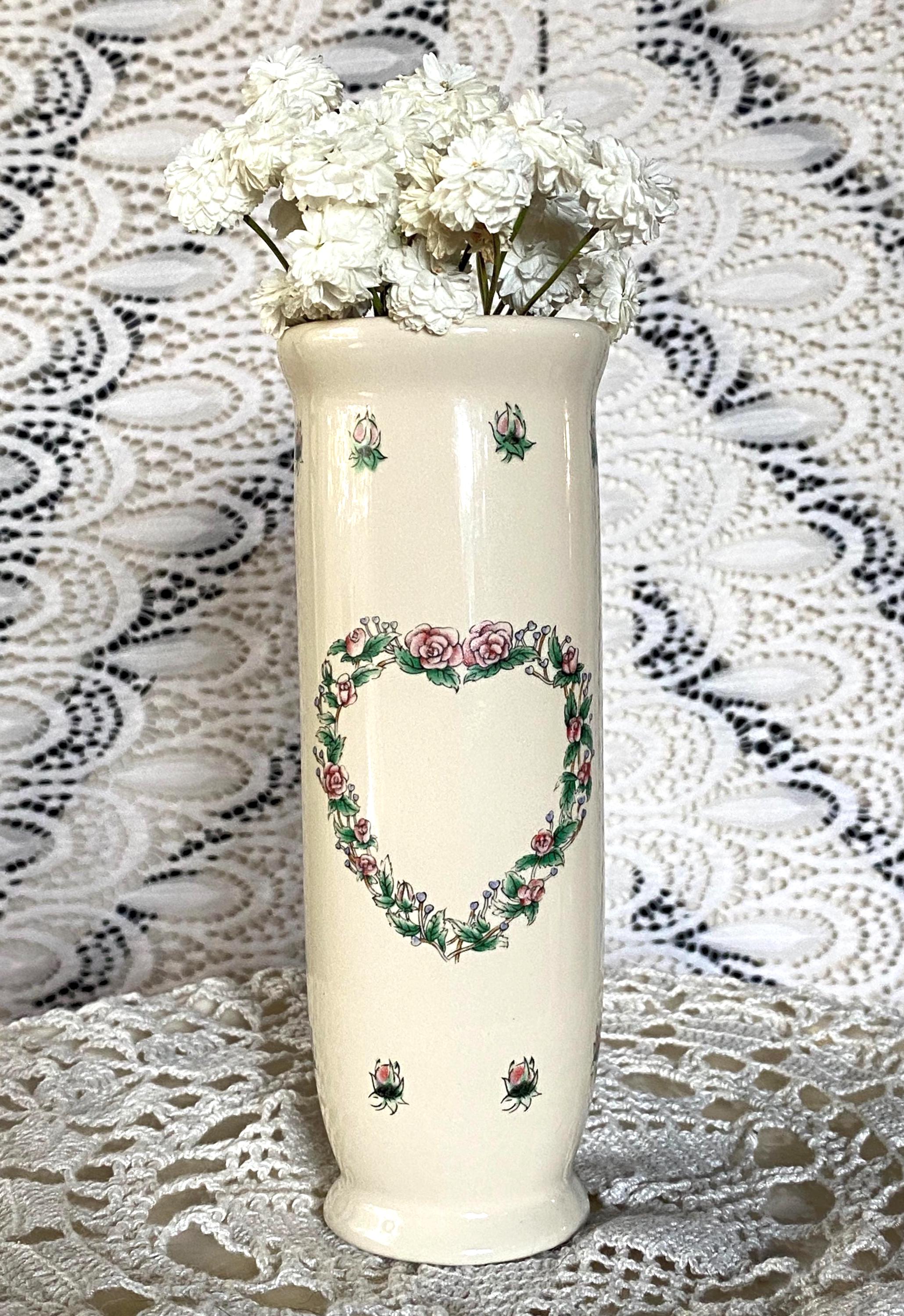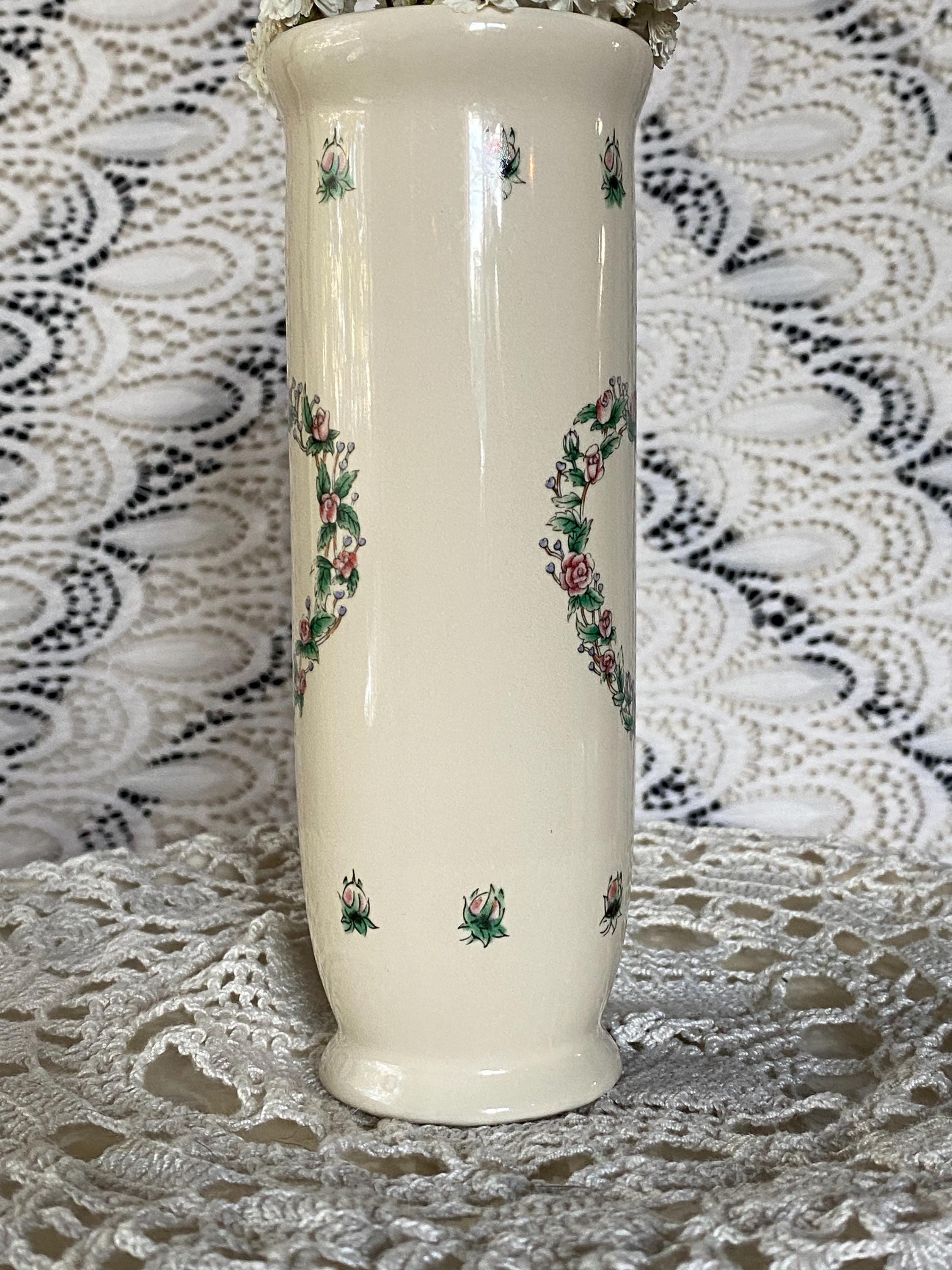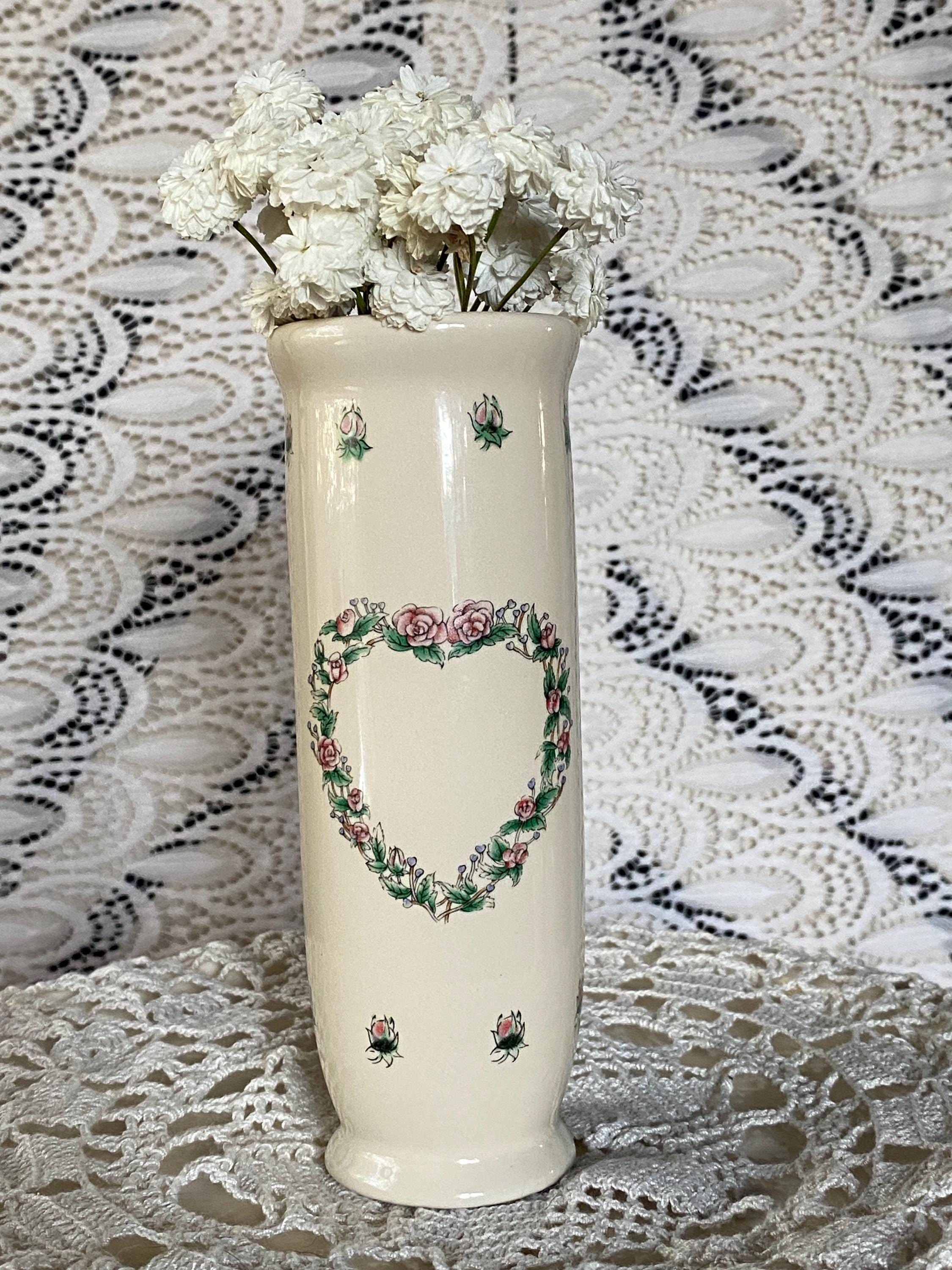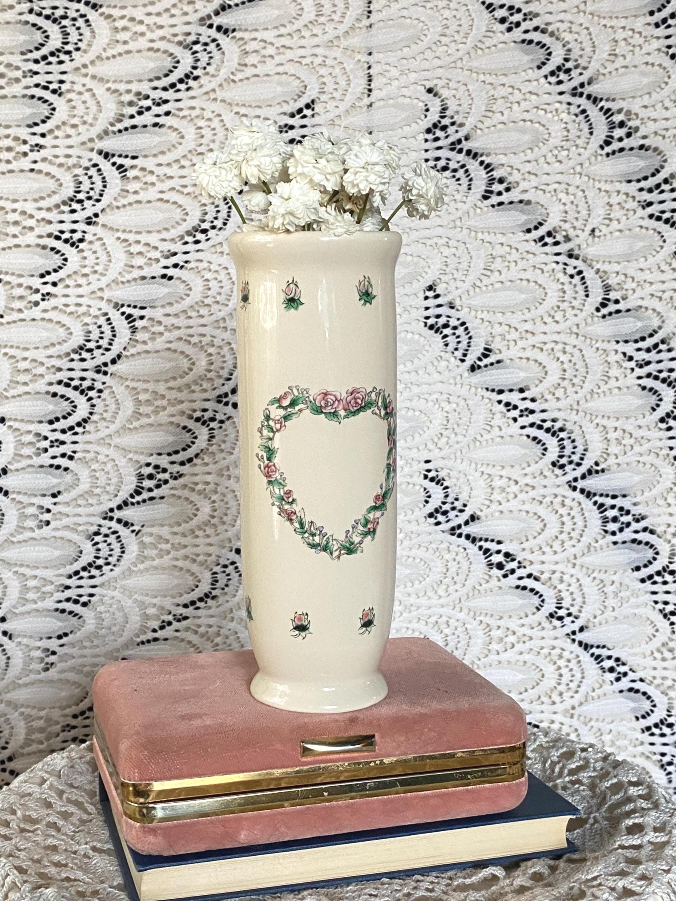 This cute little set is perfect for a vanity, bathroom, or vanity top. Victorian/ cottage/country aesthetic. Would make a great gift for a flower-loving friend. Vase 6.5" tall X 2.25" wide. Box 2.25" wide X 1.25" tall.