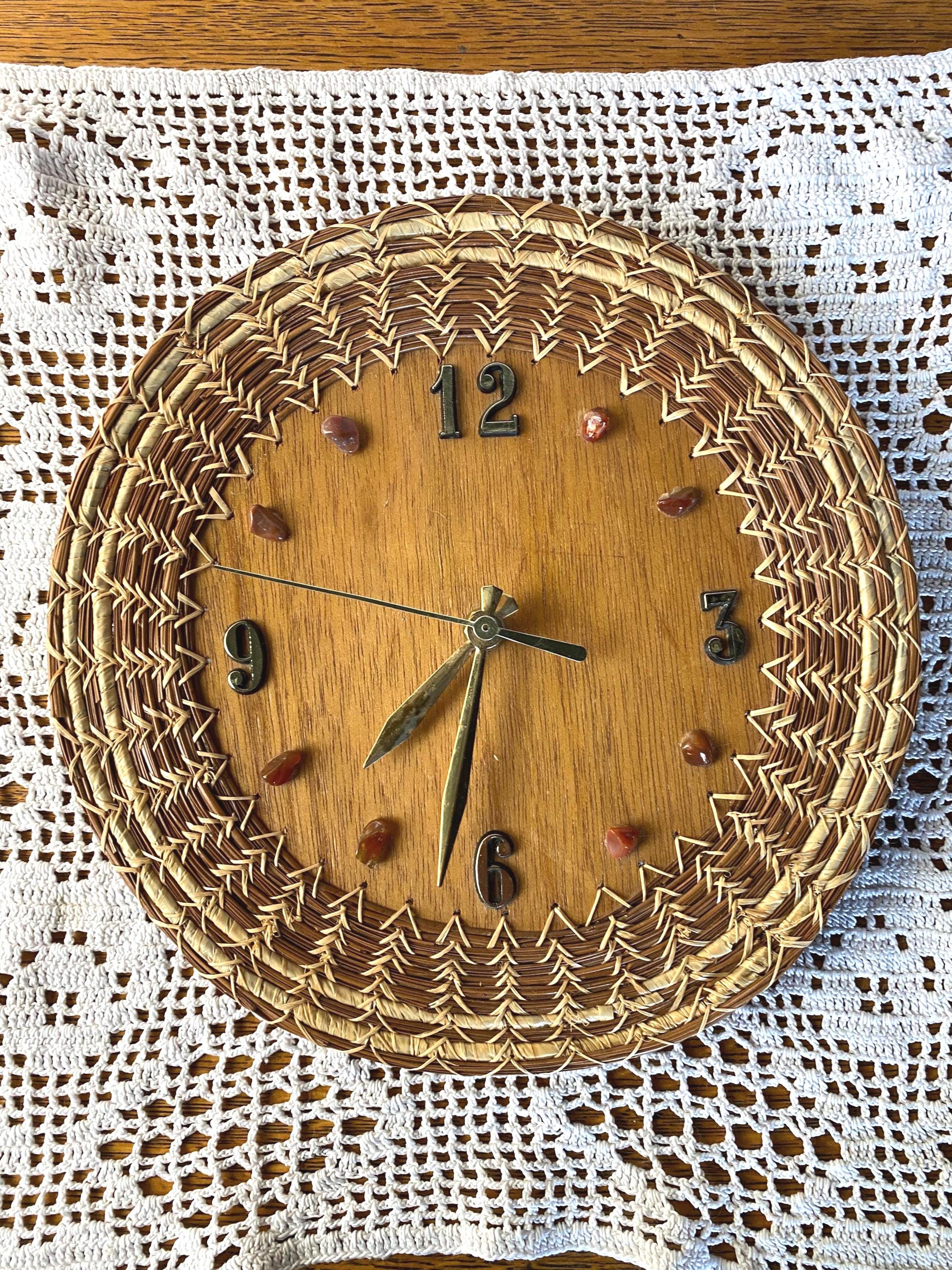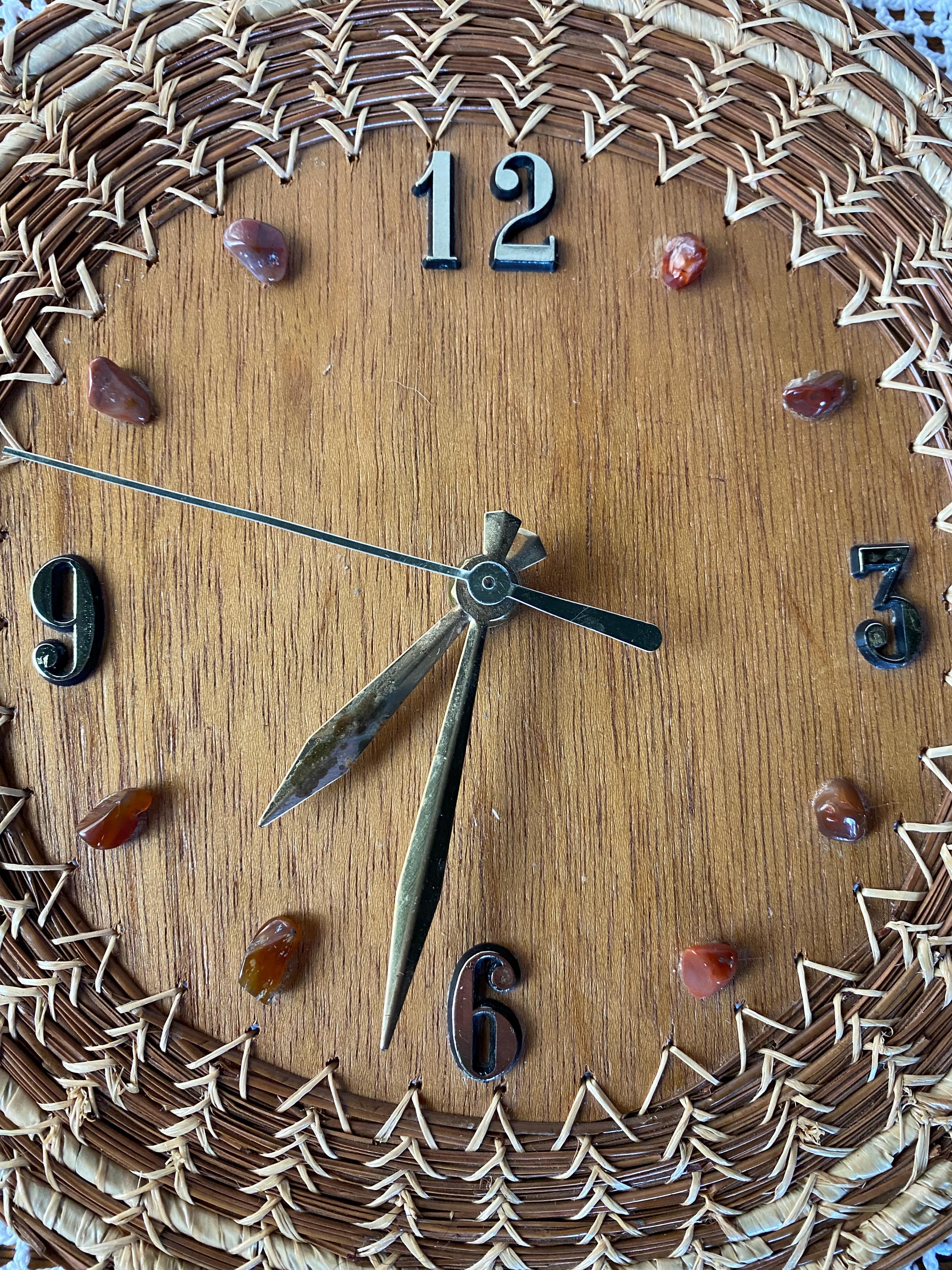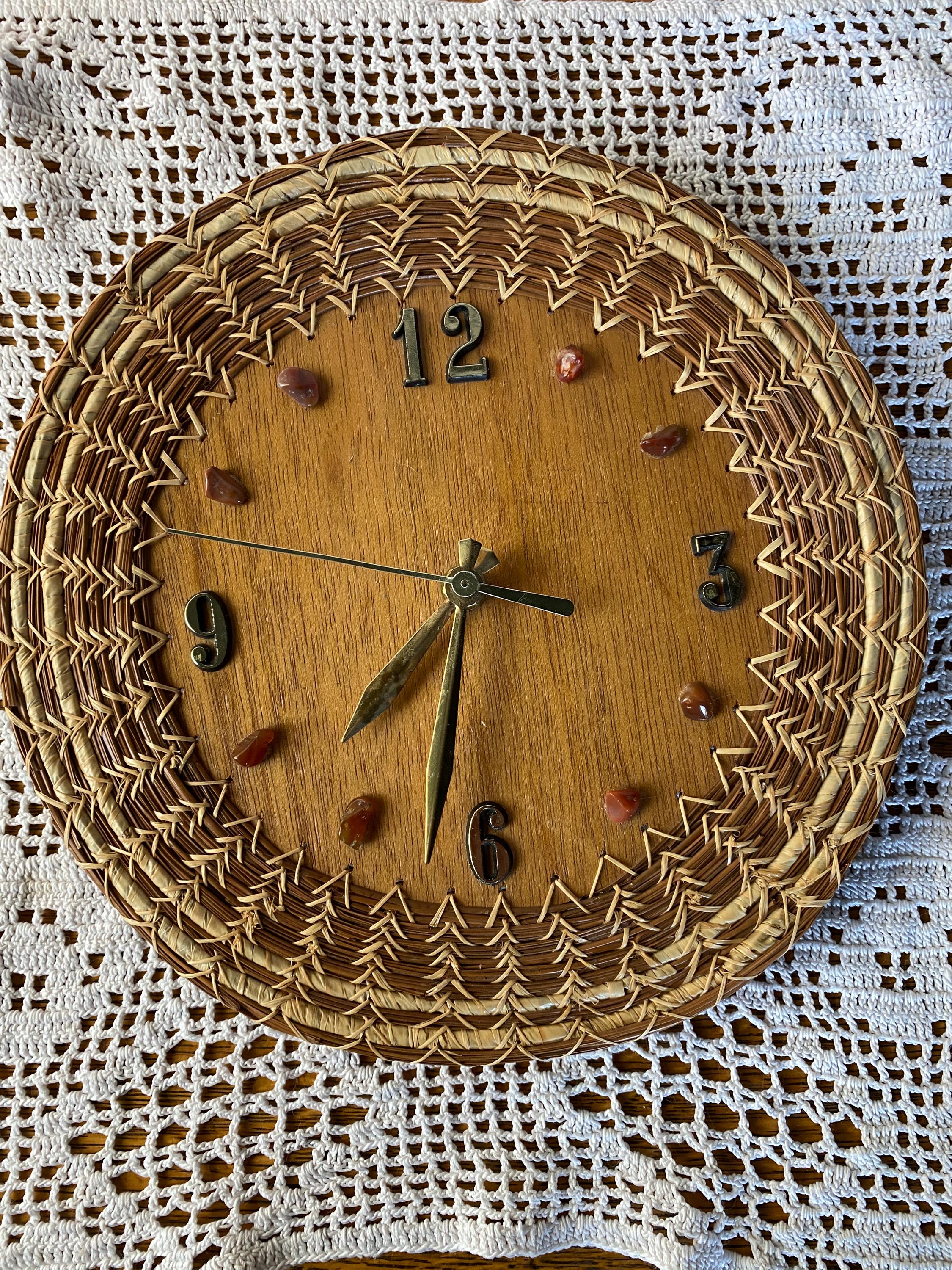 This is a great little clock, handmade out of thin wood and wicker woven with grass fibers in a unique geometric design. The hour markers are red agates giving this piece a nice earthtone colorway. Approximately 9.5" across. Some wear on wood and metal hands, hands have some minor bends. Discoloration on back of clock.