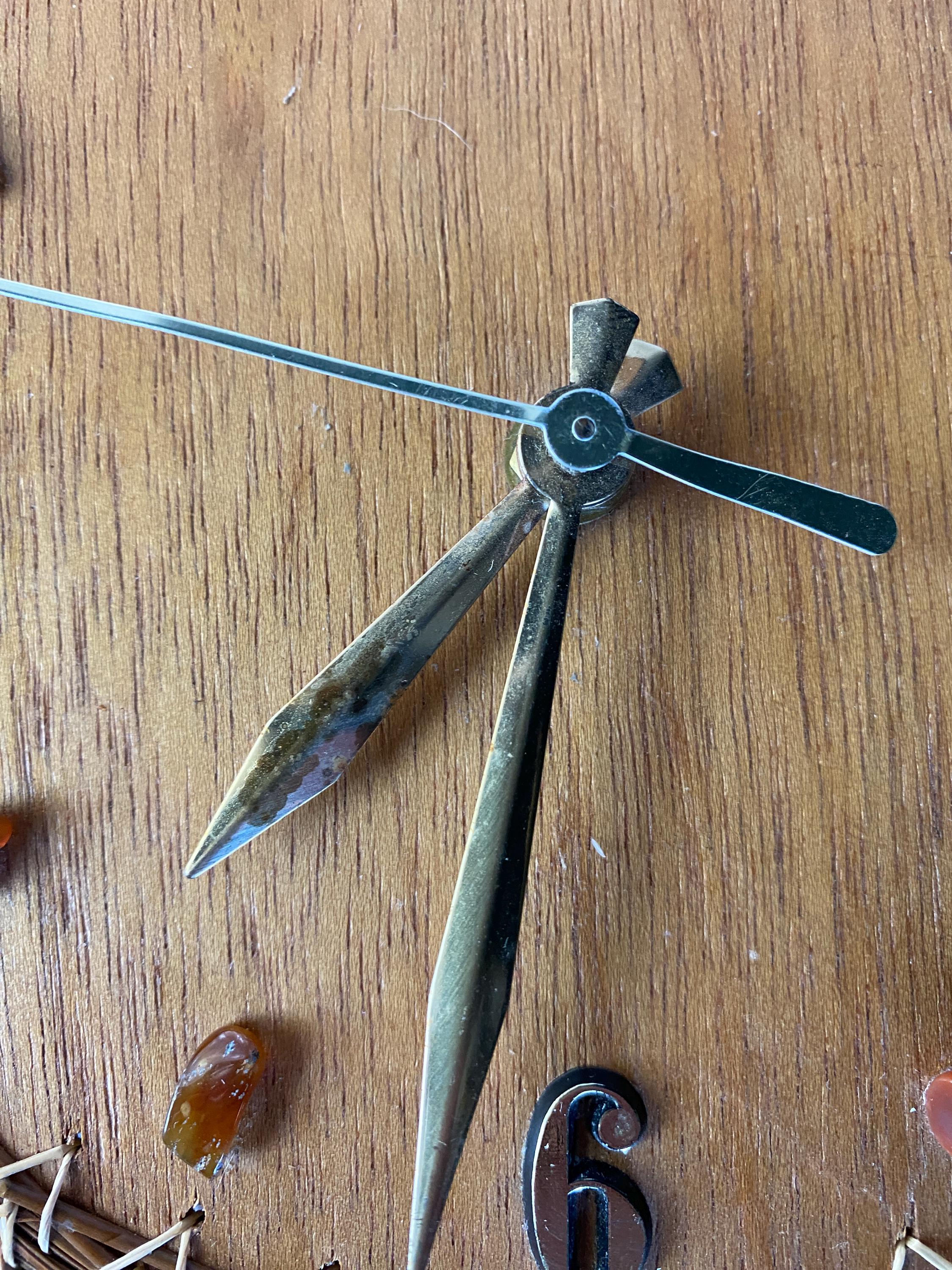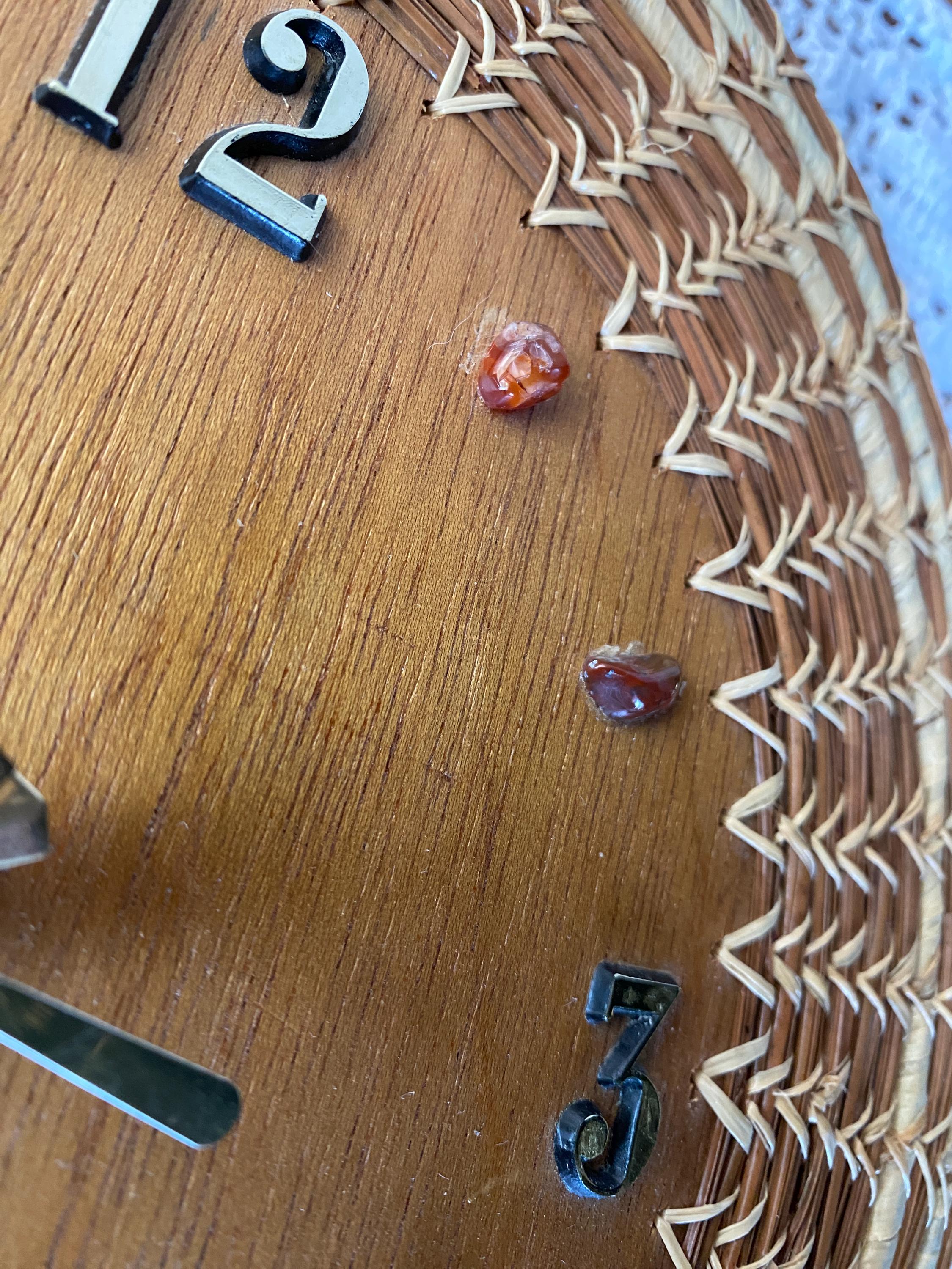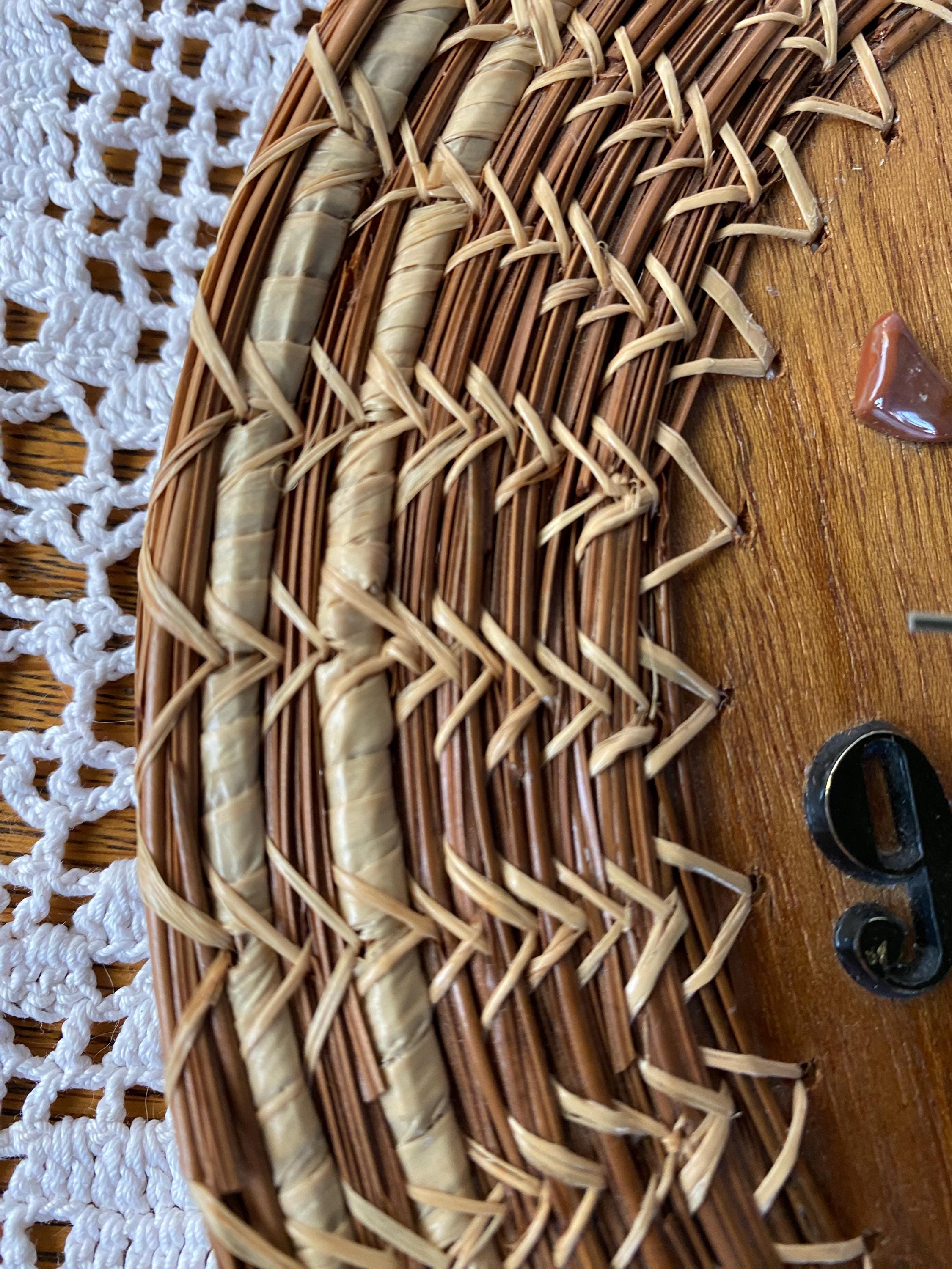 This is a great little clock, handmade out of thin wood and wicker woven with grass fibers in a unique geometric design. The hour markers are red agates giving this piece a nice earthtone colorway. Approximately 9.5" across. Some wear on wood and metal hands, hands have some minor bends. Discoloration on back of clock.