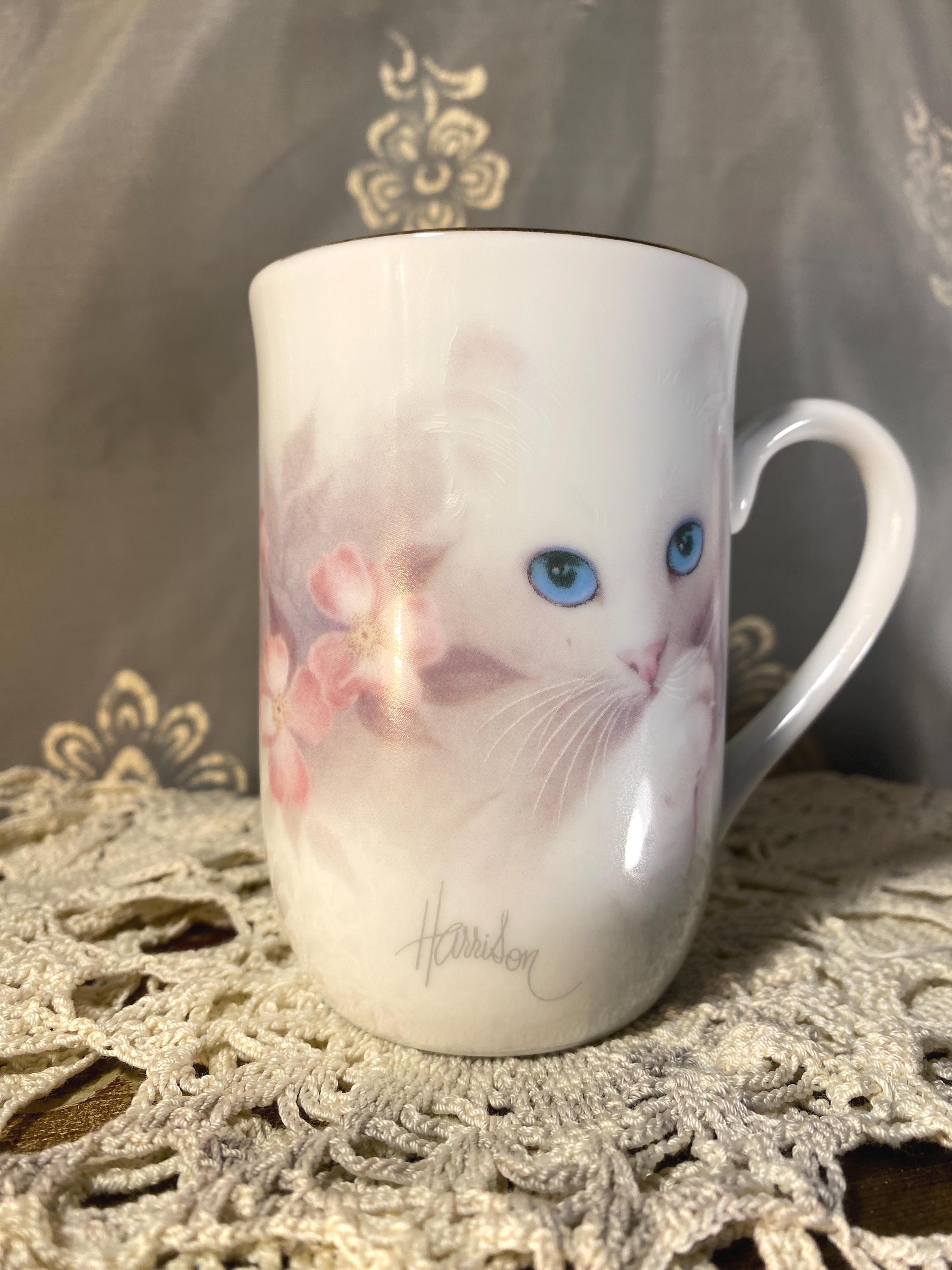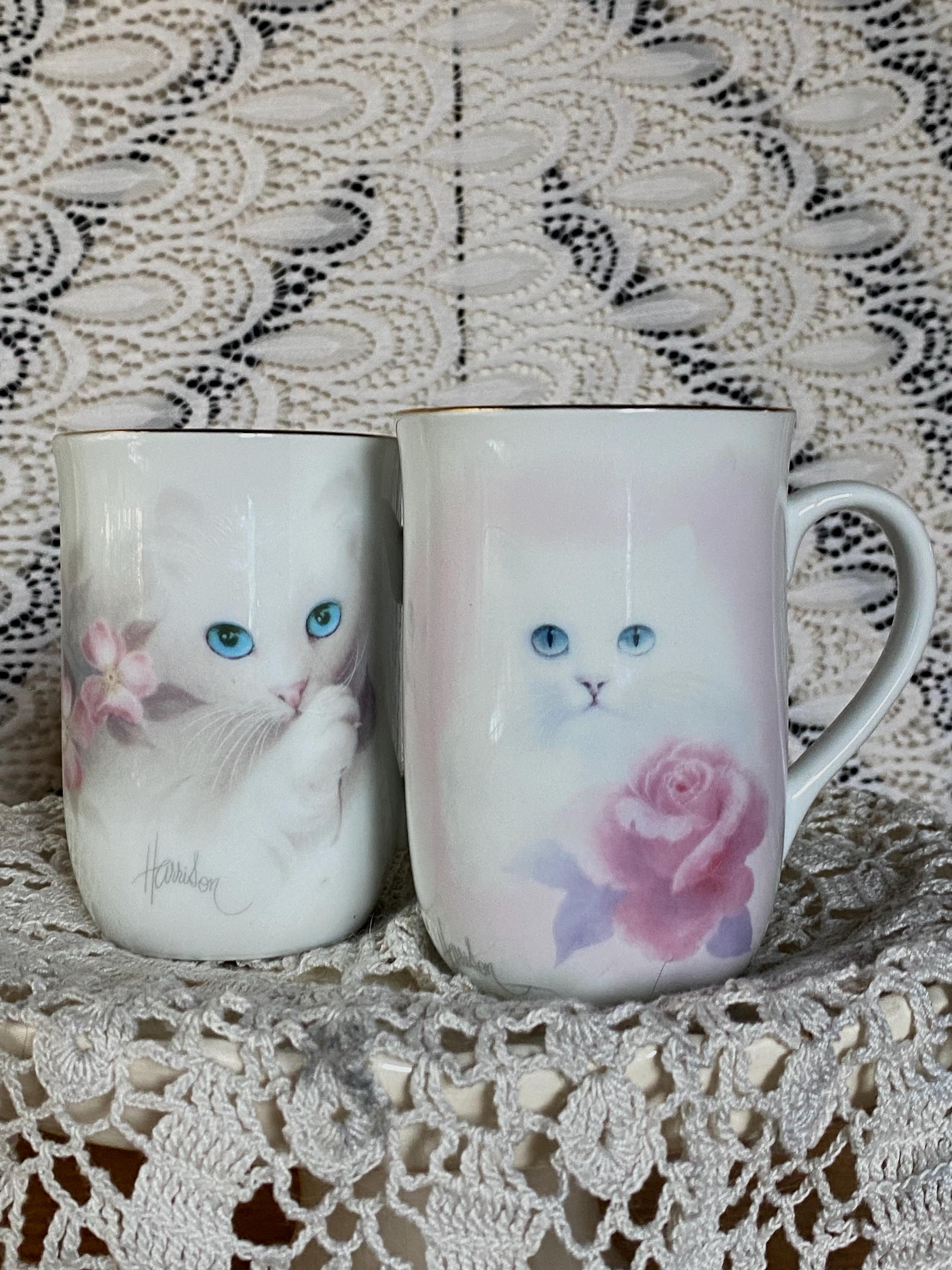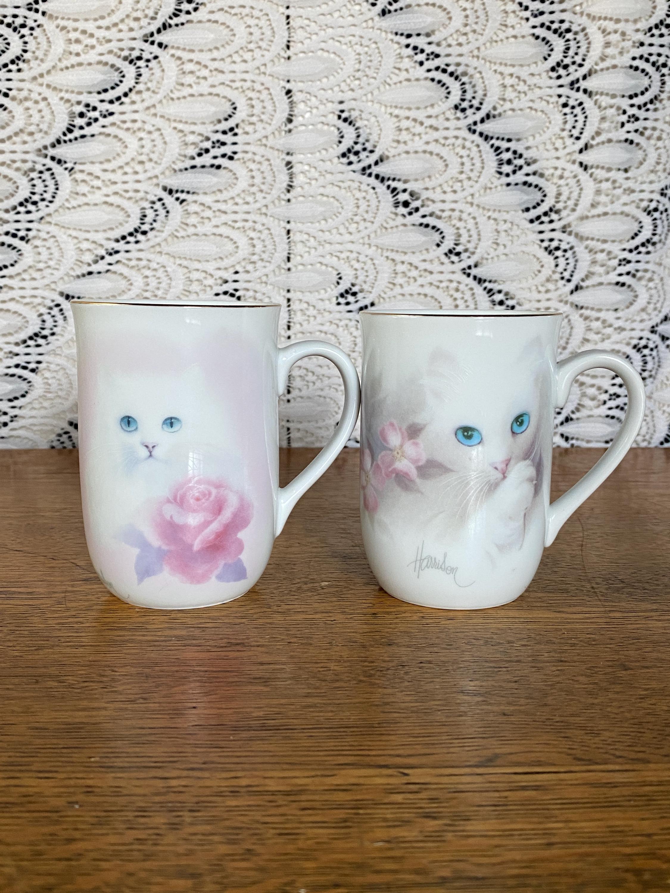 Pair of 1980's cute little kitten cups painted by Bob Harrison. The mugs are white with a slight gold rim setting off the blues and pinks of the kitten art. A great gift for a cat lover! 4 inches across including handle, 2.5 inches across top, 4 inches tall. Some minor wear on pattern.