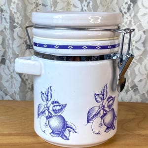 This is a thick stoneware mug with a painted floral design in a retro colorway. Perfect for a country or cottage style kitchen. Approximately 3" across the top and 4" tall.