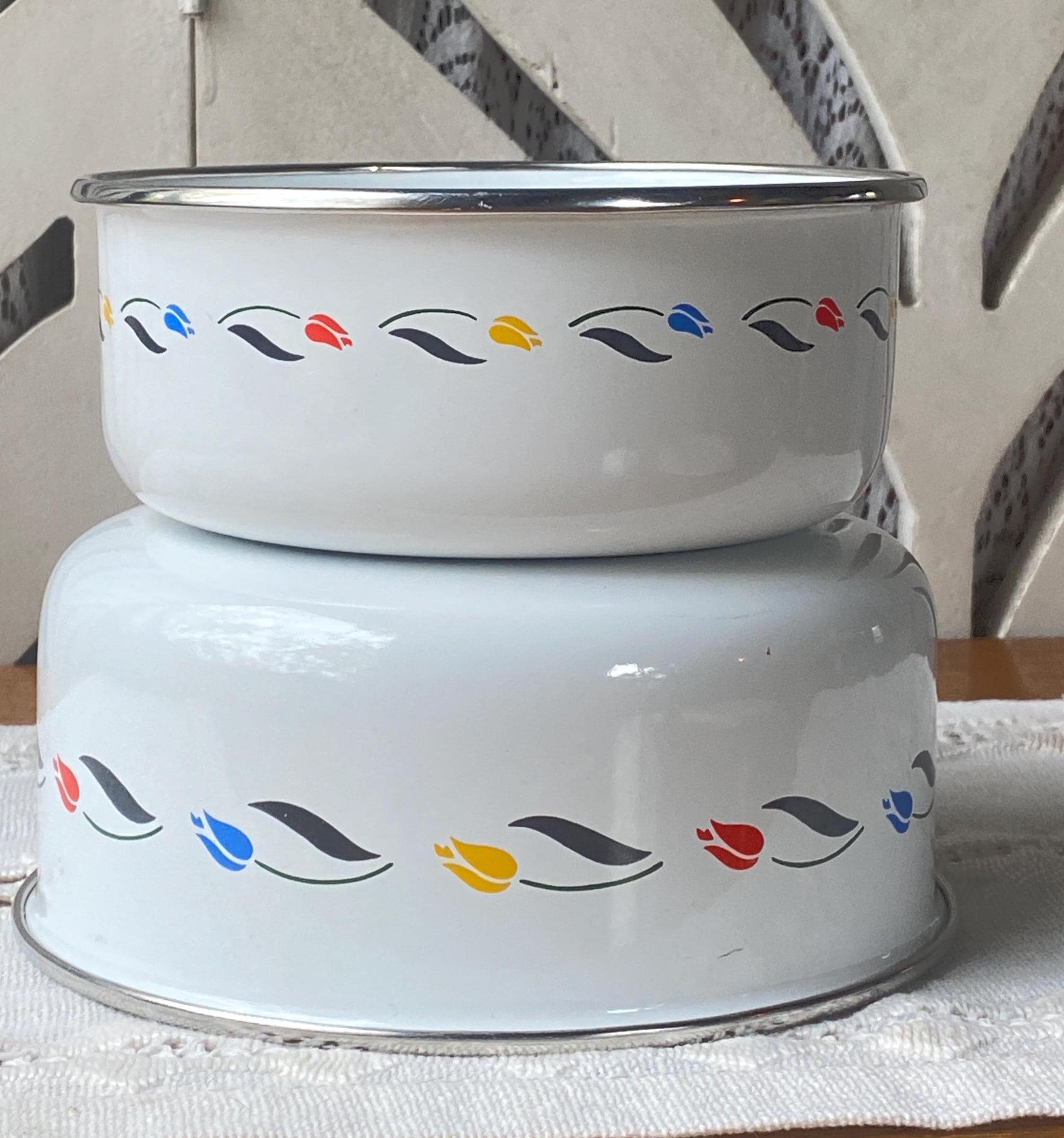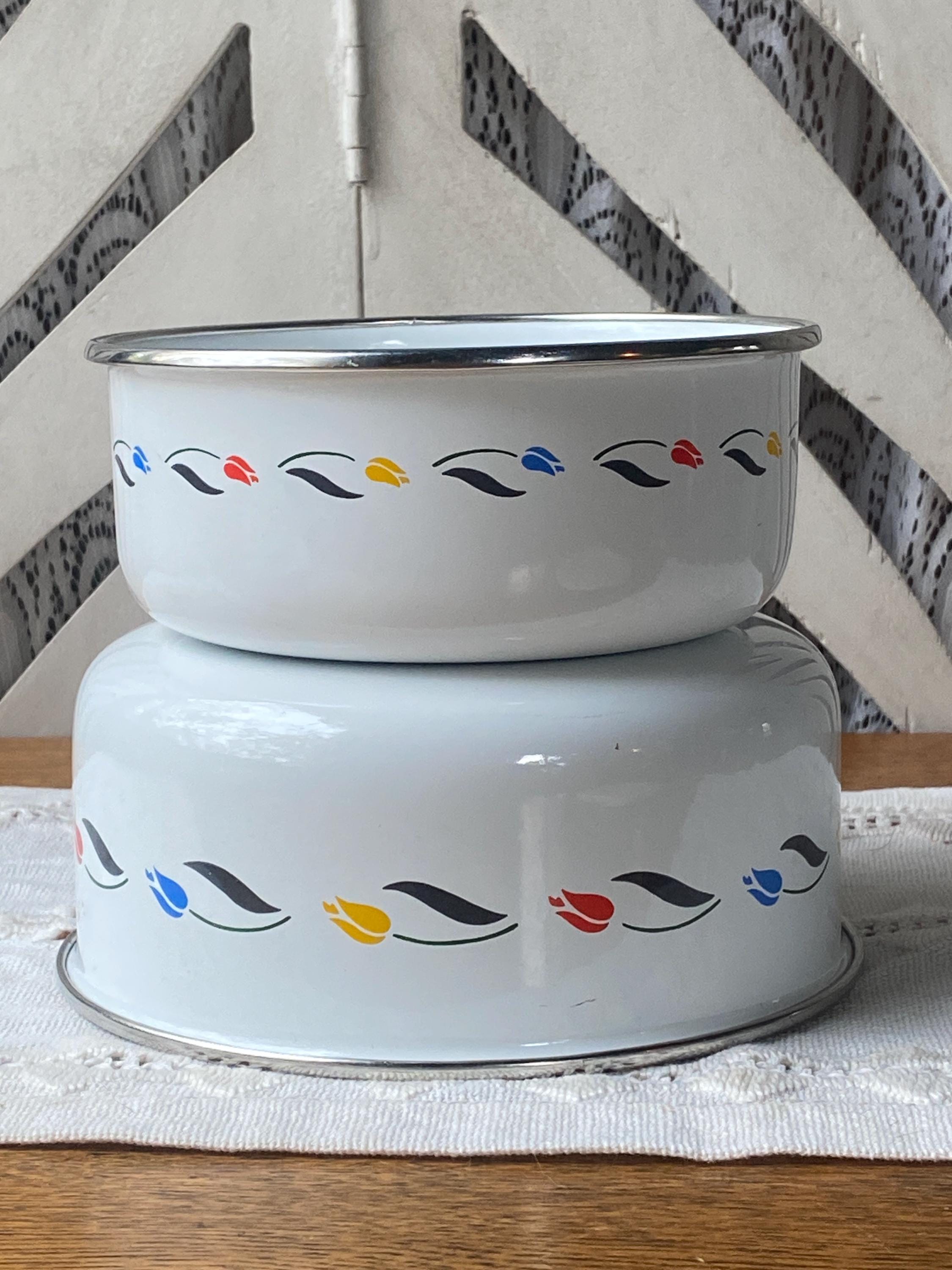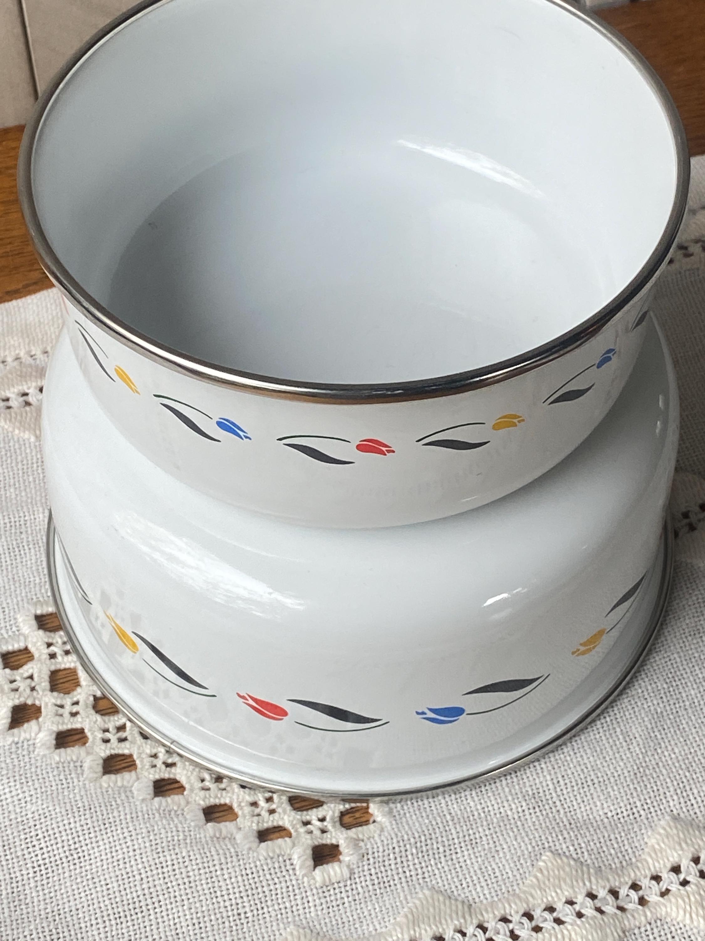 Designed for JCPenney, these two bowls are a bright vintage addition to any country or cottage style kitchen. They are durable and useful, but pretty enough to put on display. Approximately 6.5x3 and 5.5x2.5 inches.