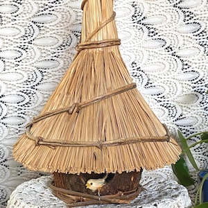 Cute little country style wall hanging with bird houses, a tree branch and a little bead bird. Cheerful green and red checked fabric around the border and a tree shaped wire hanger complete the piece. Note that the birdhouse square appliques are glued on, not quilted on. The rest of the piece is machine sewed. A couple of stains on back that do not impact the front fabric and are fairly difficult to see on back. 15X15 inches (fabric only) the wire is flexible and adds another 6 ish inches.