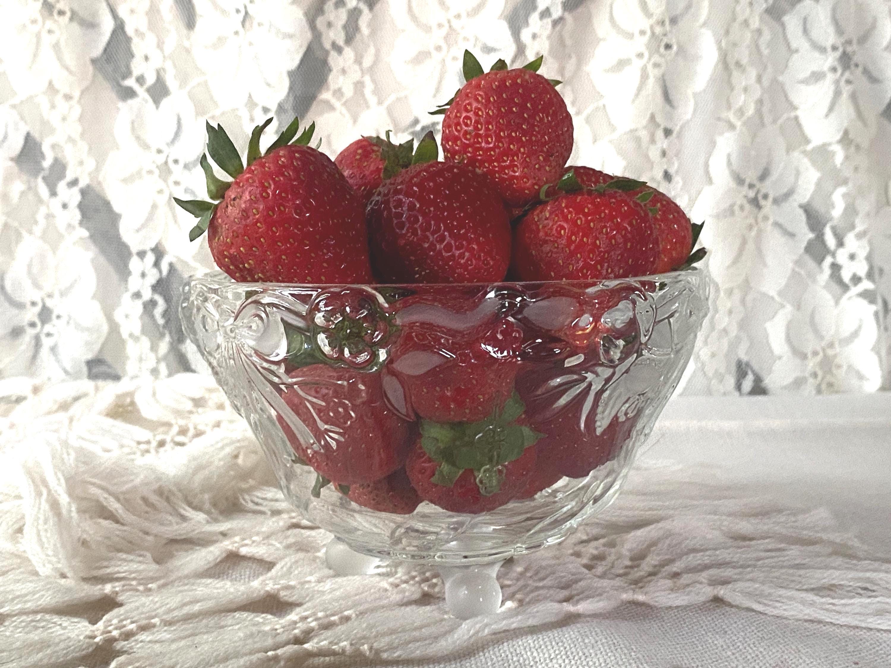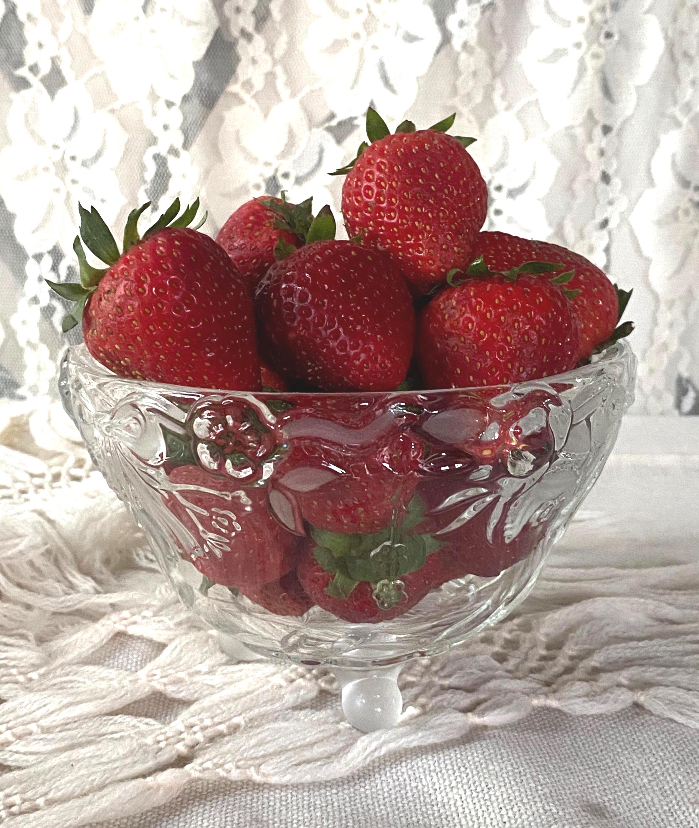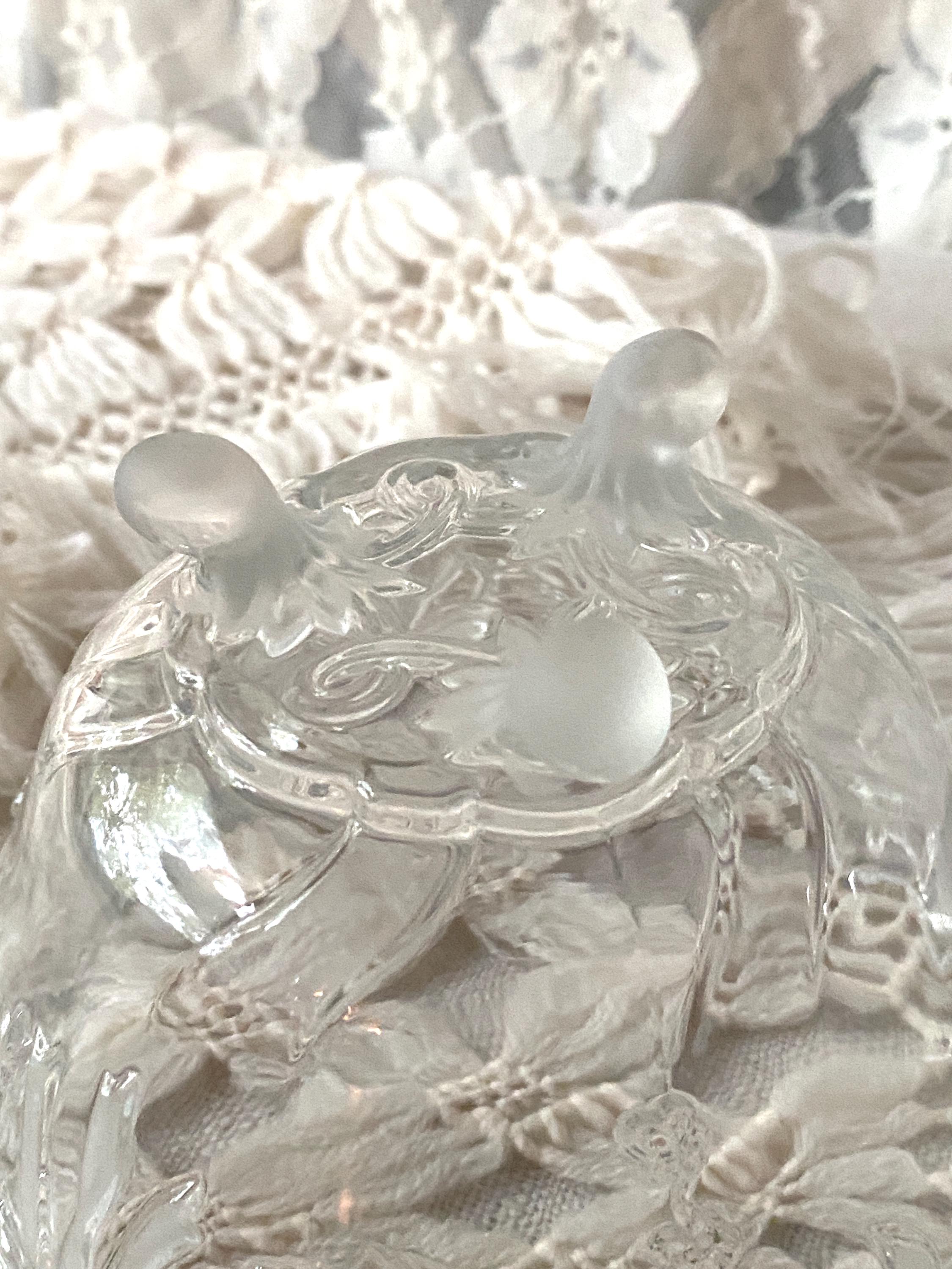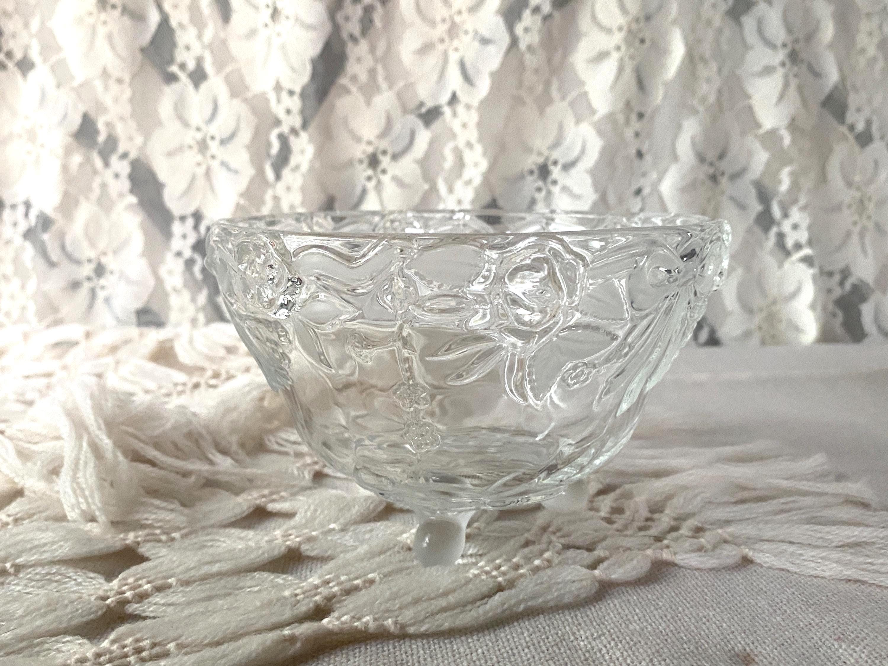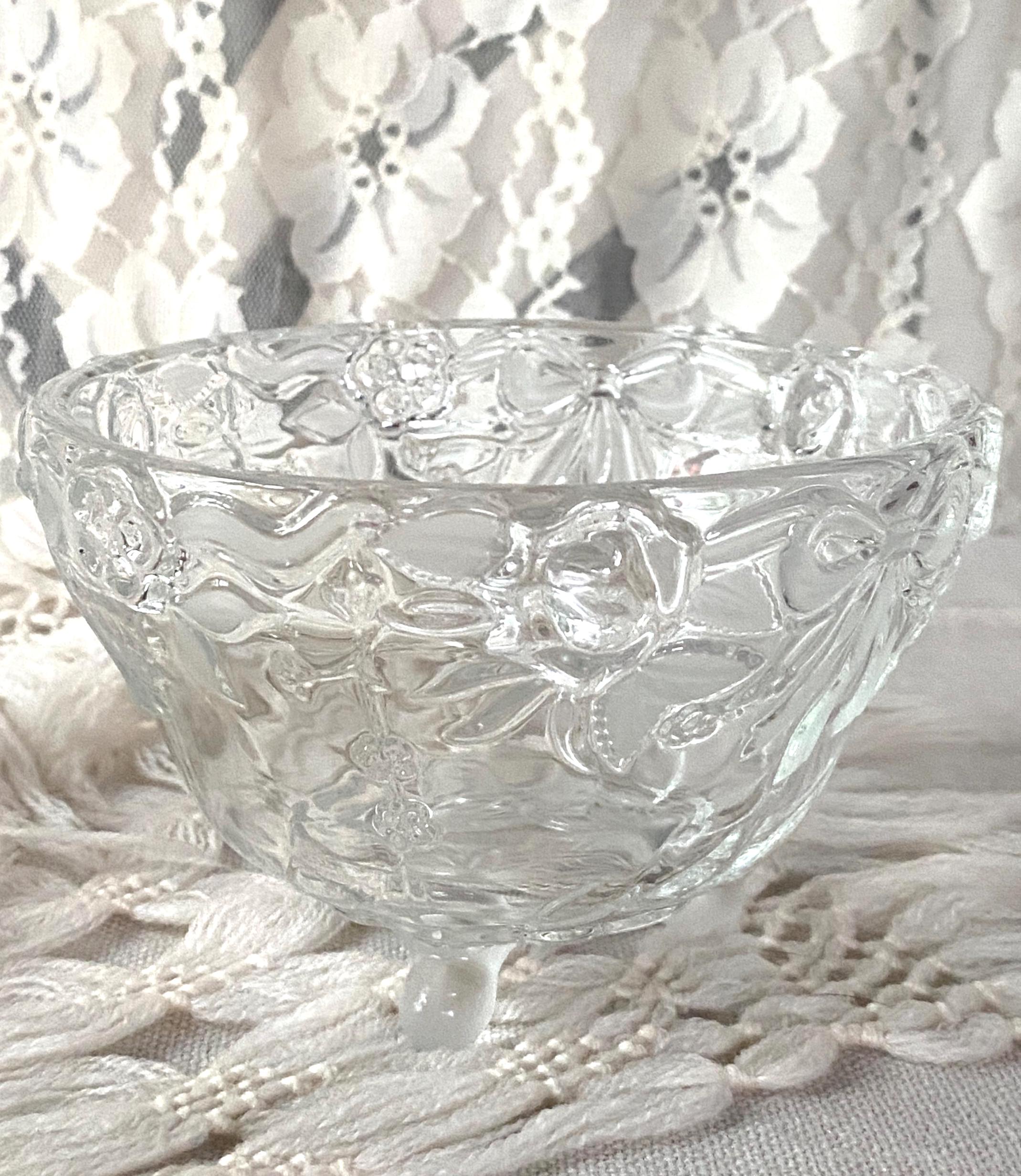 Pretty little footed glass dish, perfect on a table or shelf, and lovely when filled with colorful items. Three little feet, a delicate floral pattern, and bows make this a charming addition to a country cottage styled homed. Good vintage condition, minor scratches and a couple of very small fleabites on sides. 5.25X3.5 inches.