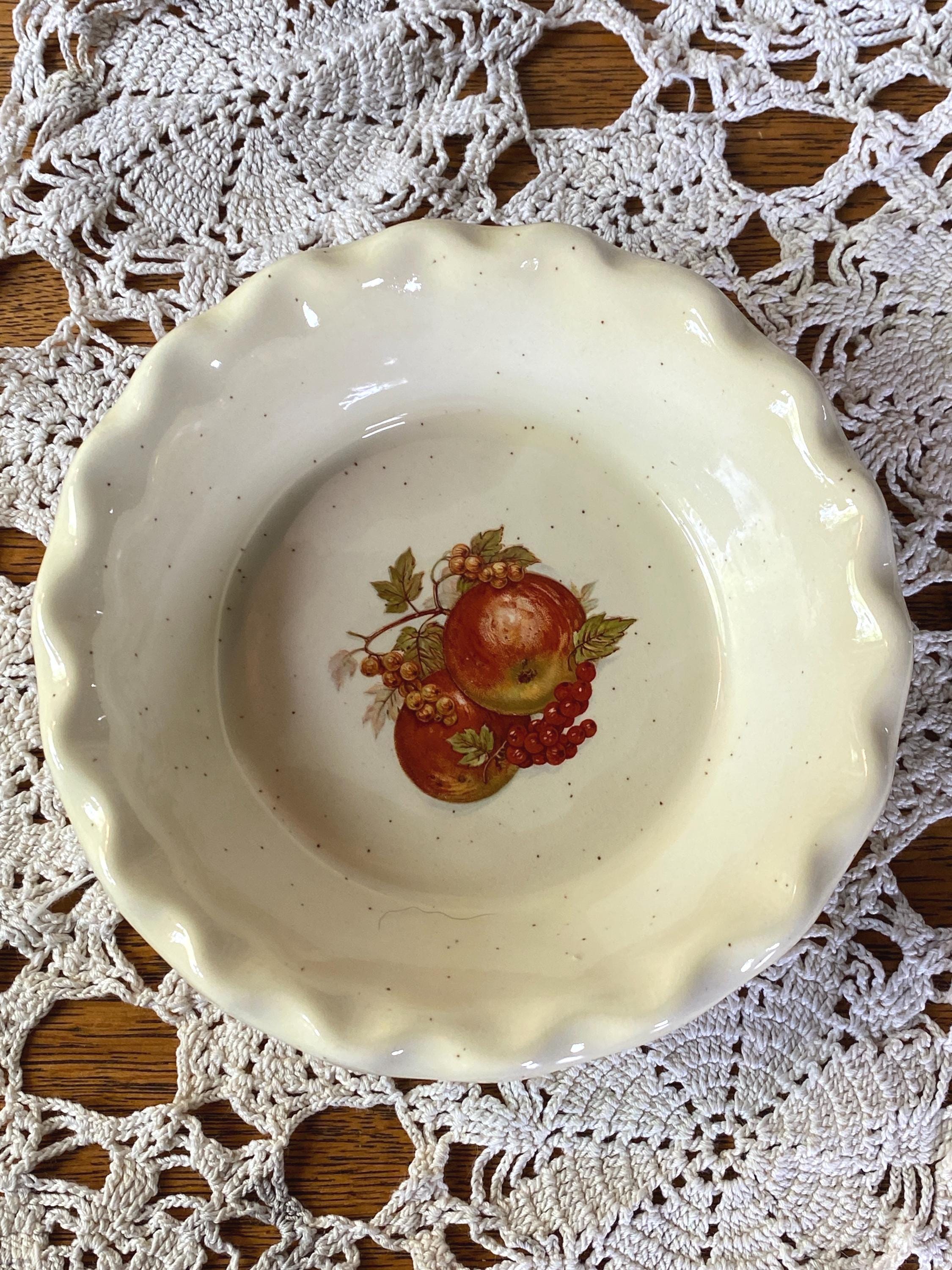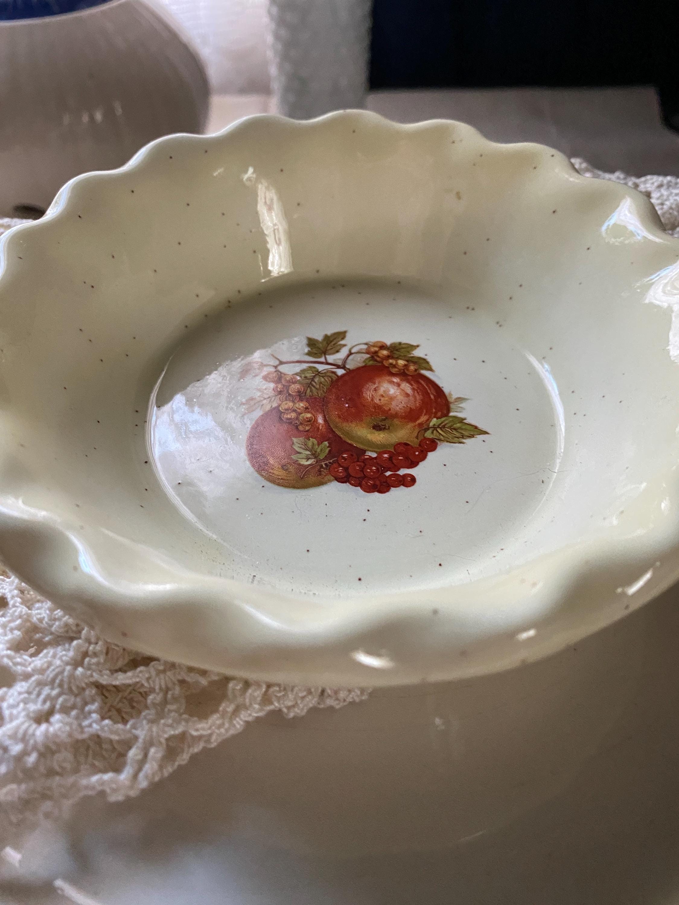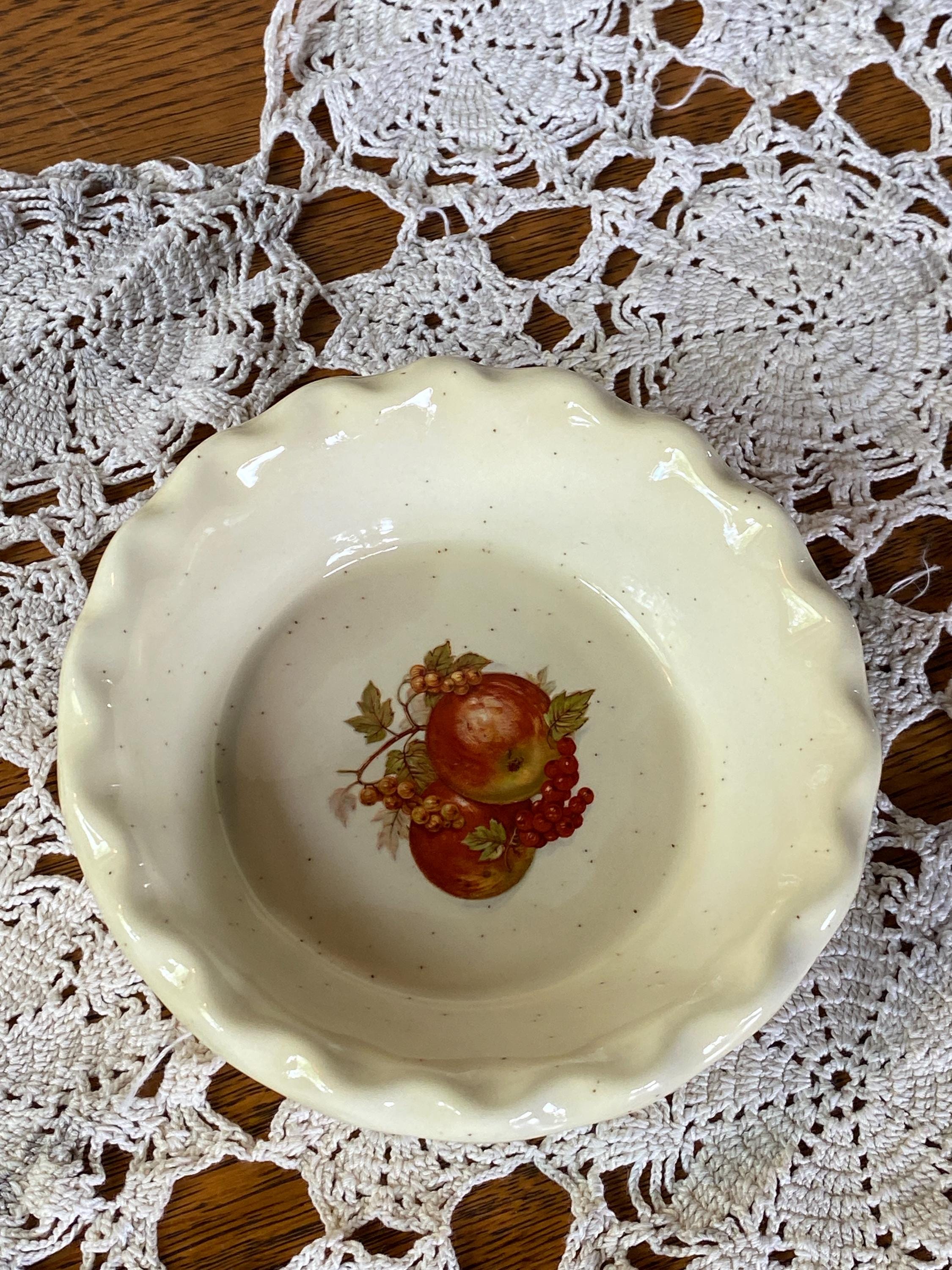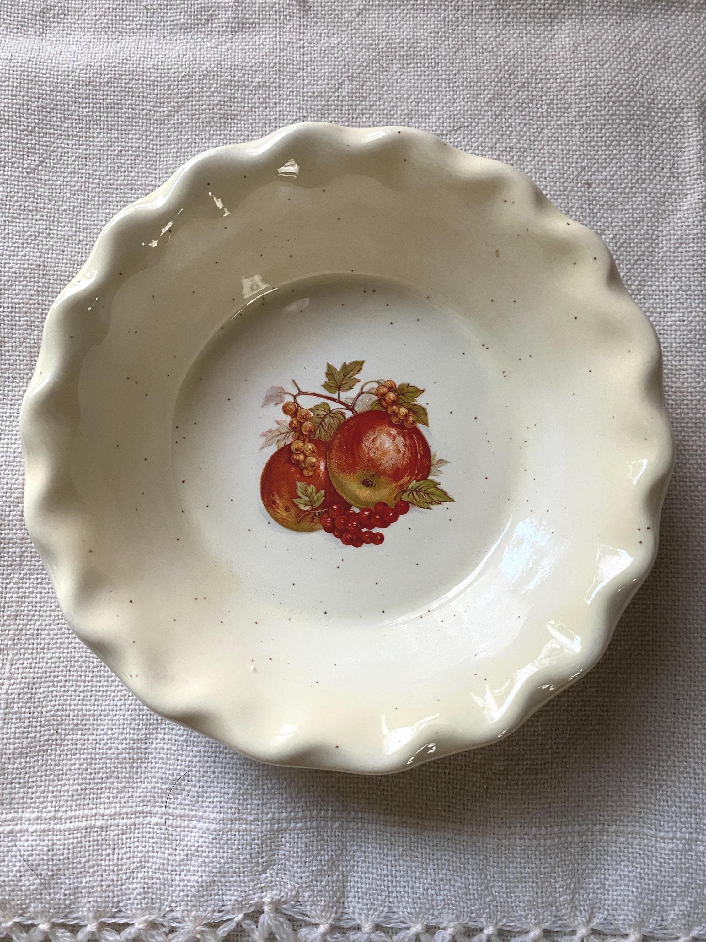 This is such a cute little vintage piece, perfect for a country or cottage styled kitchen. The harvest apple pattern evokes a bit of fall in its colors, and looks charming set against the creamy, speckled background. Perfect gift for a baker! Good handmade/ vintage condition, minor wear on pattern and rubbing on bottom. 5.5 inches across, 1.5 inches tall.