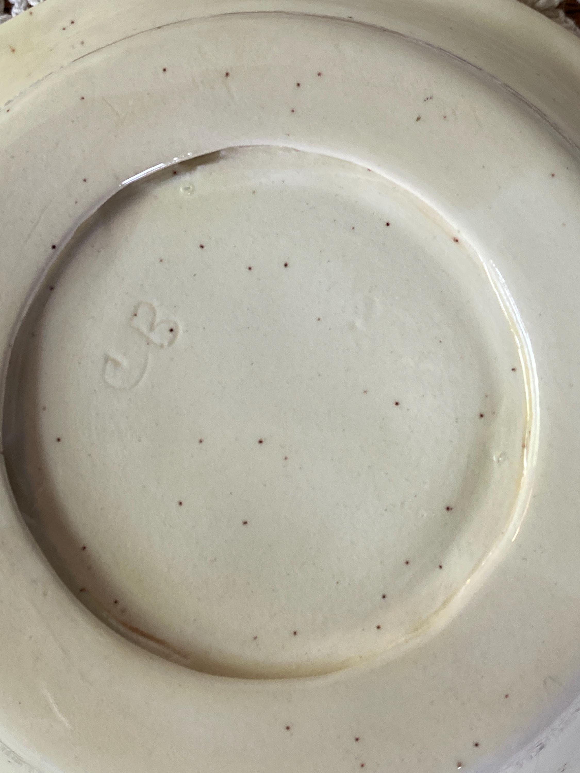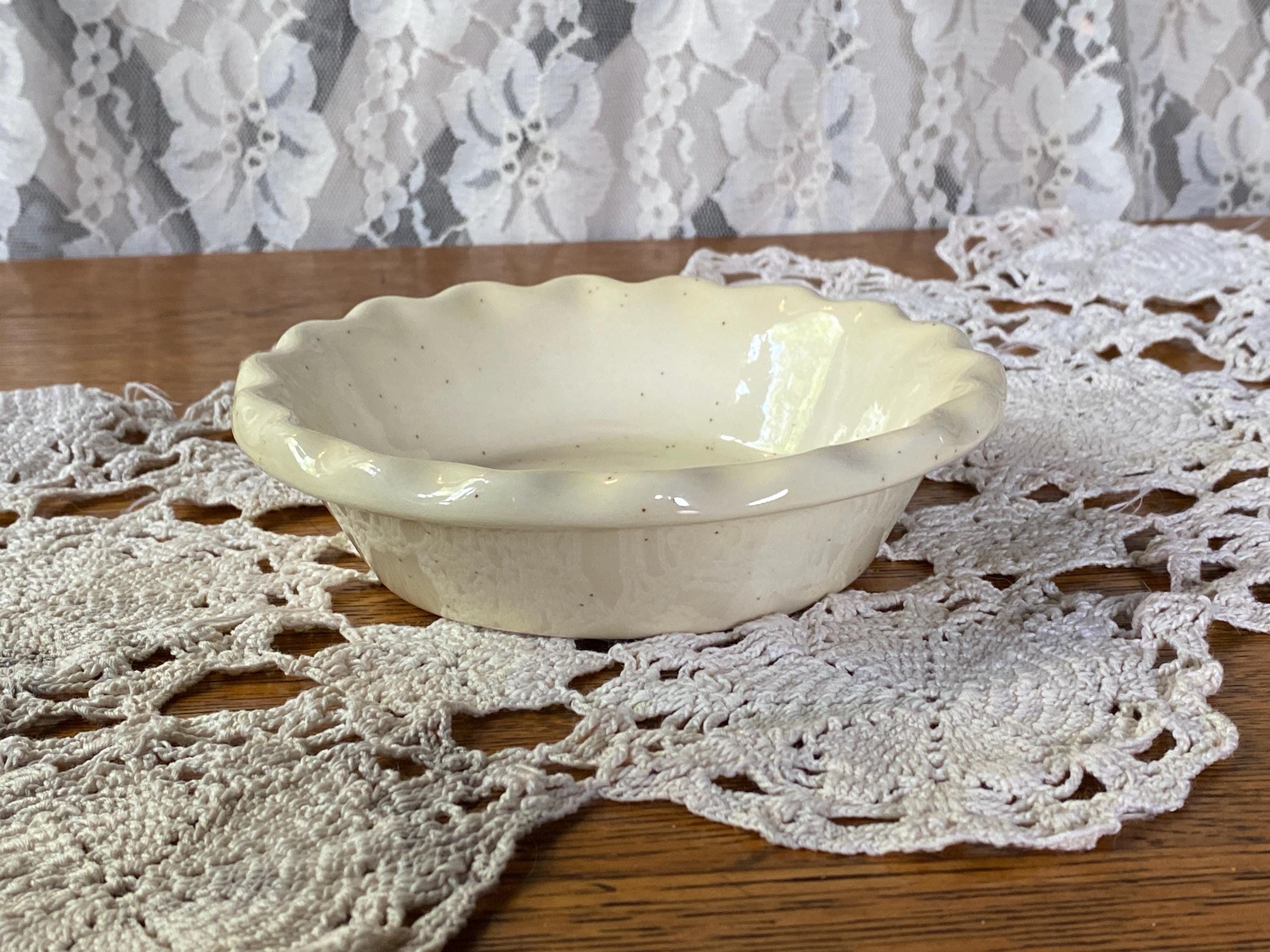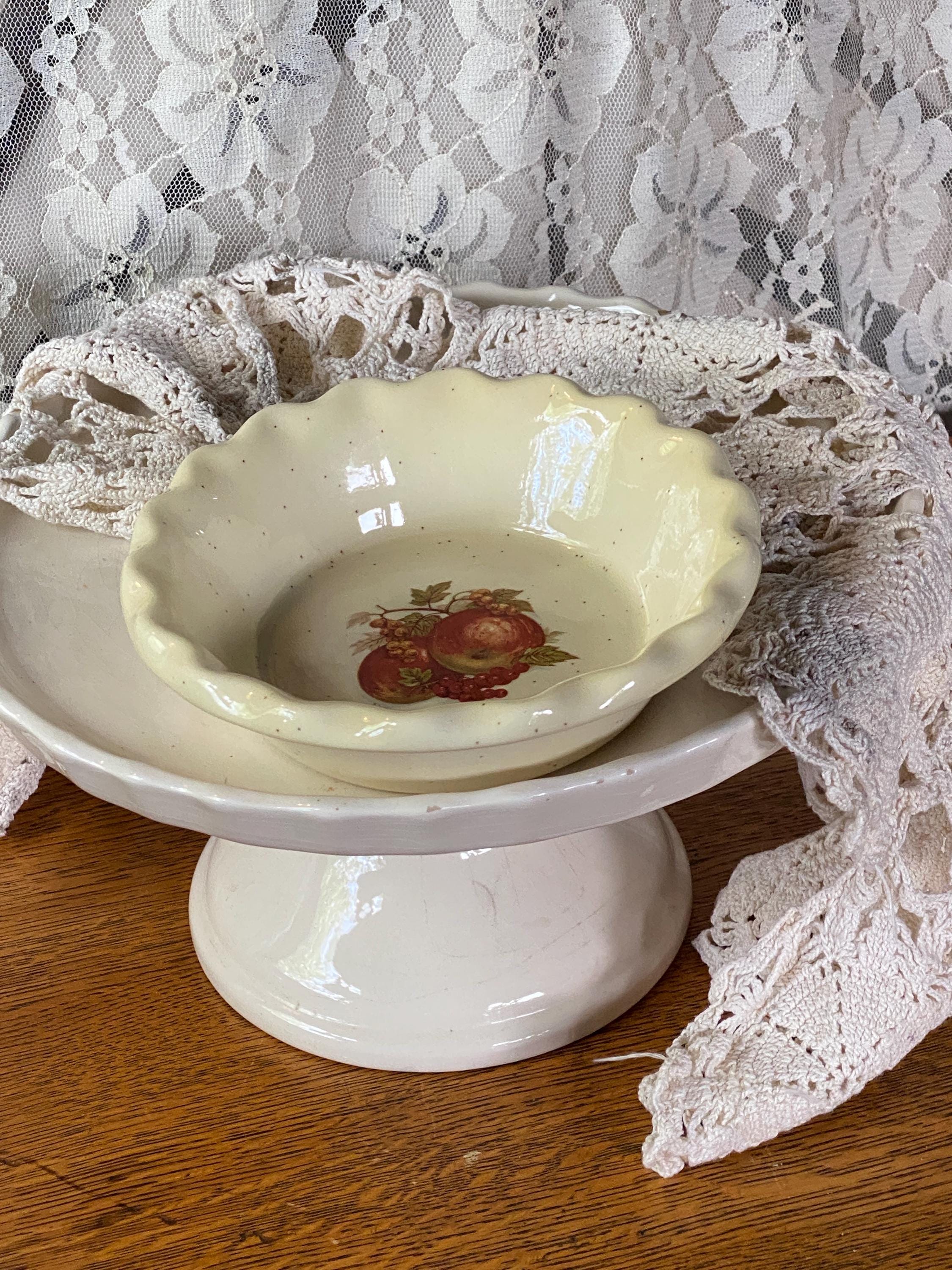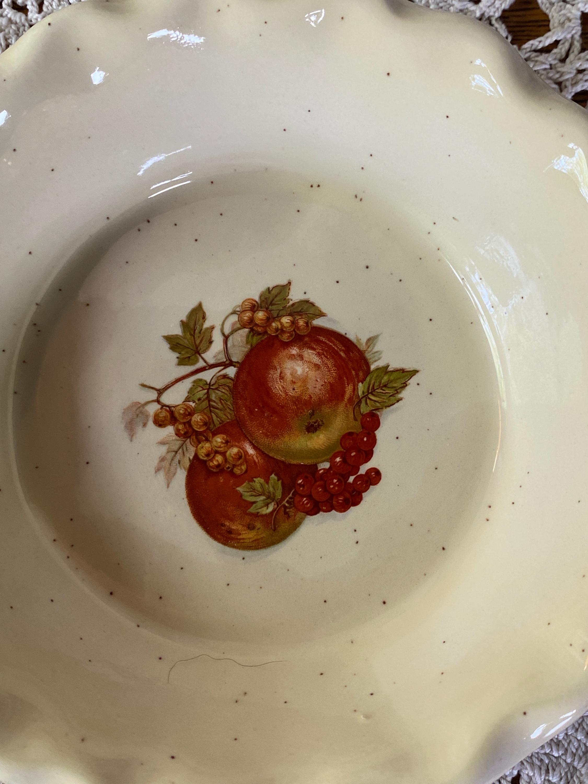 This is such a cute little vintage piece, perfect for a country or cottage styled kitchen. The harvest apple pattern evokes a bit of fall in its colors, and looks charming set against the creamy, speckled background. Perfect gift for a baker! Good handmade/ vintage condition, minor wear on pattern and rubbing on bottom. 5.5 inches across, 1.5 inches tall.