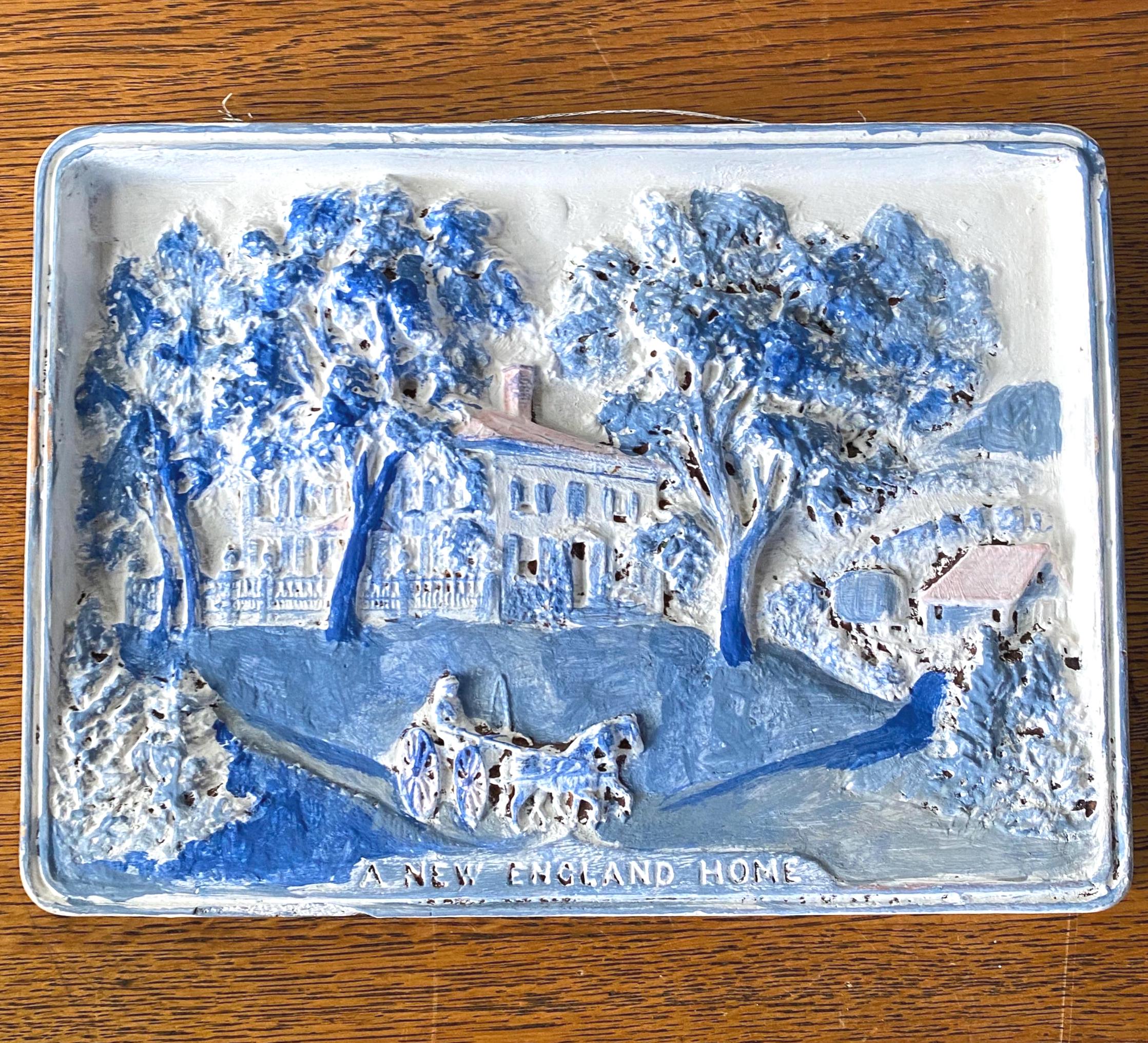 This piece of vintage art depicts a stately country manor and a horse drawn carriage in 3D relief. Perfect addition to a gallery wall or to add style to a small space. 9X7X.5. Some chips, wear, and inconsistencies reflective of age. Please see photos carefully.