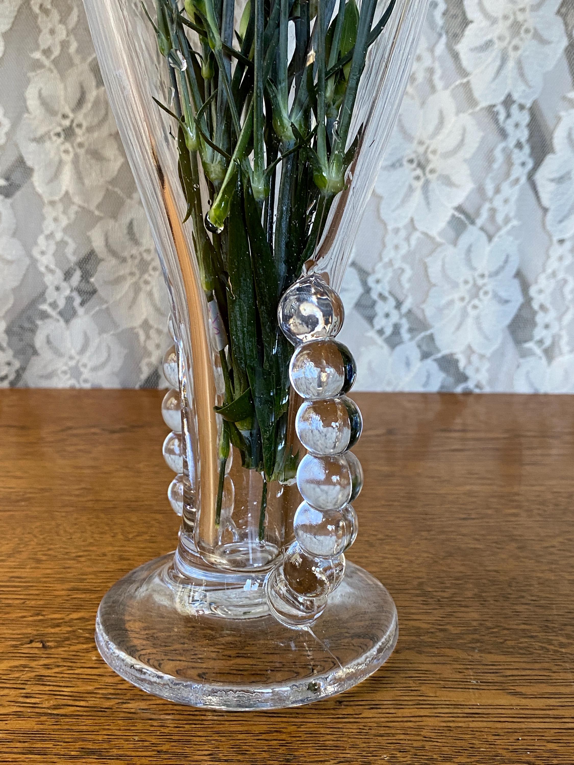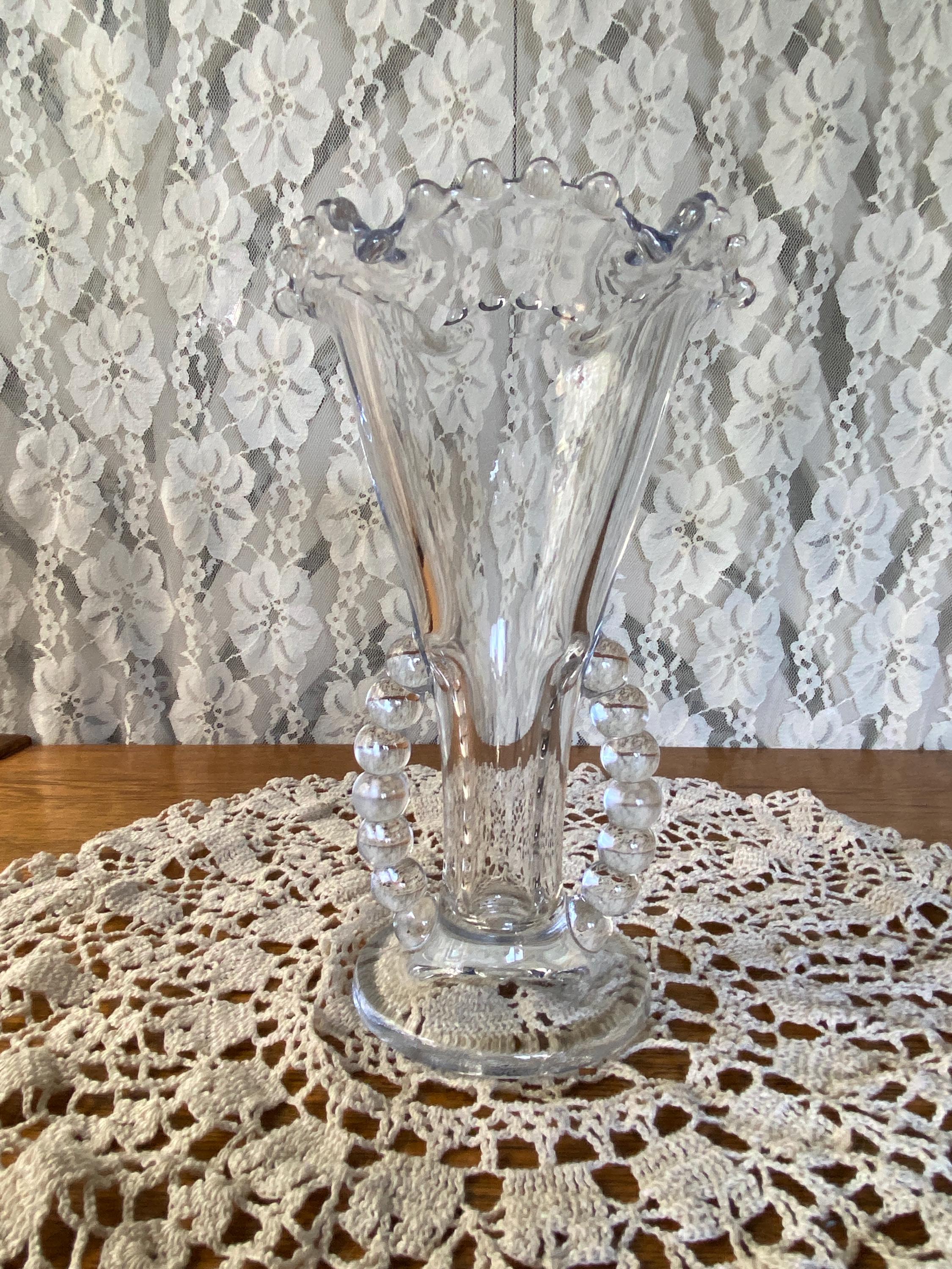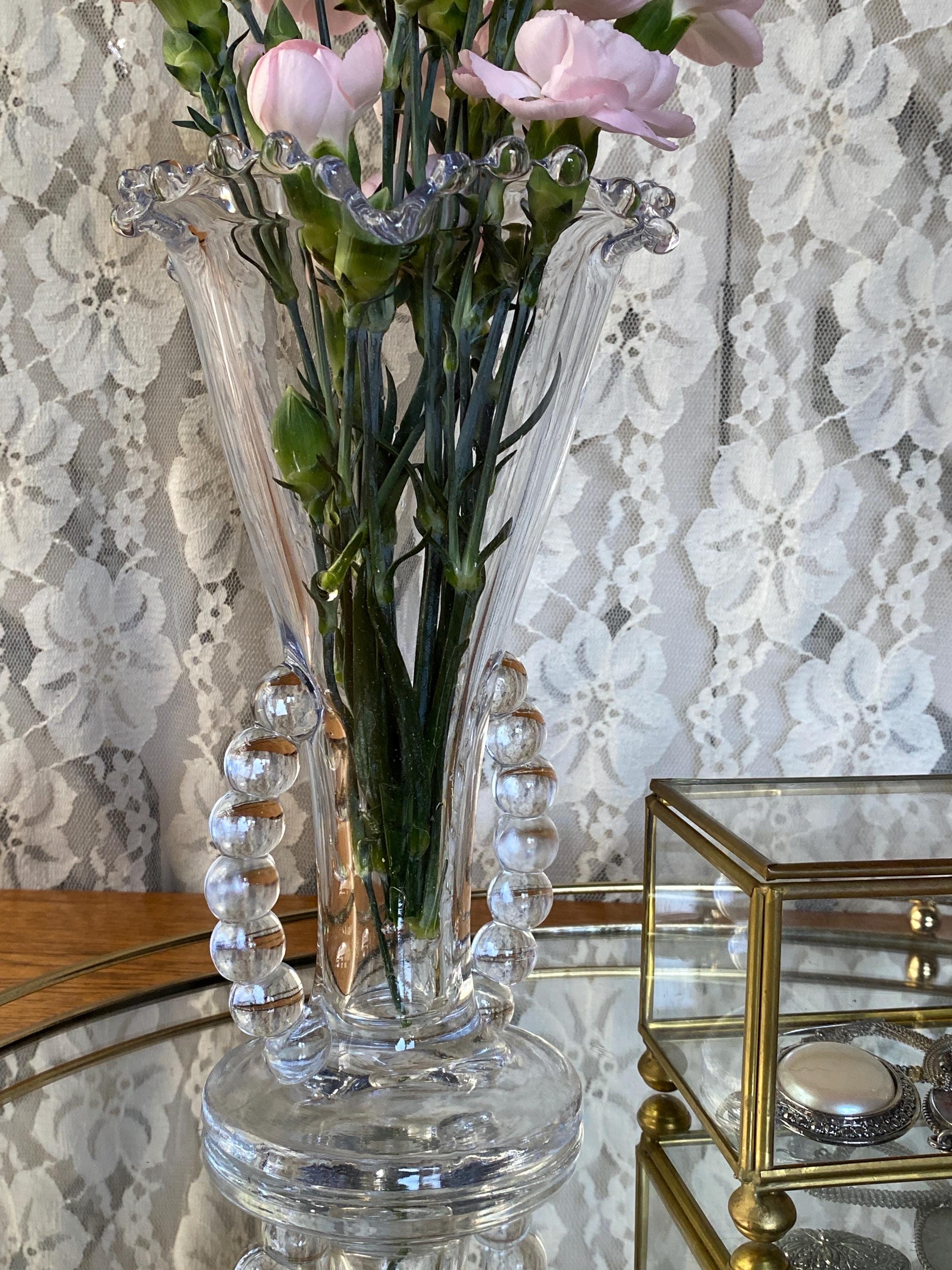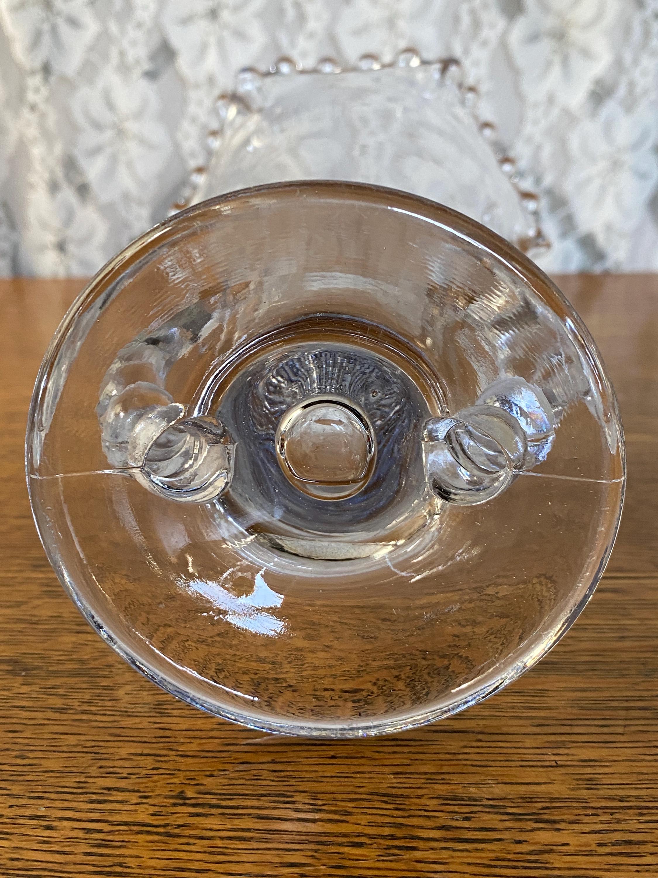This pretty vintage piece looks lovely on a dining or entryway table or filled with flowers on a vanity top. The delicate ruffled edge has a tiny bubble detail that matches the larger bubble handles. The glass is old and has a significant number of tiny bubbles. 5 inches across top, 8.5 inches tall.