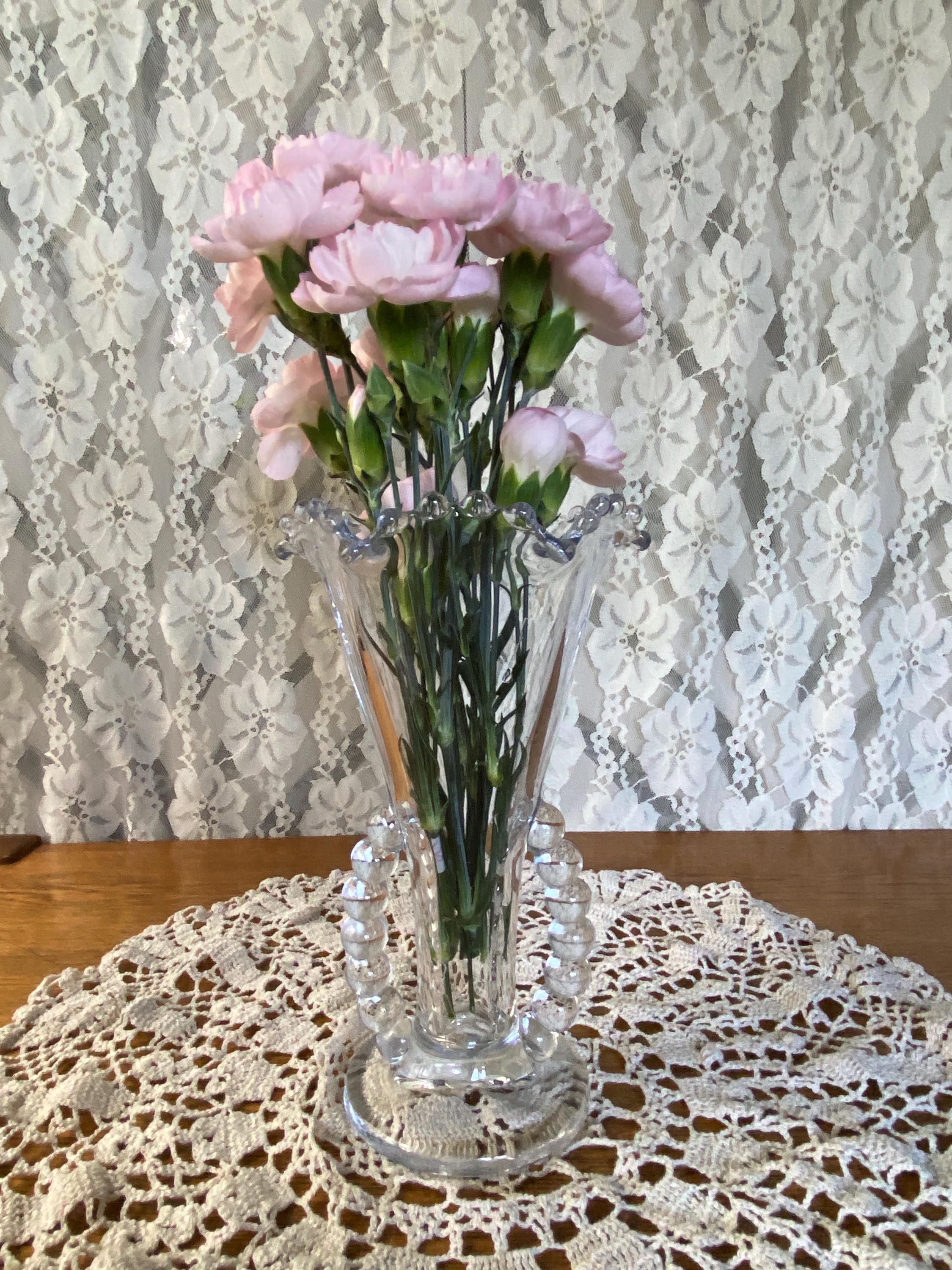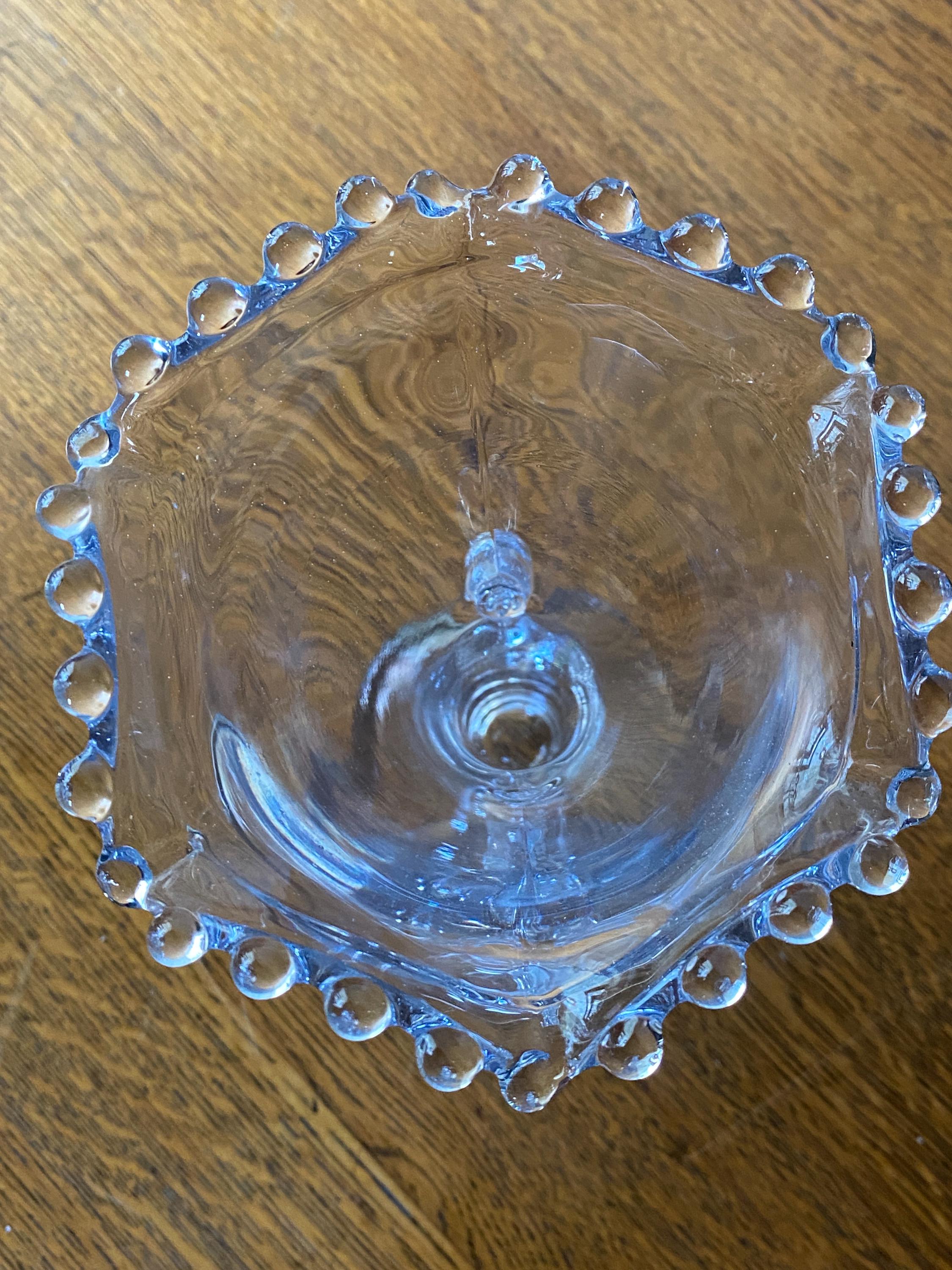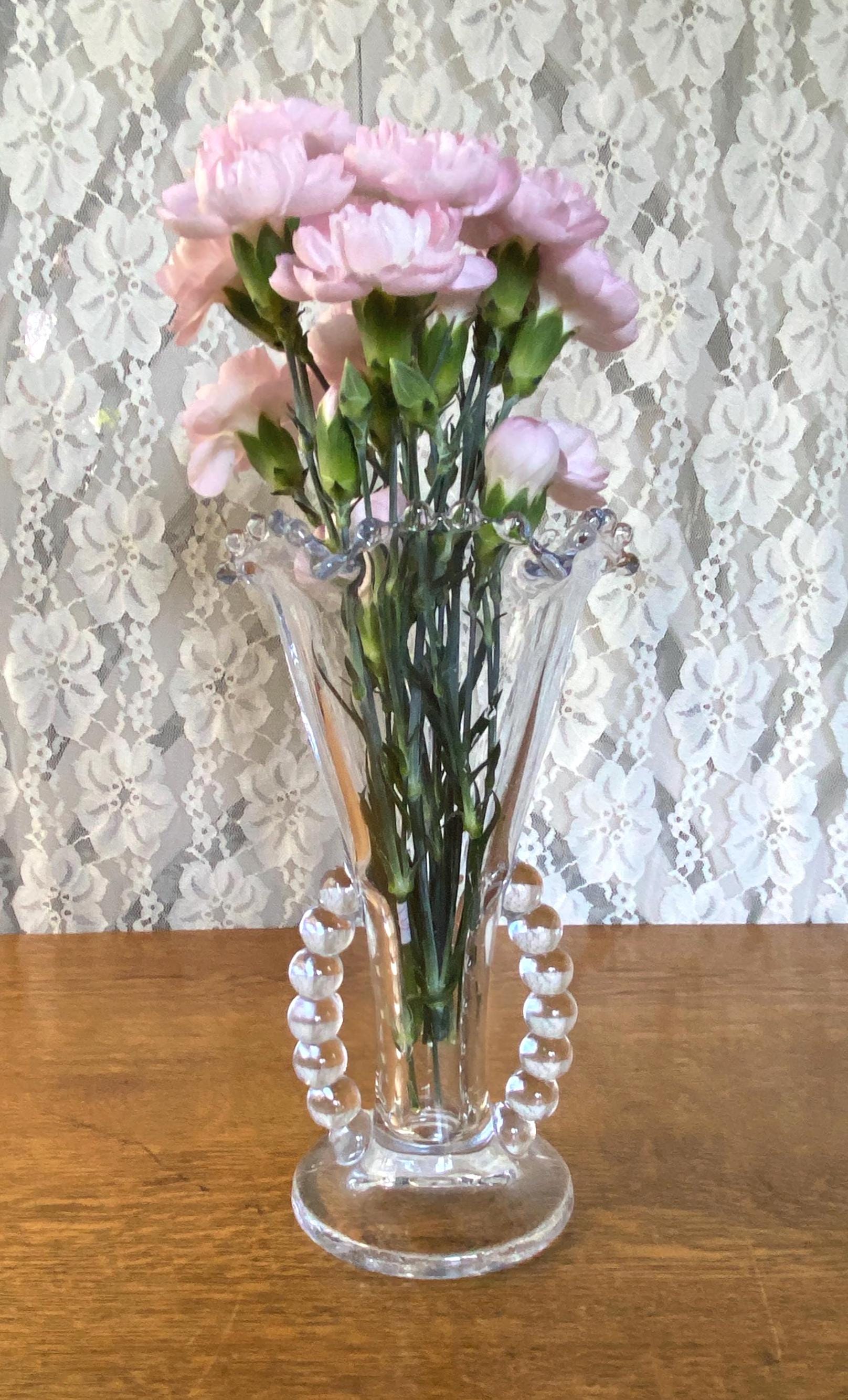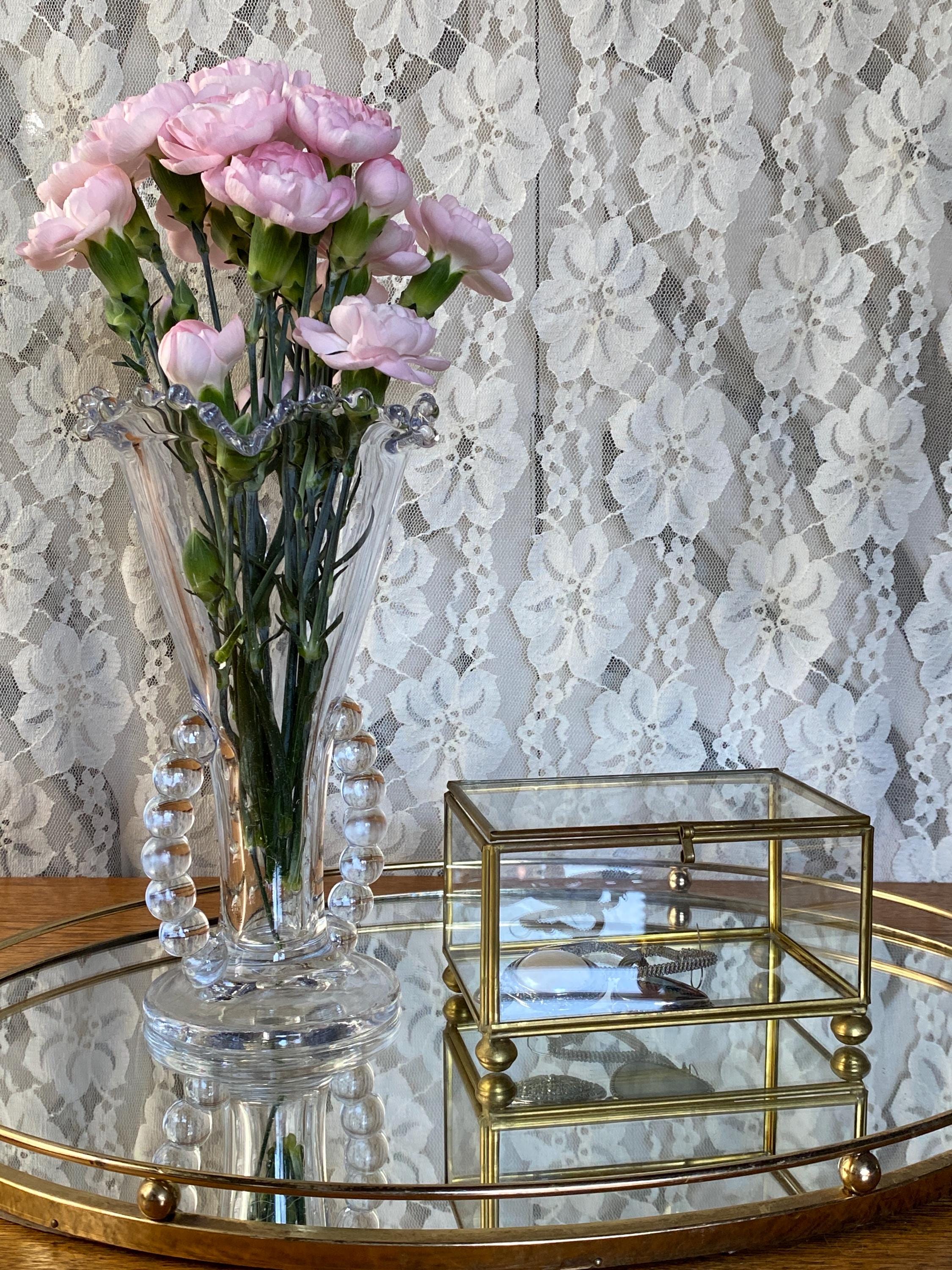 This pretty vintage piece looks lovely on a dining or entryway table or filled with flowers on a vanity top. The delicate ruffled edge has a tiny bubble detail that matches the larger bubble handles. The glass is old and has a significant number of tiny bubbles. 5 inches across top, 8.5 inches tall.