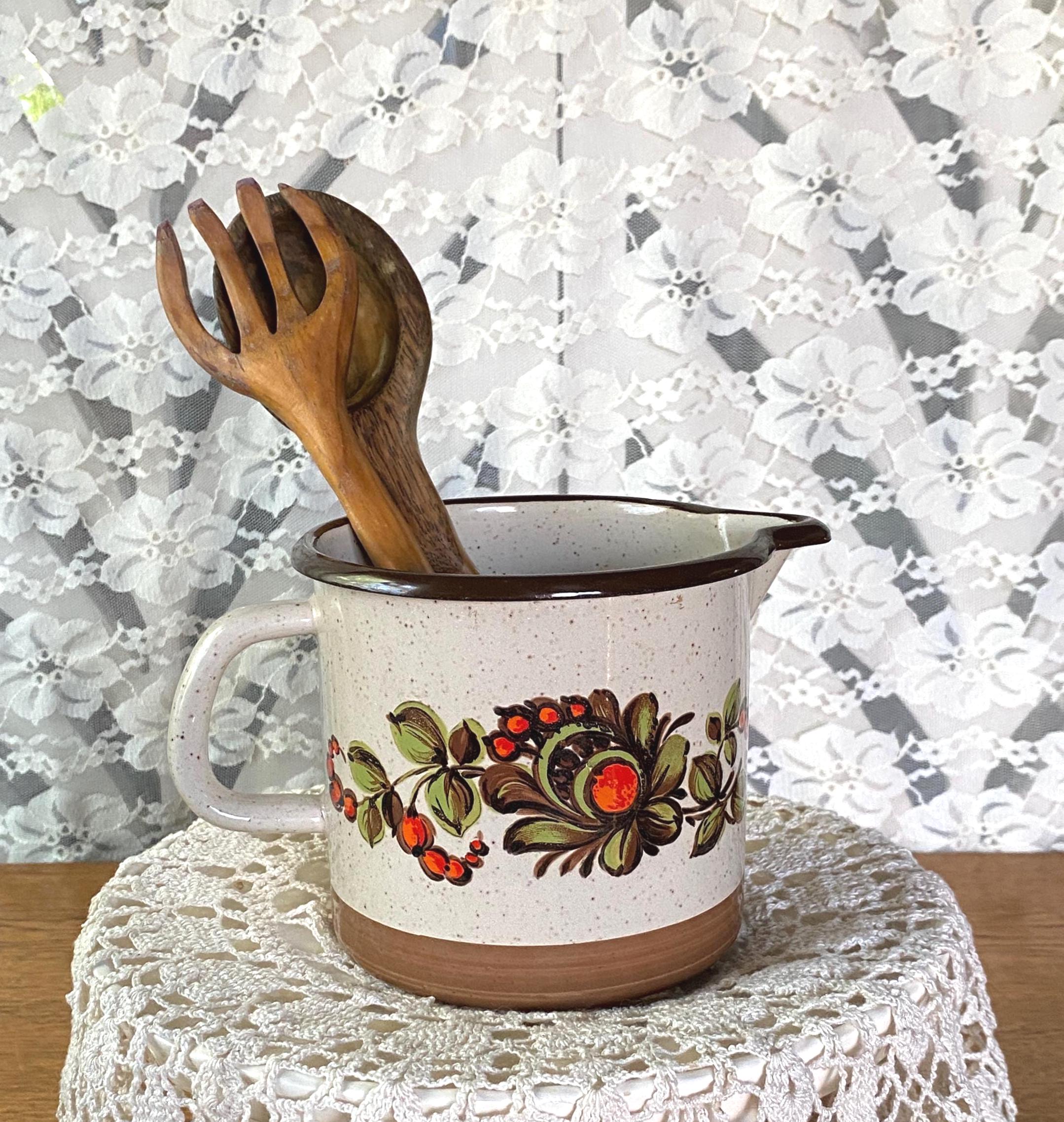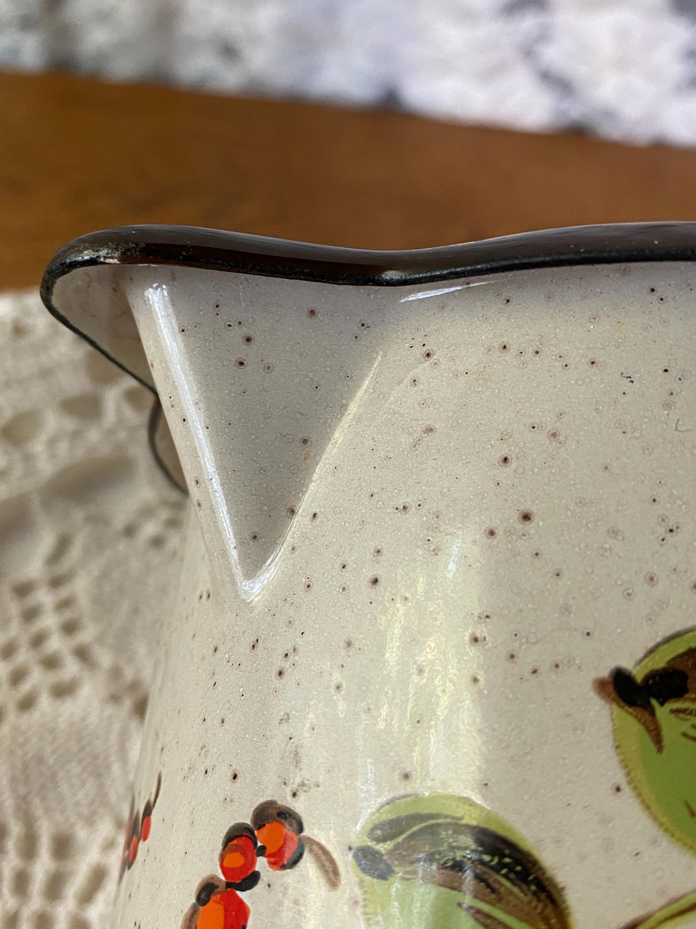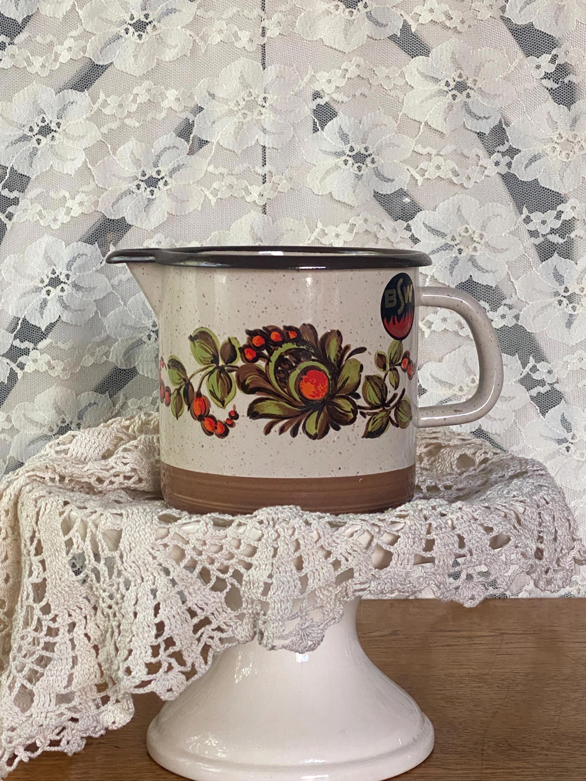 This cute little pitcher is a great piece for serving drinks or displaying flowers on a kitchen table or shelf. Retro/ mid-century colored flowers and a speckled enamel background. 7X4X6.5 inches. Some chips around rim and spout/ see photos.