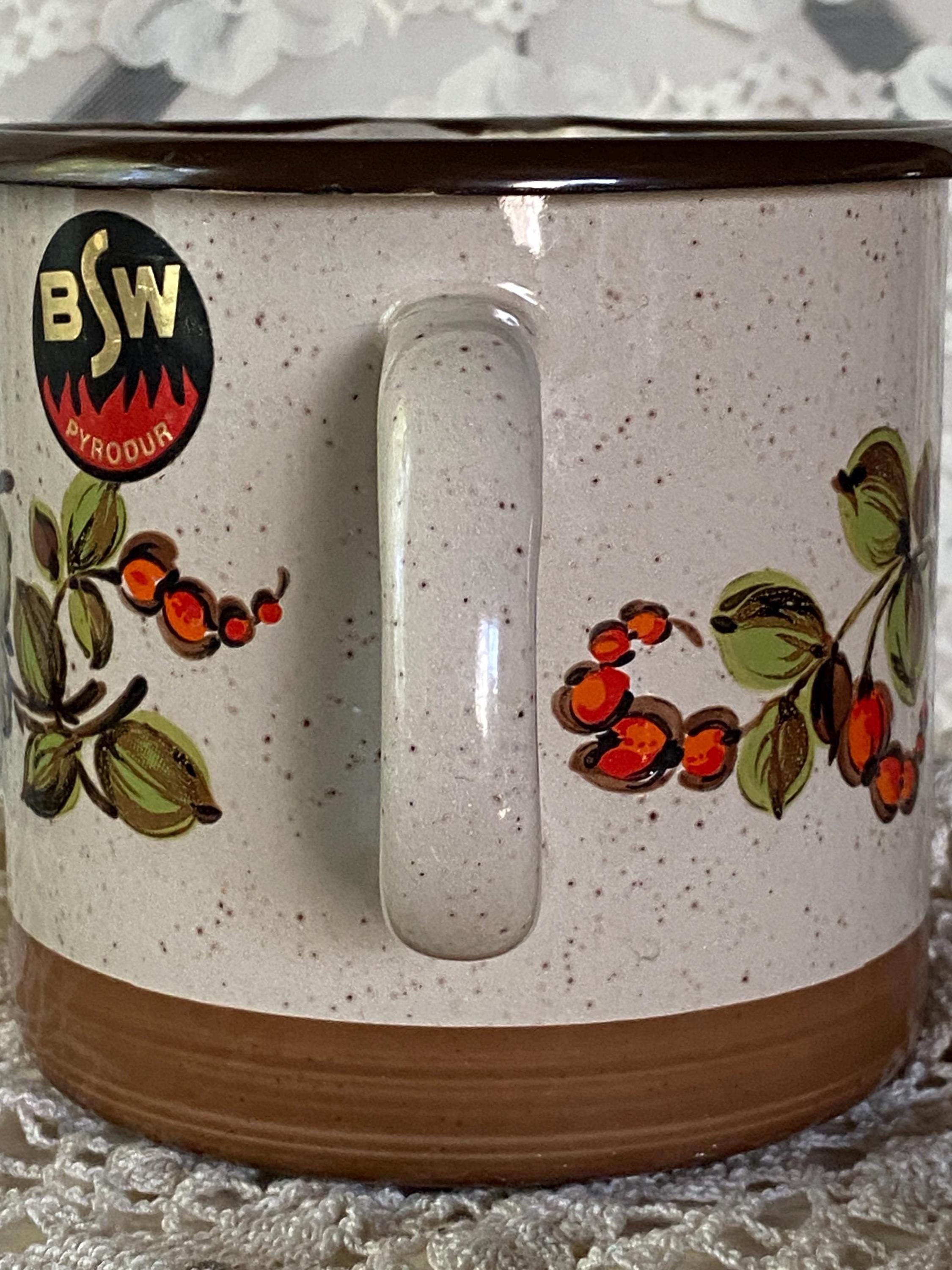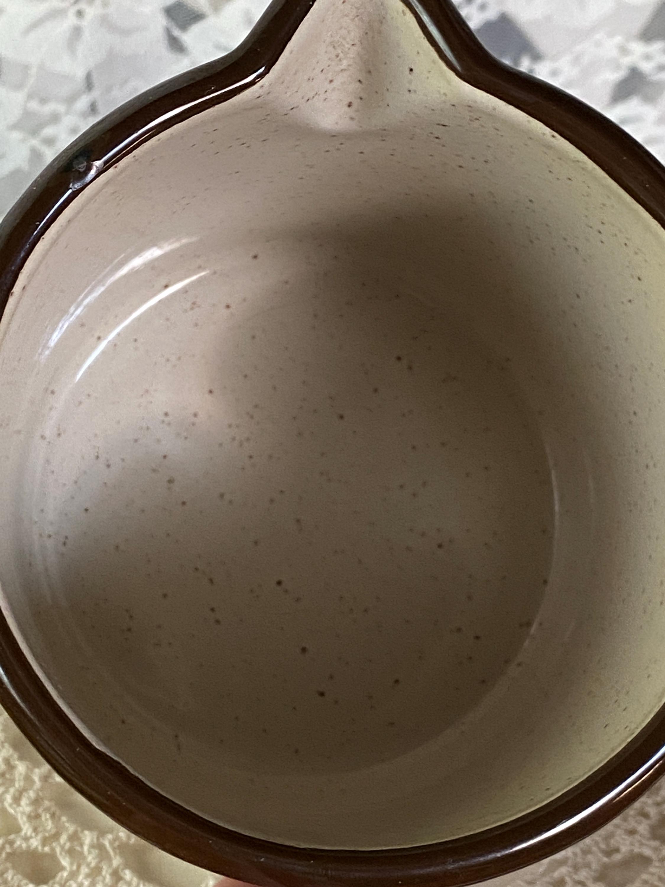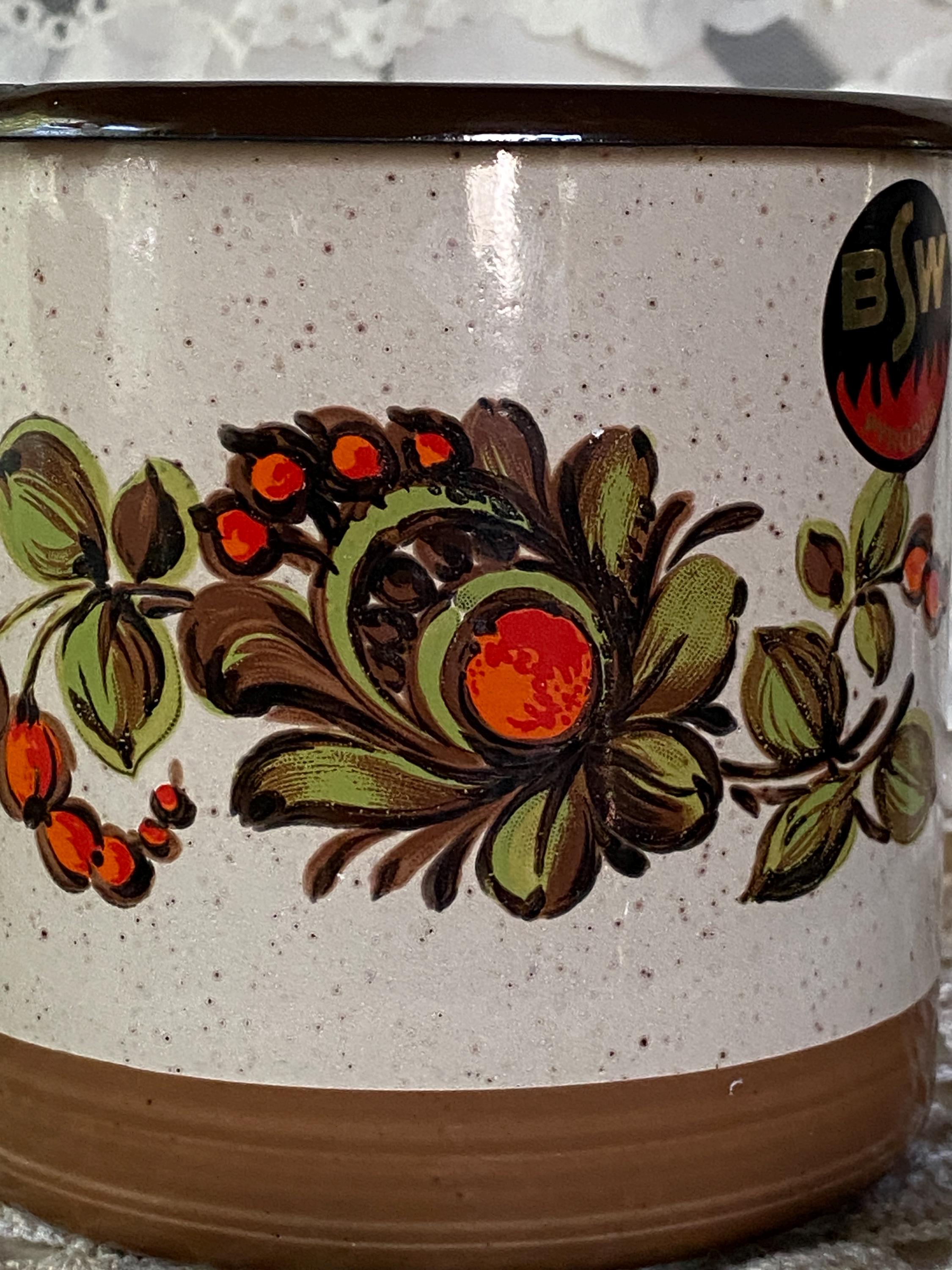 This cute little pitcher is a great piece for serving drinks or displaying flowers on a kitchen table or shelf. Retro/ mid-century colored flowers and a speckled enamel background. 7X4X6.5 inches. Some chips around rim and spout/ see photos.