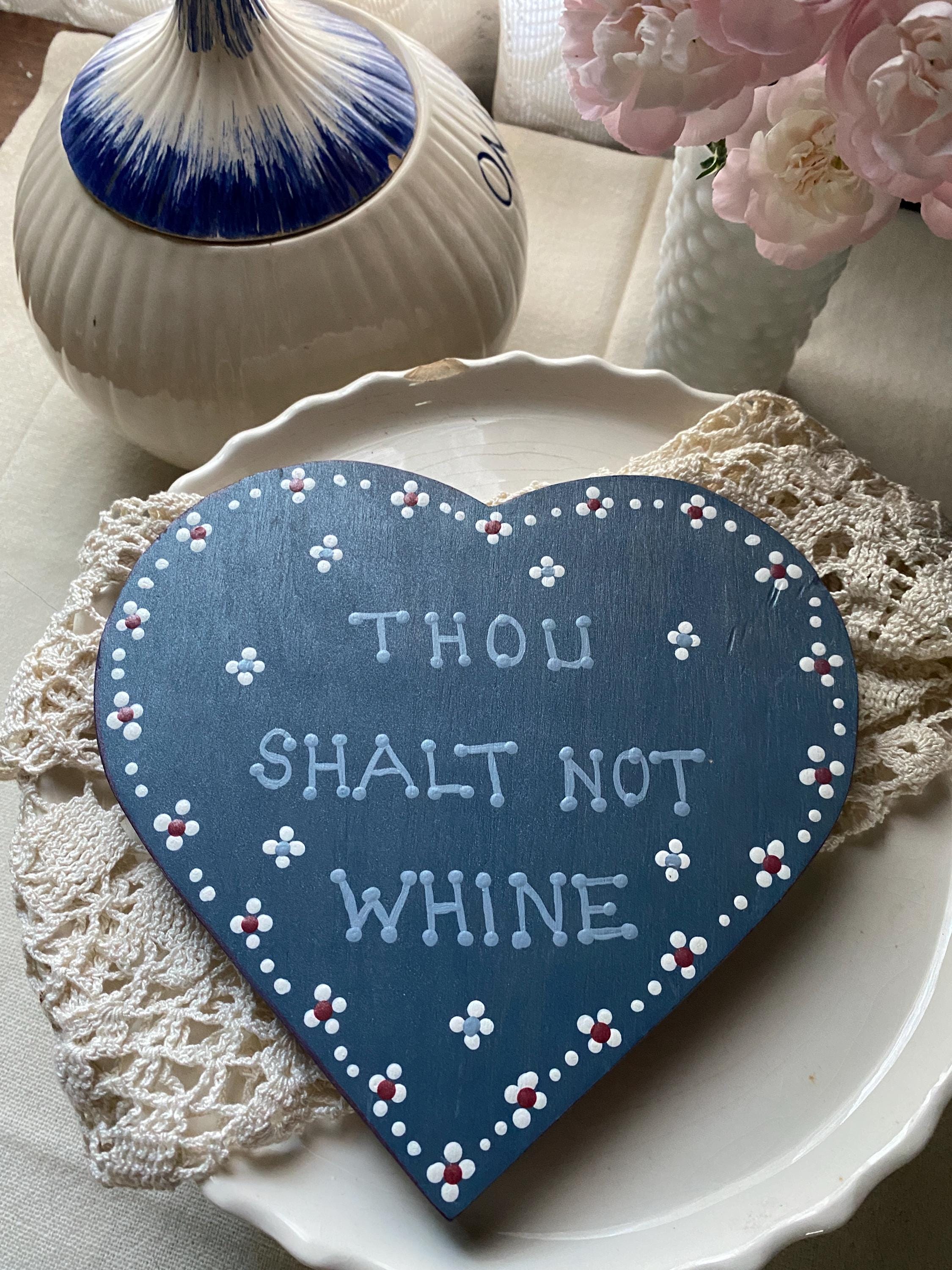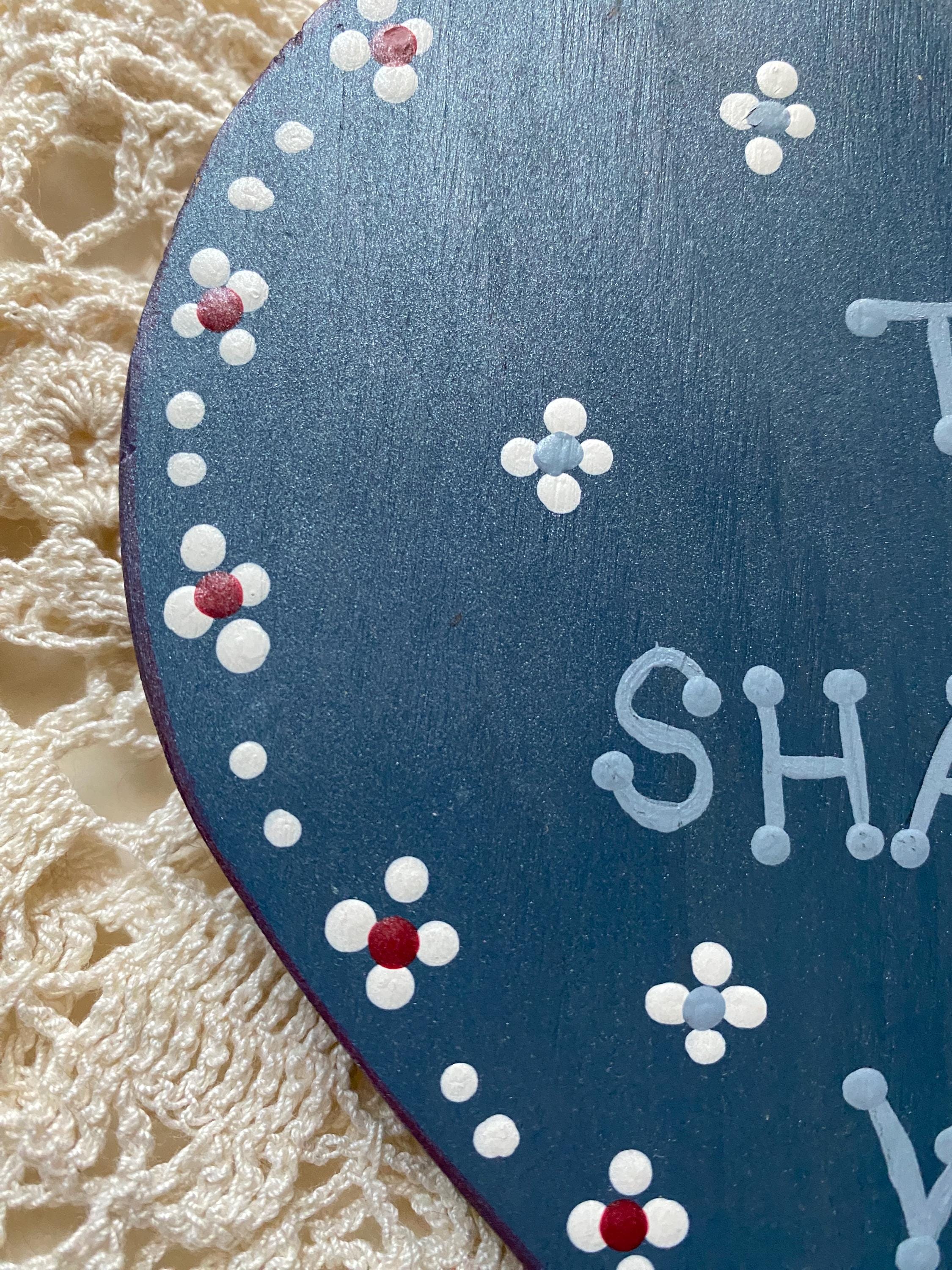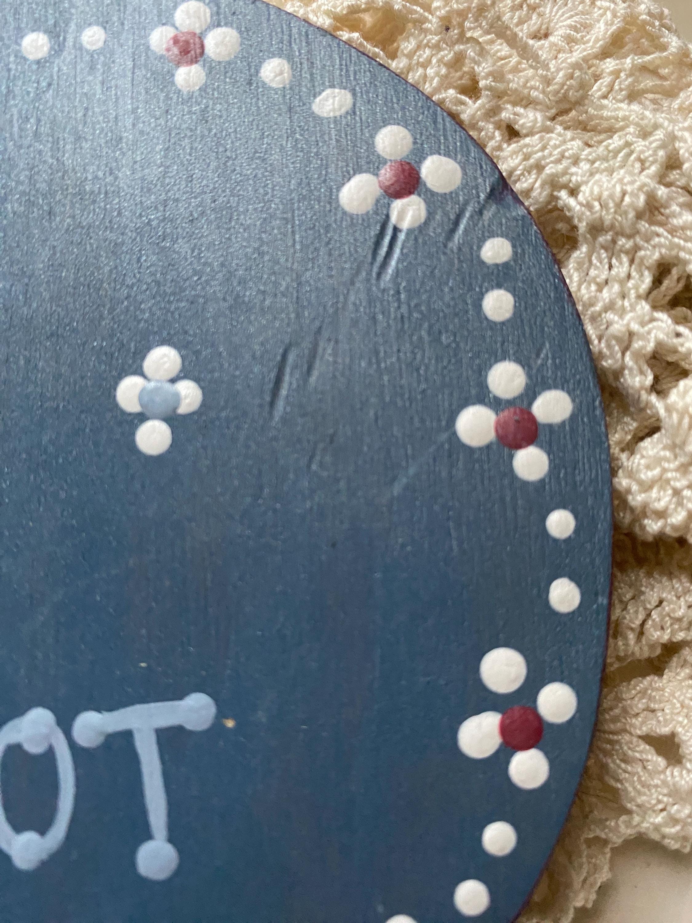 Perfect decor for a home with busy children this funny little sign is a great addition to a kitchen or entryway! Blue with little white flowers and ready to hang. 7X7 inches. A few little dings and scuffs from previous use.