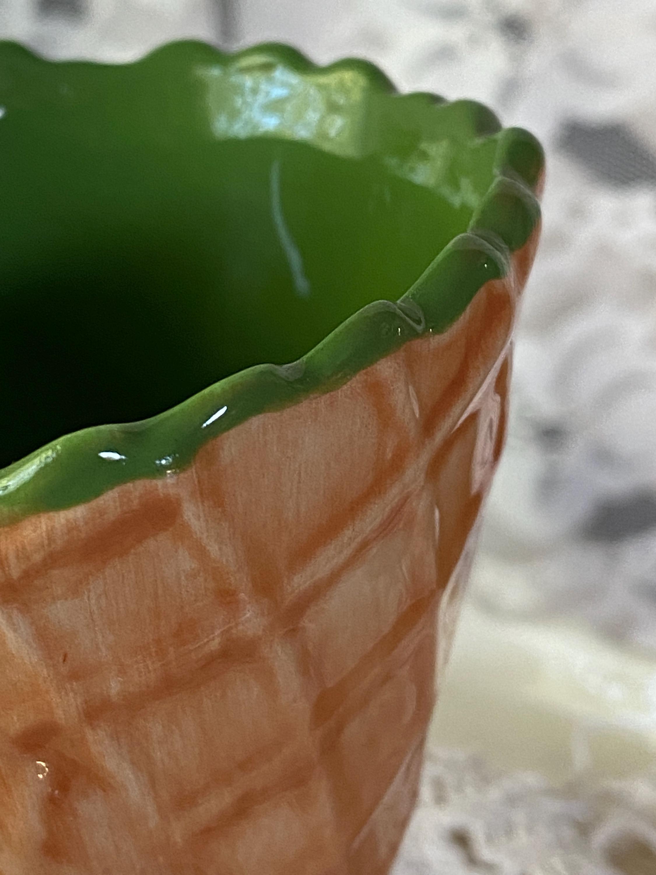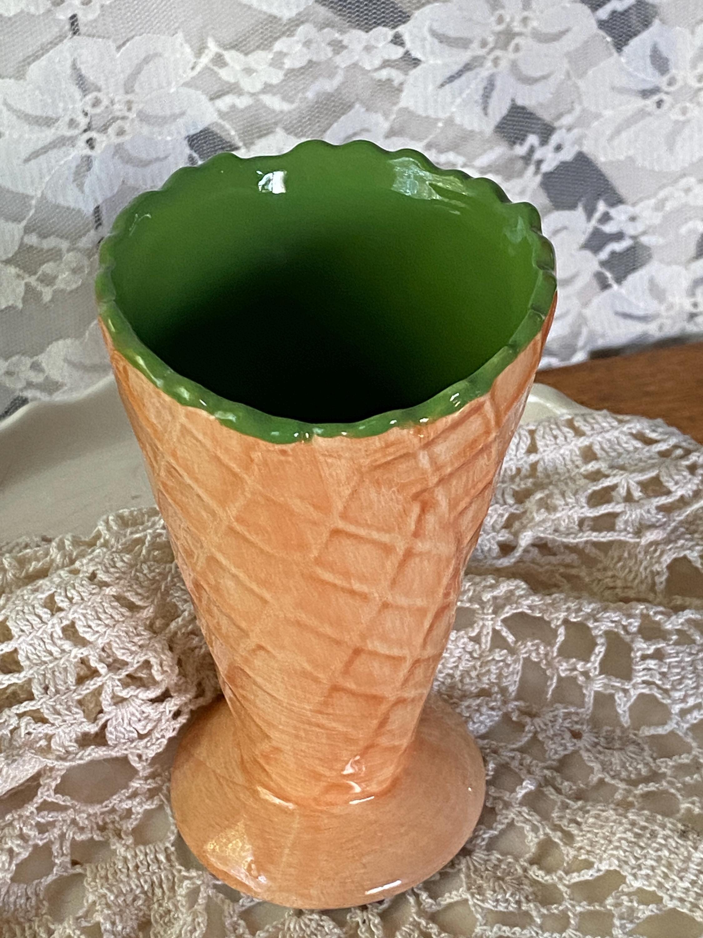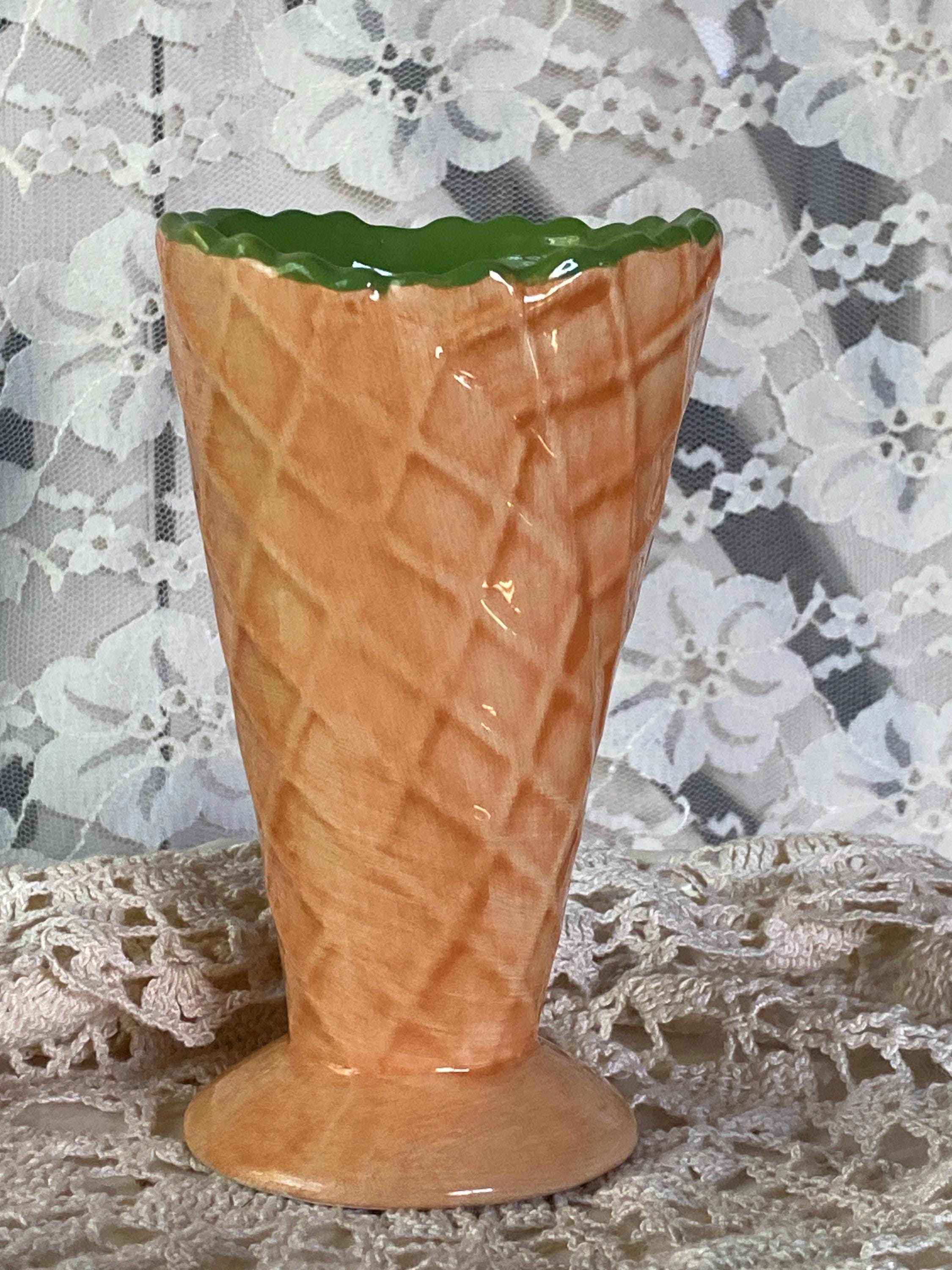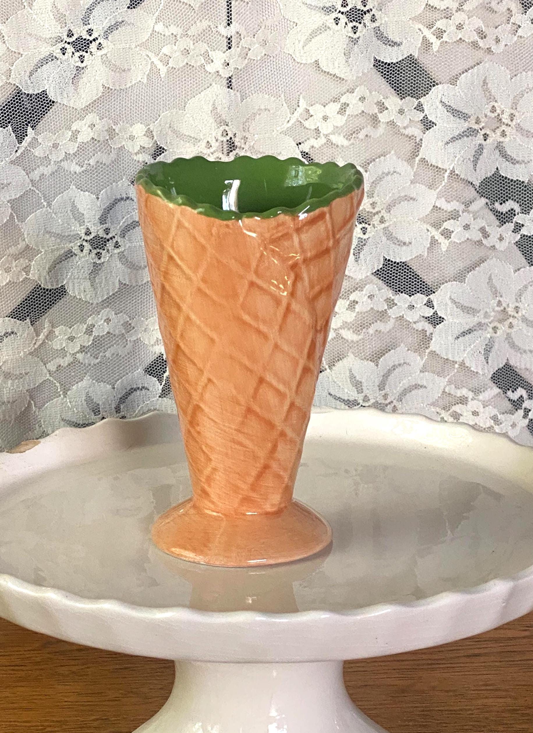 Perfect for serving up an ice cream sundae! Shaped like a waffle cone, with a bright green interior, this little piece is useful but looks so cute on a kitchen shelf as well. Some small scratches, a few glaze imperfections around the rim, and rubbing on bottom. 5 inches tall, 3 inches across the top.