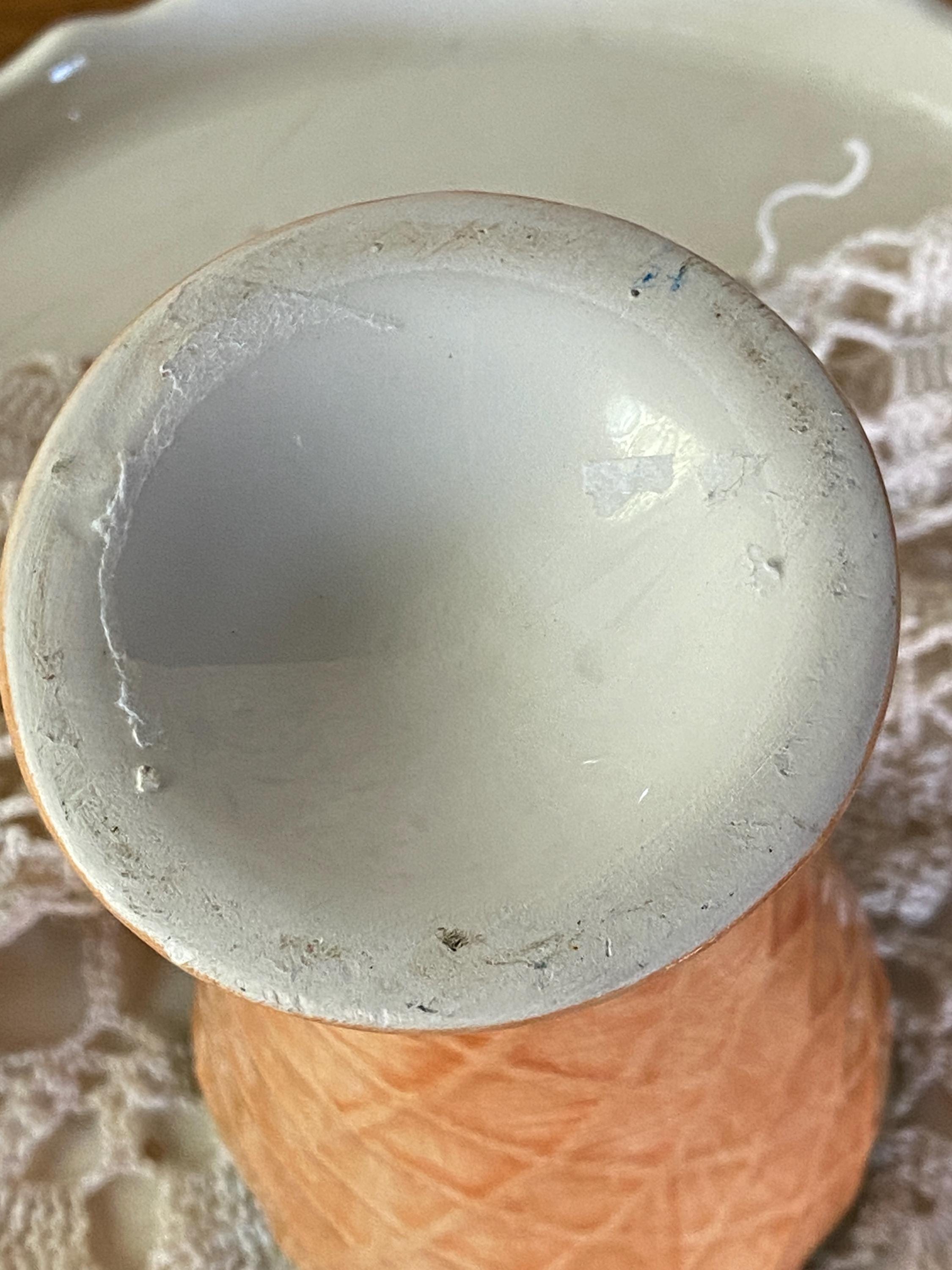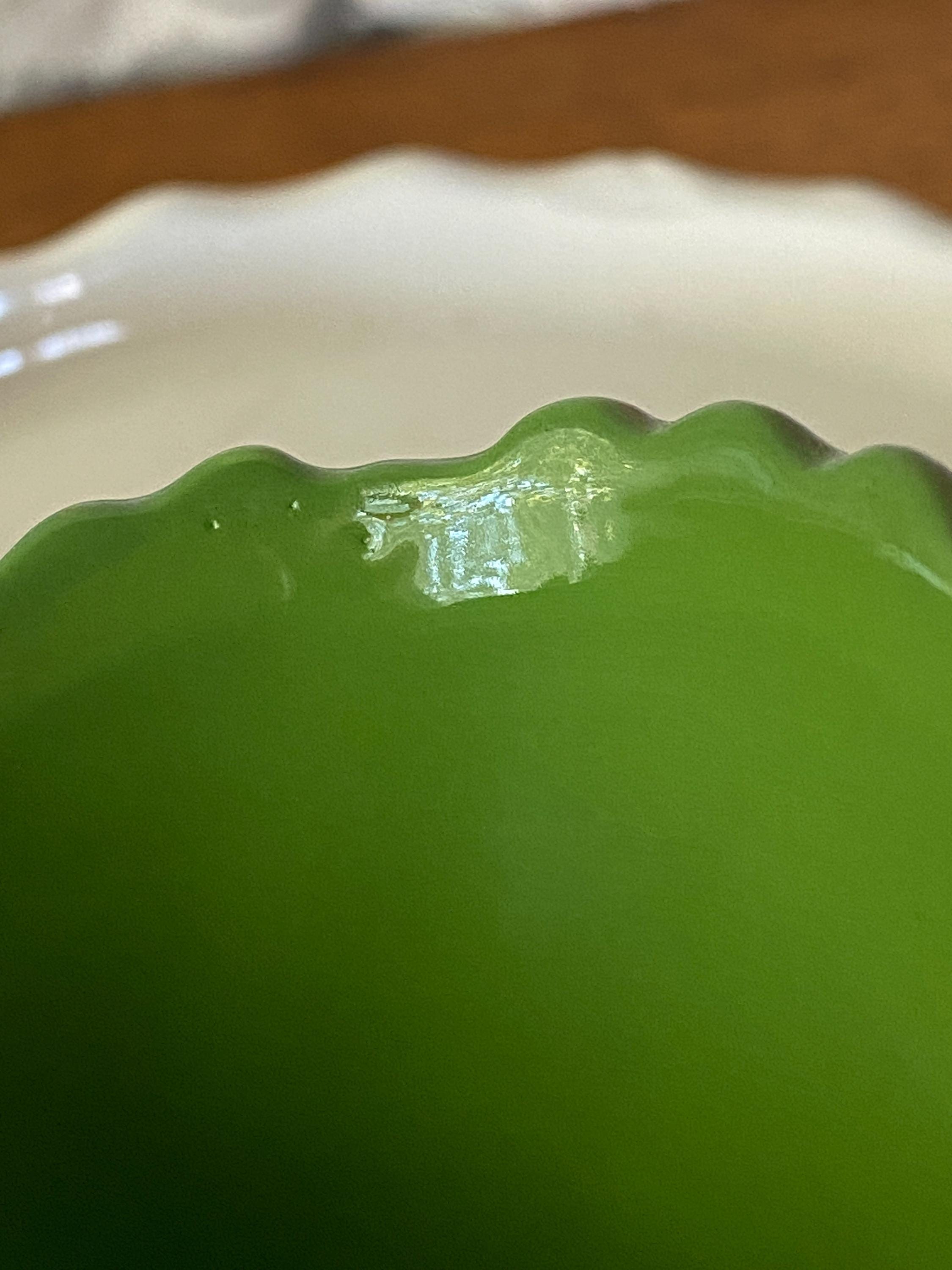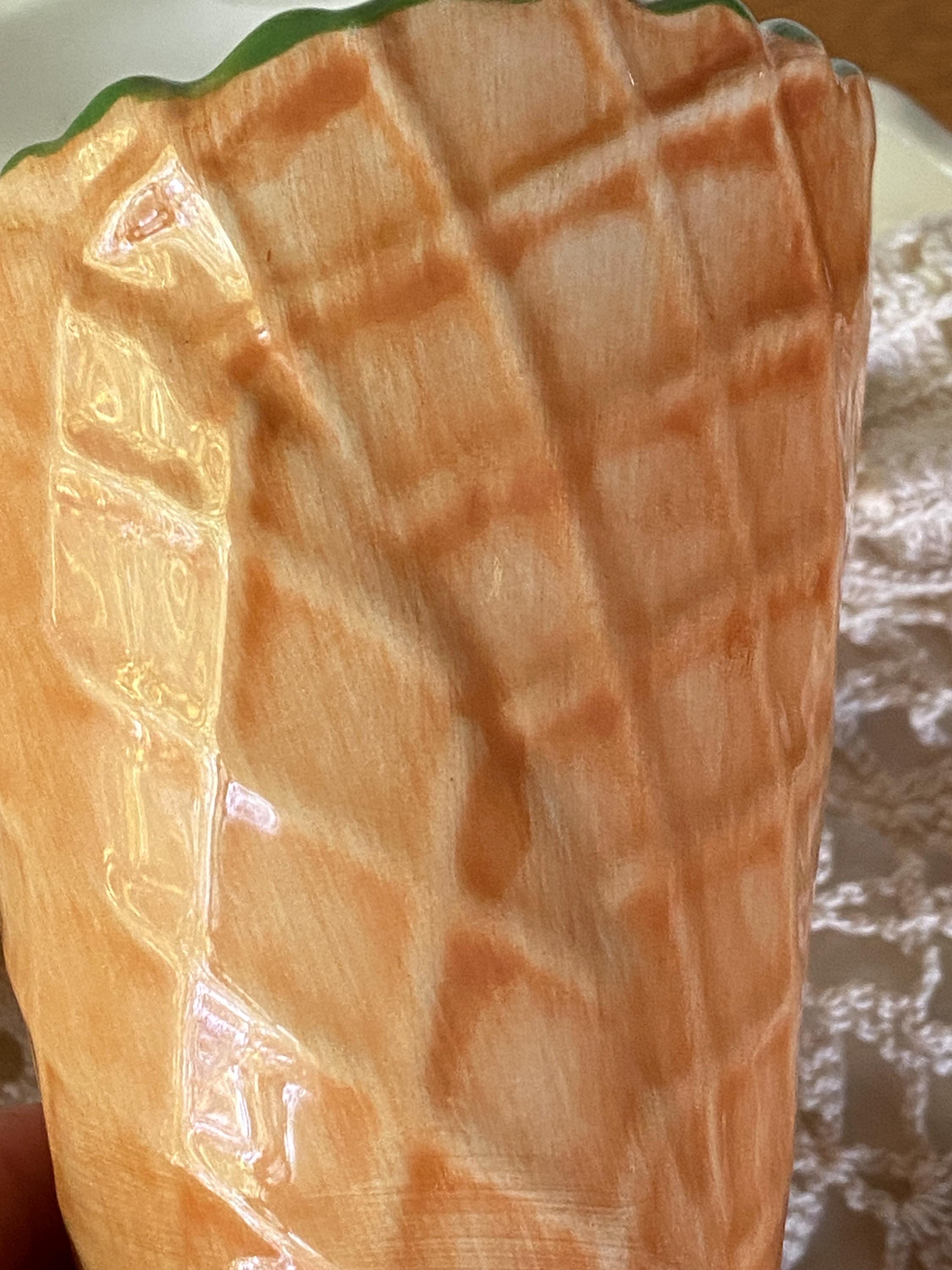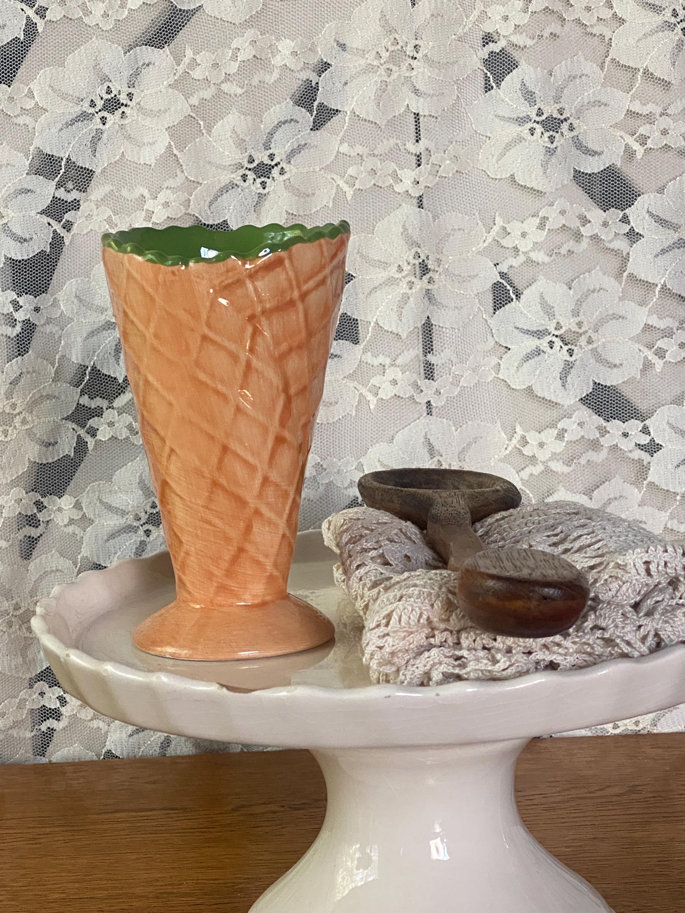 Perfect for serving up an ice cream sundae! Shaped like a waffle cone, with a bright green interior, this little piece is useful but looks so cute on a kitchen shelf as well. Some small scratches, a few glaze imperfections around the rim, and rubbing on bottom. 5 inches tall, 3 inches across the top.