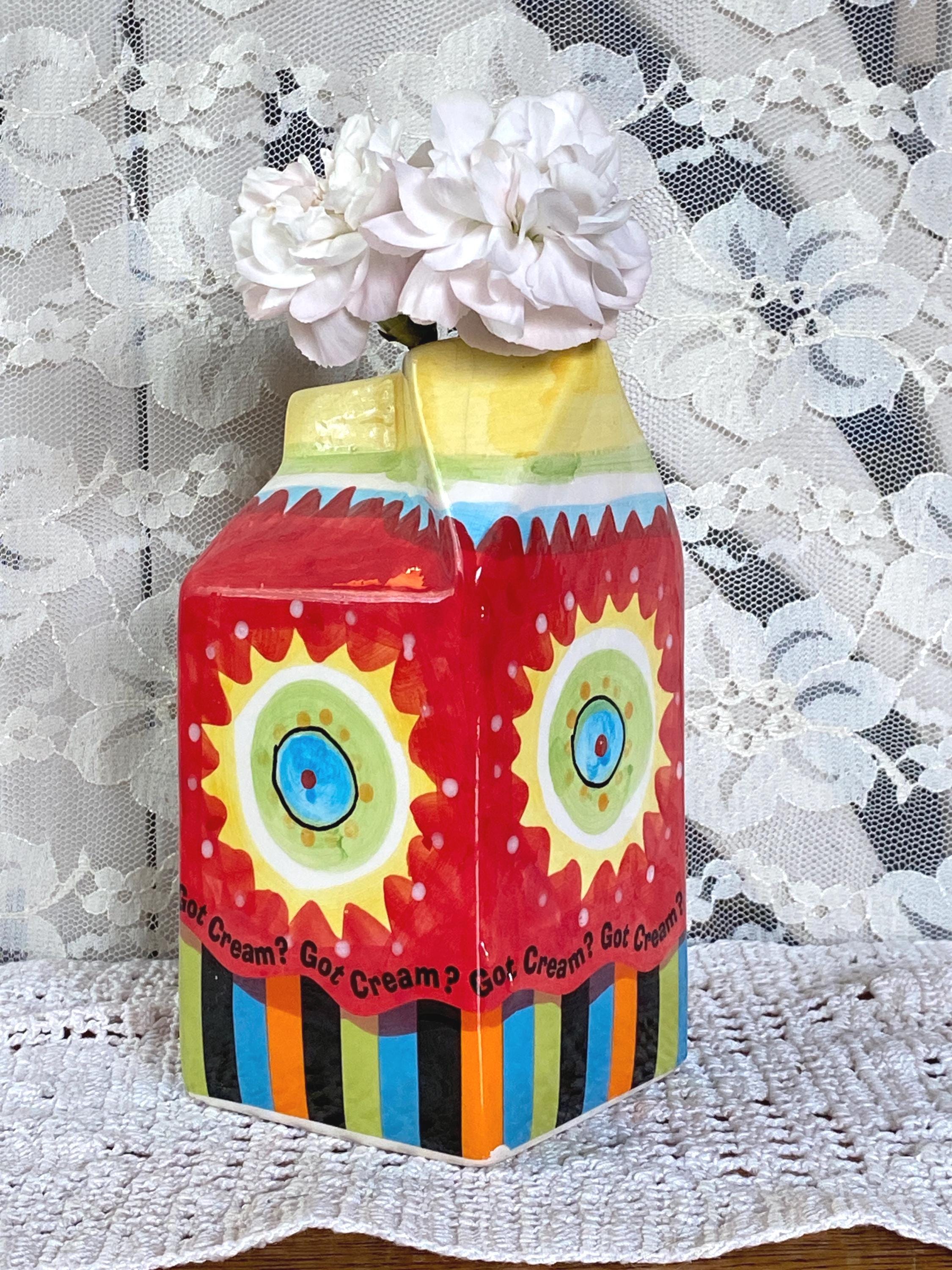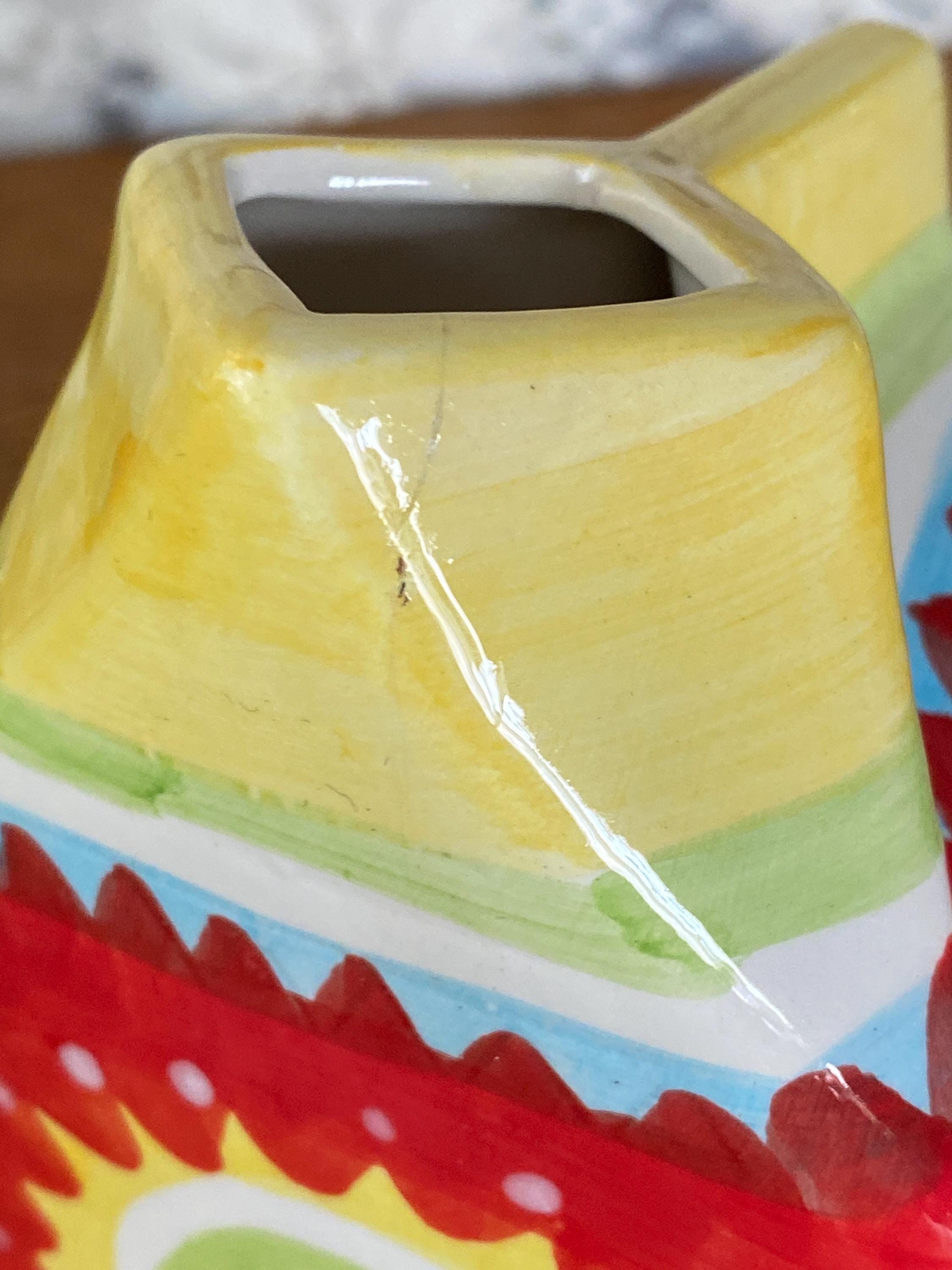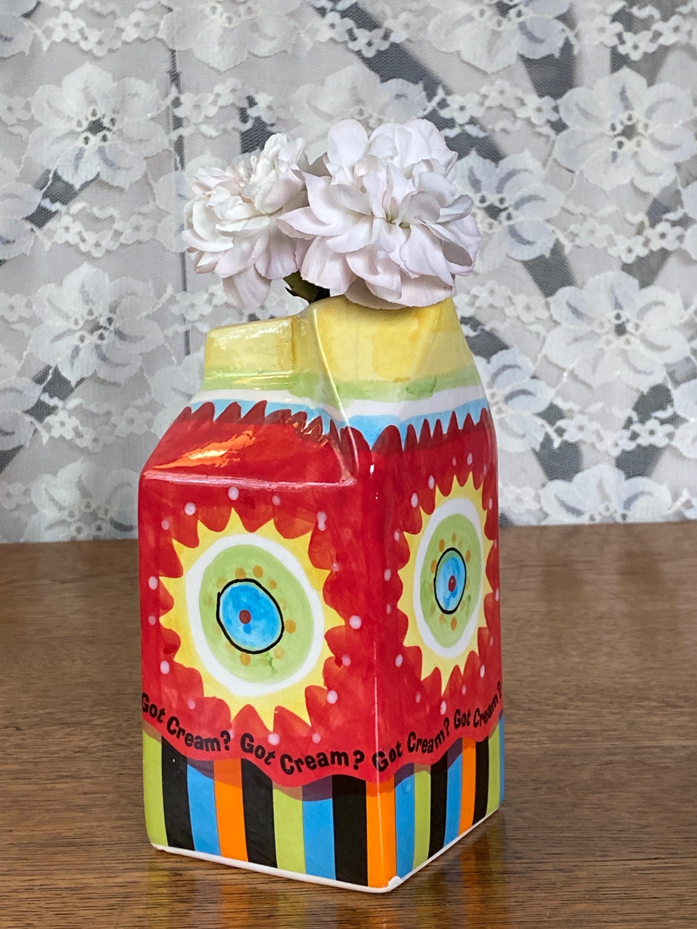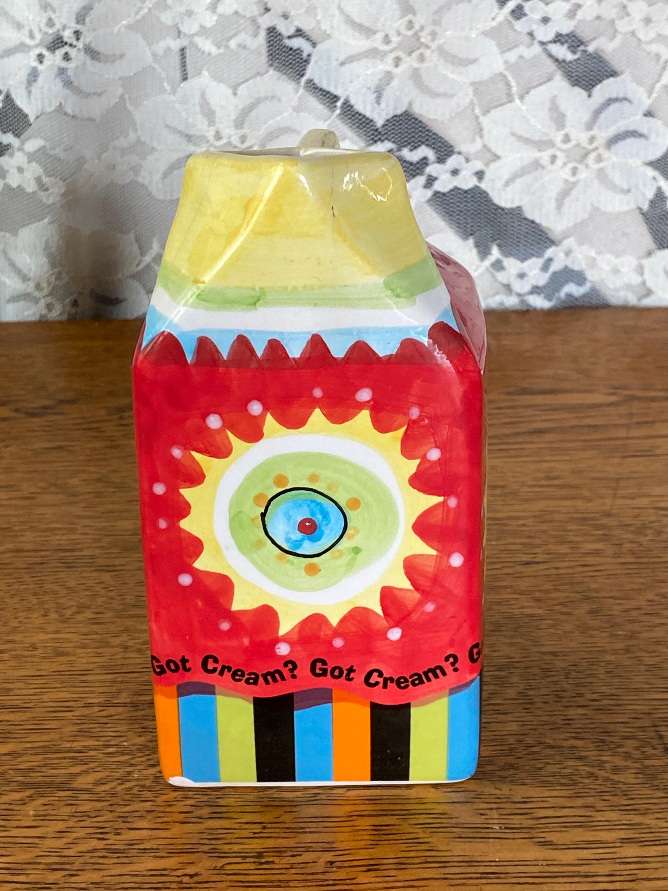 This cheerful little pitcher has bright colors all over and a whimsical carton shape. Great for serving cream or for use as a little vase. 3X3X5 inches. Bella Gaza for Ganz. *** Please review photos carefully - this item has a couple of chips along bottom and small hairline cracks at rim.***
