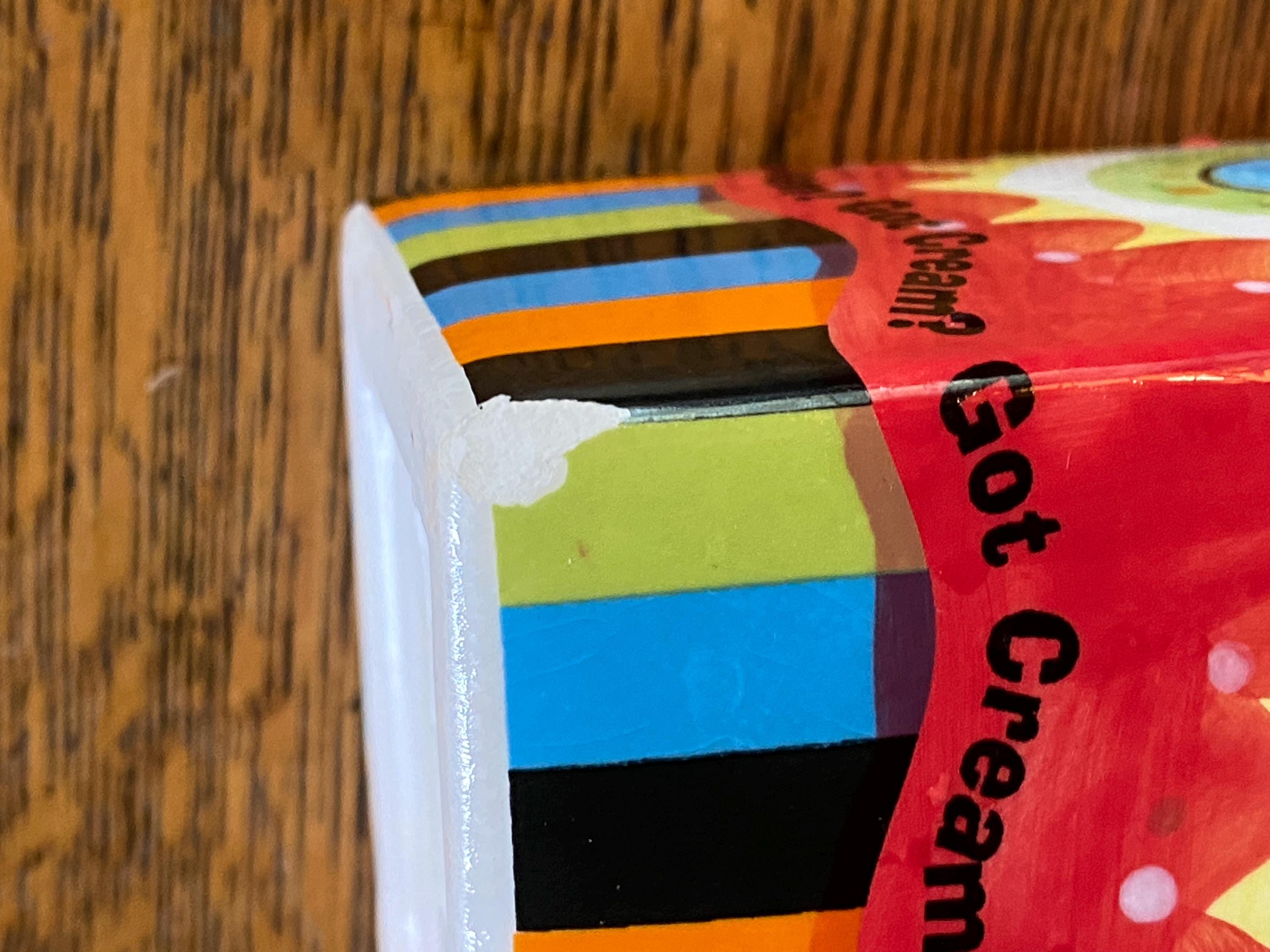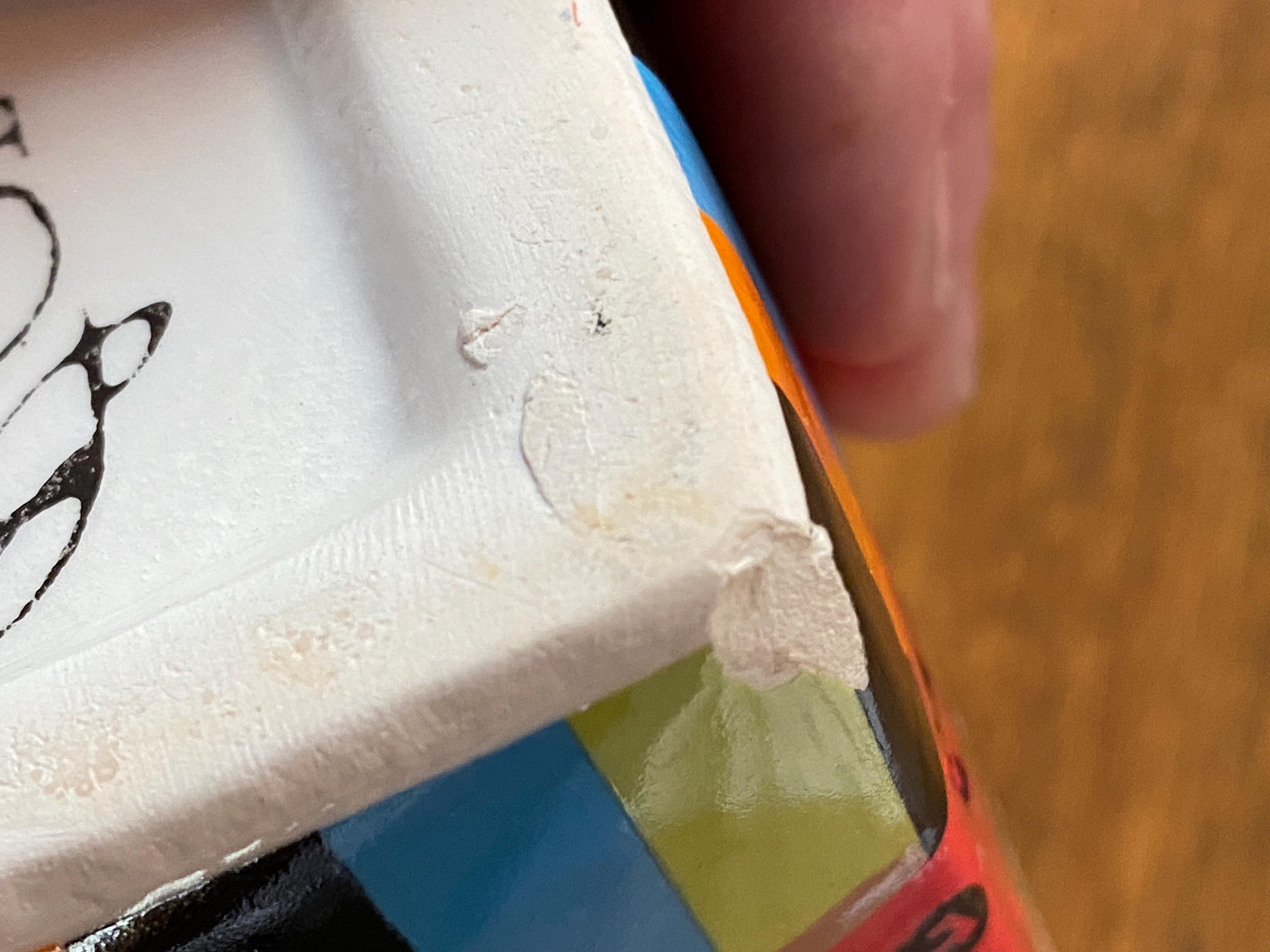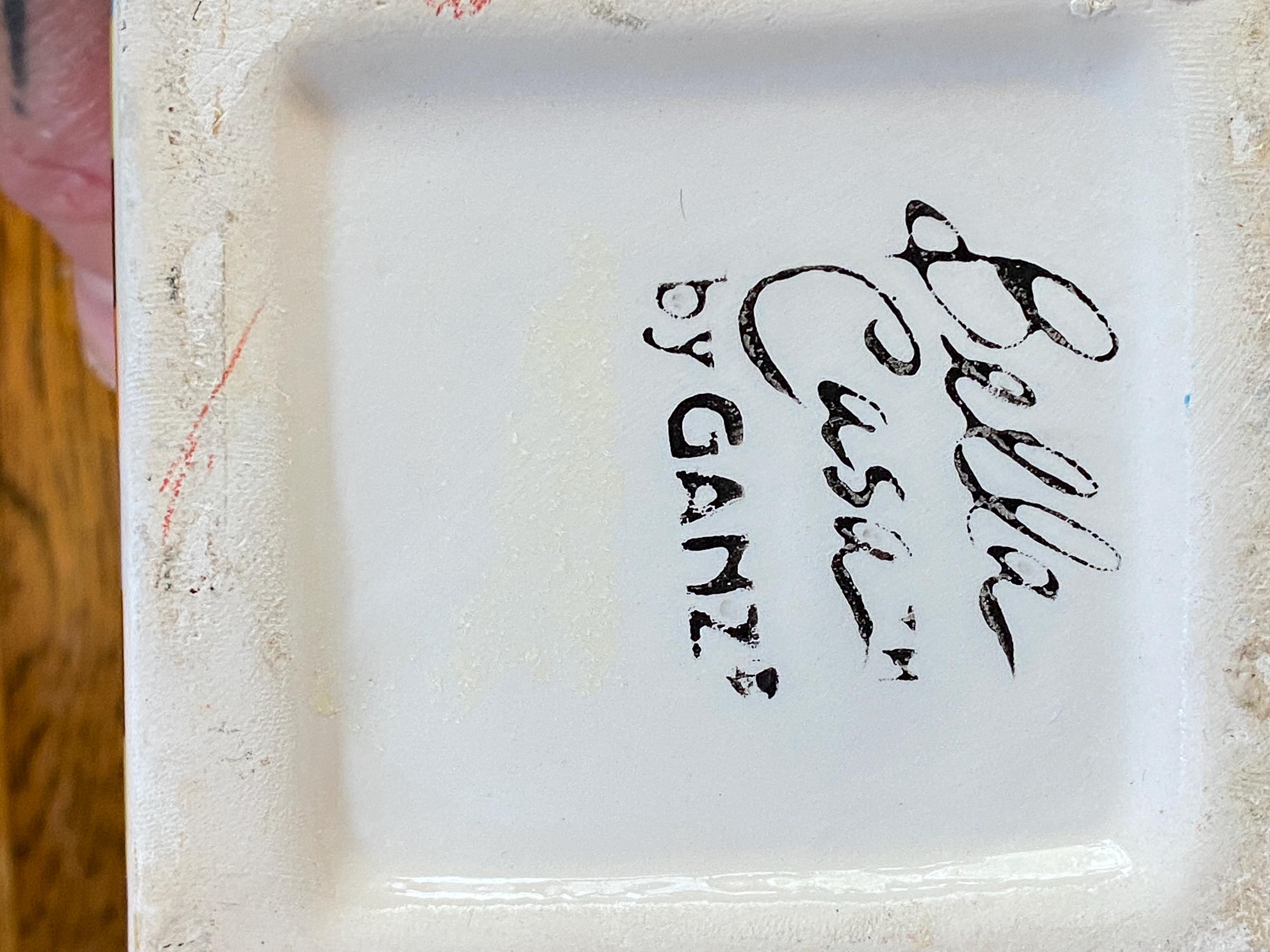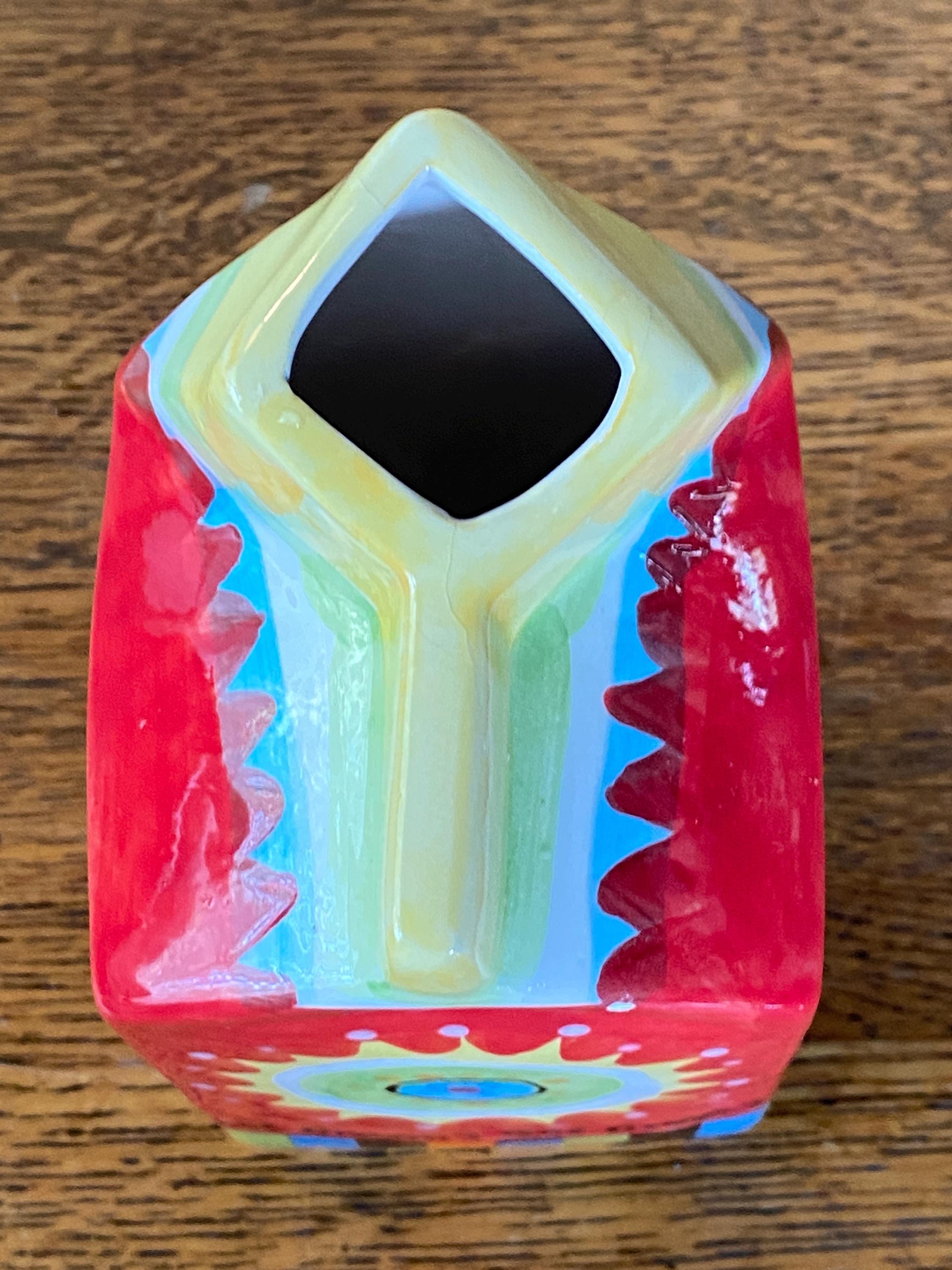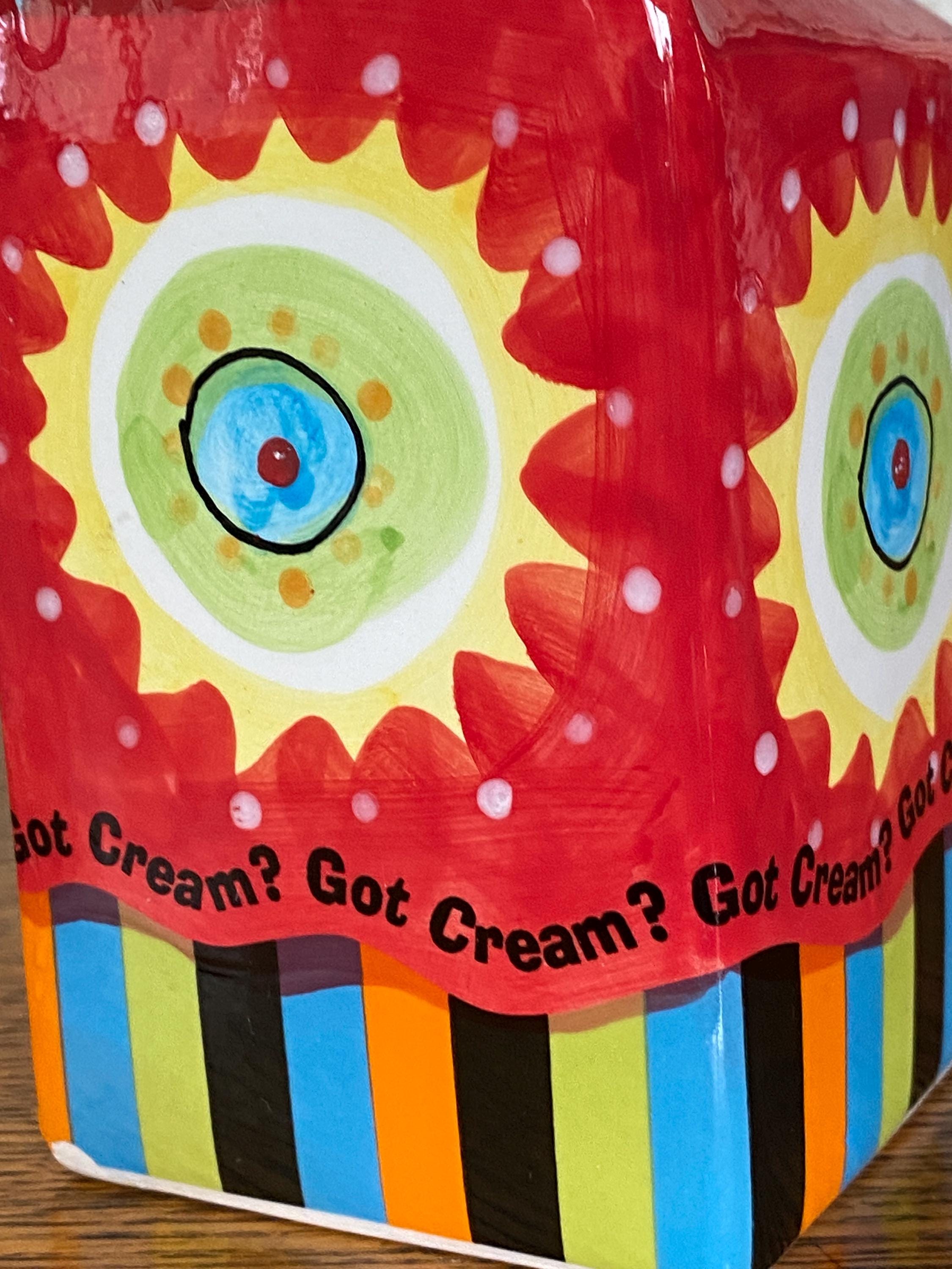 This cheerful little pitcher has bright colors all over and a whimsical carton shape. Great for serving cream or for use as a little vase. 3X3X5 inches. Bella Gaza for Ganz. *** Please review photos carefully - this item has a couple of chips along bottom and small hairline cracks at rim.***