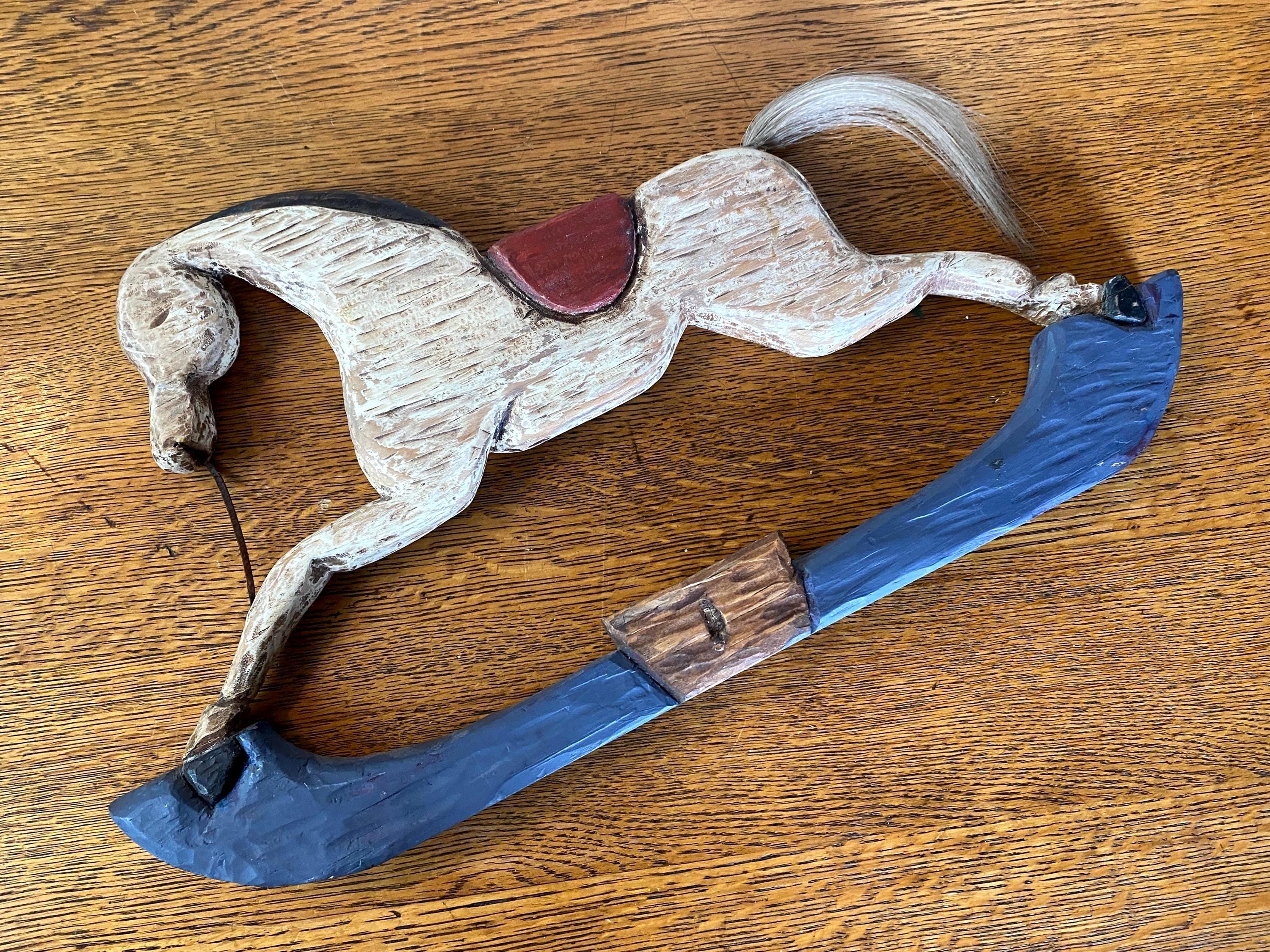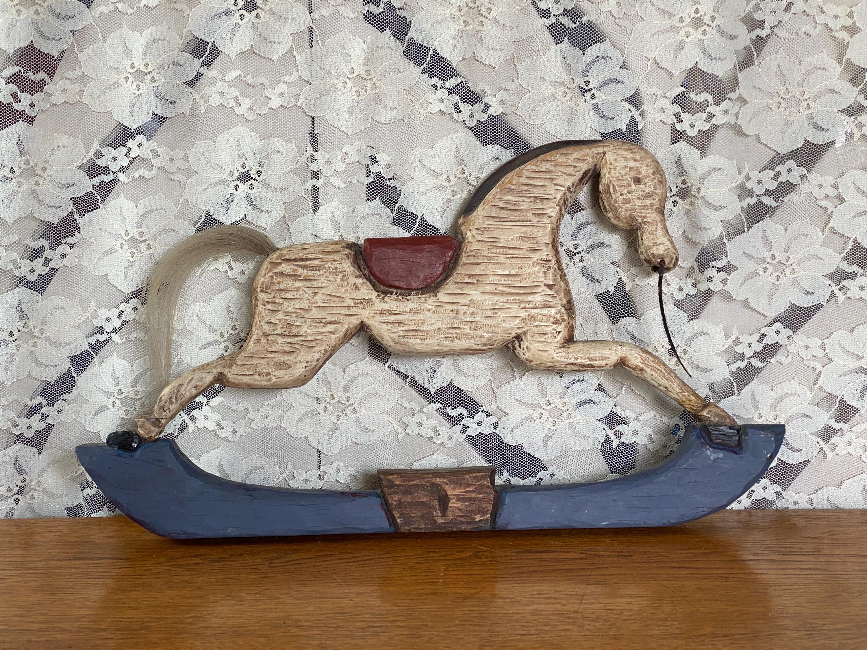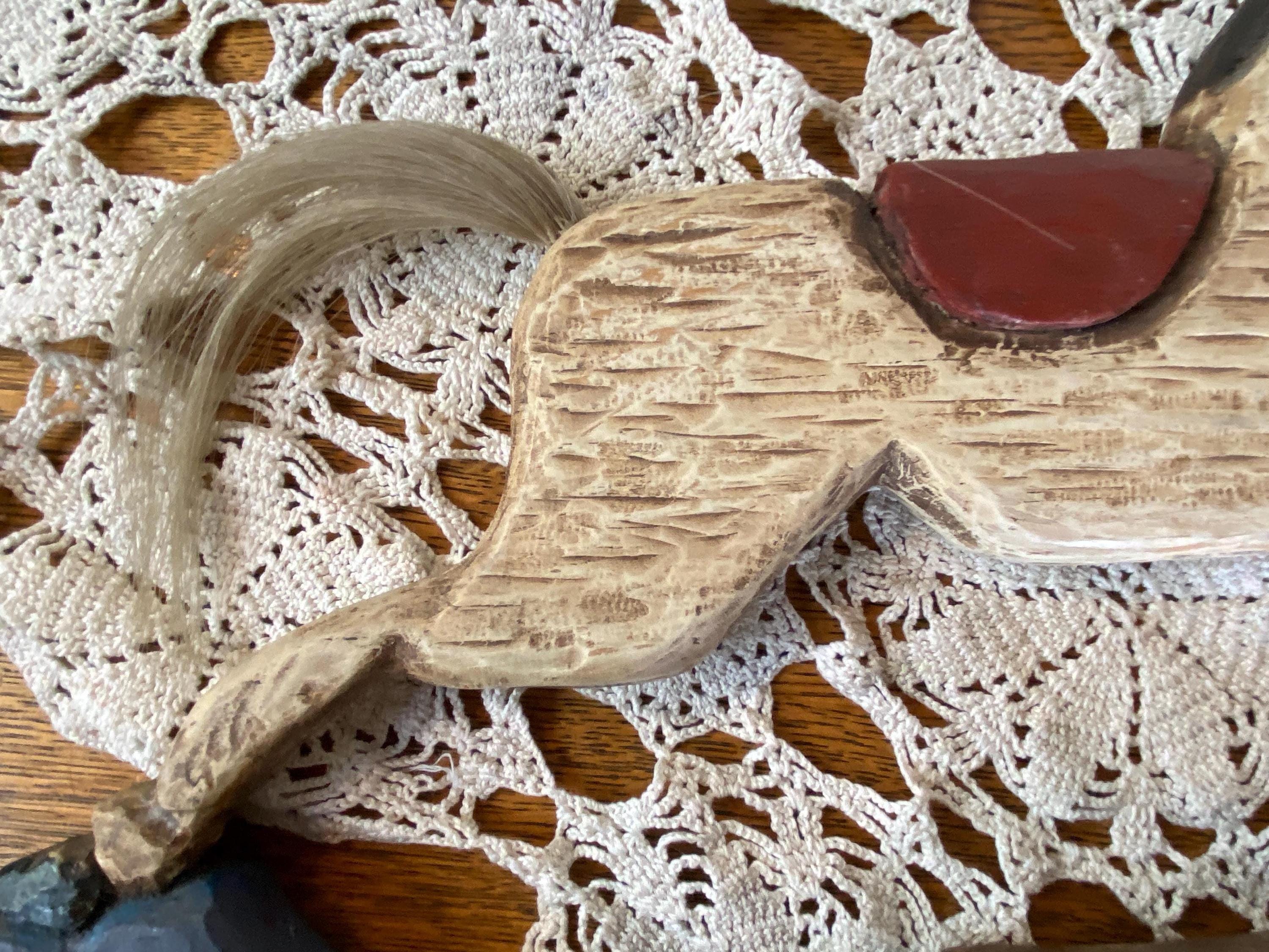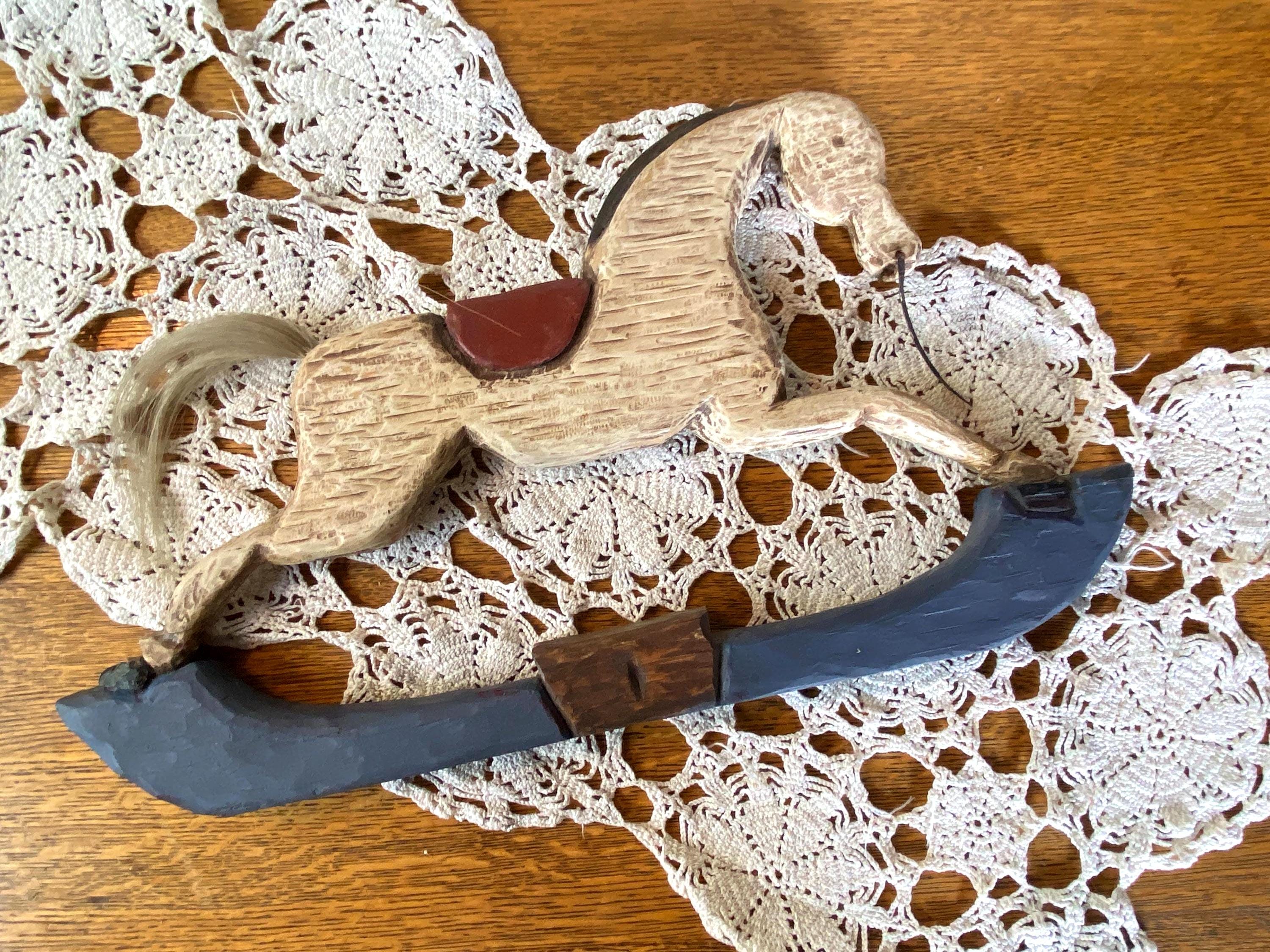 This is a beautiful handmade piece with a real hair mane and leather reins. The primitive style is perfect in a country or farmhouse style home and would make great wall decor in a nursery. Some wear on wood and leather reins have broken. The leather is EXTREMELY fragile and I've used some glue to hold them together. However, care will have to be taken to keep the leather from breaking. 15.5 inches long, 9 inches tall. All items in my shop are vintage or handmade and may have signs of use, wear, or variation consistent with age or hand production. Please review the photos and video carefully and message me with any questions on condition.