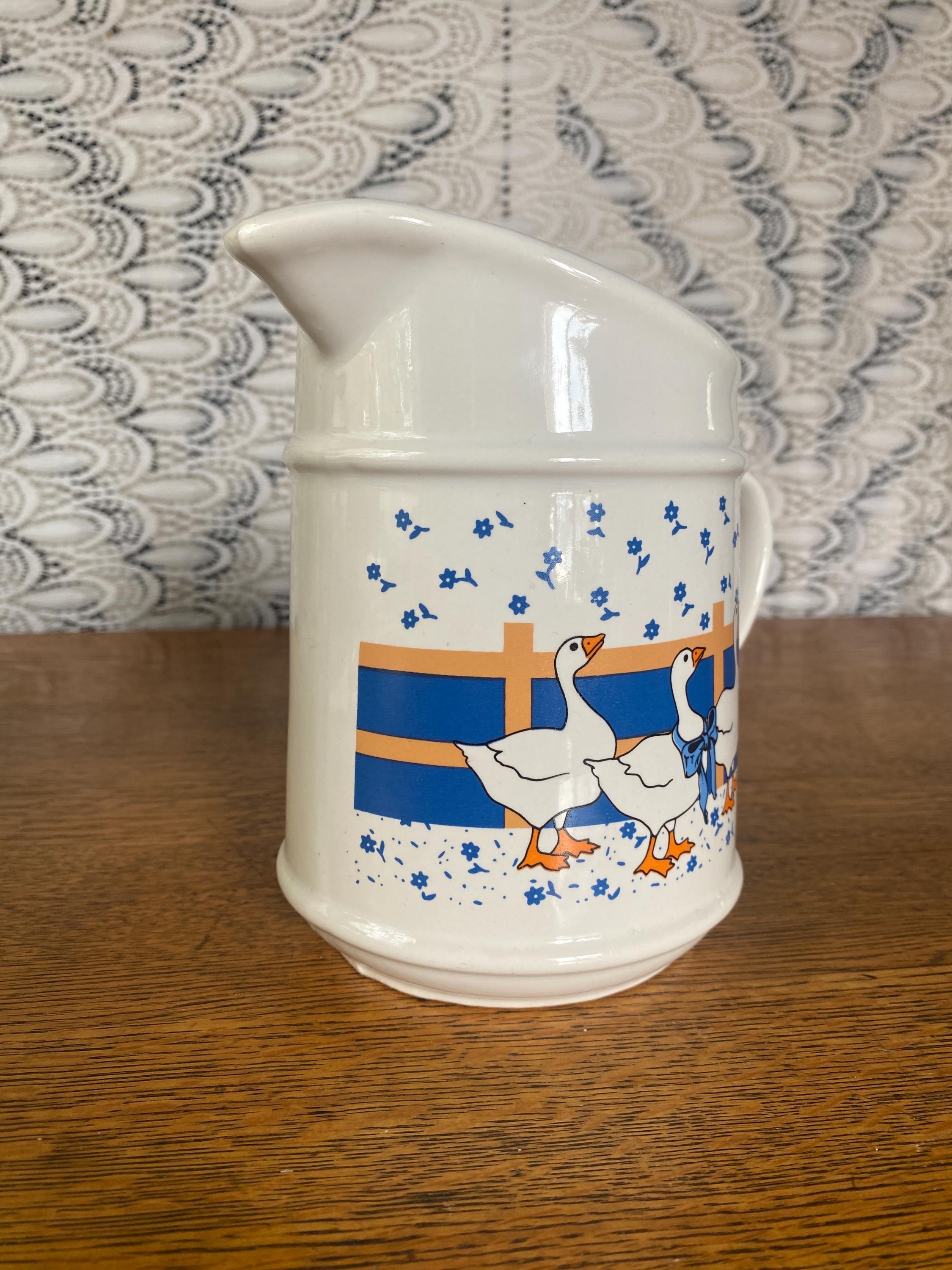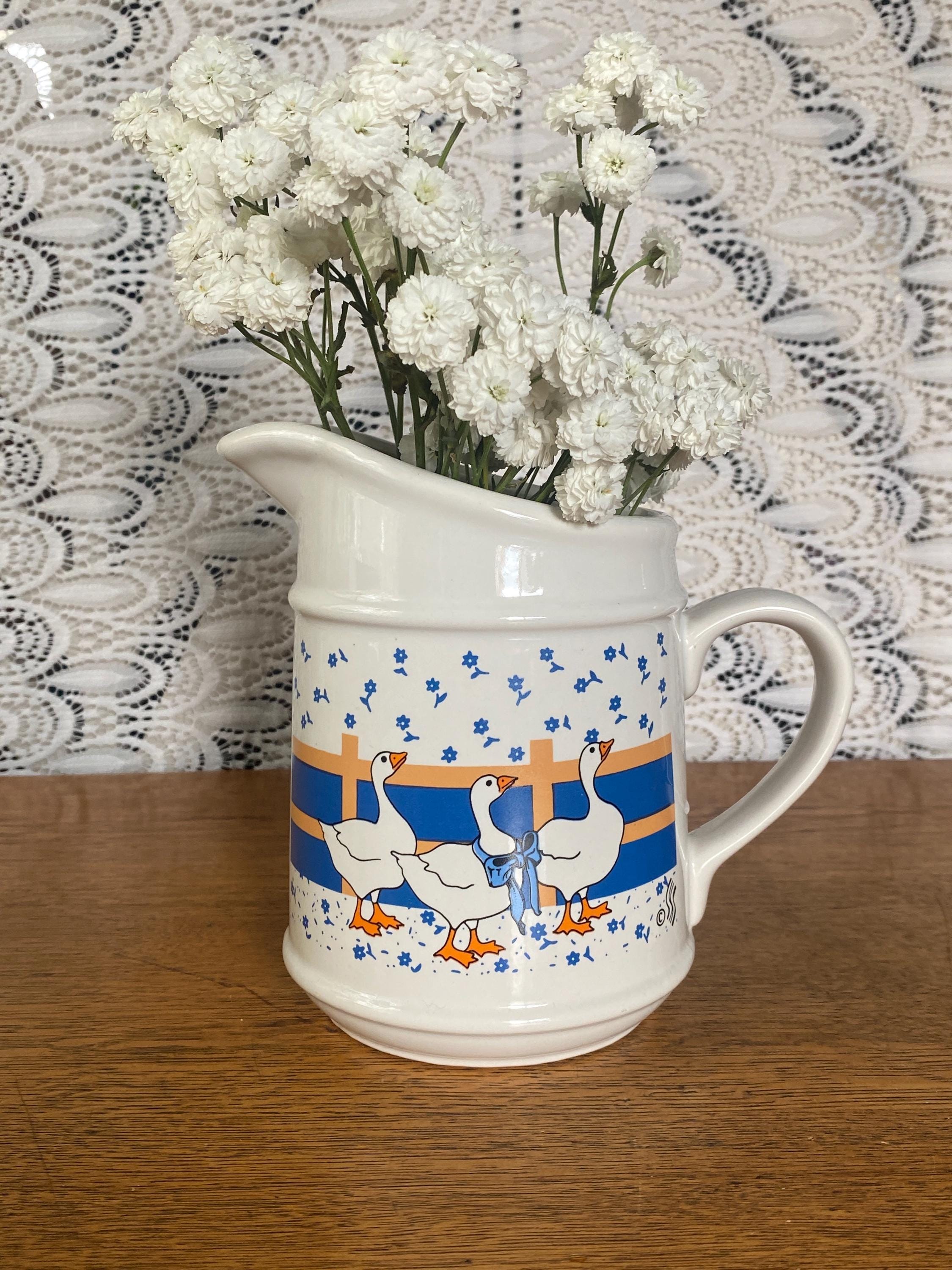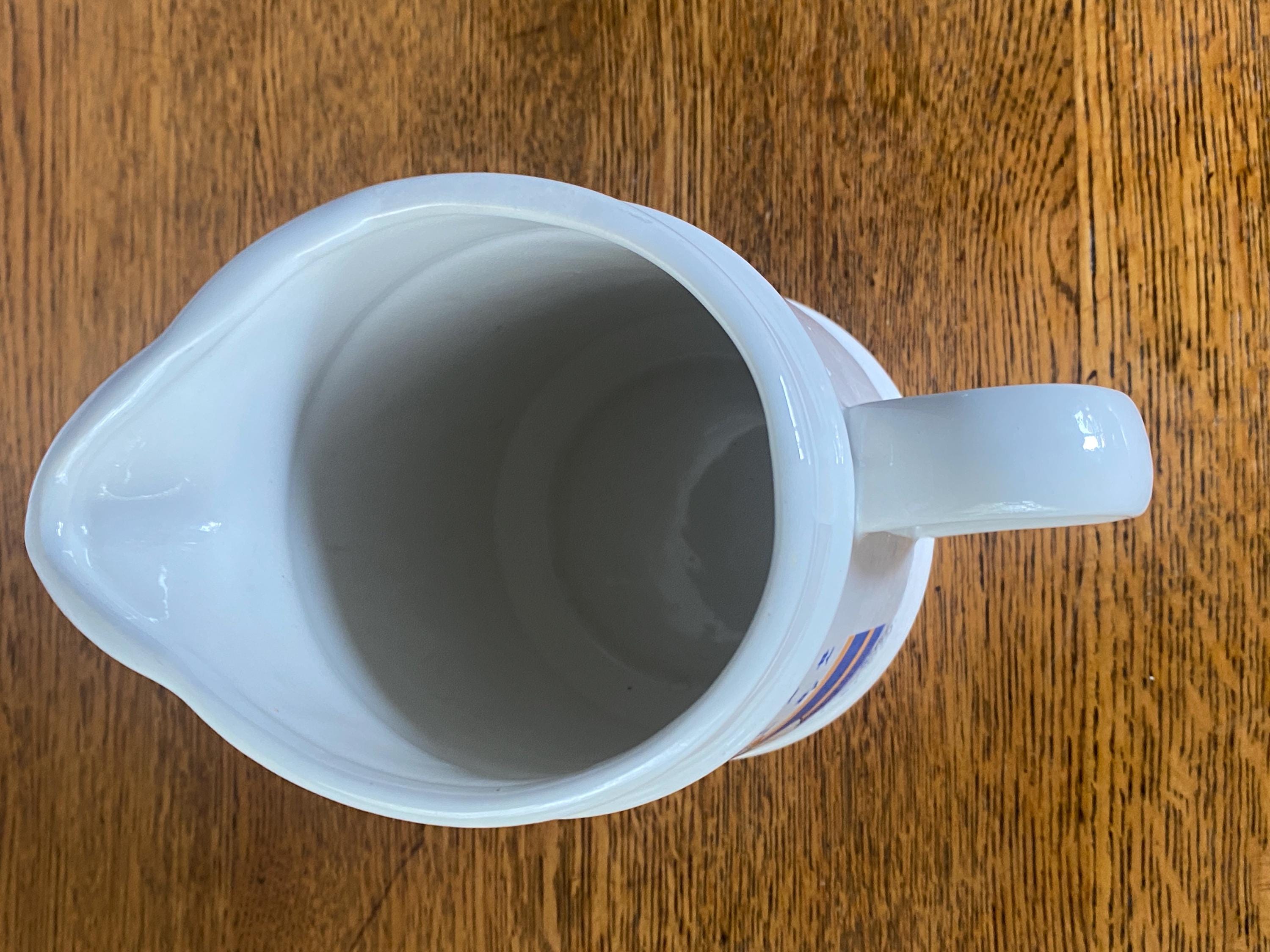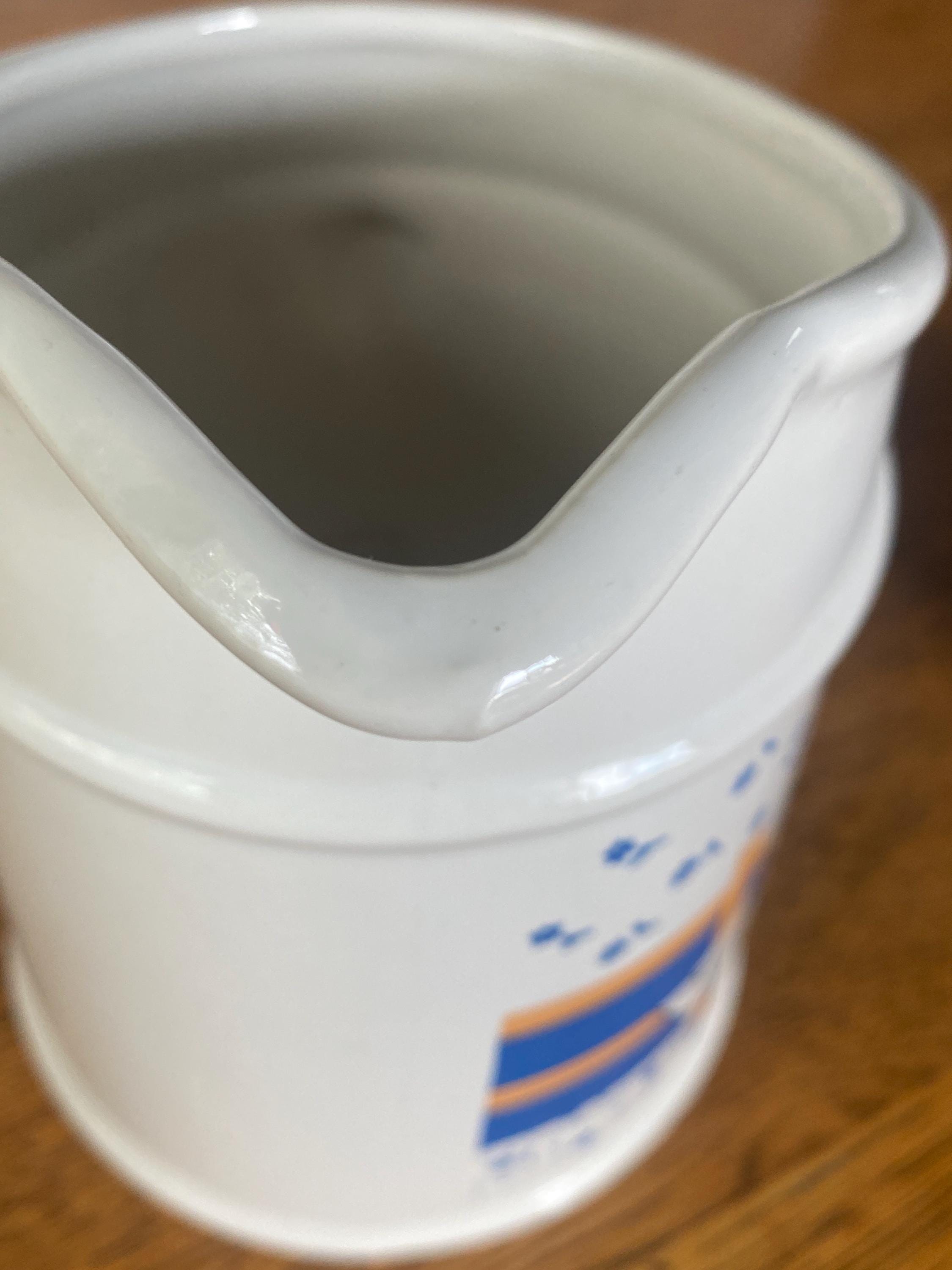 At 6.5 inches tall, this little ceramic pitcher is perfect for tea, juice, or filling with flowers. Perfect in a country style kitchen with its bright blue and orange/ yellow accent colors. 7 inches across including handle, 4 inches across top, 6.5 inches tall. Some wear on pattern, rough spots along bottom.