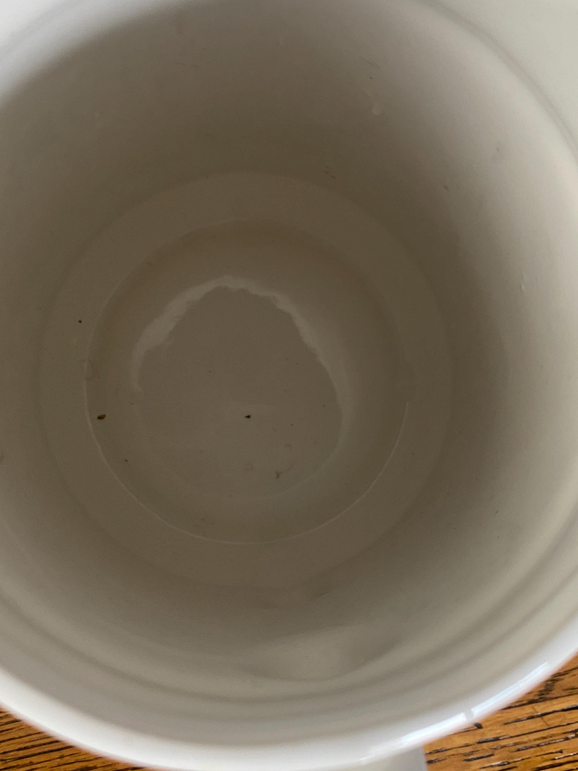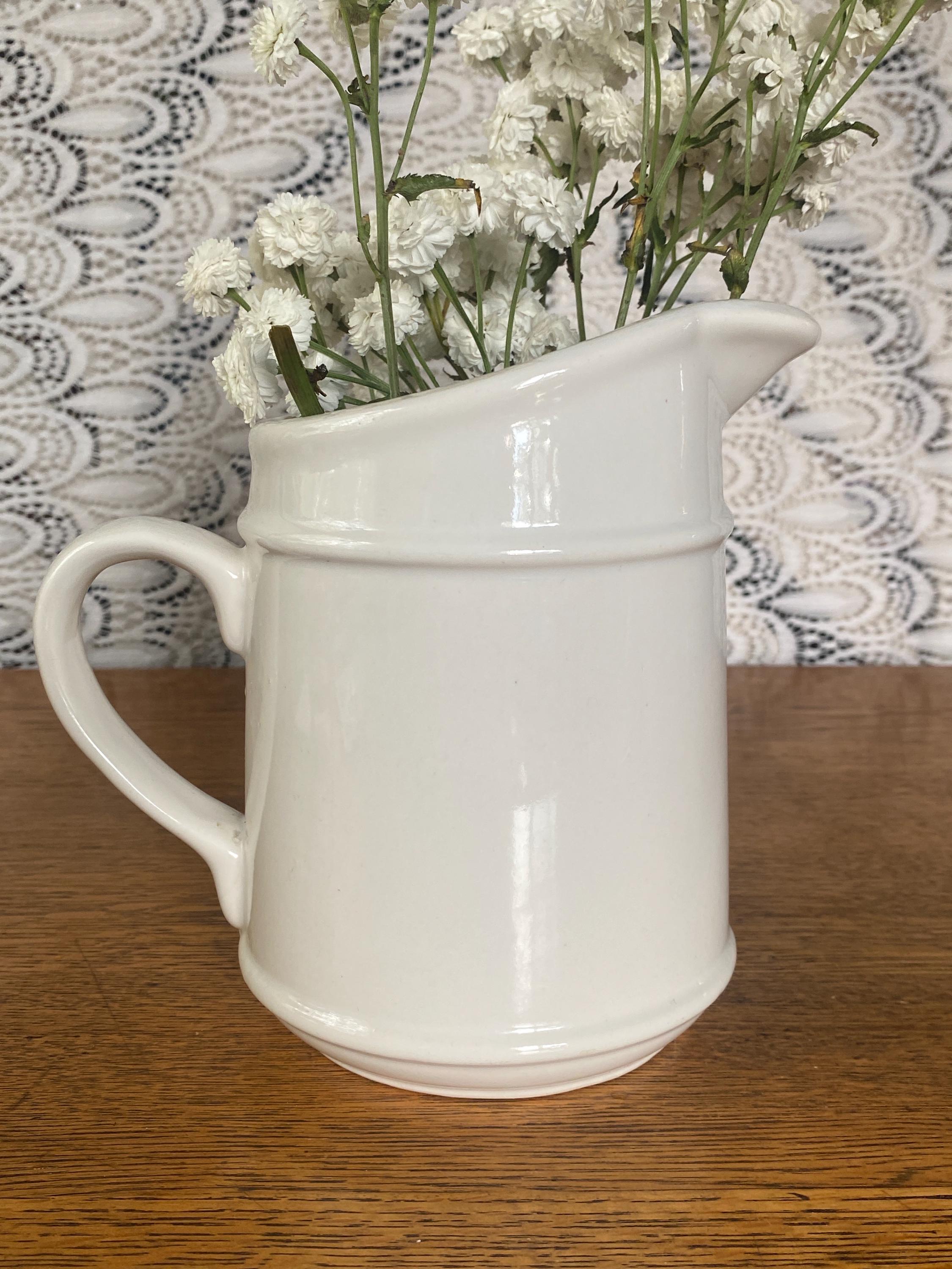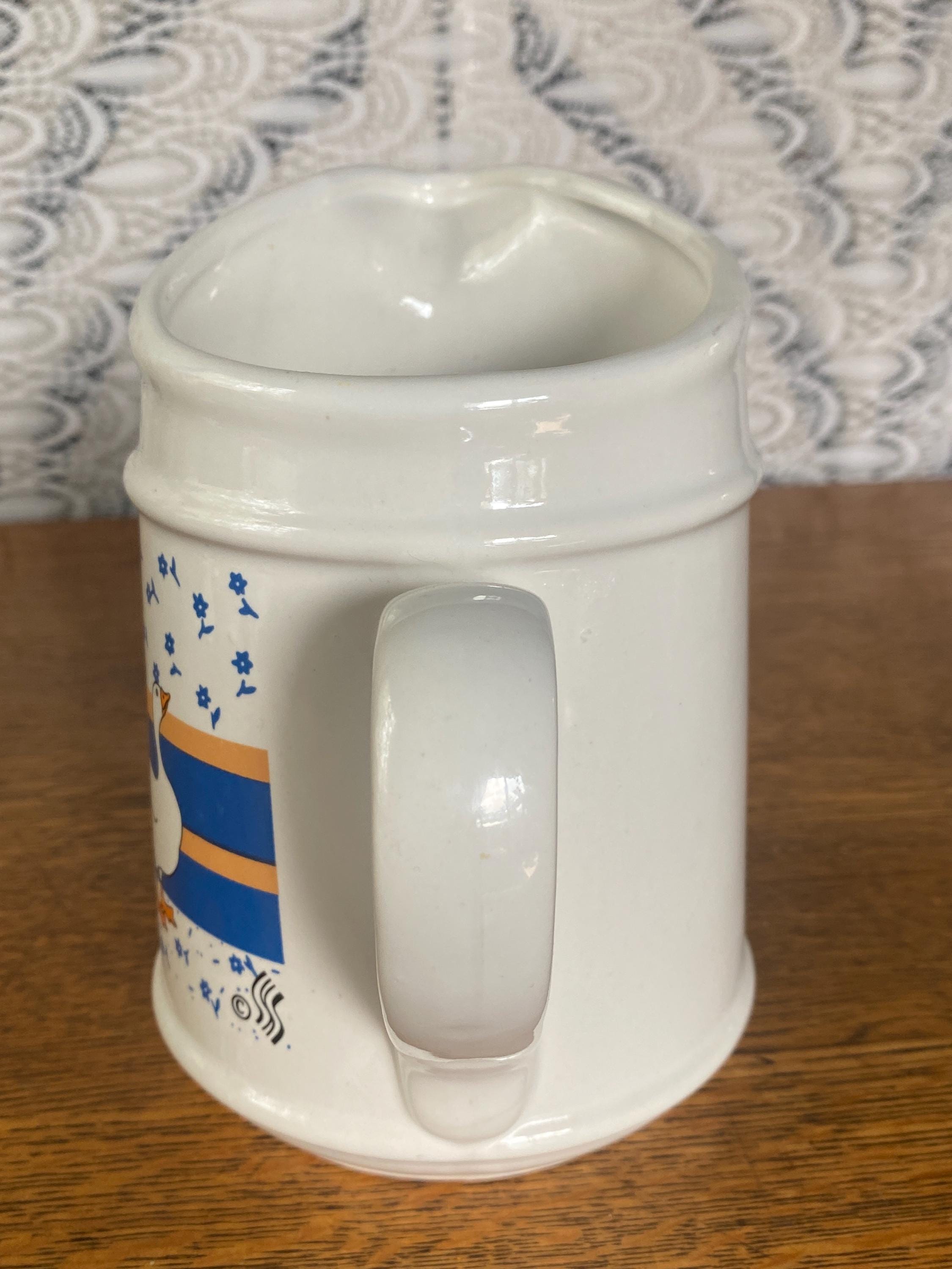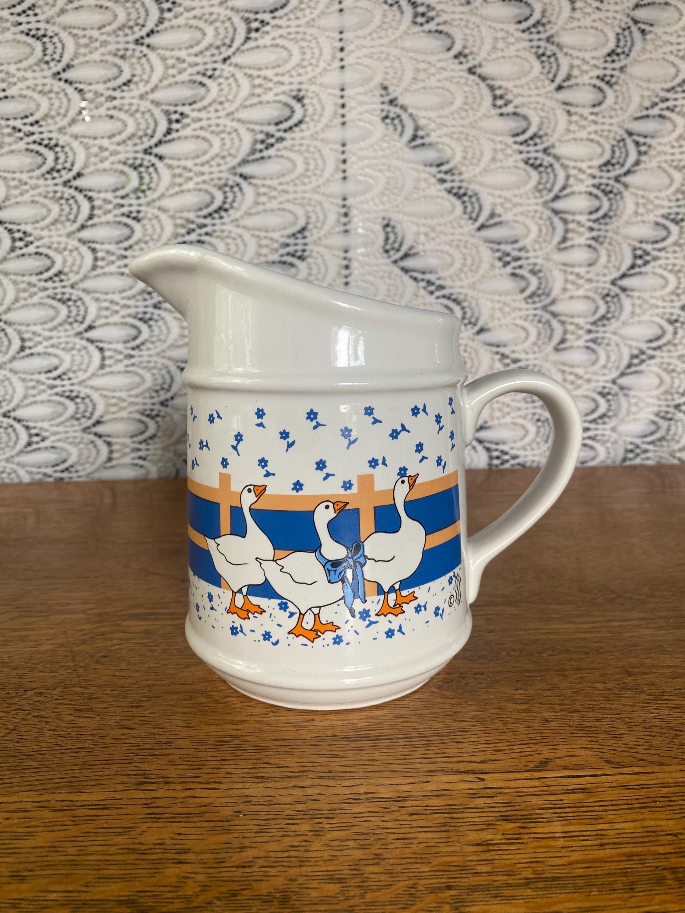 At 6.5 inches tall, this little ceramic pitcher is perfect for tea, juice, or filling with flowers. Perfect in a country style kitchen with its bright blue and orange/ yellow accent colors. 7 inches across including handle, 4 inches across top, 6.5 inches tall. Some wear on pattern, rough spots along bottom.