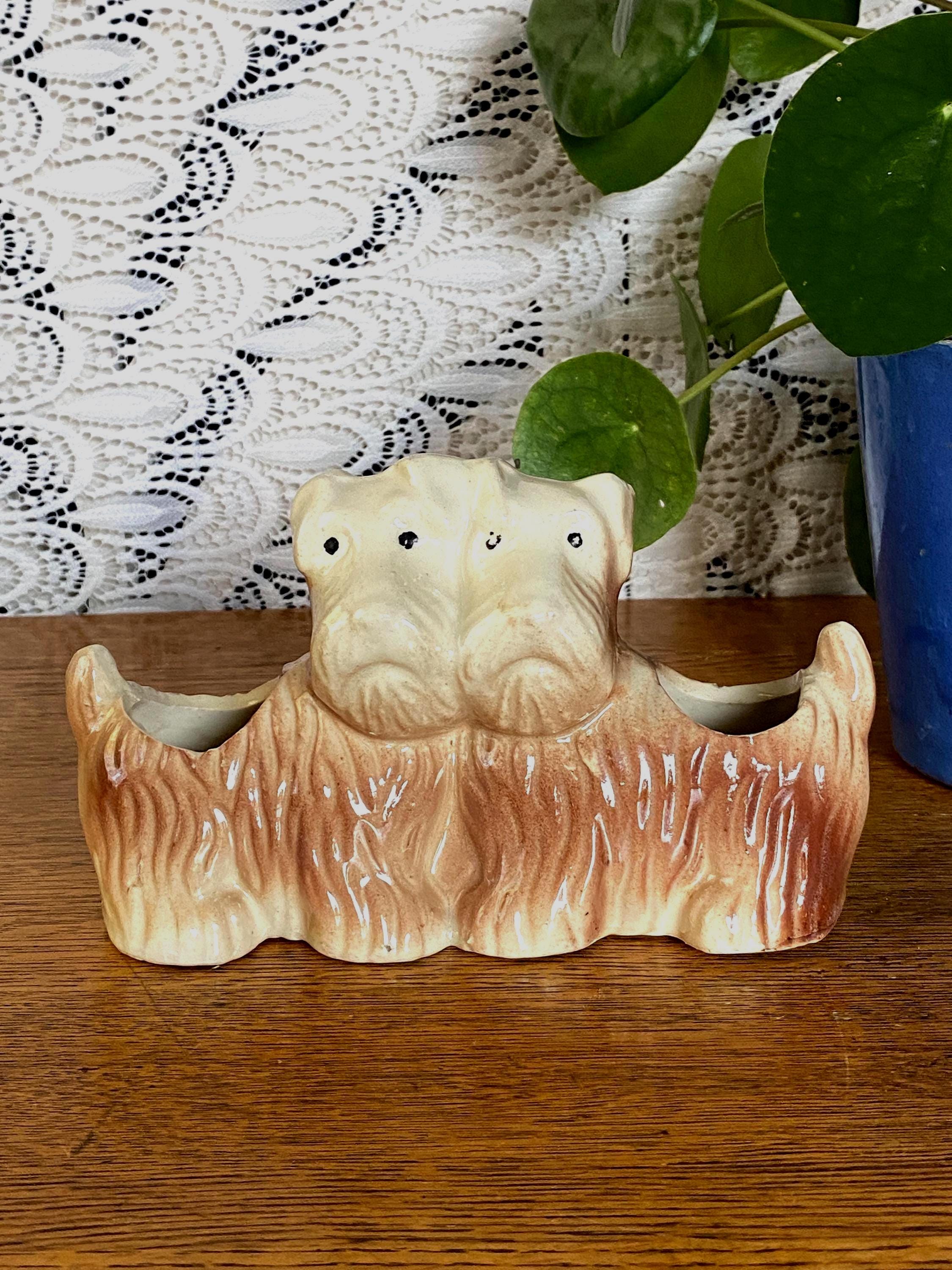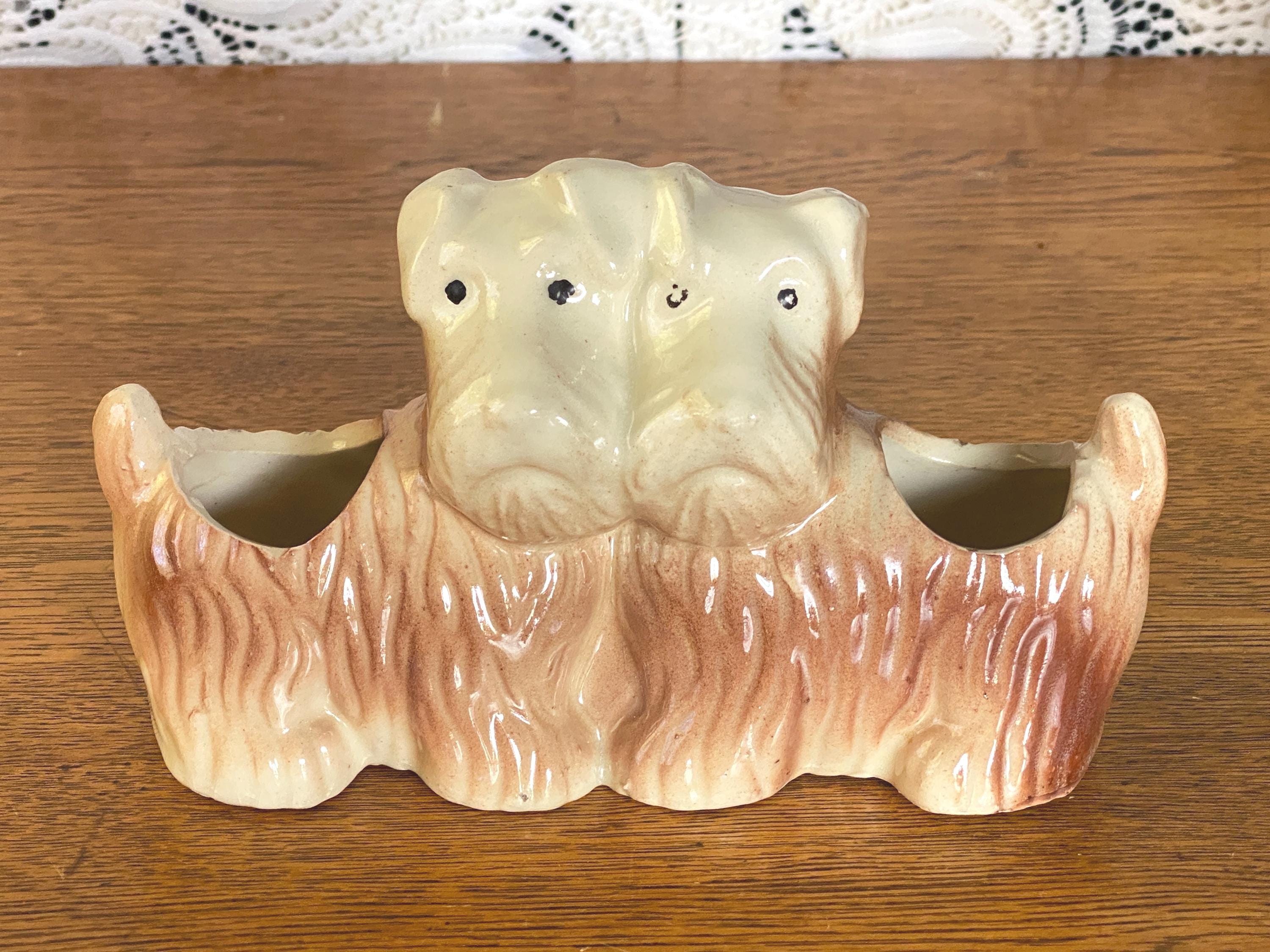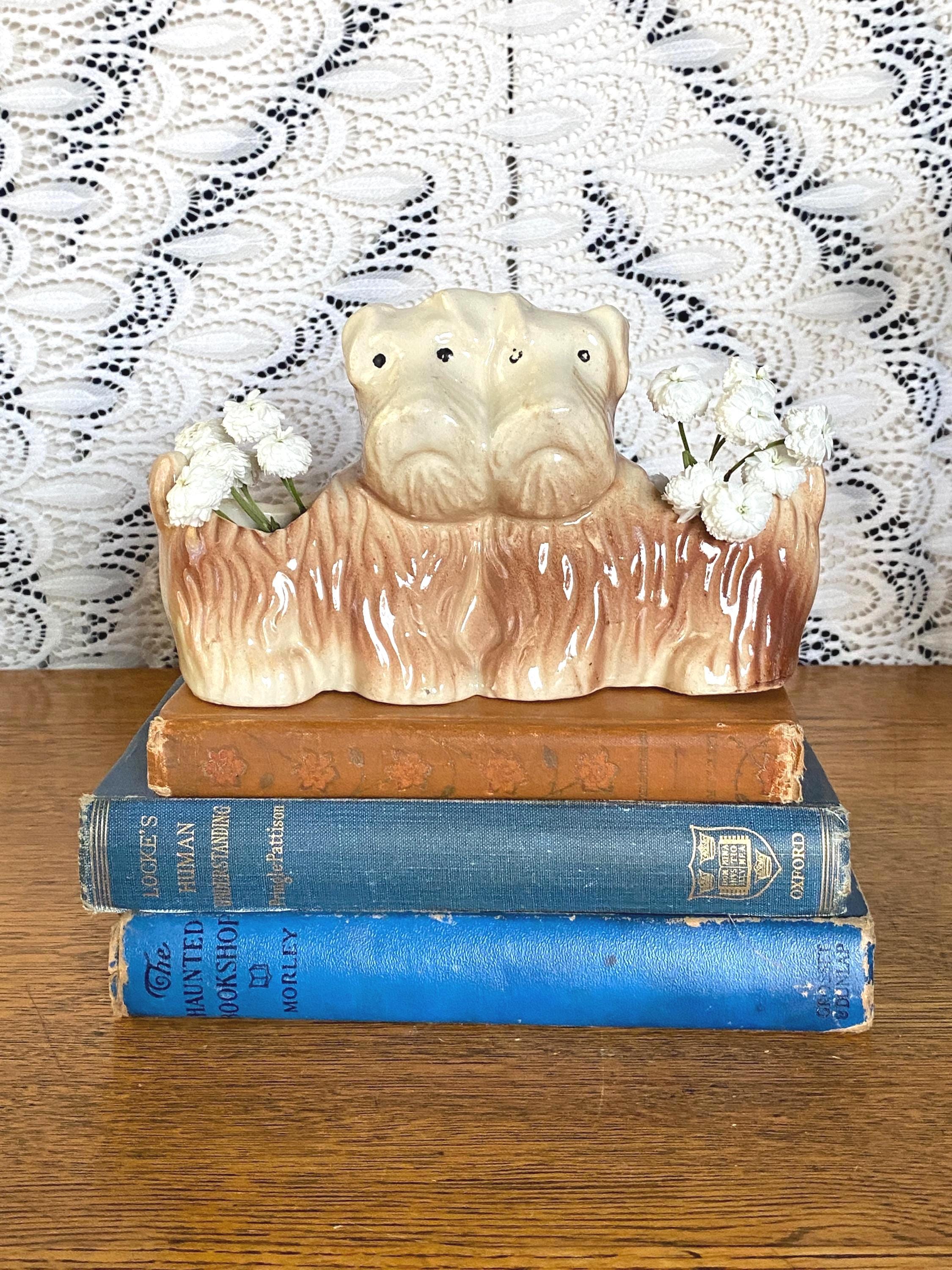 Perfect gift for a scotty dog lover! This vintage ceramic piece has two dogs, each with a little spot for holding a plant or some flowers. ***This piece has been well-loved and has chips, crazing, and a small crack on the bottom middle. Priced accordingly*** 7.5X2X4.5 inches