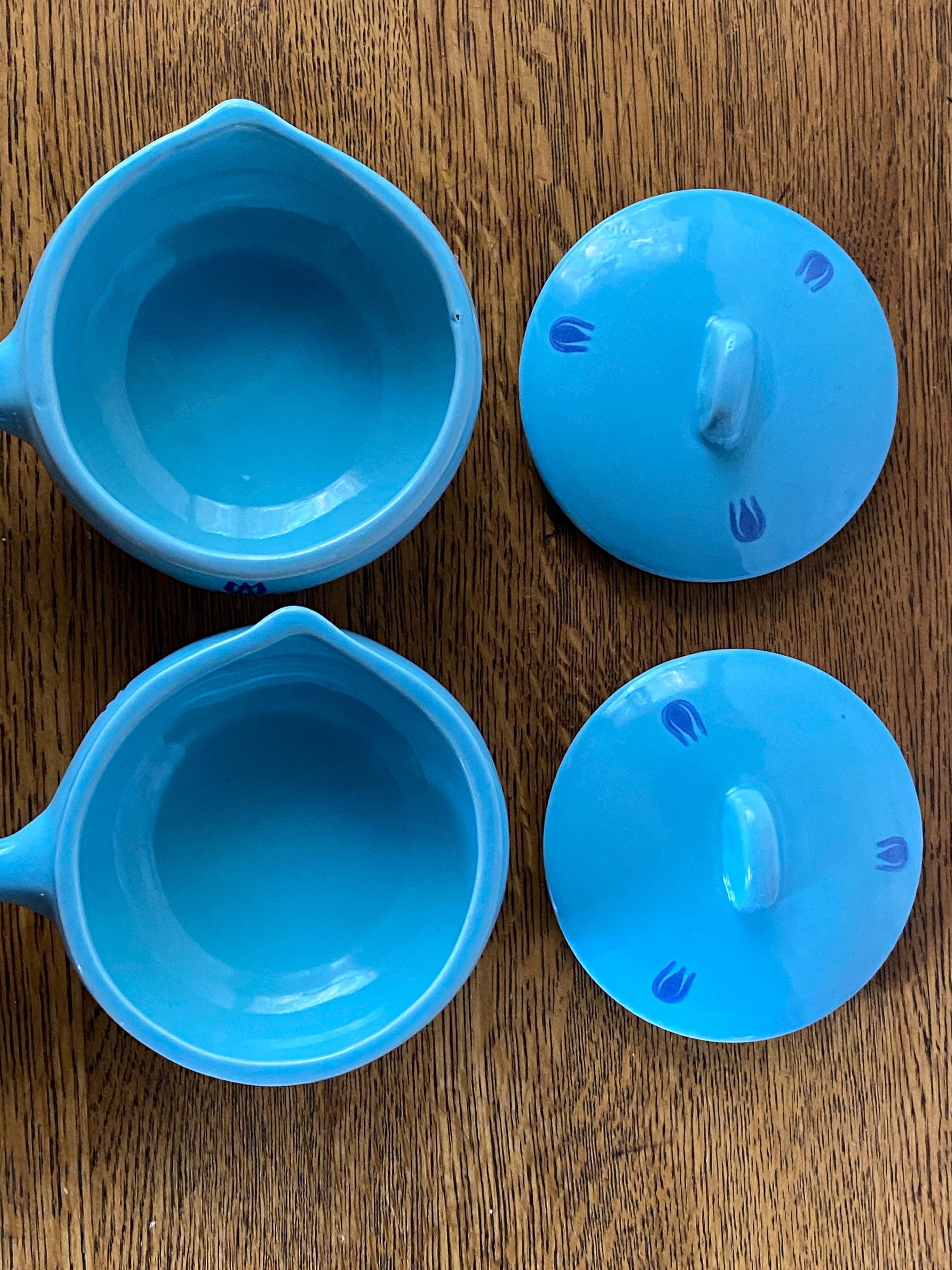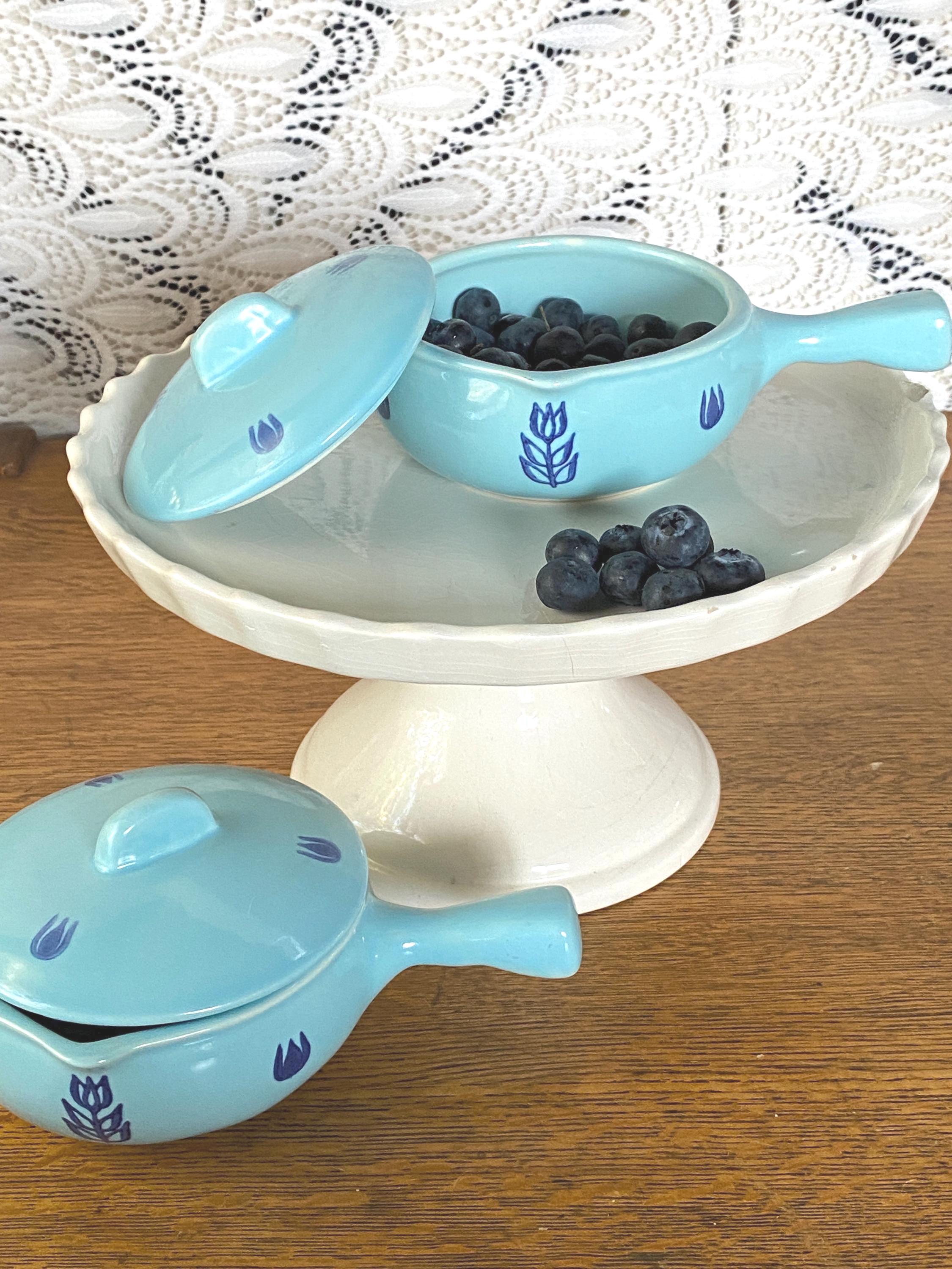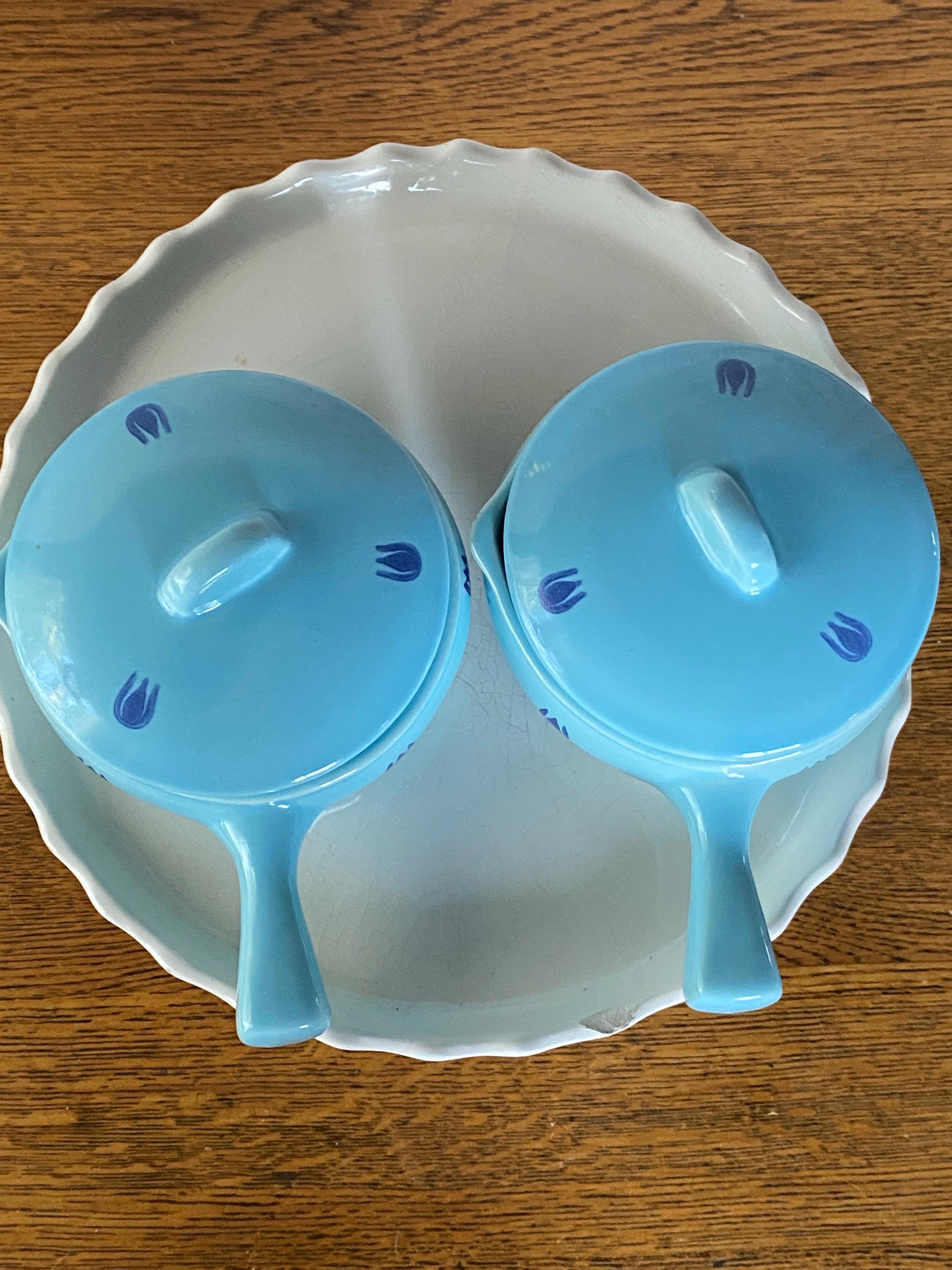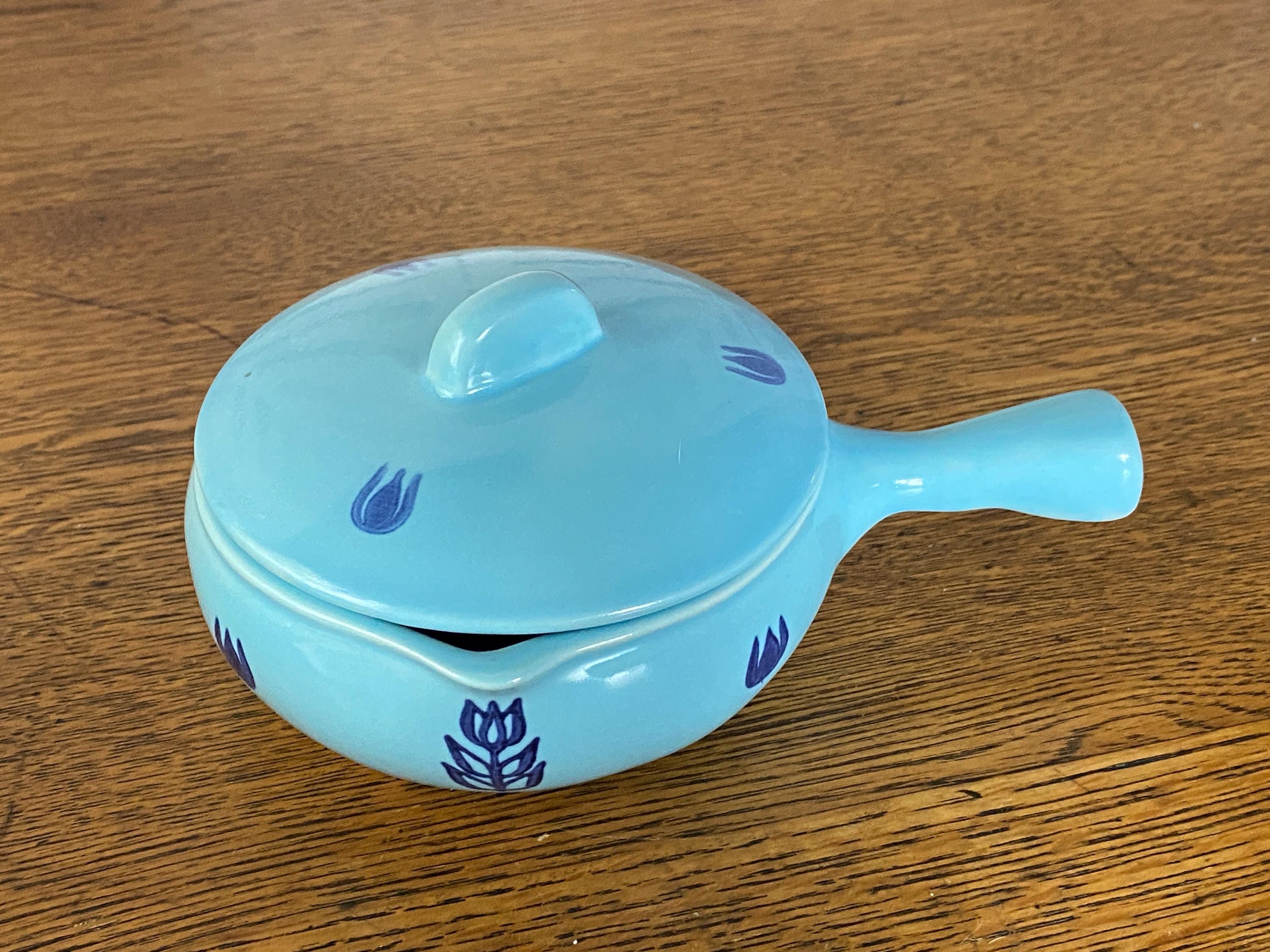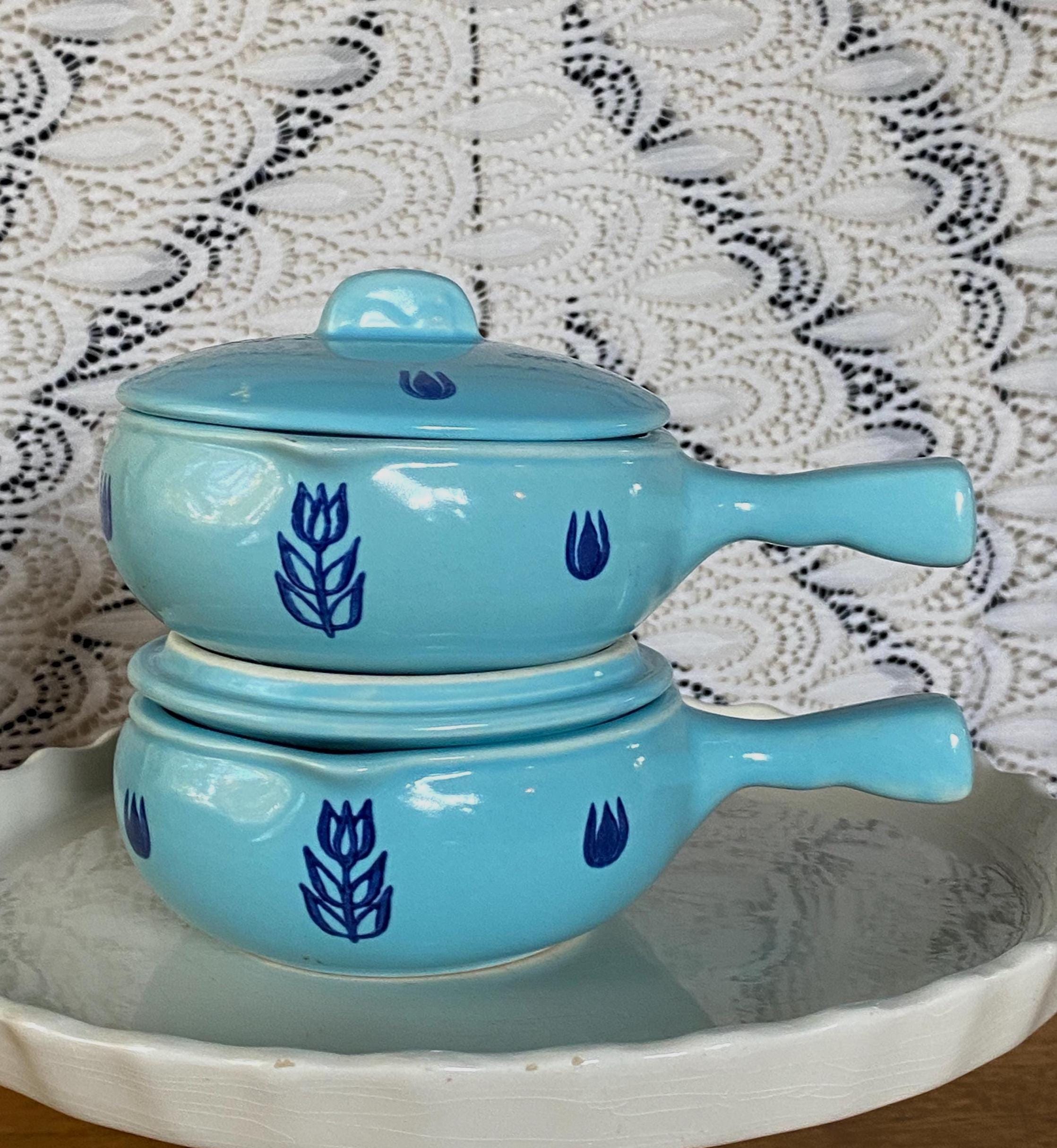 These mini lidded soup pots are just the right size for single servings of French onion or other baked foods. The light blue background and dark blue tulip pattern make them a charming, cheerful addition to a cozy, vintage kitchen. Some bubble/ glaze imperfections/ see last two photos for examples. Some wear/ rubbing on bottoms.