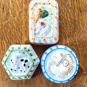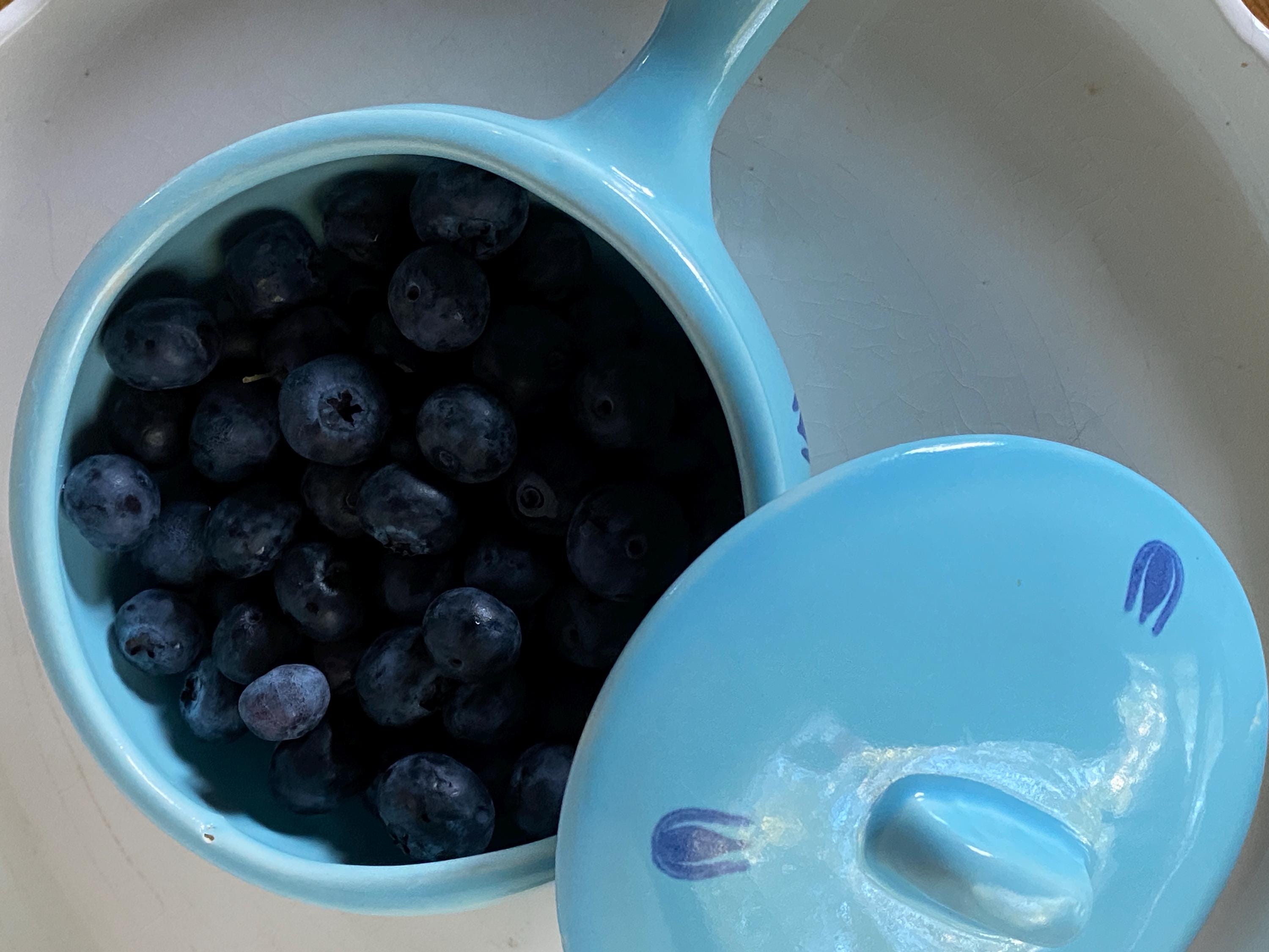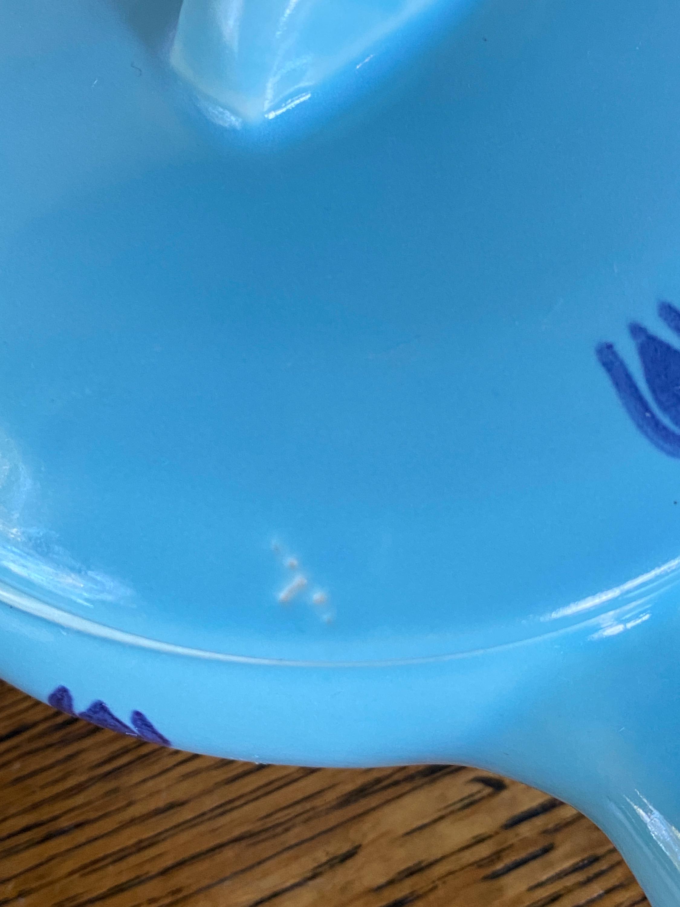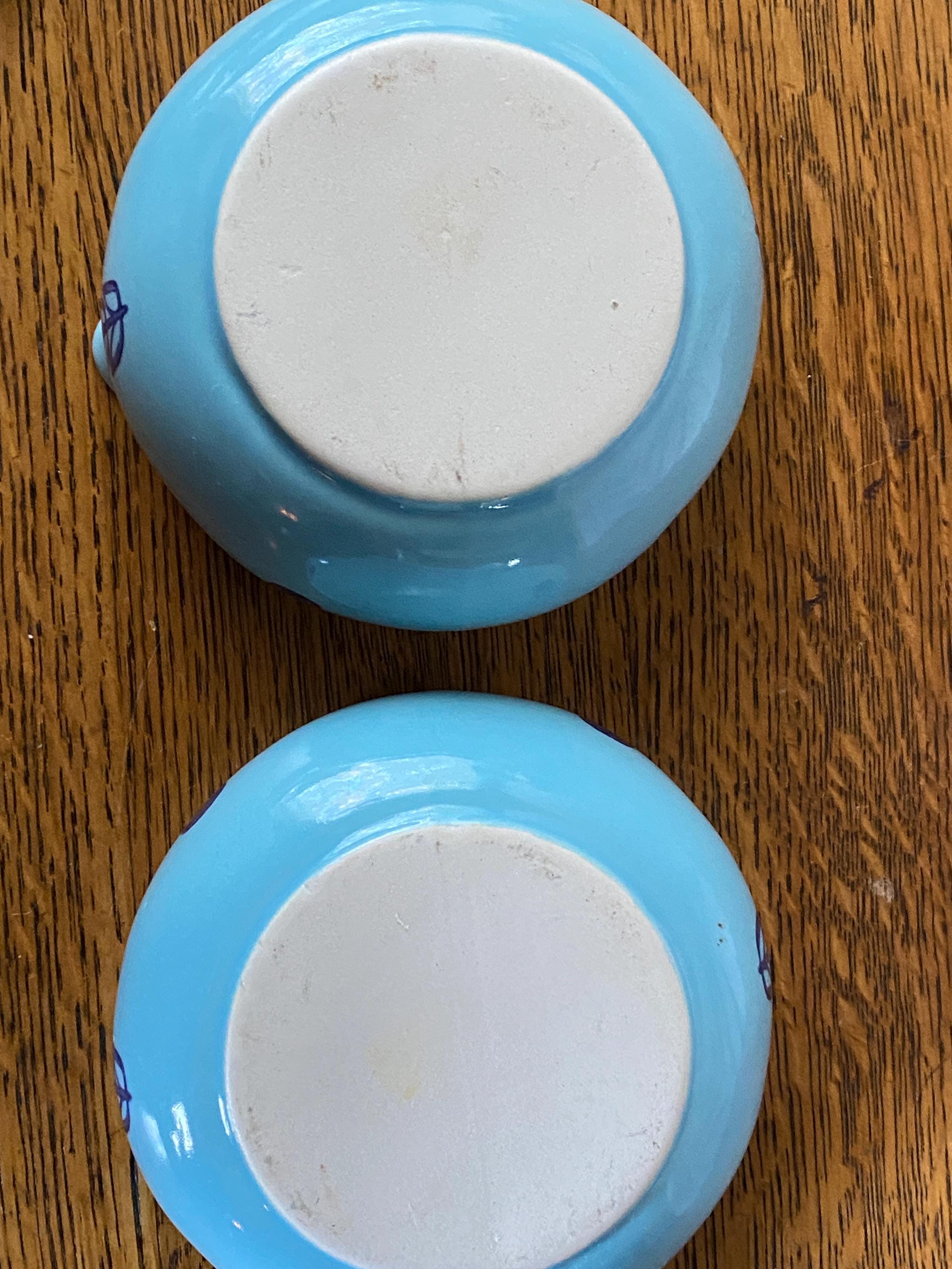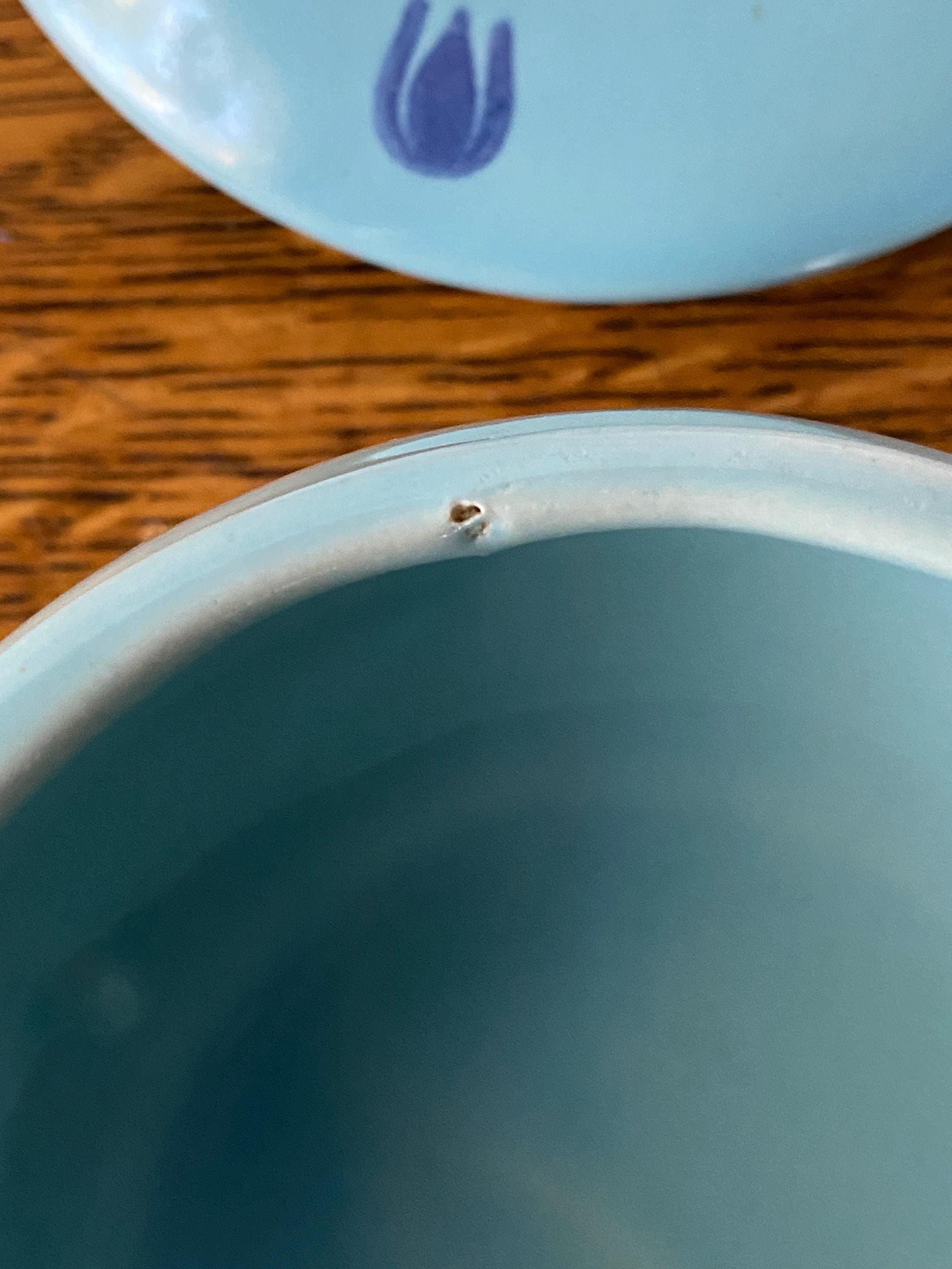 These mini lidded soup pots are just the right size for single servings of French onion or other baked foods. The light blue background and dark blue tulip pattern make them a charming, cheerful addition to a cozy, vintage kitchen. Some bubble/ glaze imperfections/ see last two photos for examples. Some wear/ rubbing on bottoms.