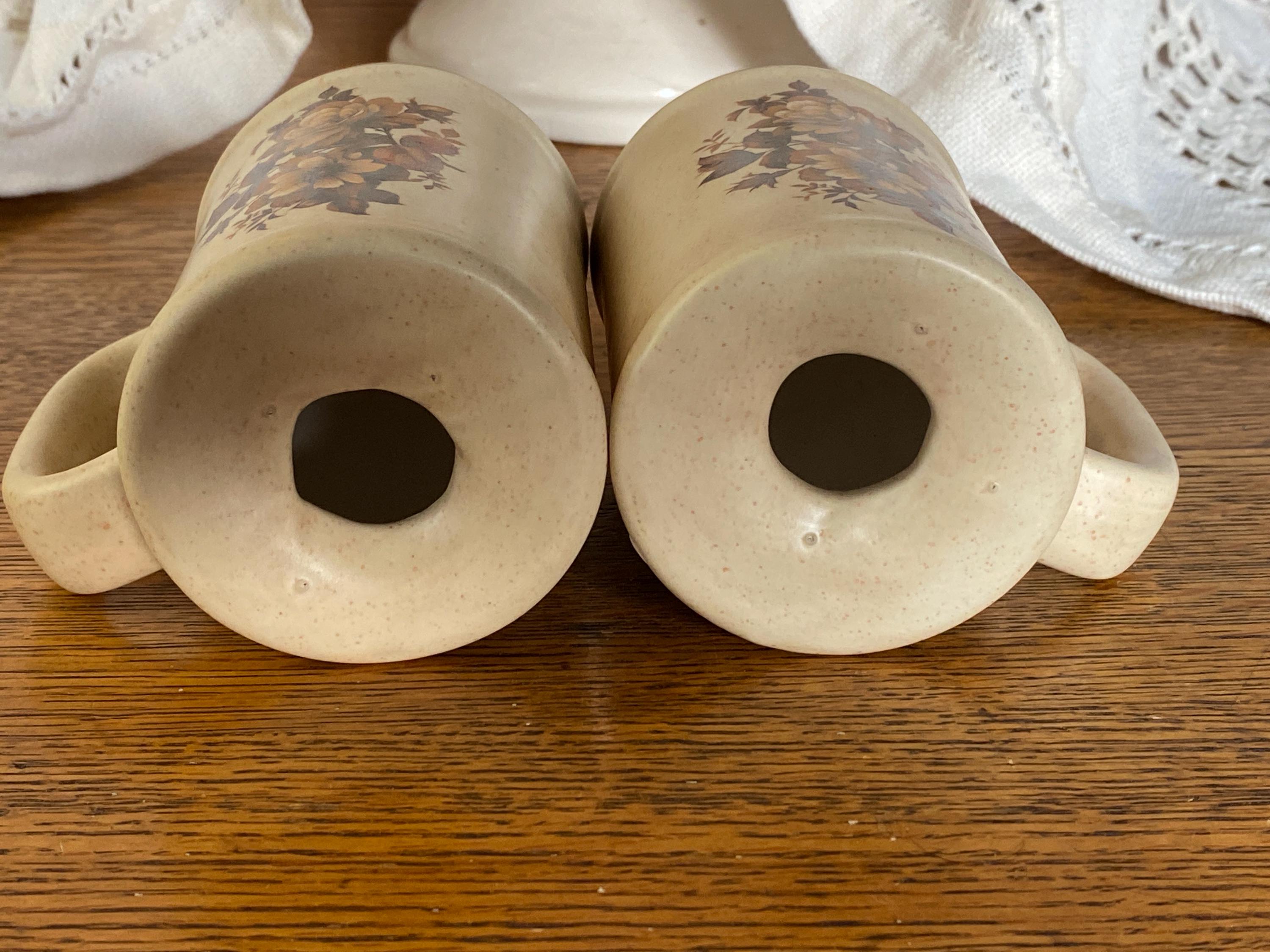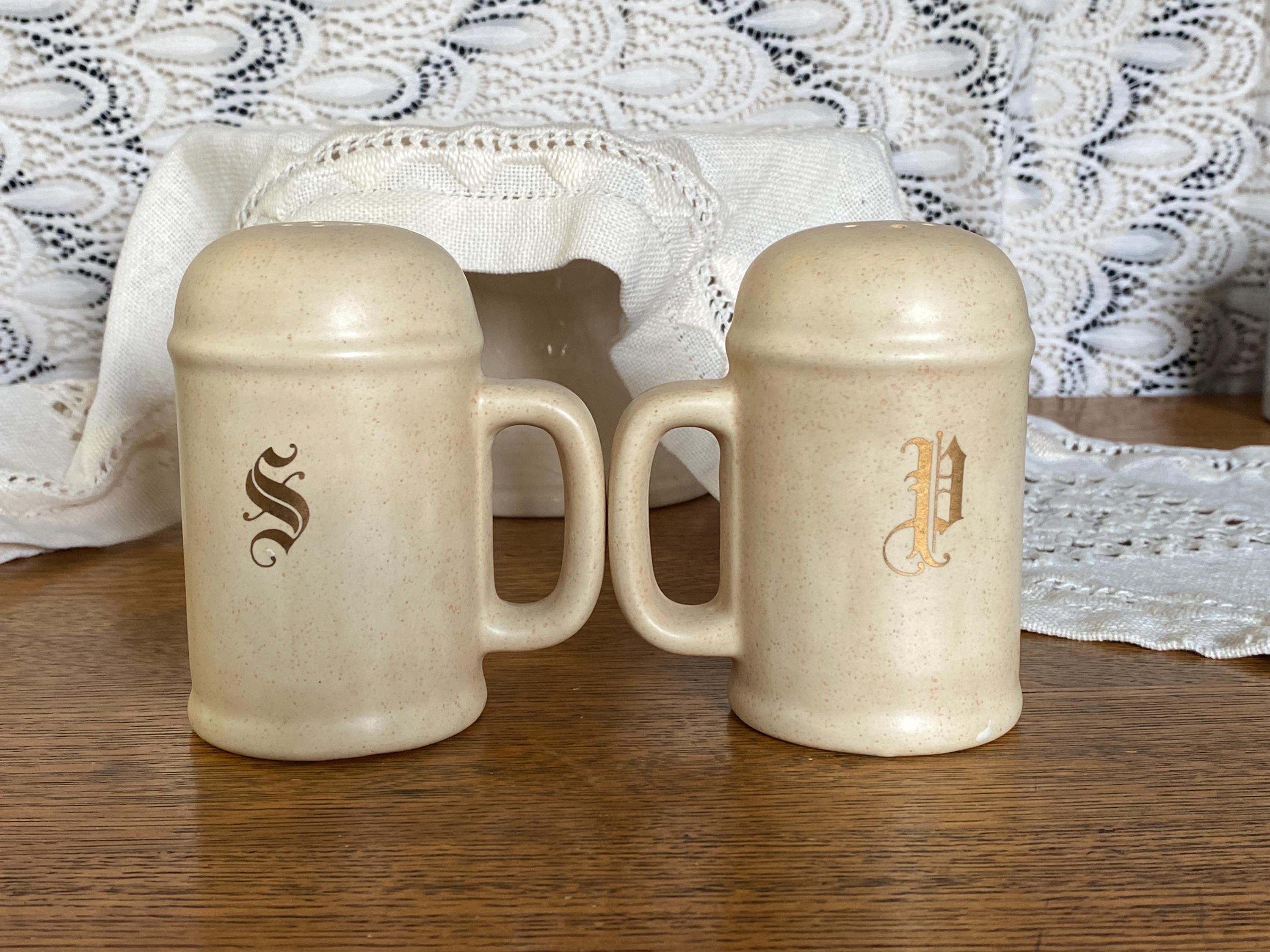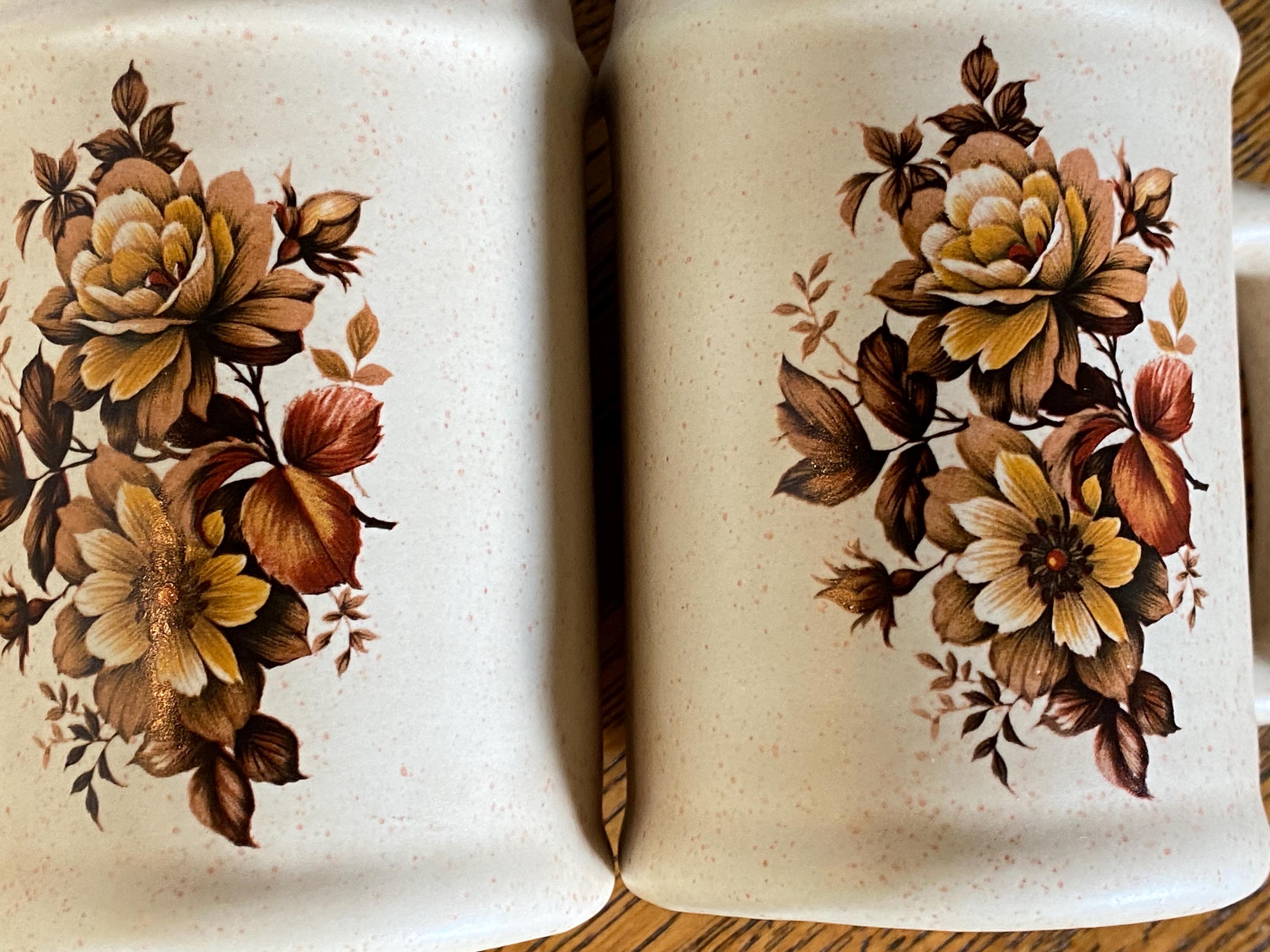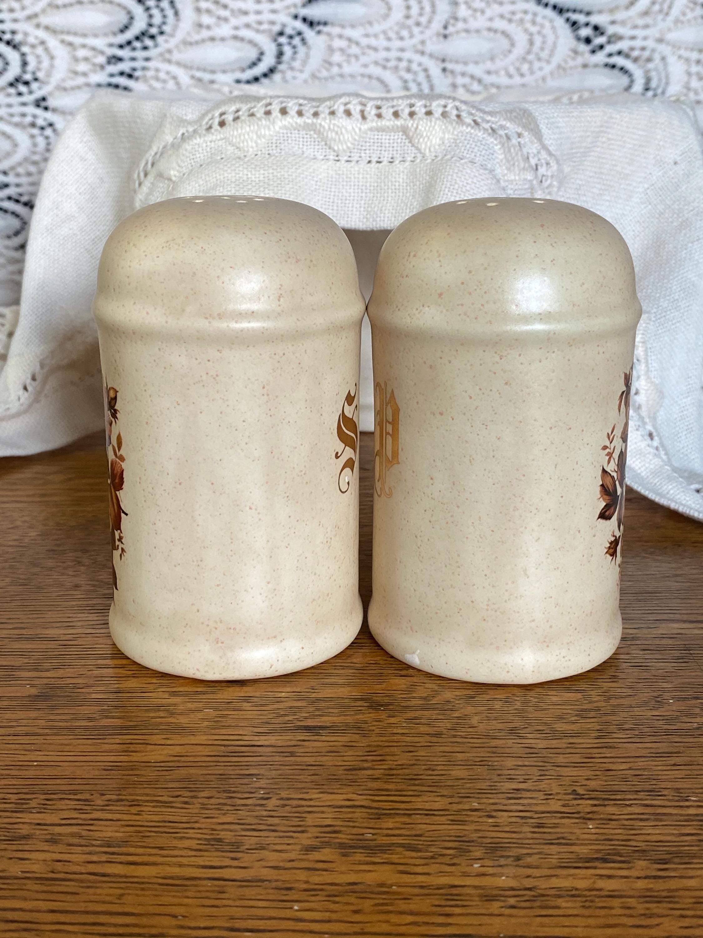 This 1980s set has a pink speckled background and a classic brown tone floral pattern on the front. The backs are marked with a gold S and a gold P, making them displayable from every angle.3.5X2X4.5 inches. No cork stoppers, minor wear on pattern.