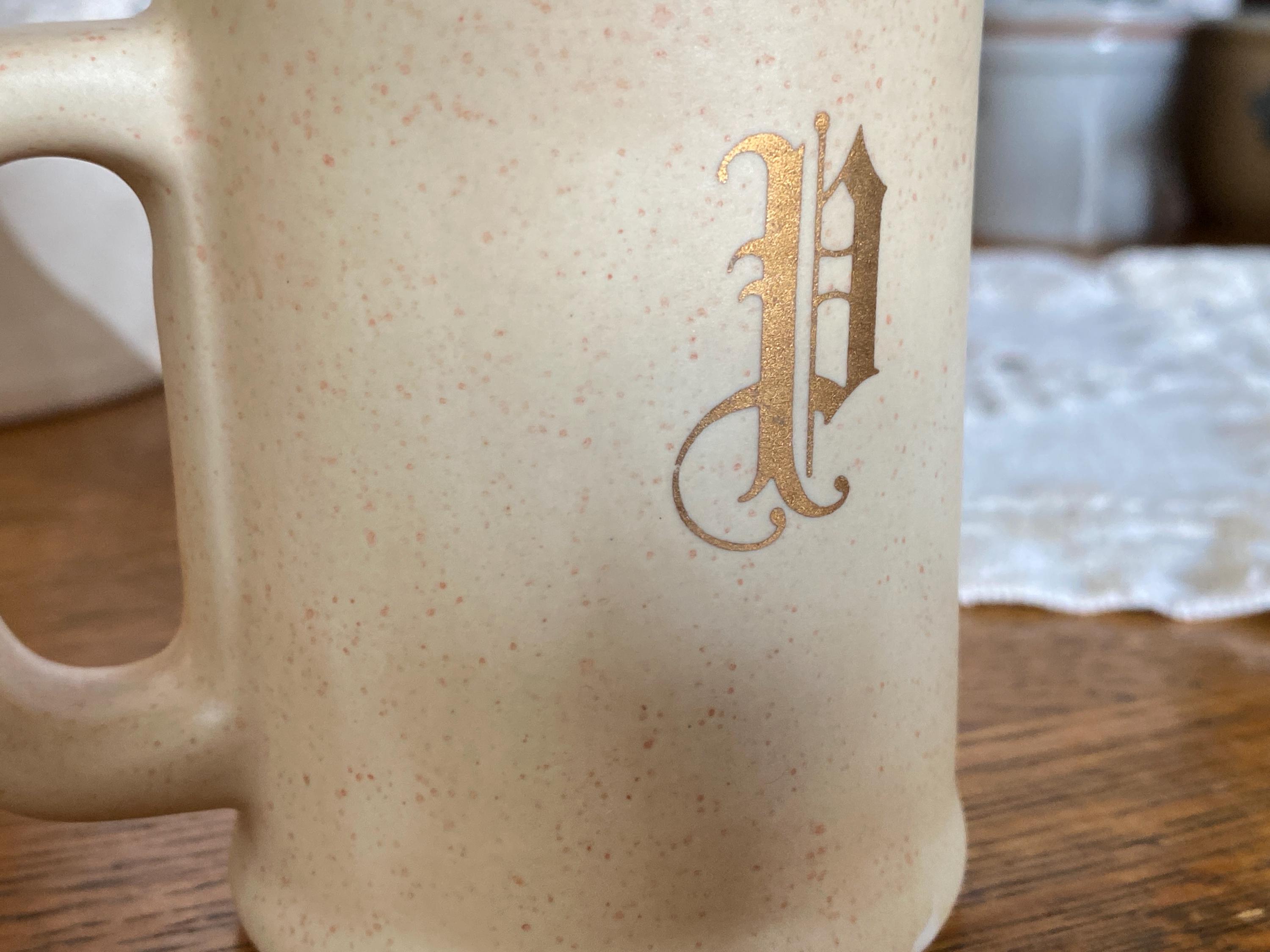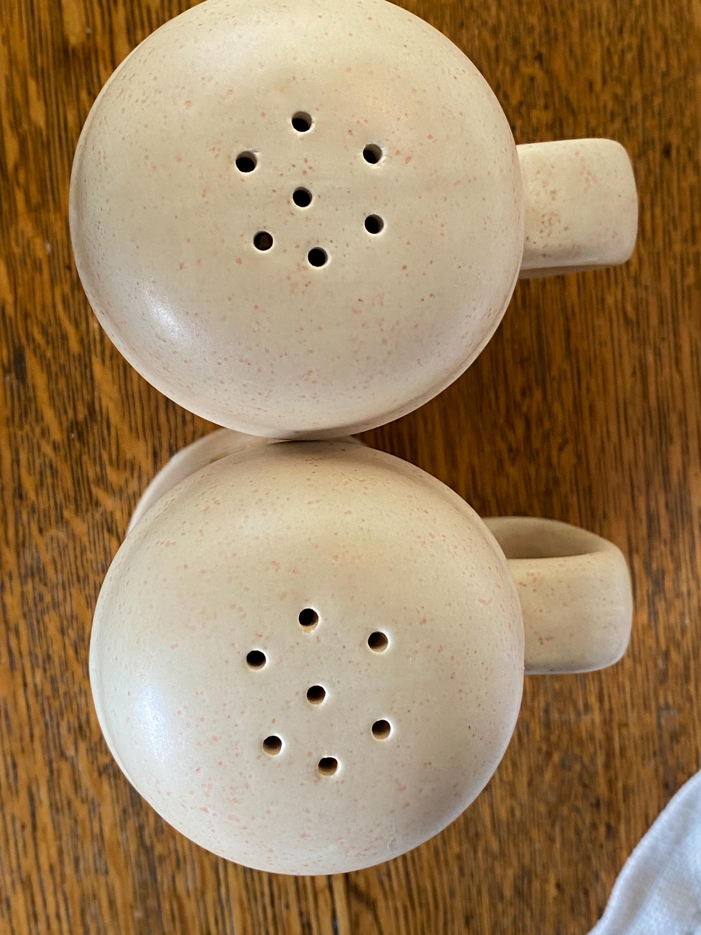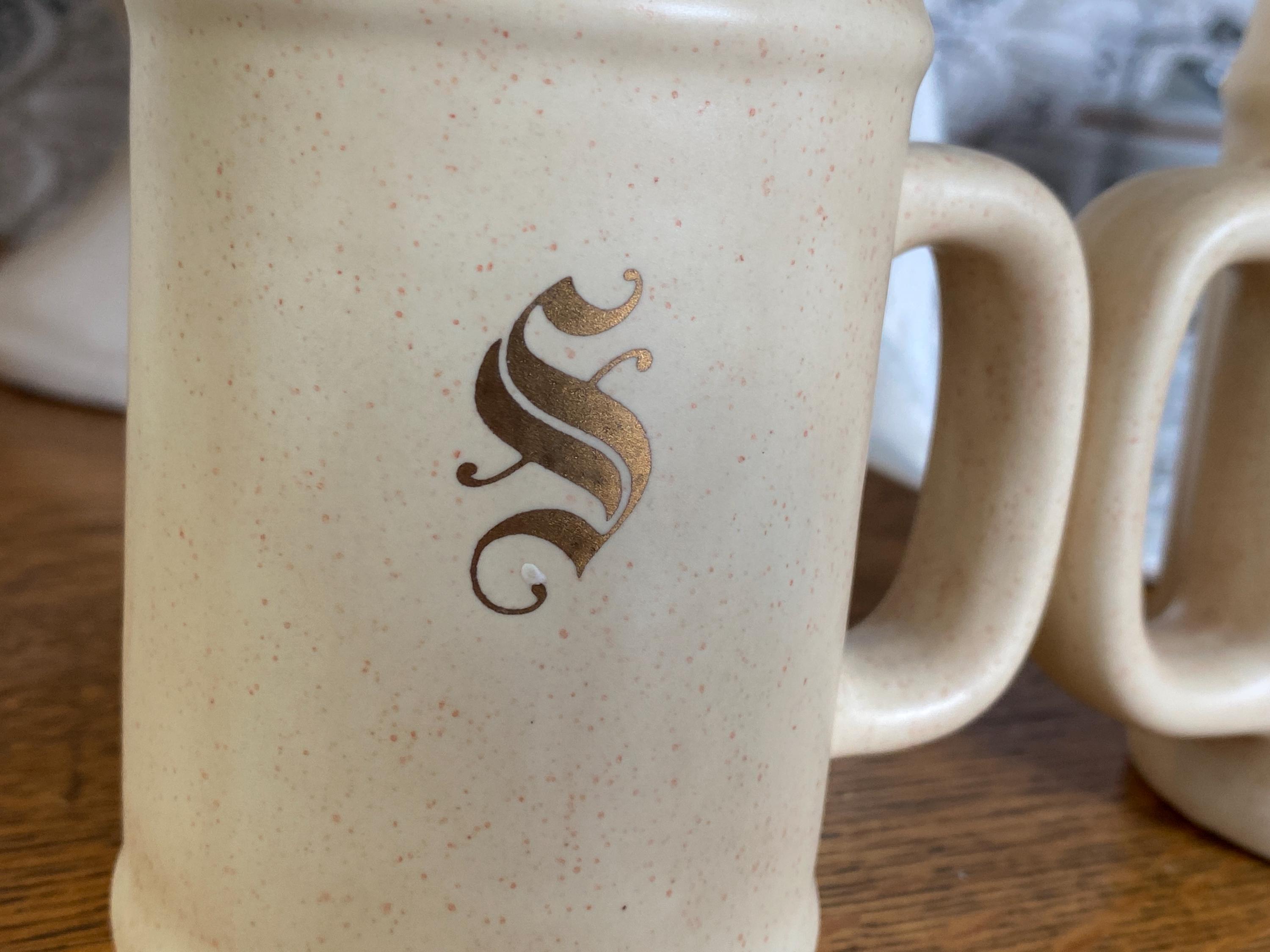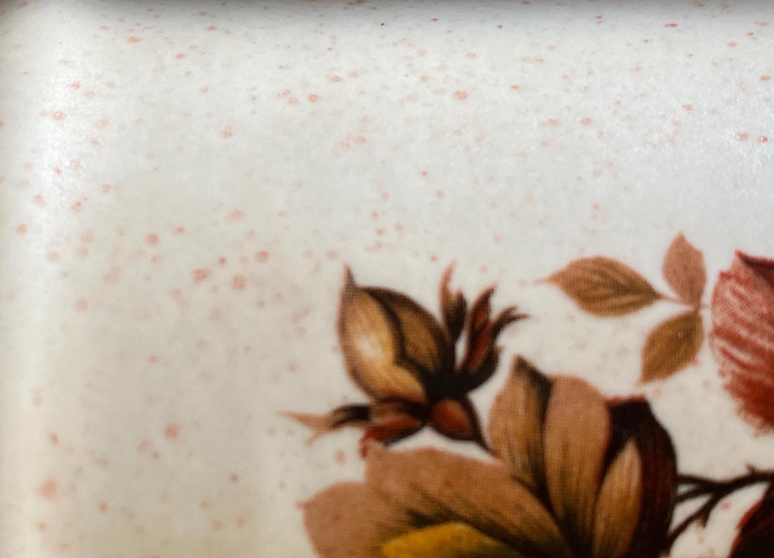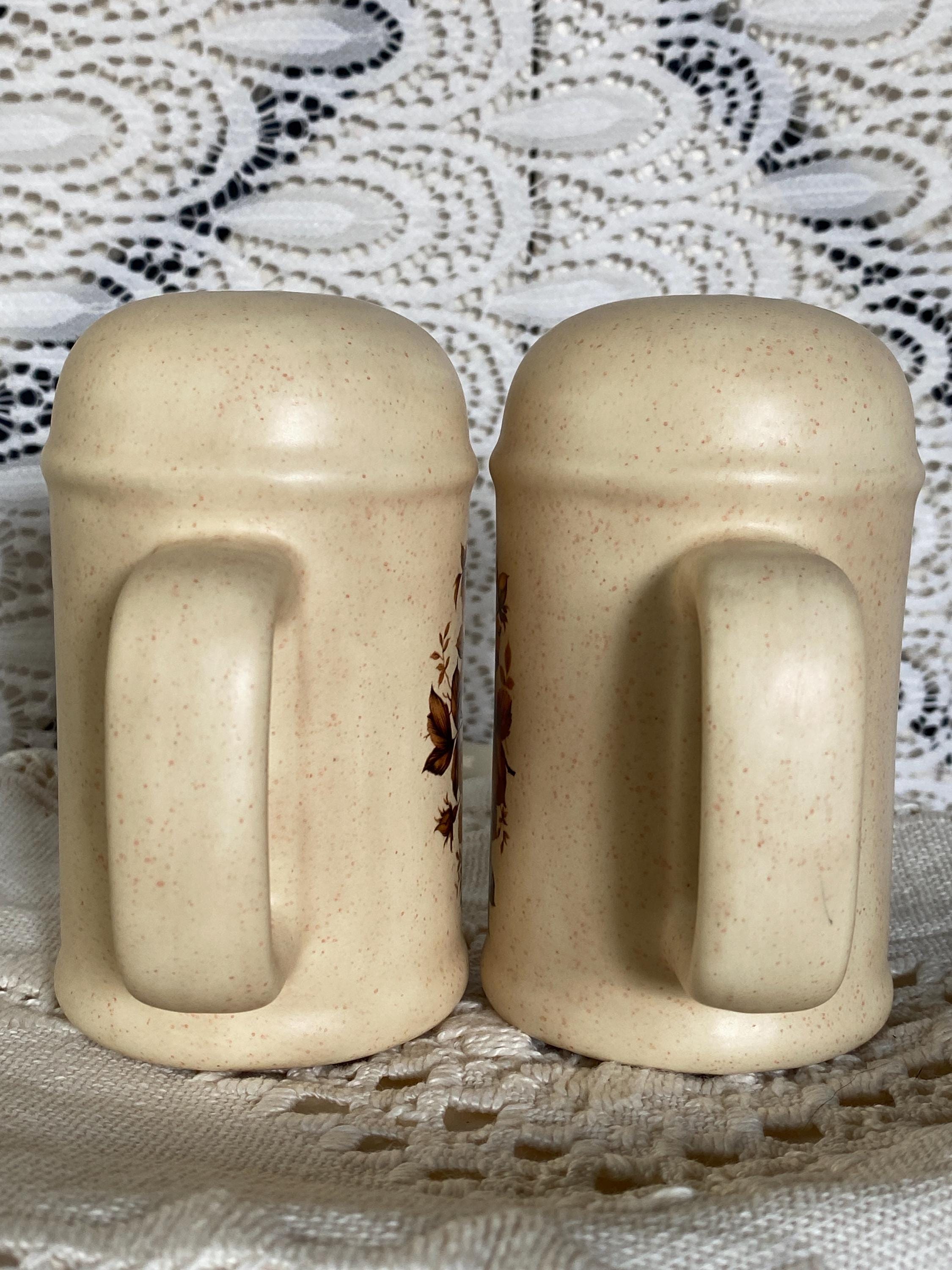 This 1980s set has a pink speckled background and a classic brown tone floral pattern on the front. The backs are marked with a gold S and a gold P, making them displayable from every angle.3.5X2X4.5 inches. No cork stoppers, minor wear on pattern.