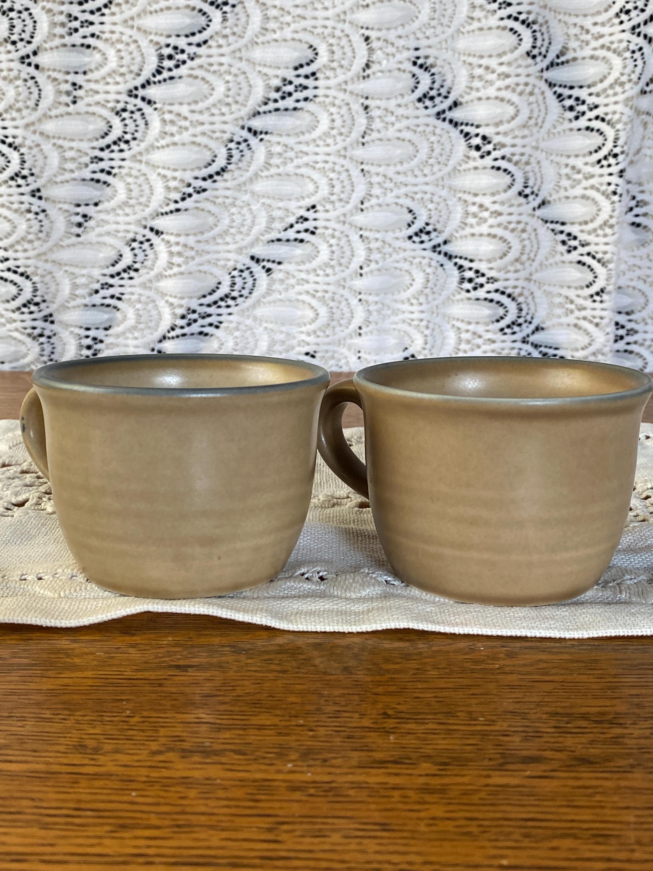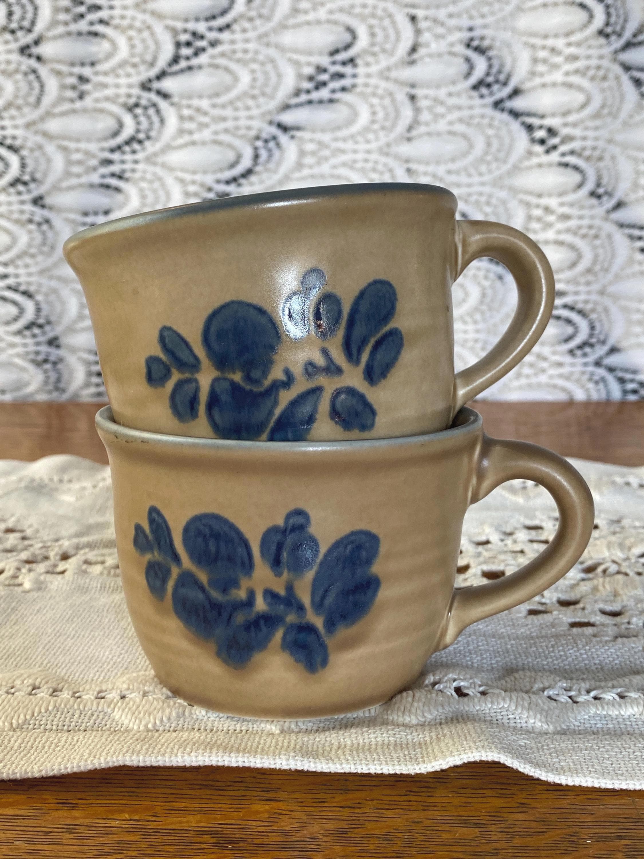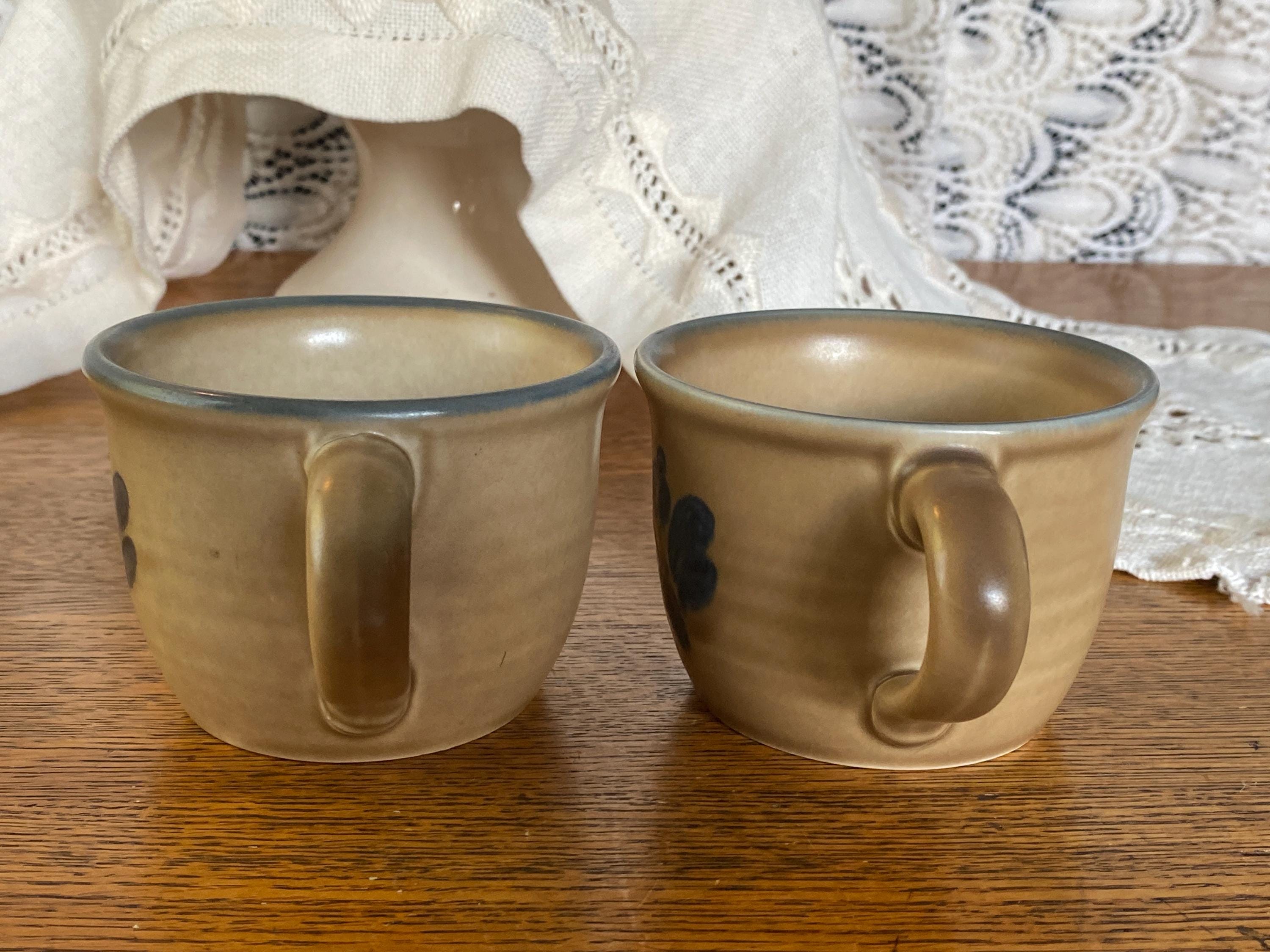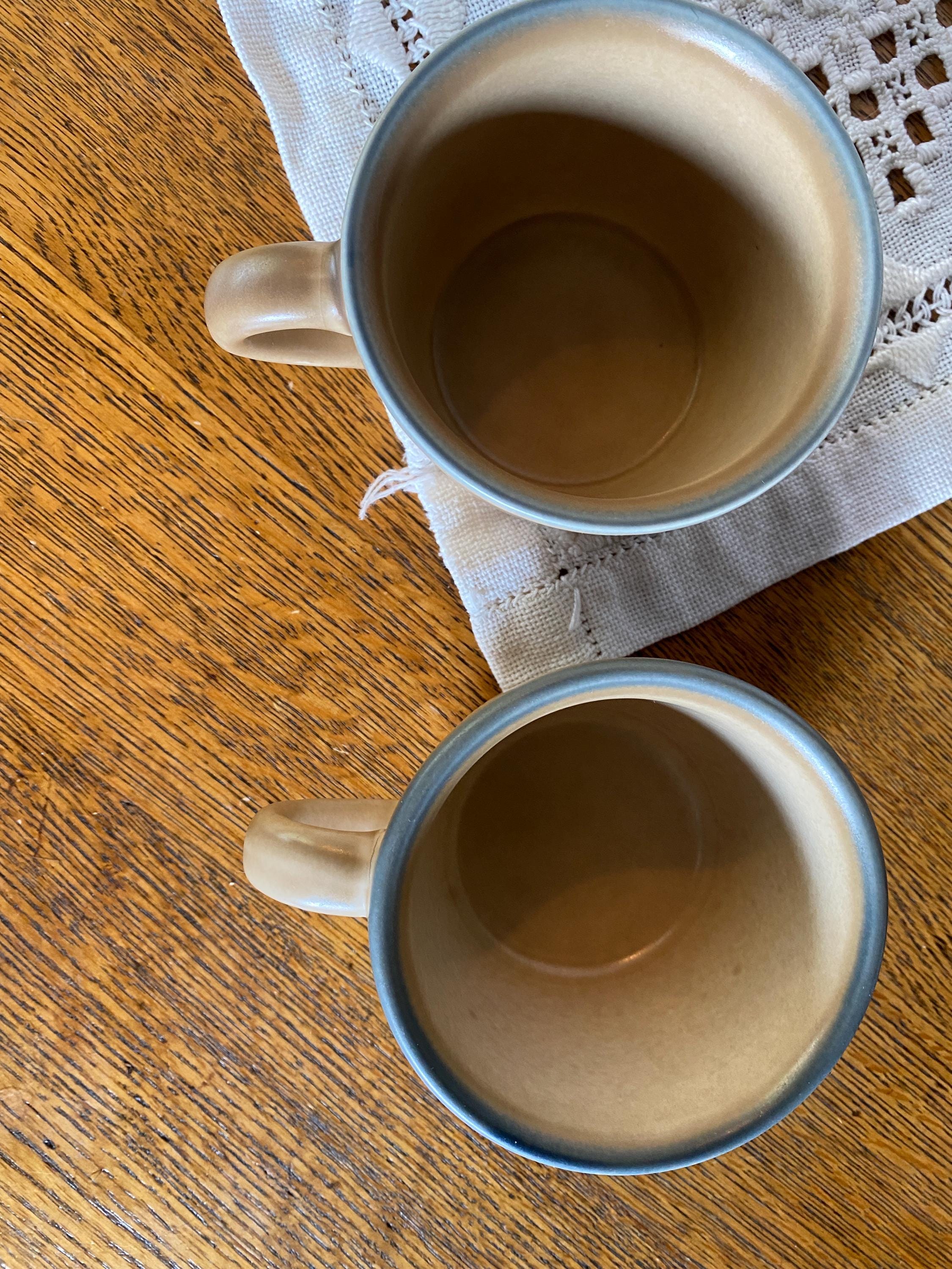 Classic stoneware mugs with a tan/ brown background, blue rims, and a blue folk art inspired floral pattern on the front. 4.5X3.5X2.5 inches each. Good vintage condition, minor wear consistent with age.