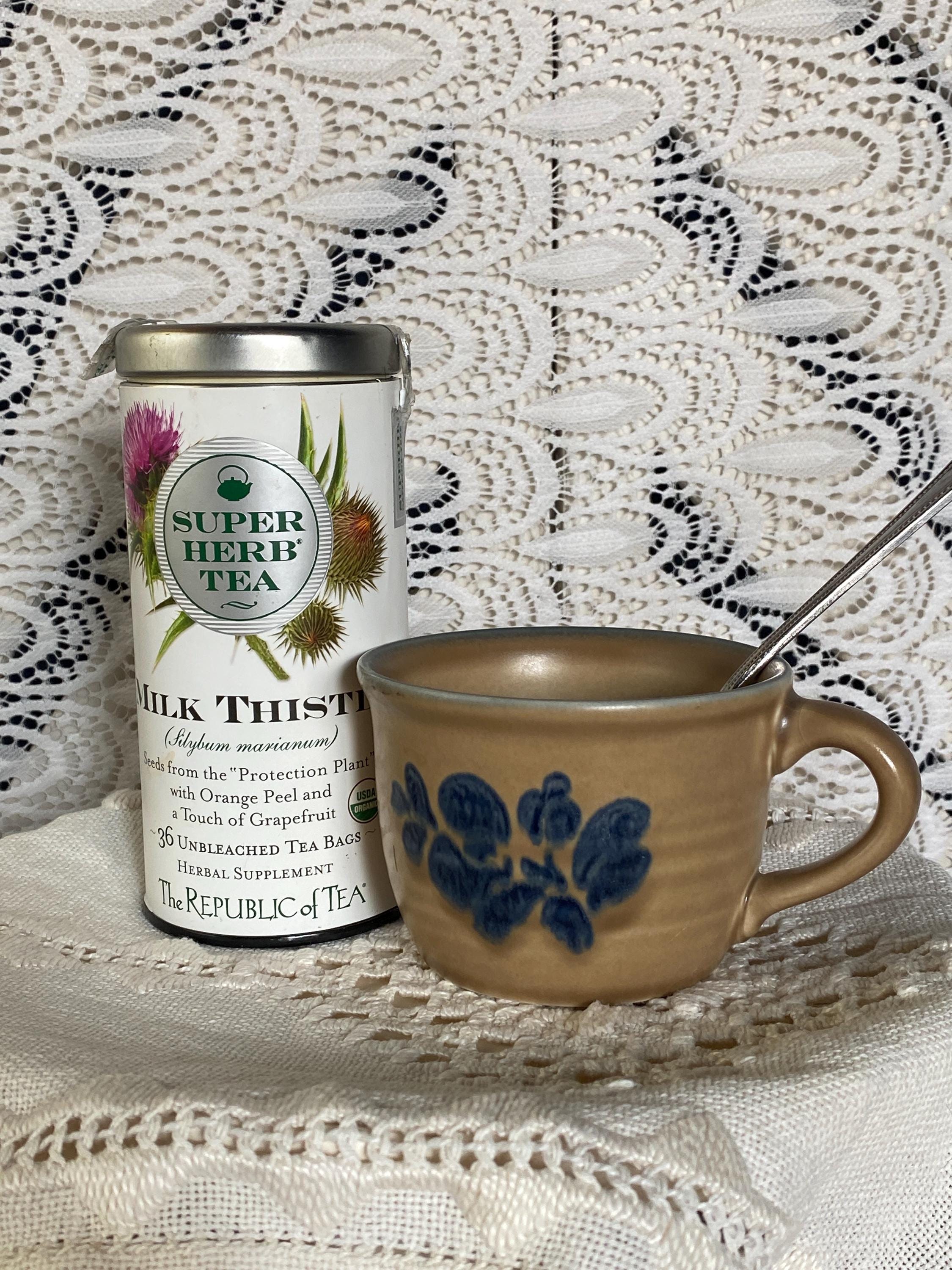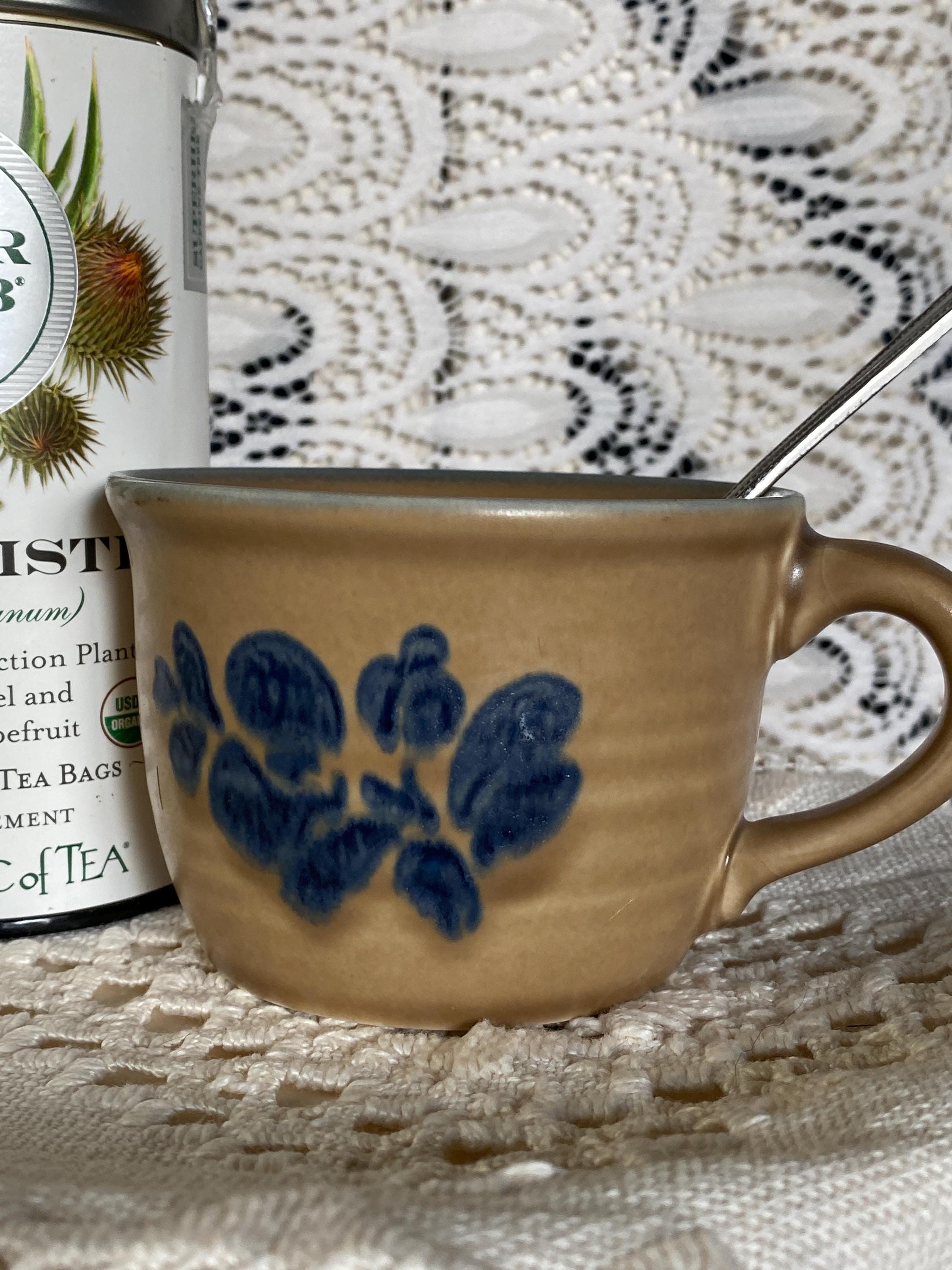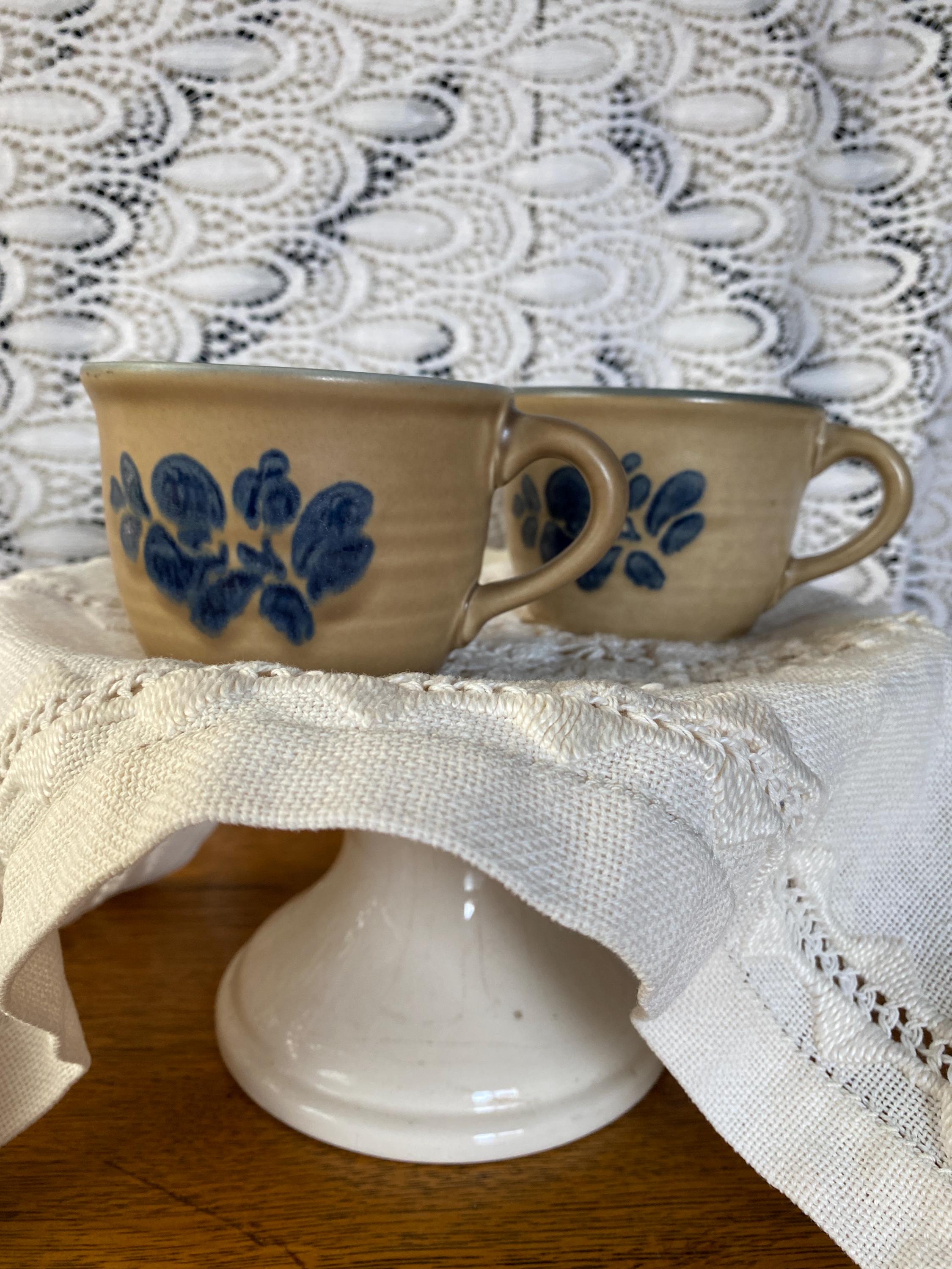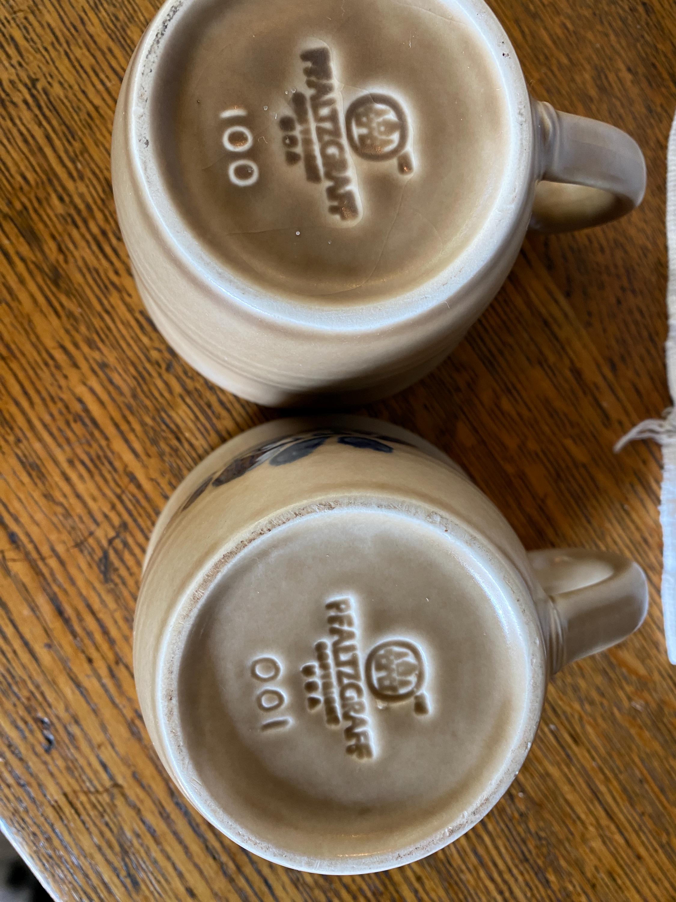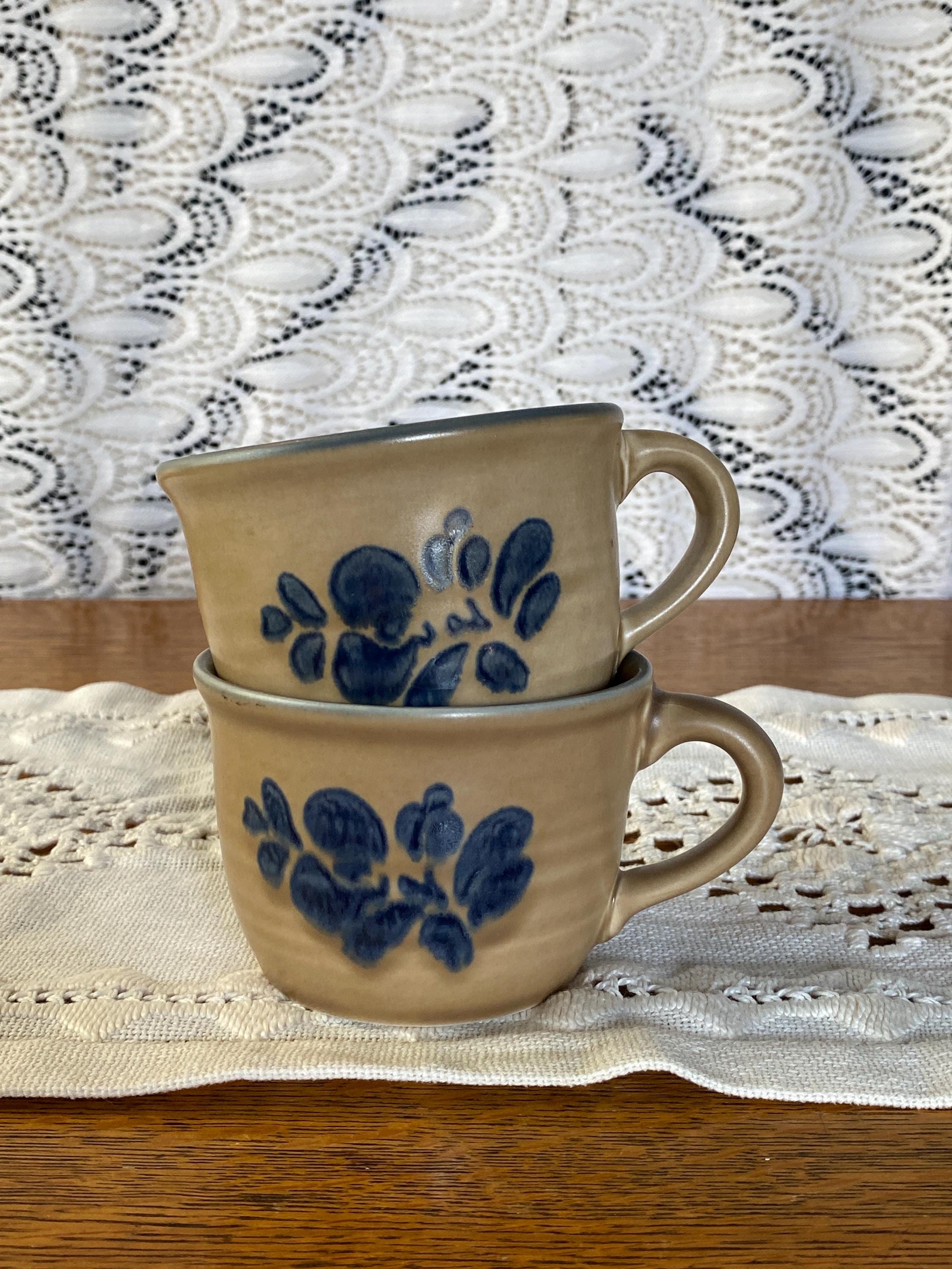 Classic stoneware mugs with a tan/ brown background, blue rims, and a blue folk art inspired floral pattern on the front. 4.5X3.5X2.5 inches each. Good vintage condition, minor wear consistent with age.