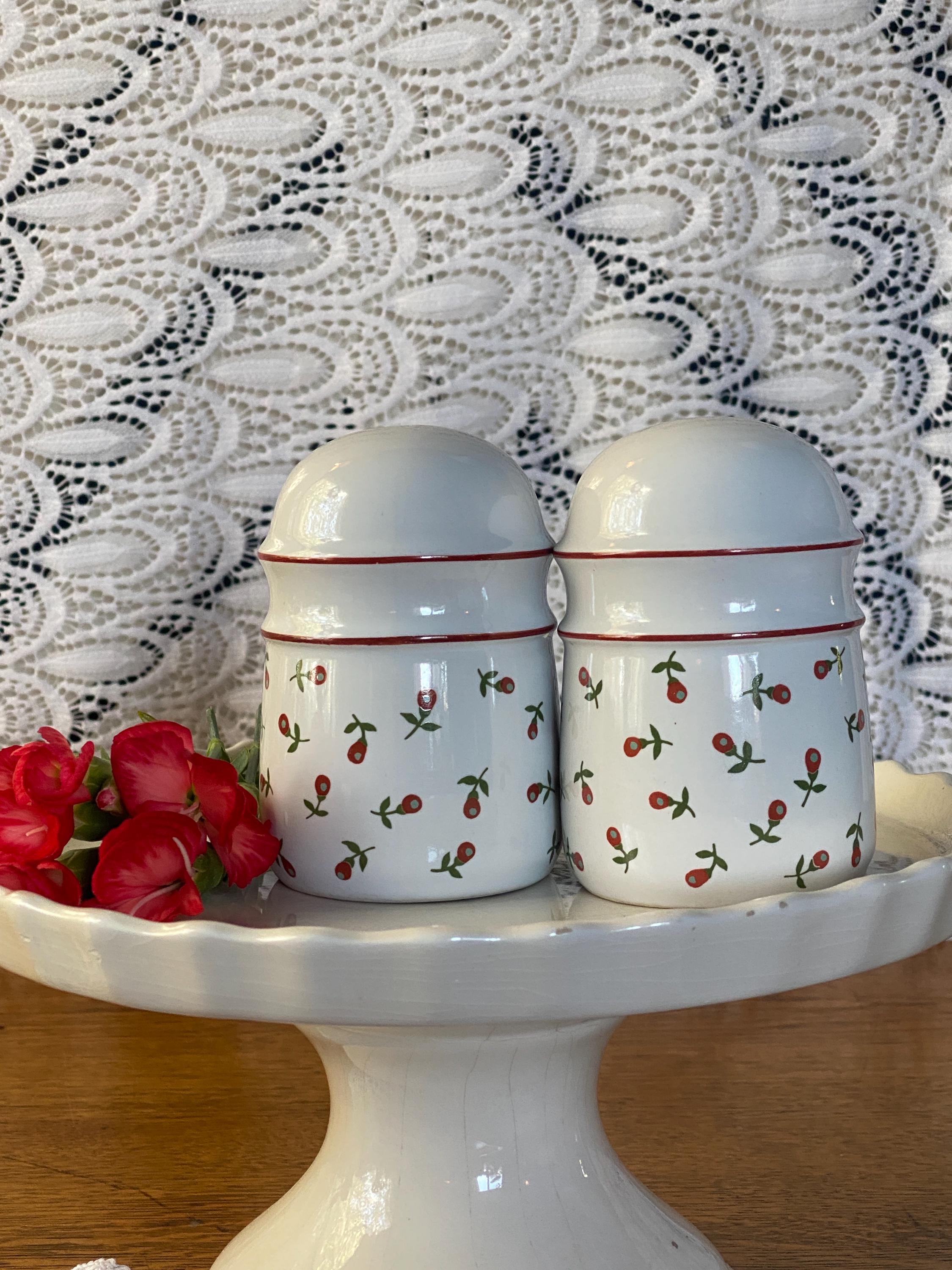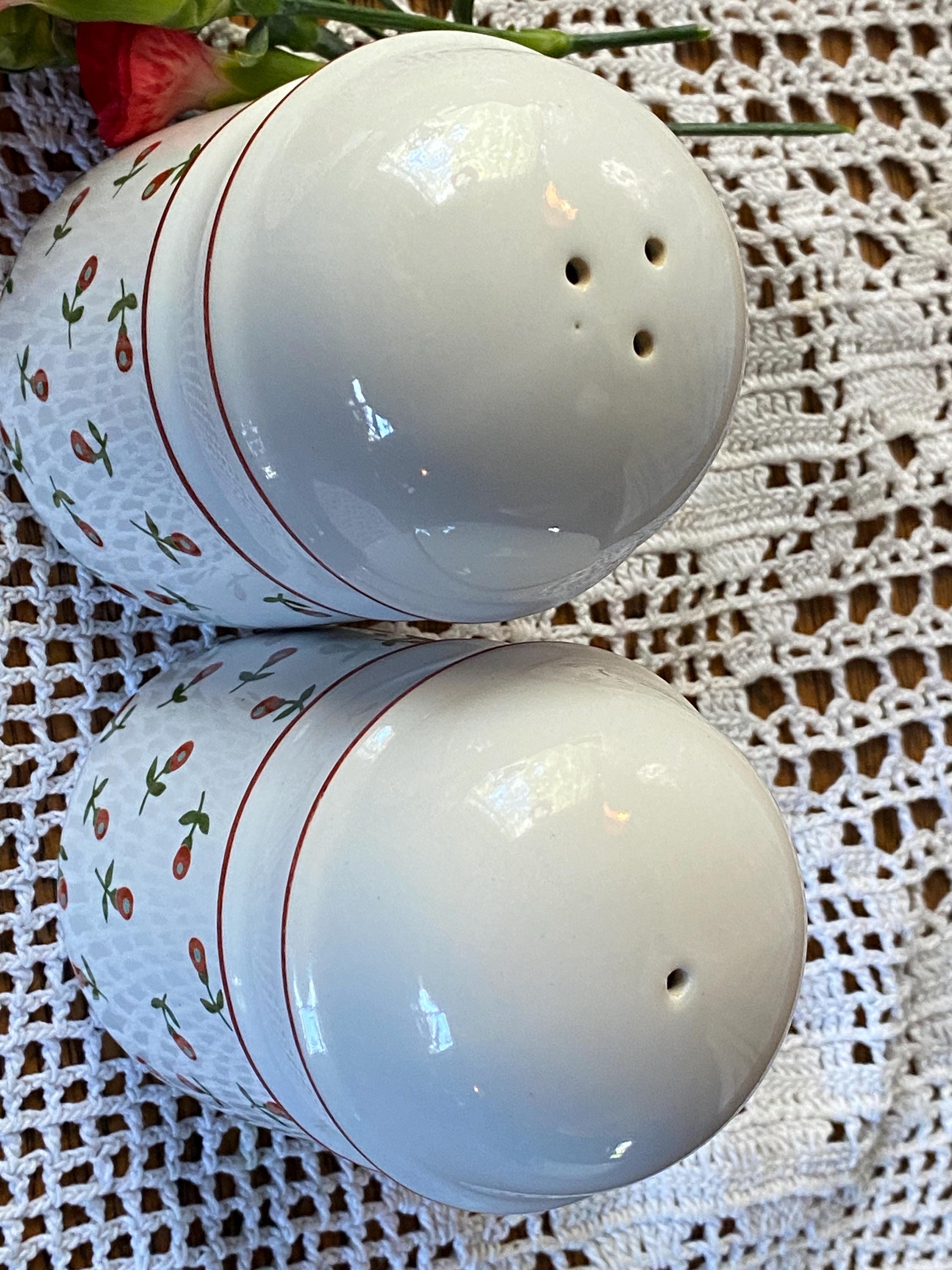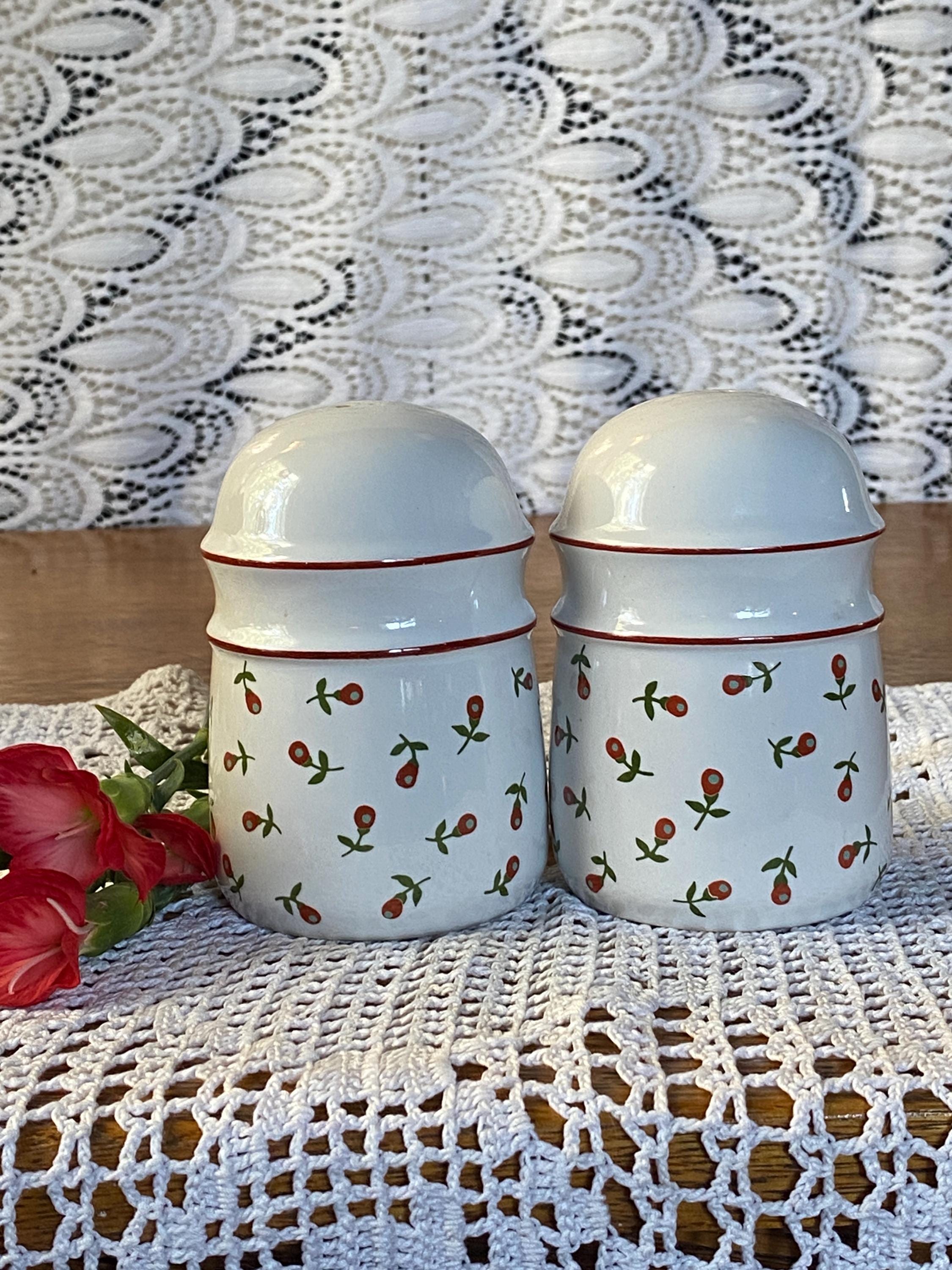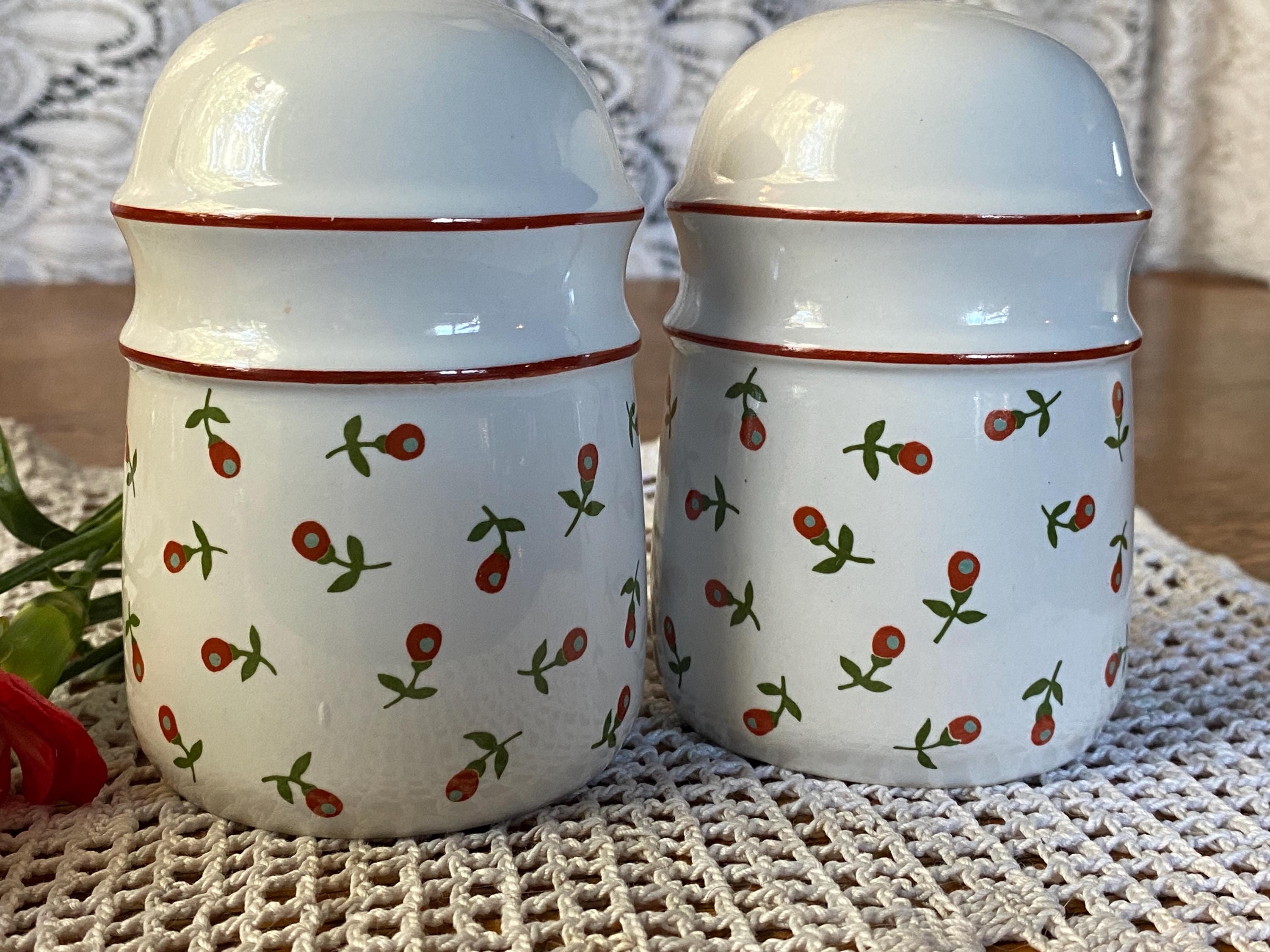 These white ceramic shakers are covered in little red cherries with green stems and leaves. Perfect for adding a cheerful, whimsical touch to a kitchen or dining table. 2.5X4 inches. No stoppers in bottom, very minor wear on pattern.