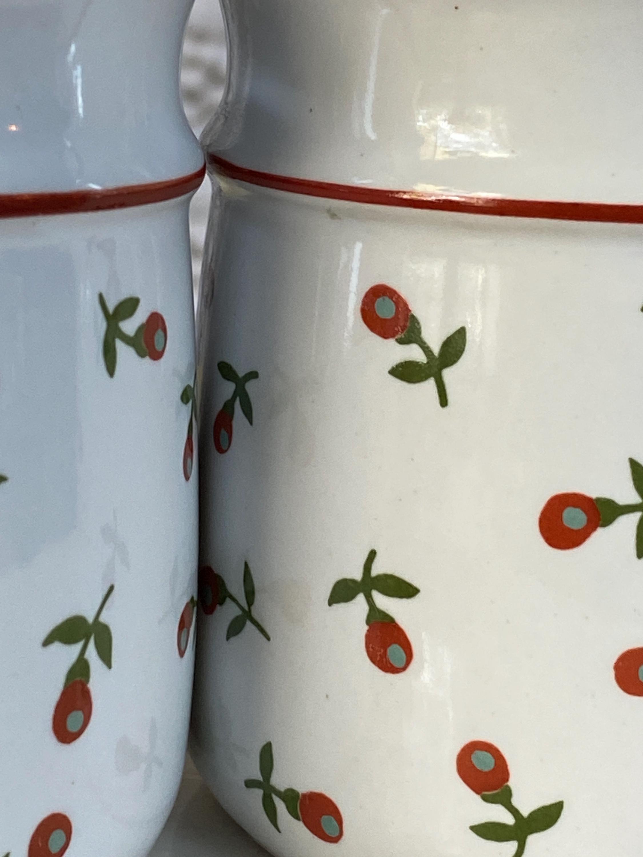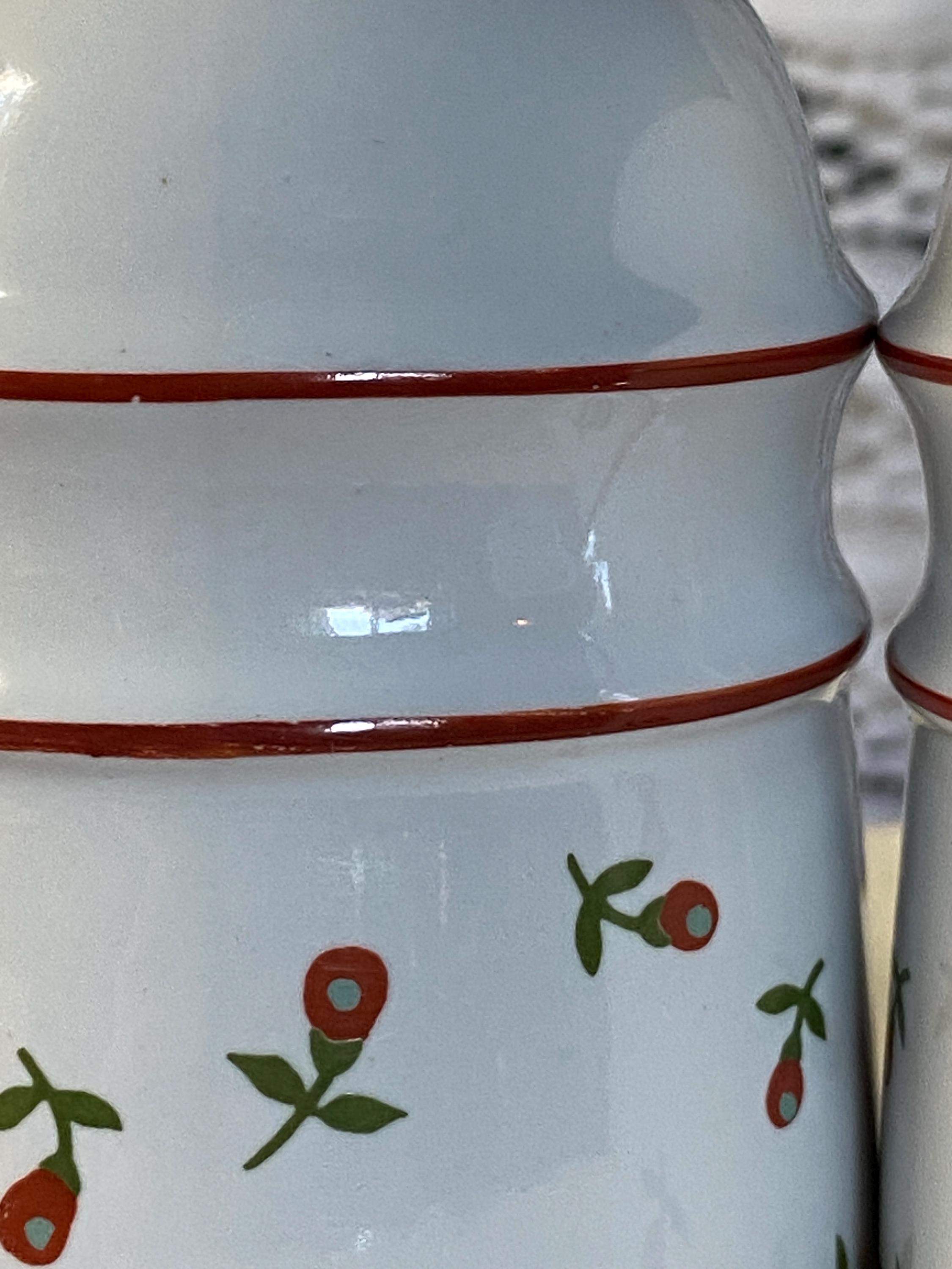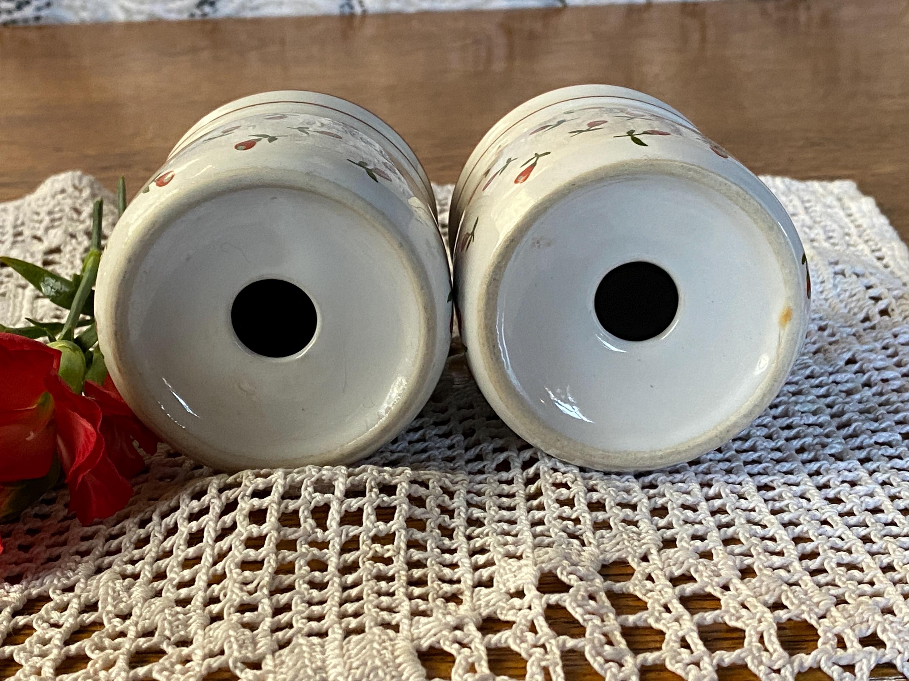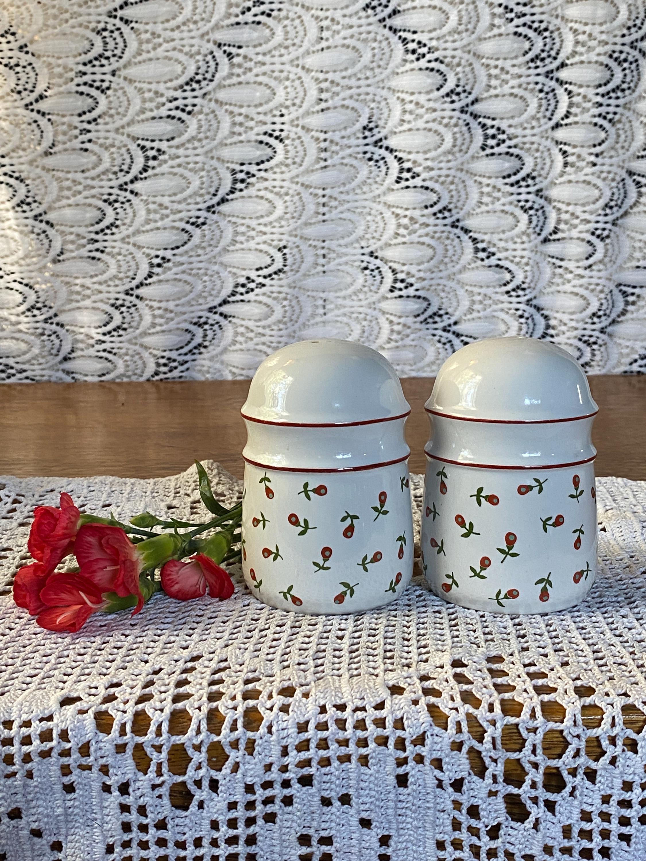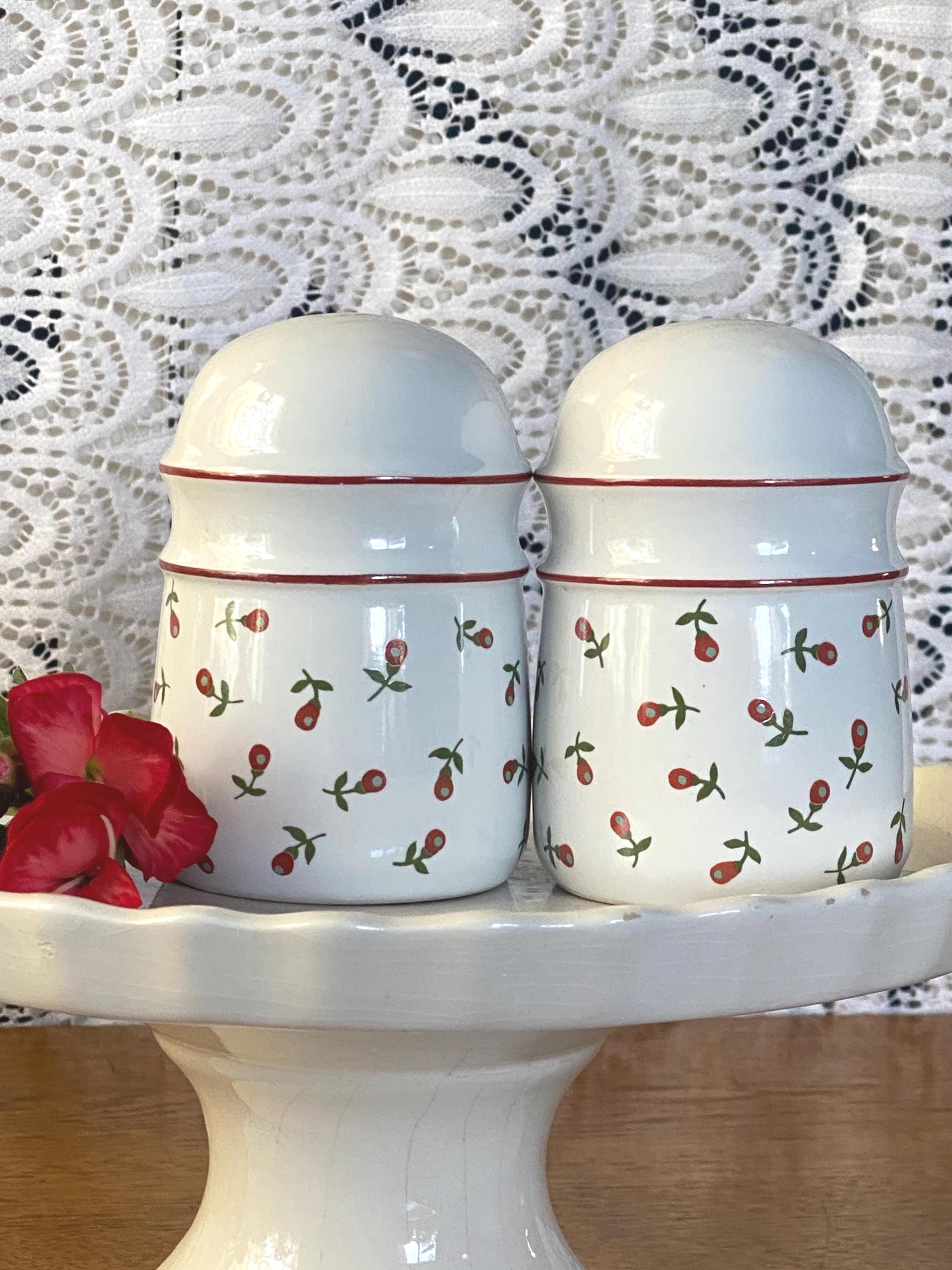 These white ceramic shakers are covered in little red cherries with green stems and leaves. Perfect for adding a cheerful, whimsical touch to a kitchen or dining table. 2.5X4 inches. No stoppers in bottom, very minor wear on pattern.