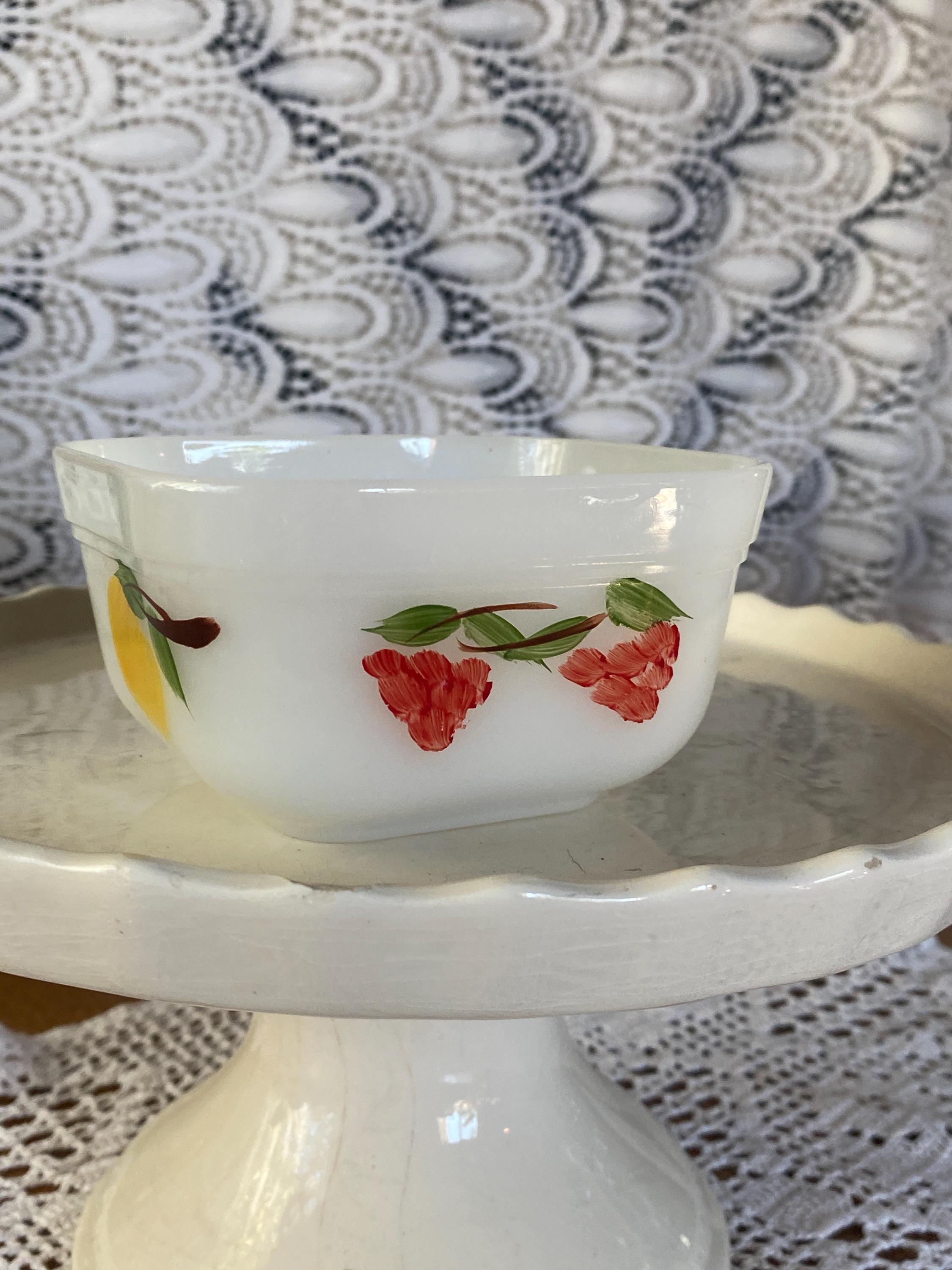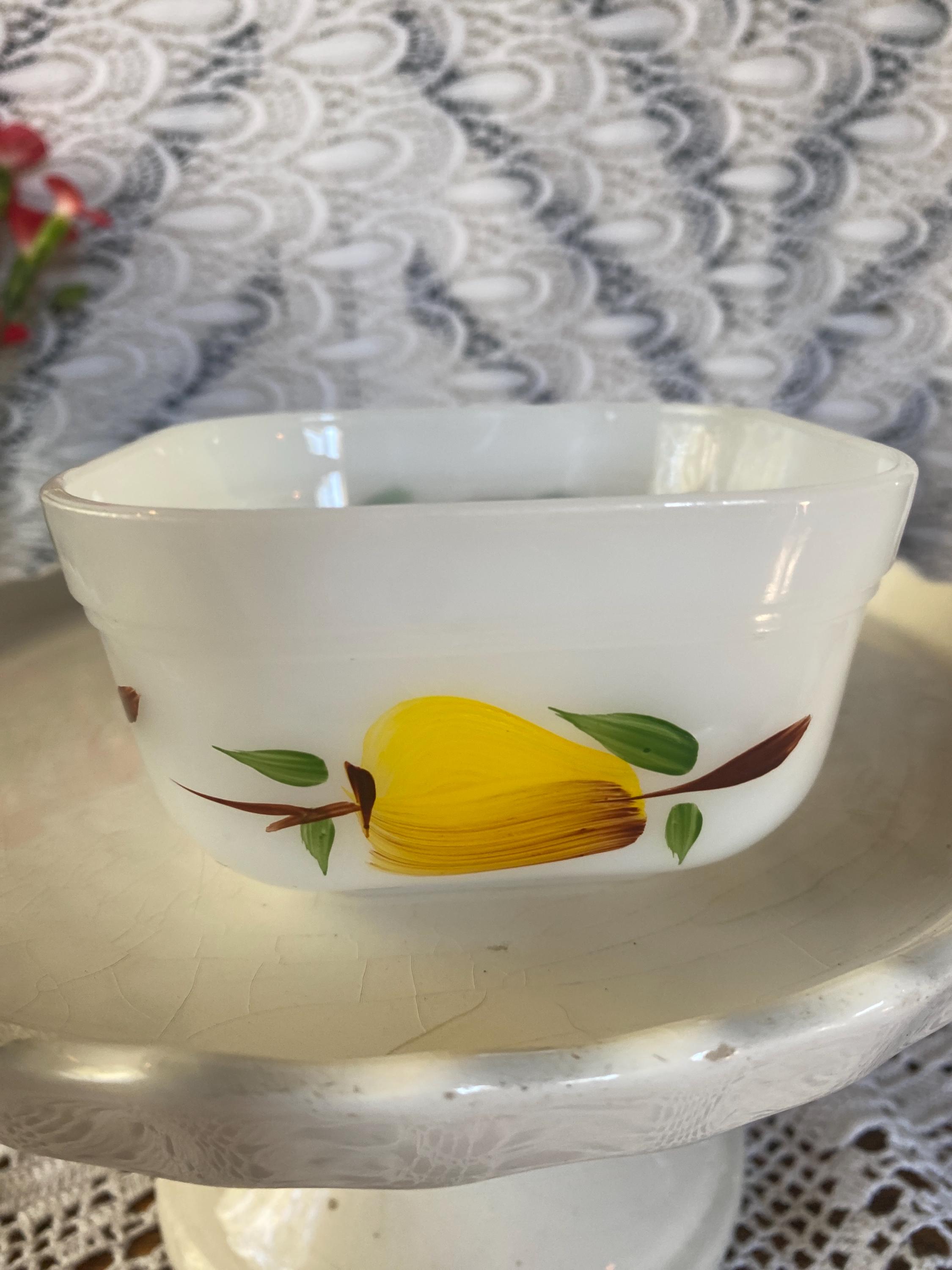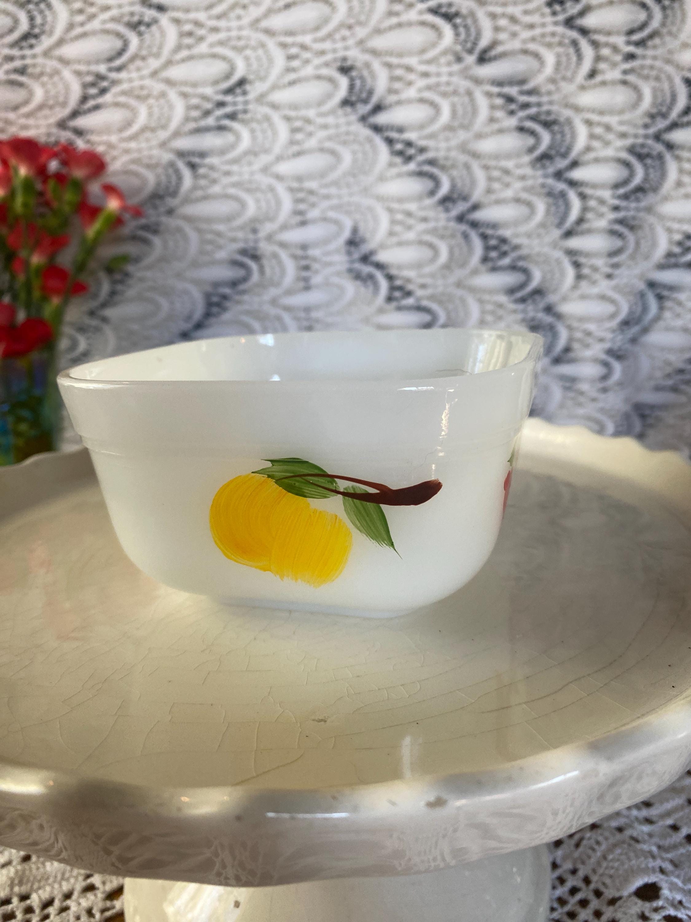 Great for serving or storing small food items, the vintage Anchor Hocking piece is painted with a different colored fruit on each side. 4X2 inches. Some minor wear on pattern and minor scratches.