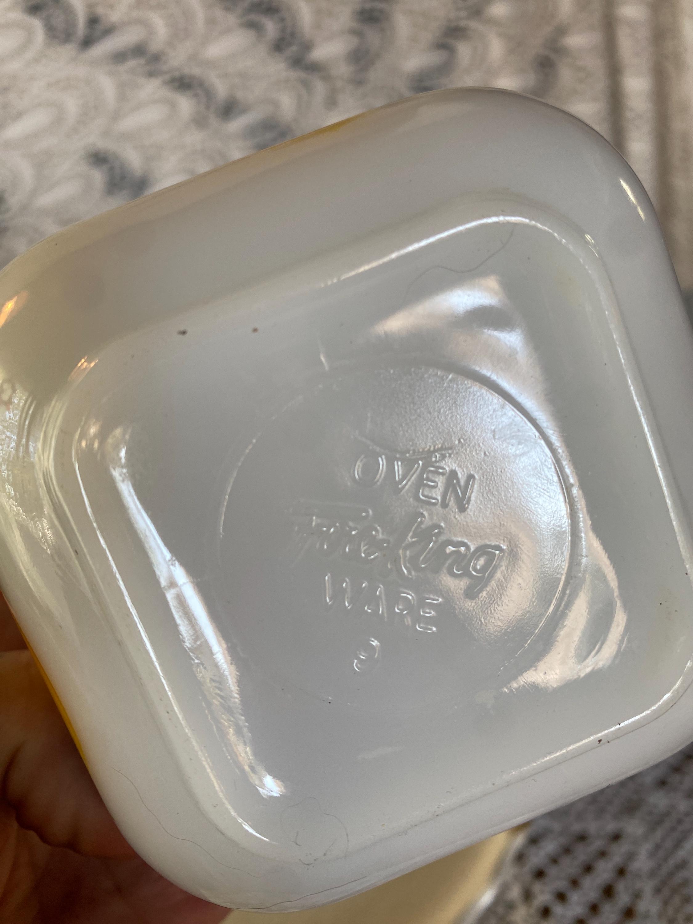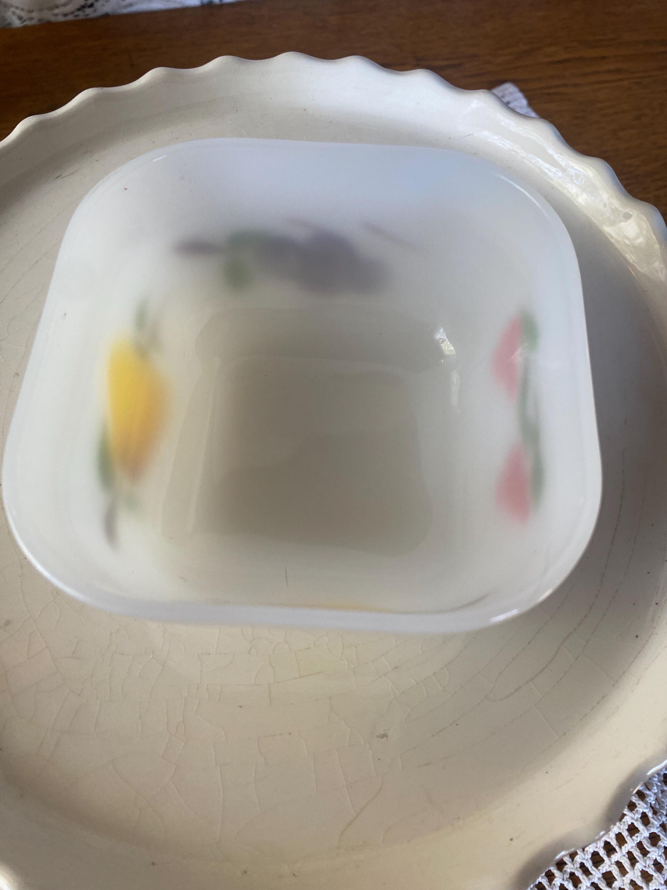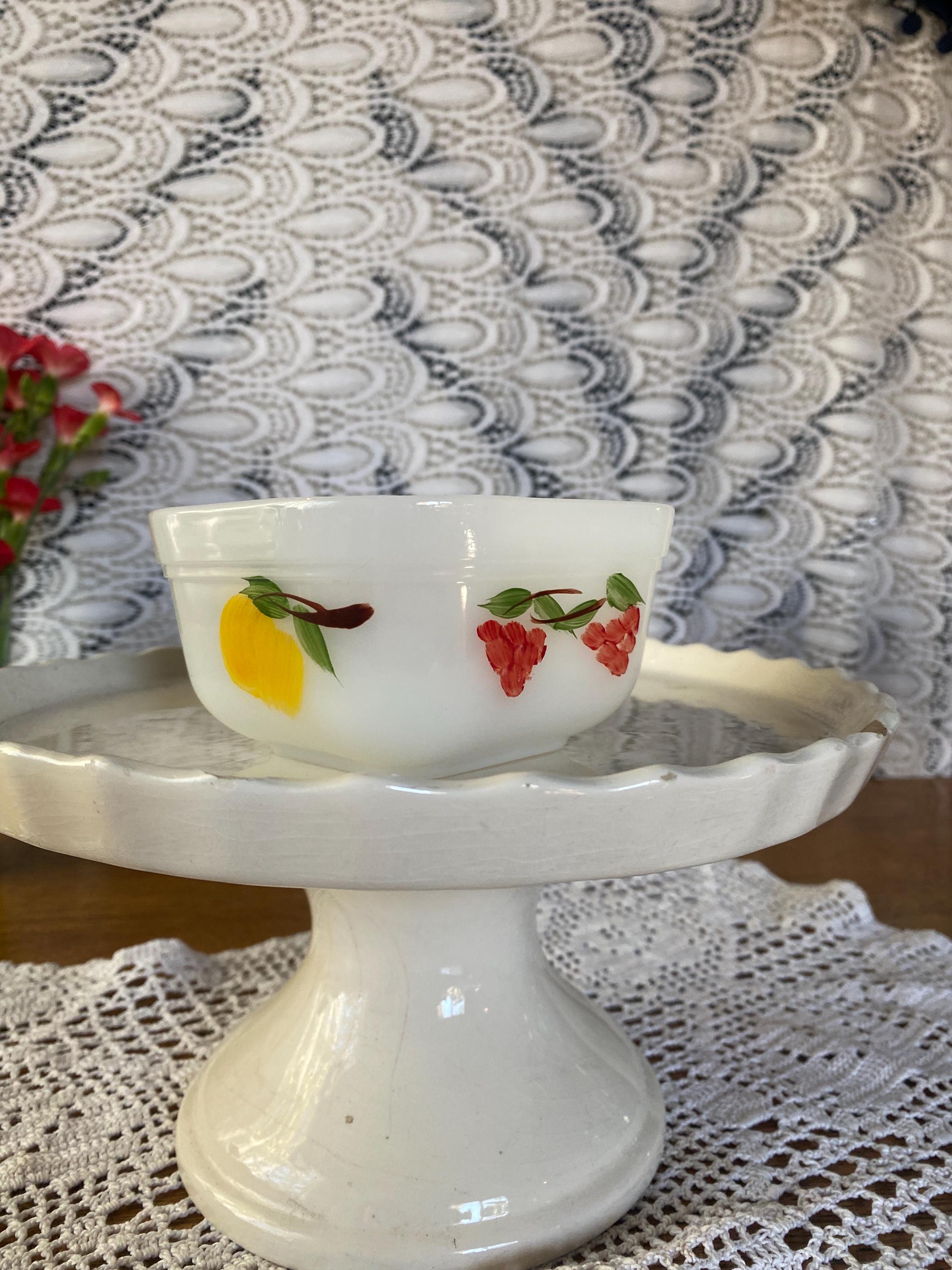 Great for serving or storing small food items, the vintage Anchor Hocking piece is painted with a different colored fruit on each side. 4X2 inches. Some minor wear on pattern and minor scratches.