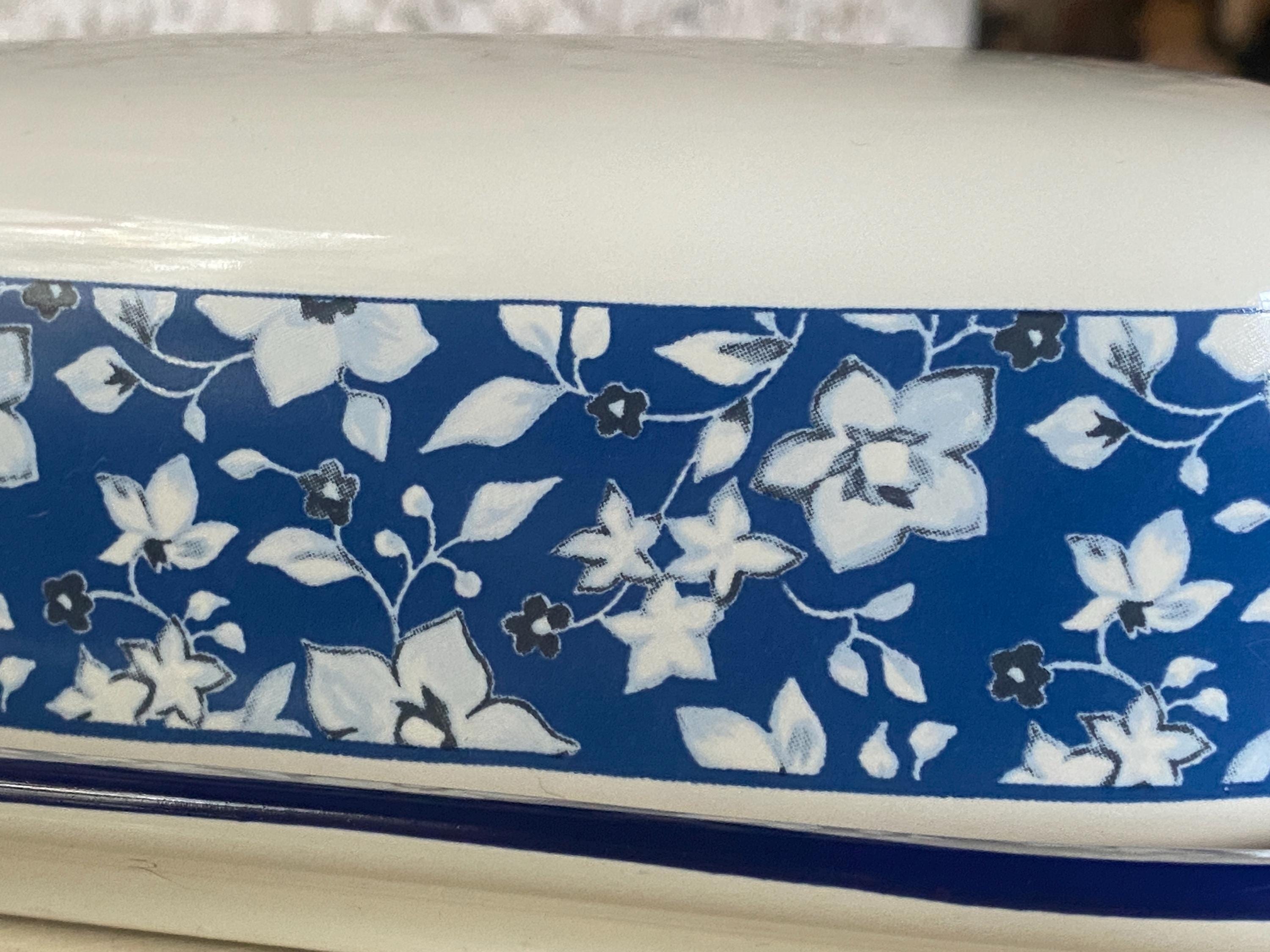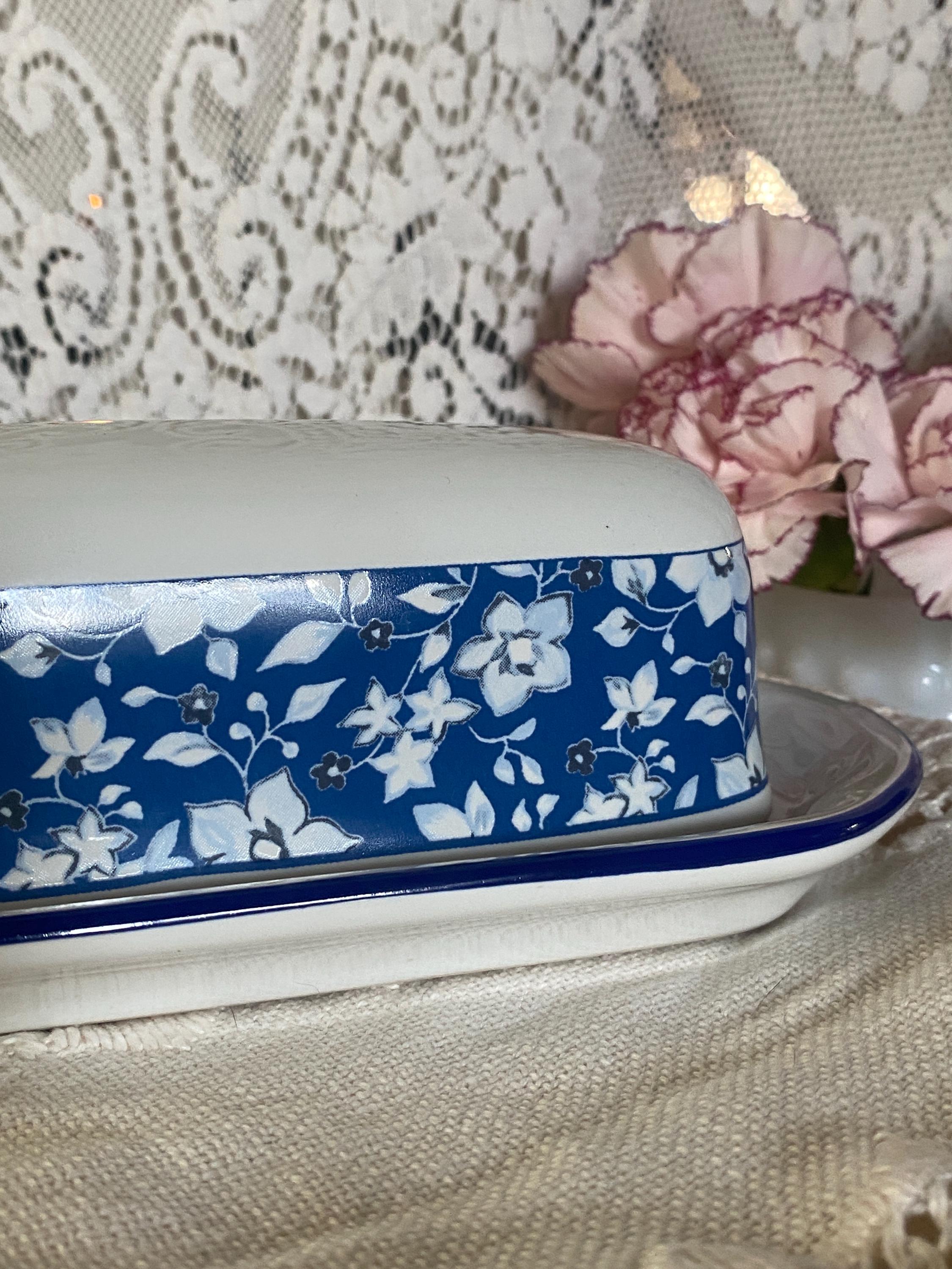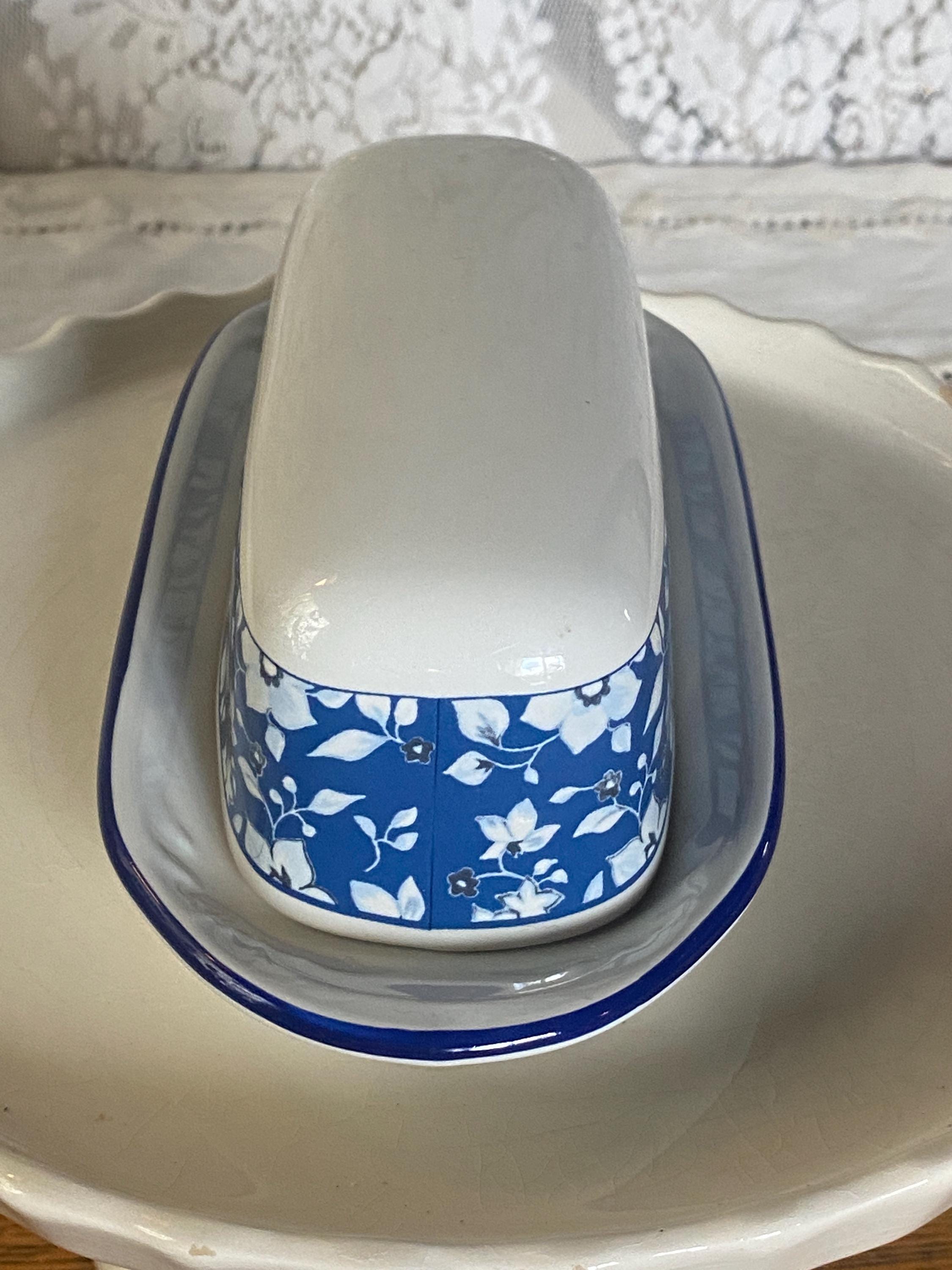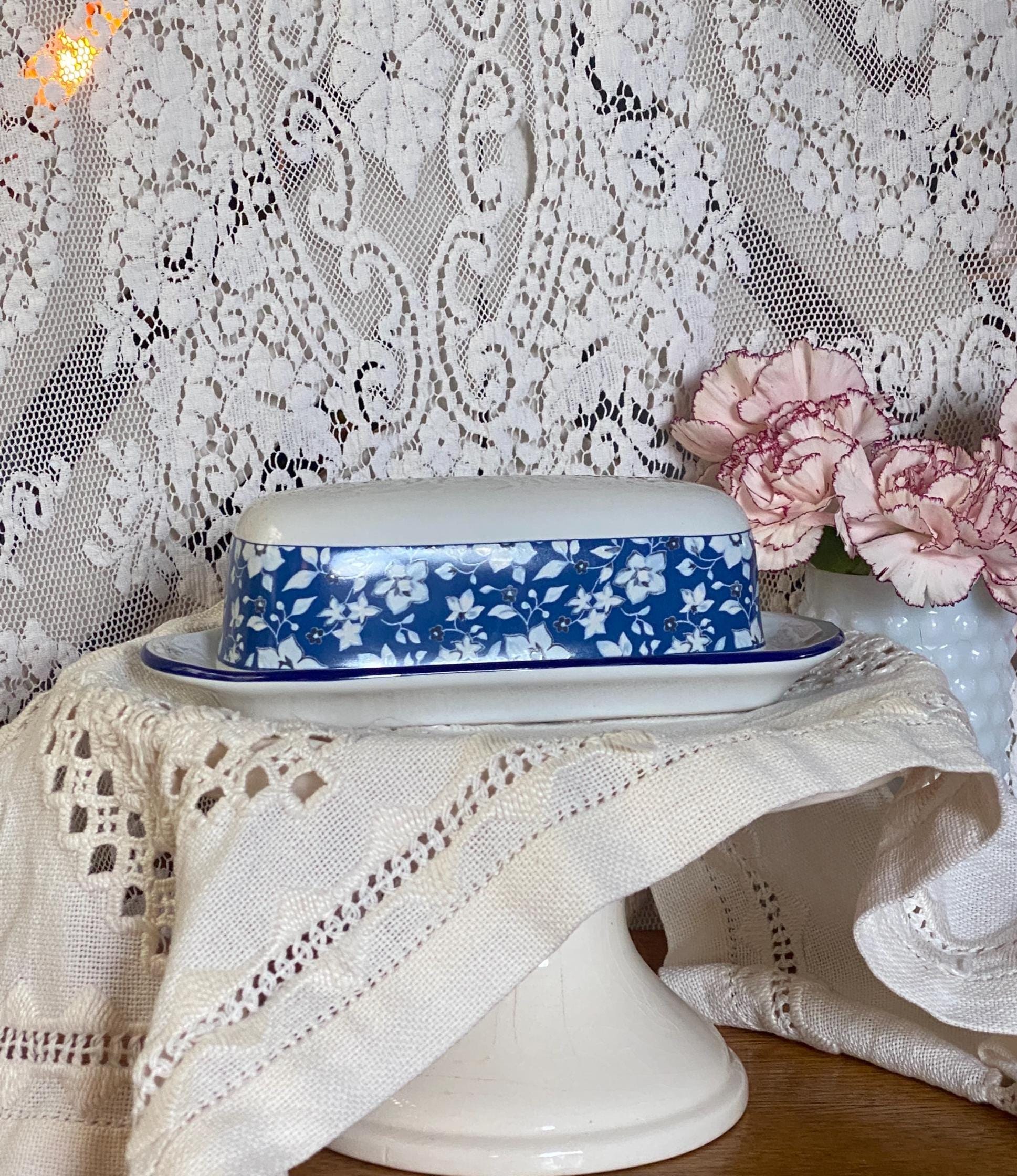 This pretty little floral butter dish fits perfectly in a country or cottage style kitchen. White background with blue flowers. 8X4X2.5 inches. All items in my shop are vintage or handmade and may have signs of use, wear, or variation consistent with age or hand production. Please review the photos and video carefully and message me with any questions on condition.