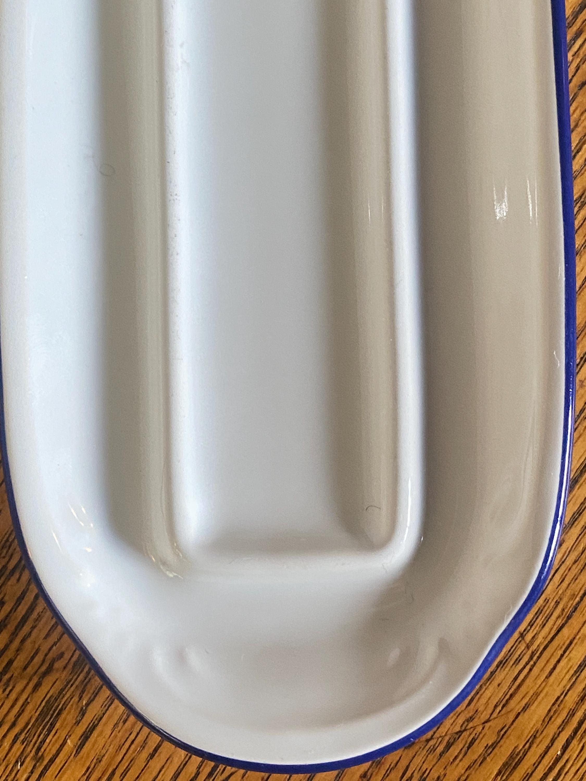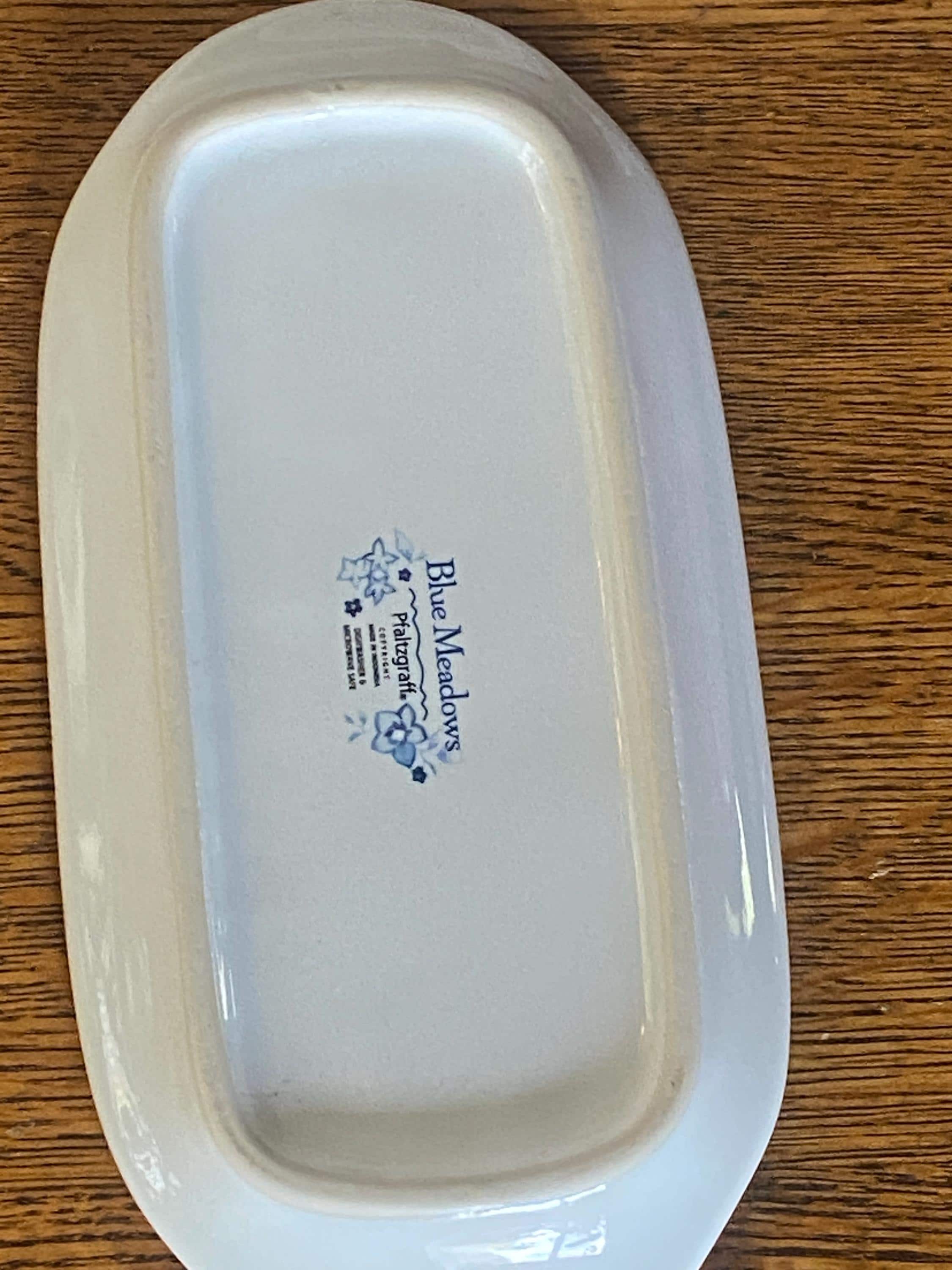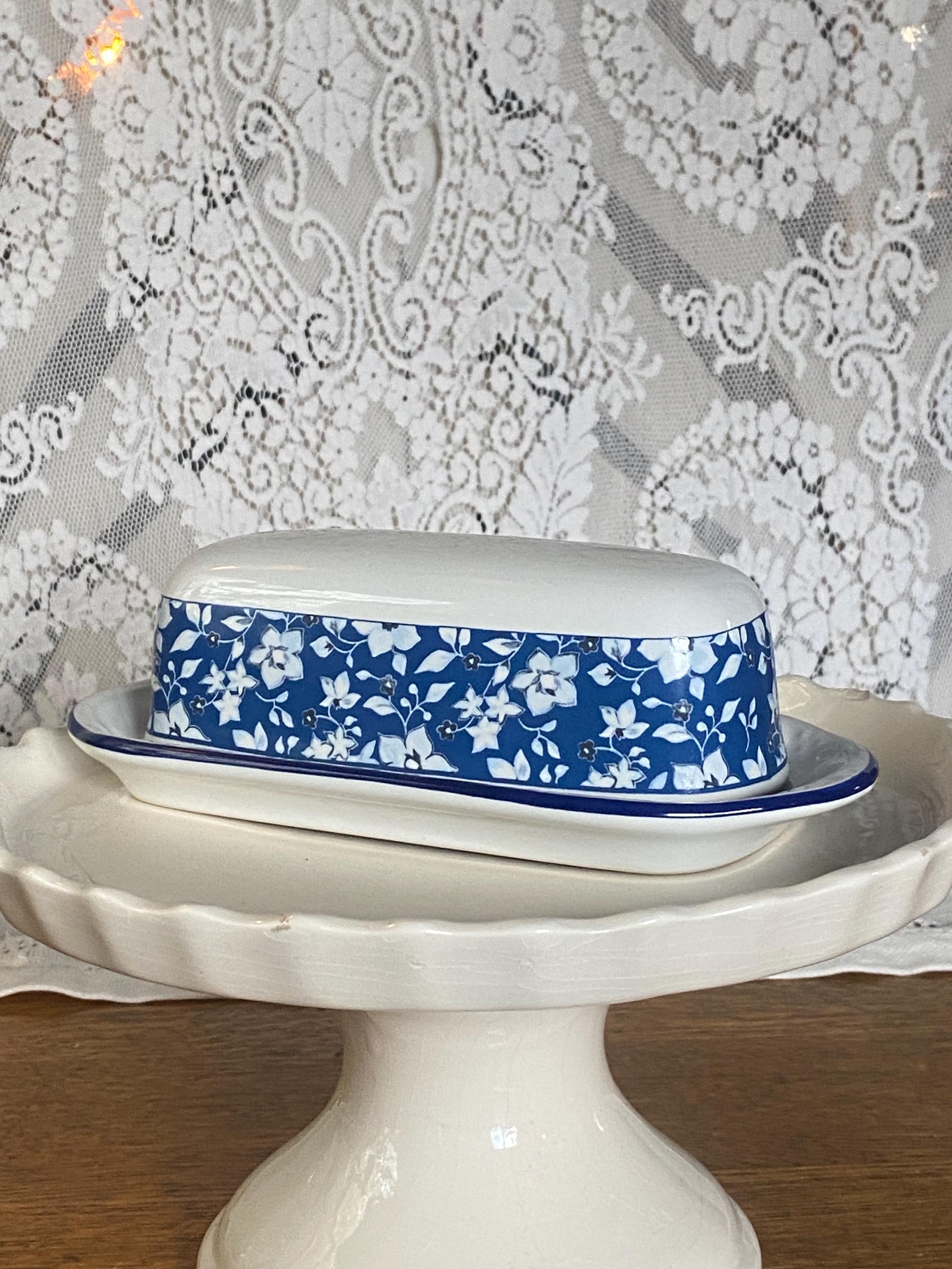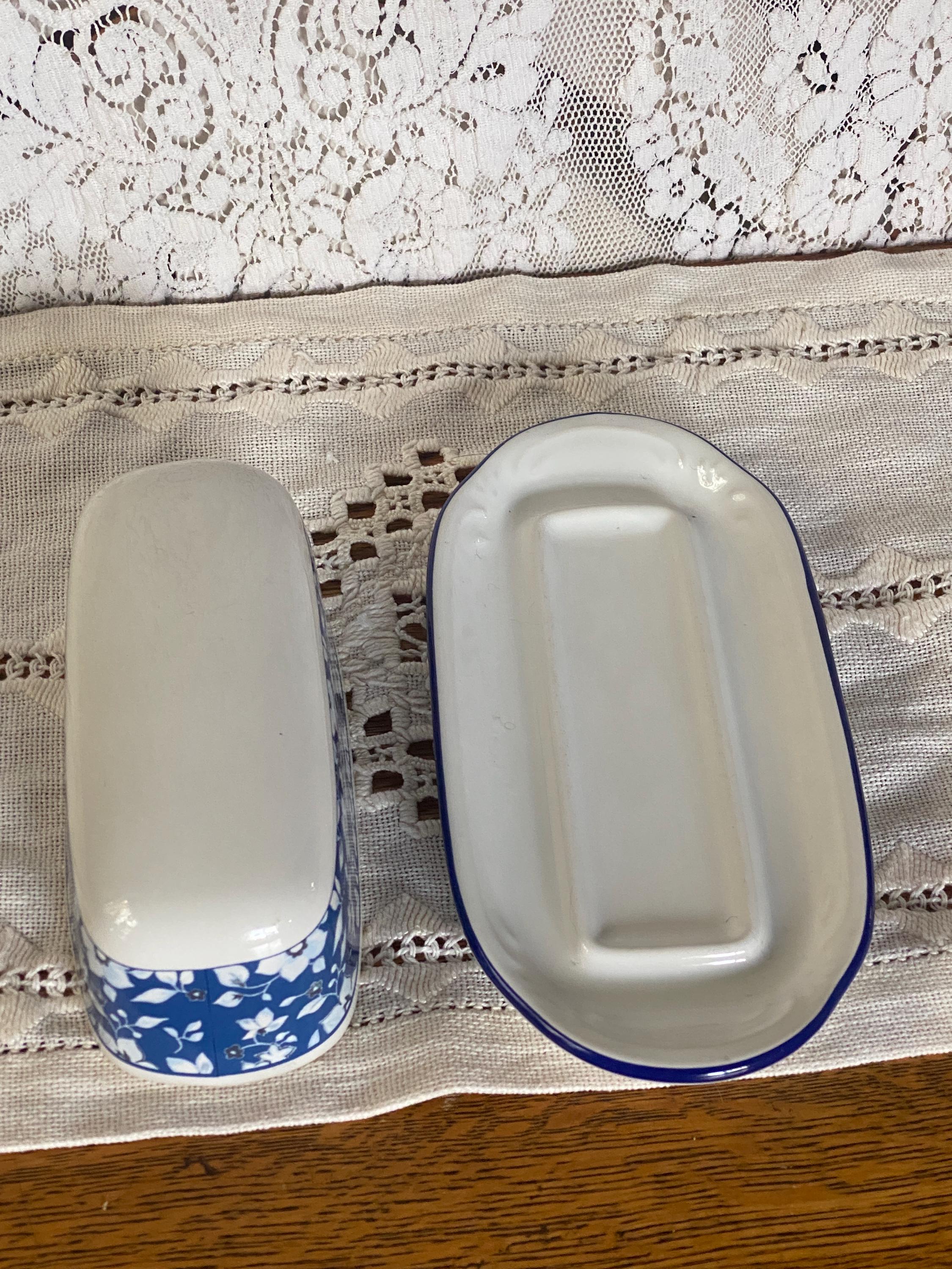 This pretty little floral butter dish fits perfectly in a country or cottage style kitchen. White background with blue flowers. 8X4X2.5 inches. All items in my shop are vintage or handmade and may have signs of use, wear, or variation consistent with age or hand production. Please review the photos and video carefully and message me with any questions on condition.