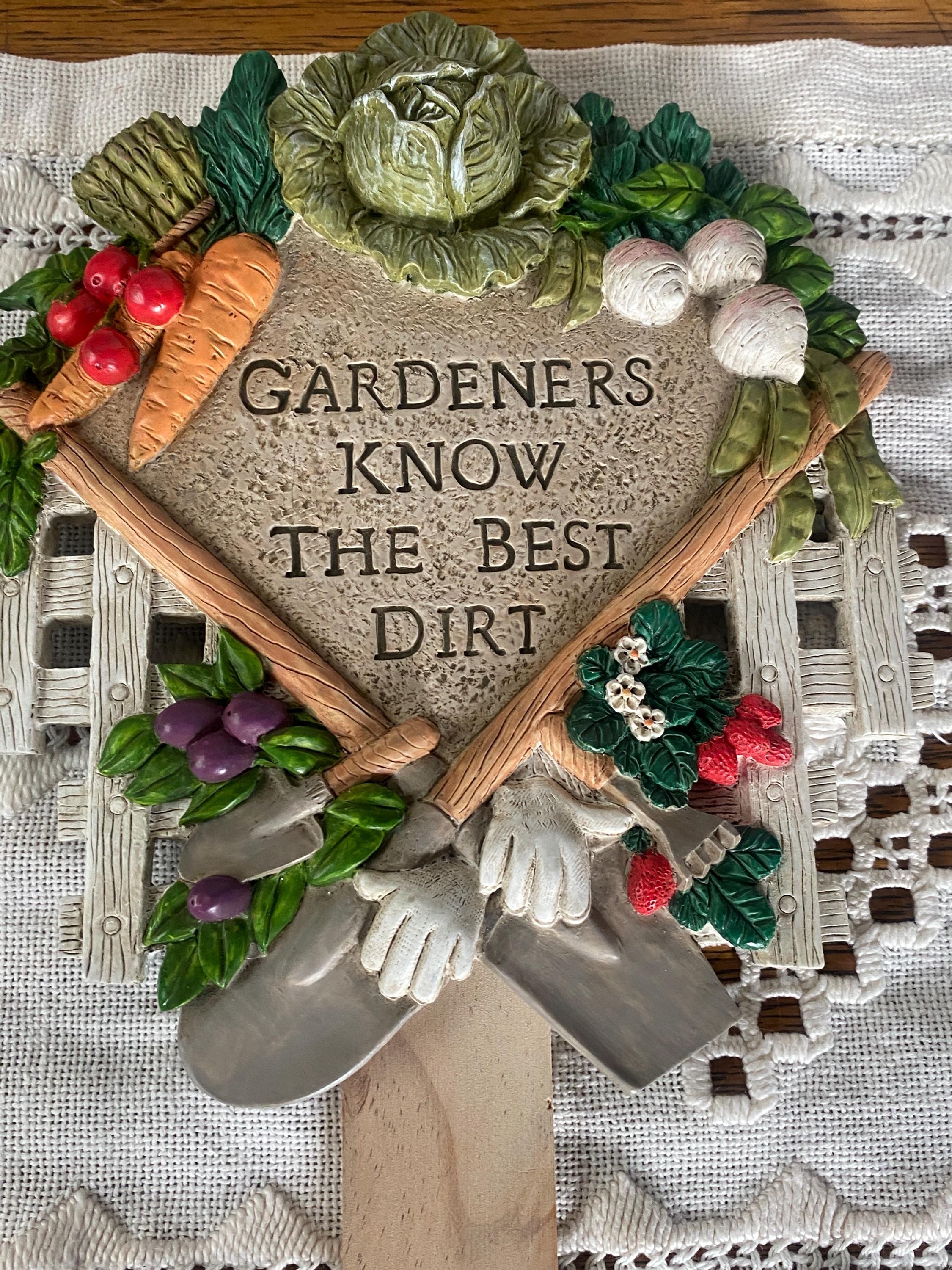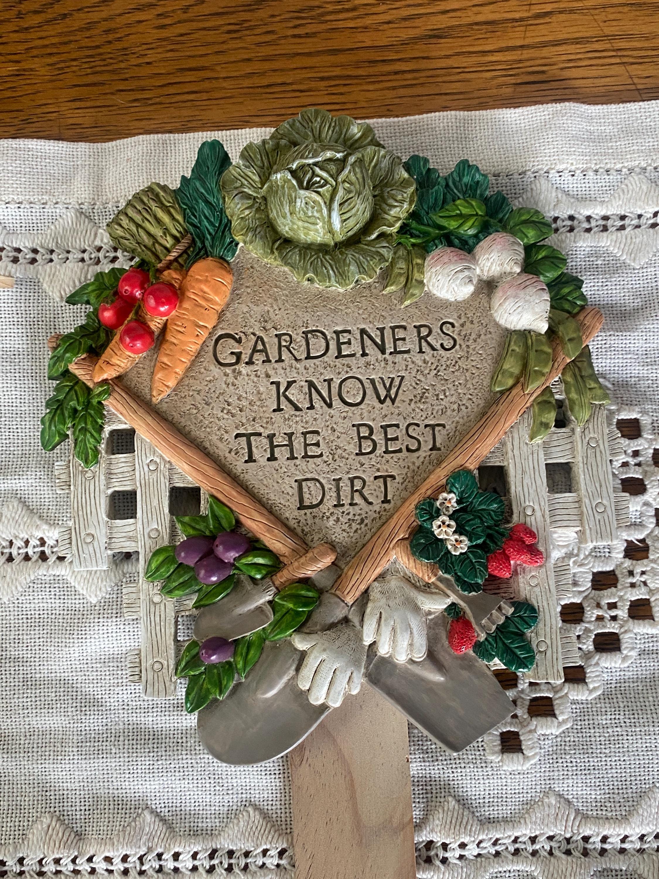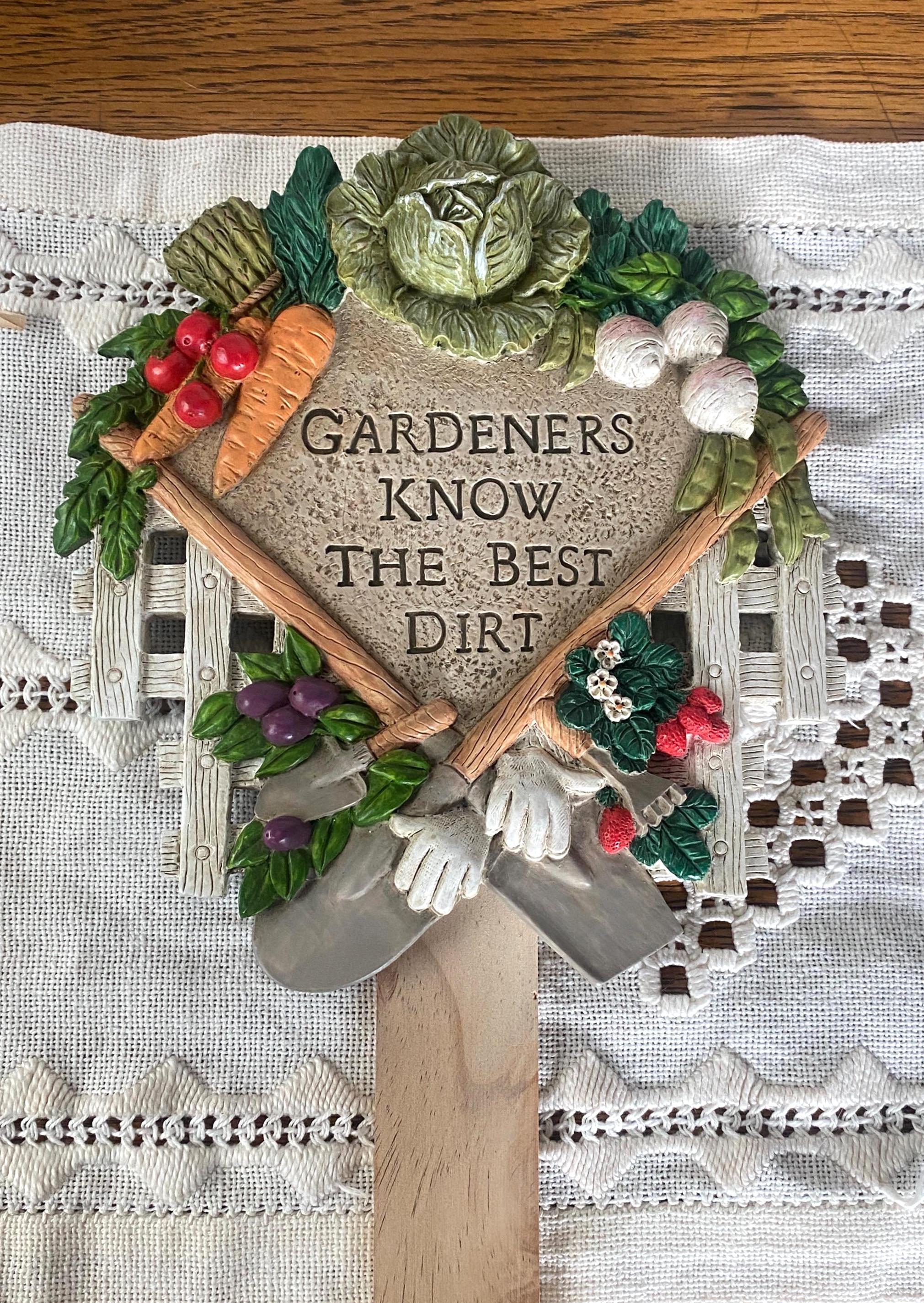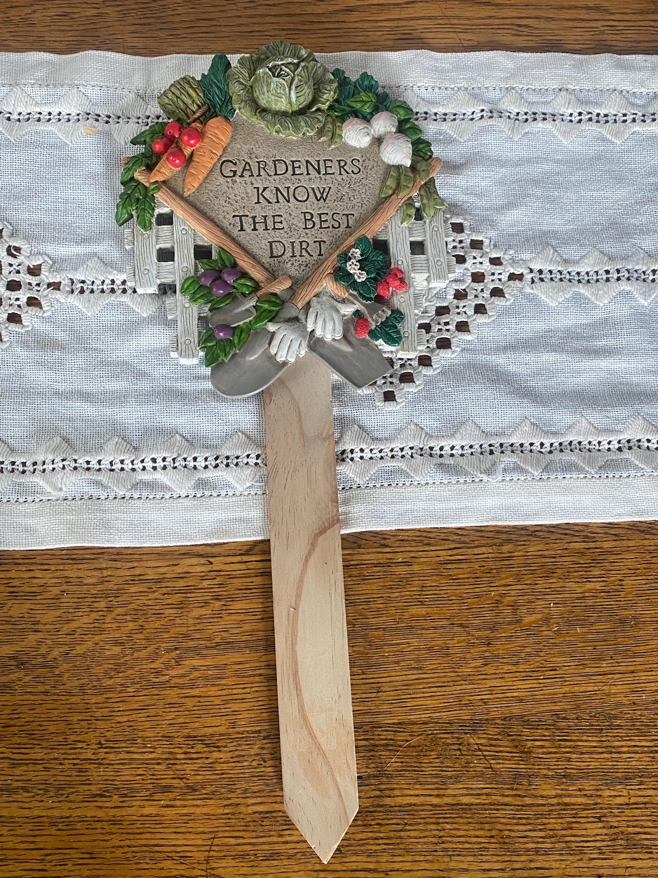 This cute piece would be such a great gift for a garden-loving friend or family member. Plaque is made of resin and is attached to a wooden stake. 7X16 inches, good condition.