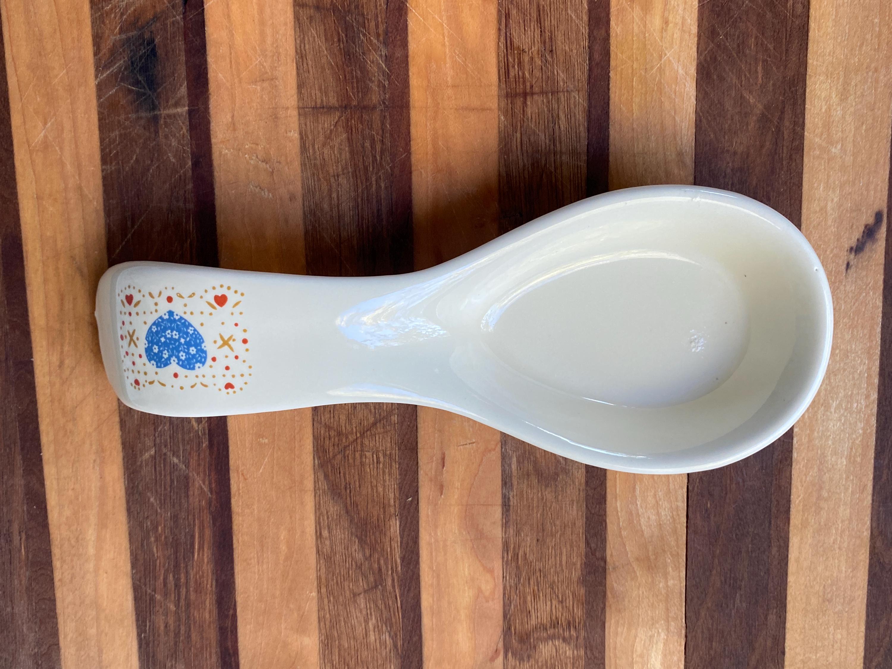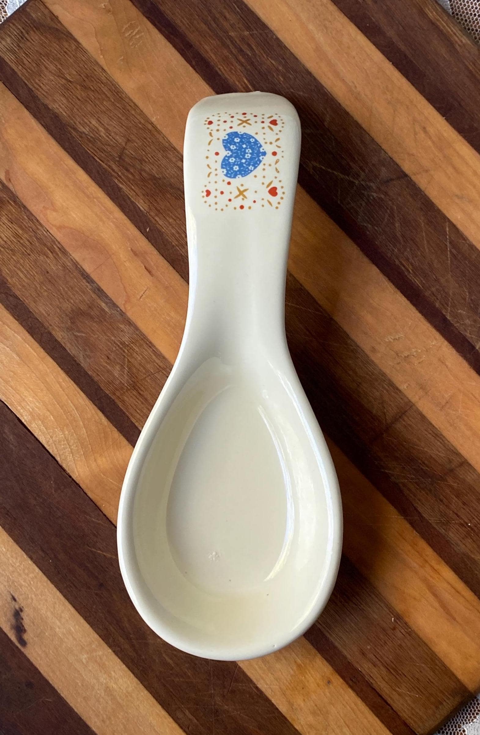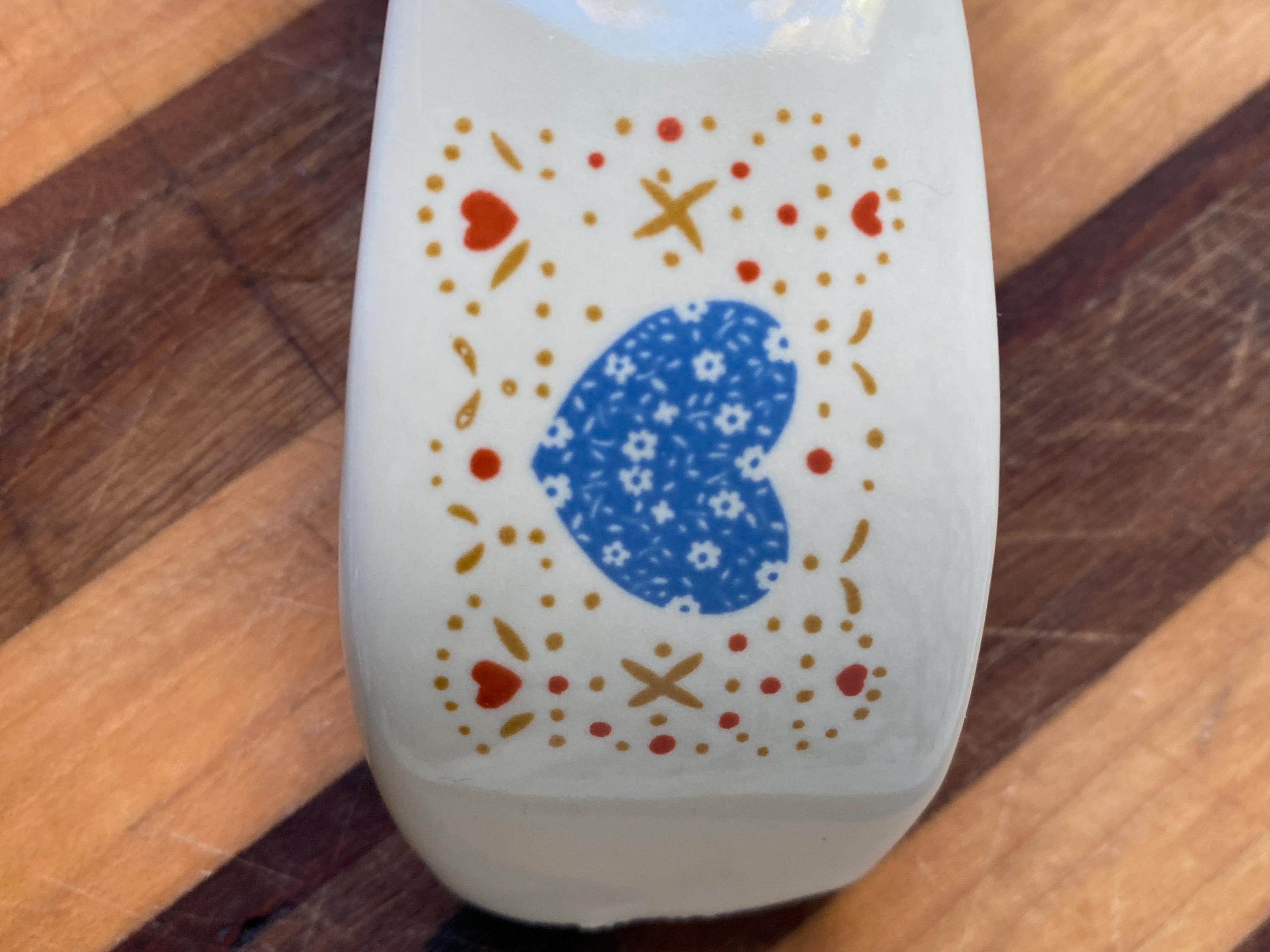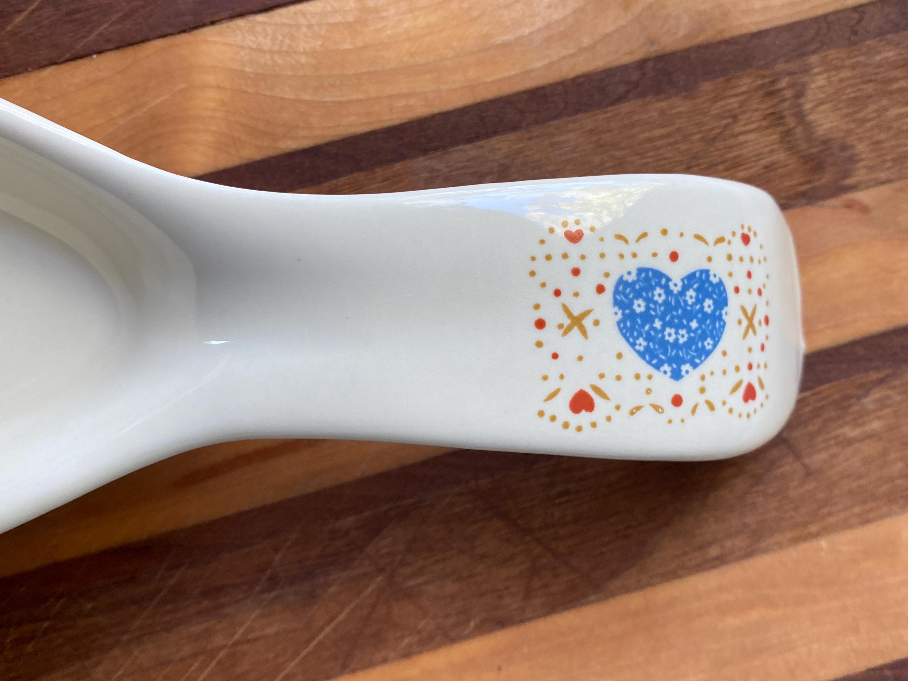 Perfect for a vintage country style kitchen with its little blue heart pattern. 8X3 inches. Some rubbing on bottom. Top edge has manufacture/ glaze imperfections/ see last two photos.