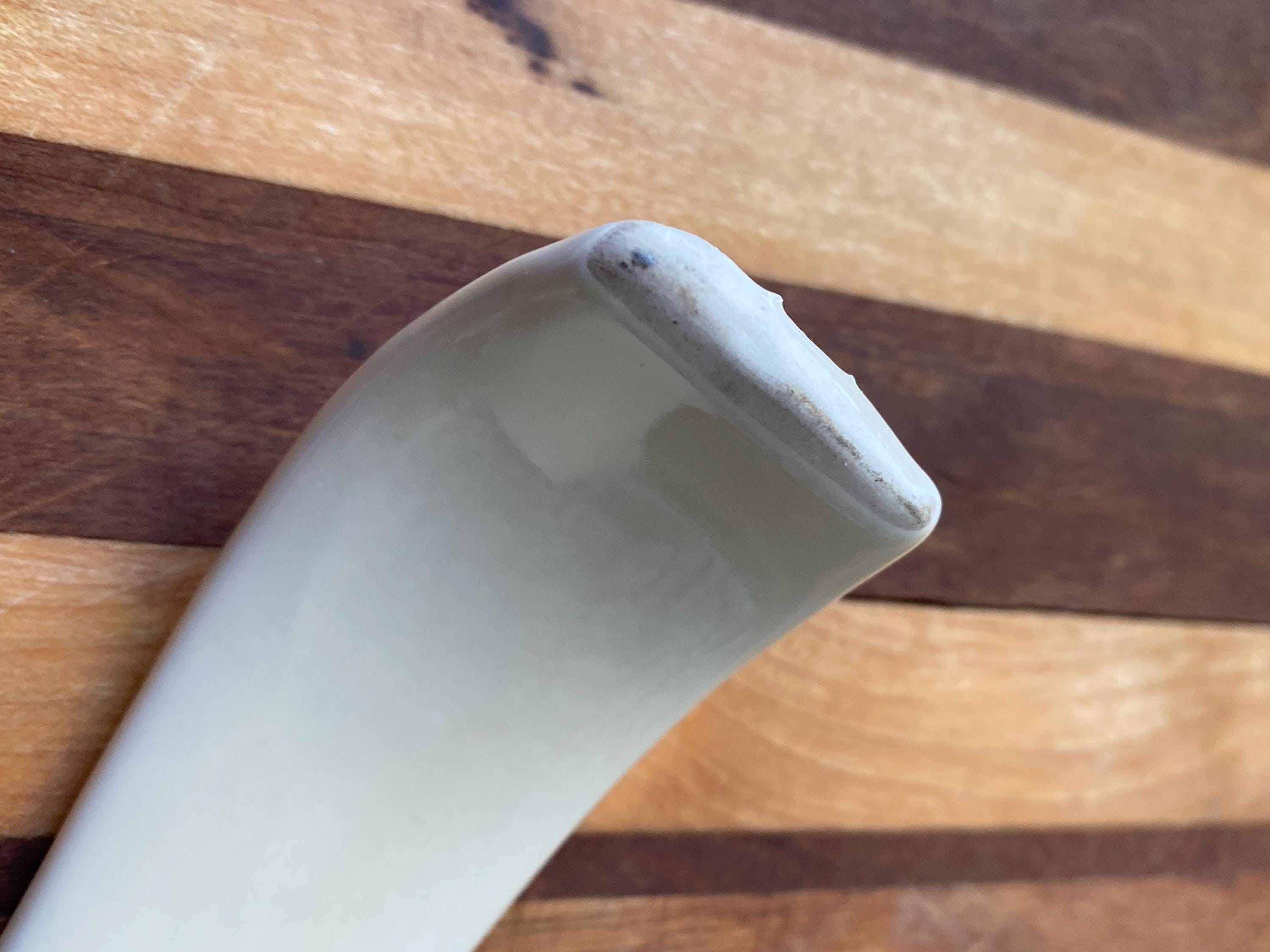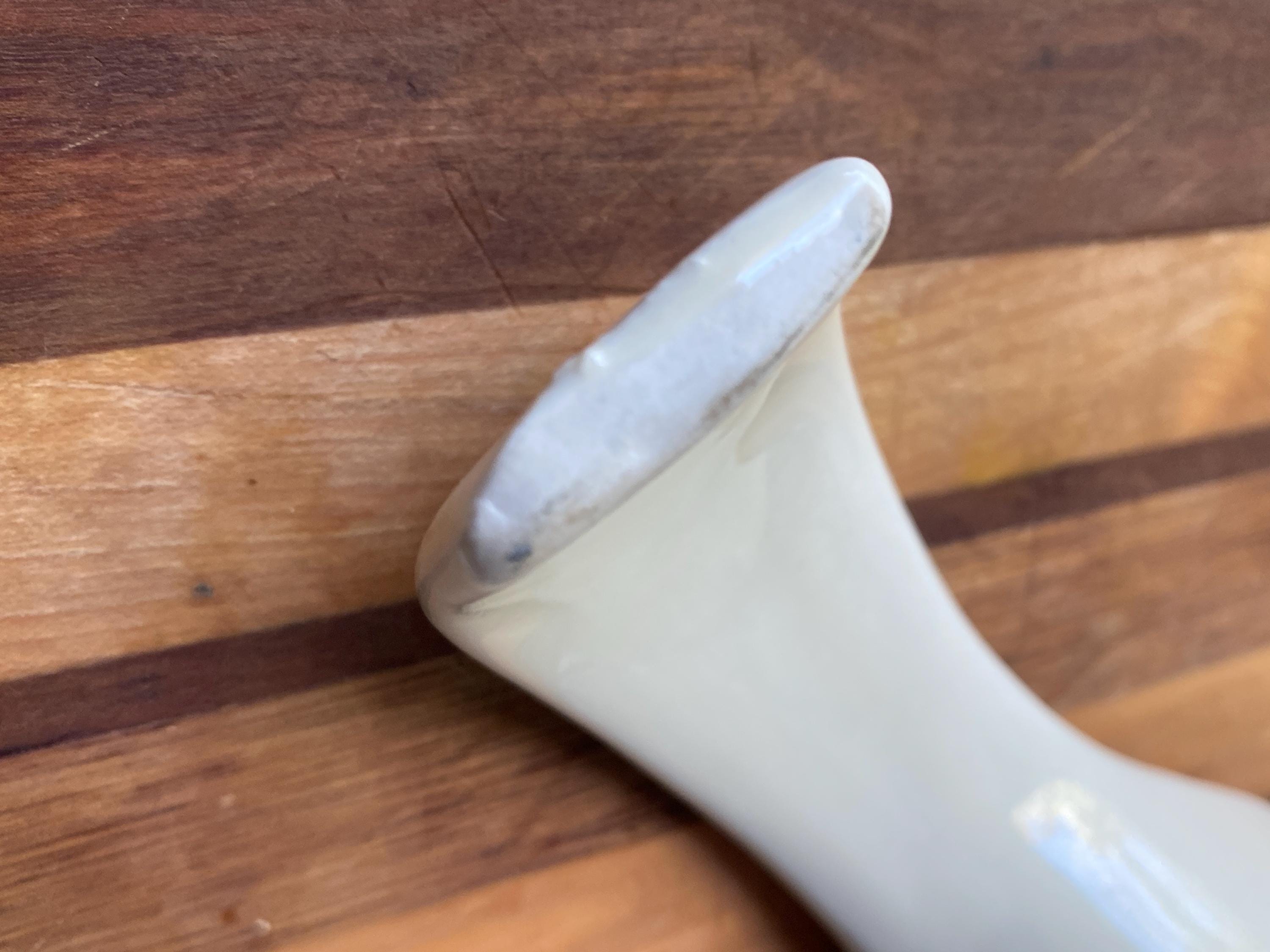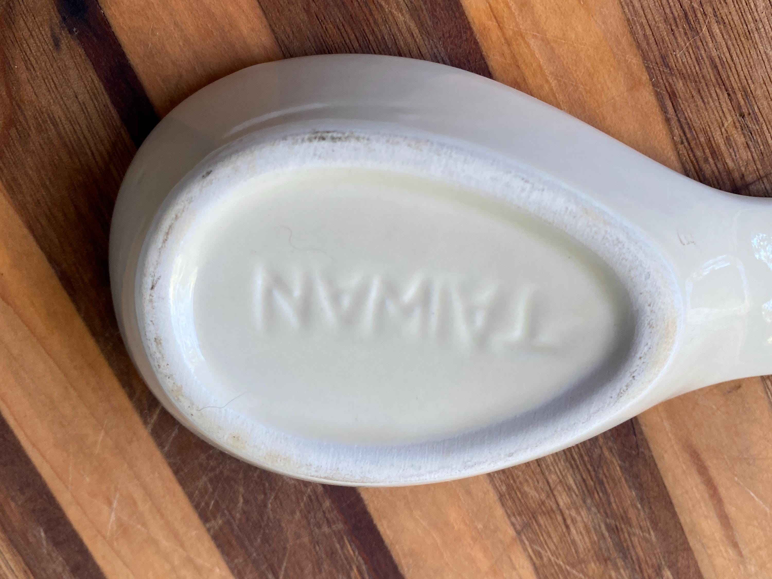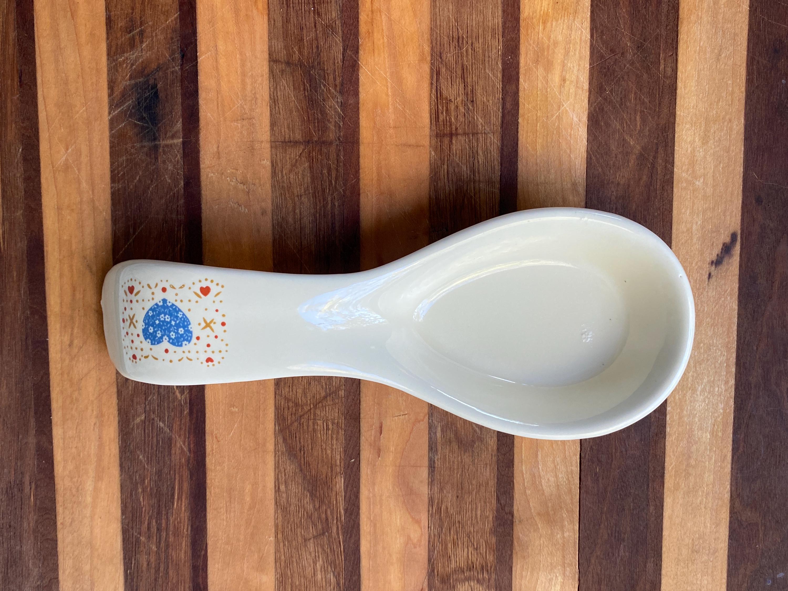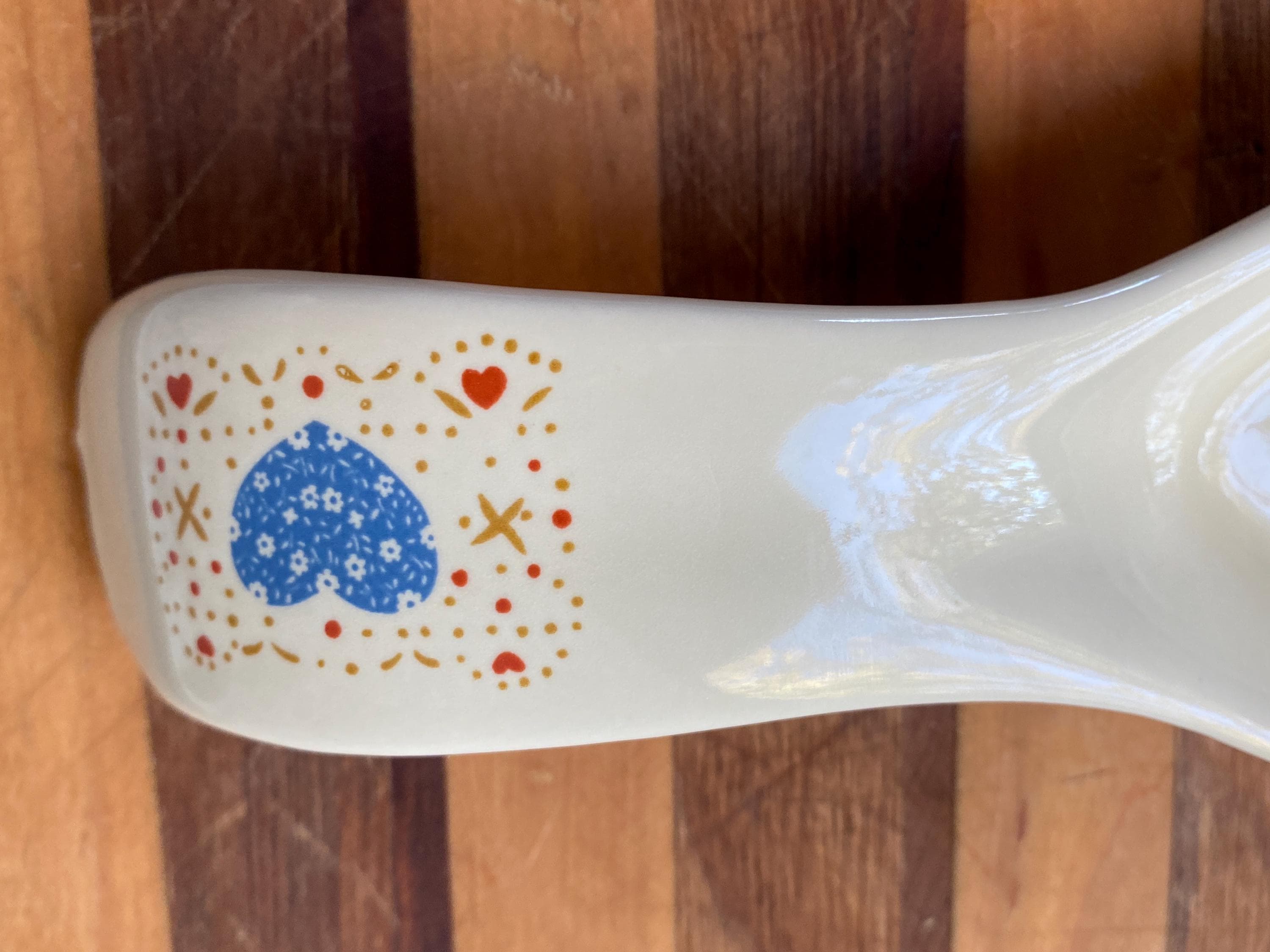 Perfect for a vintage country style kitchen with its little blue heart pattern. 8X3 inches. Some rubbing on bottom. Top edge has manufacture/ glaze imperfections/ see last two photos.