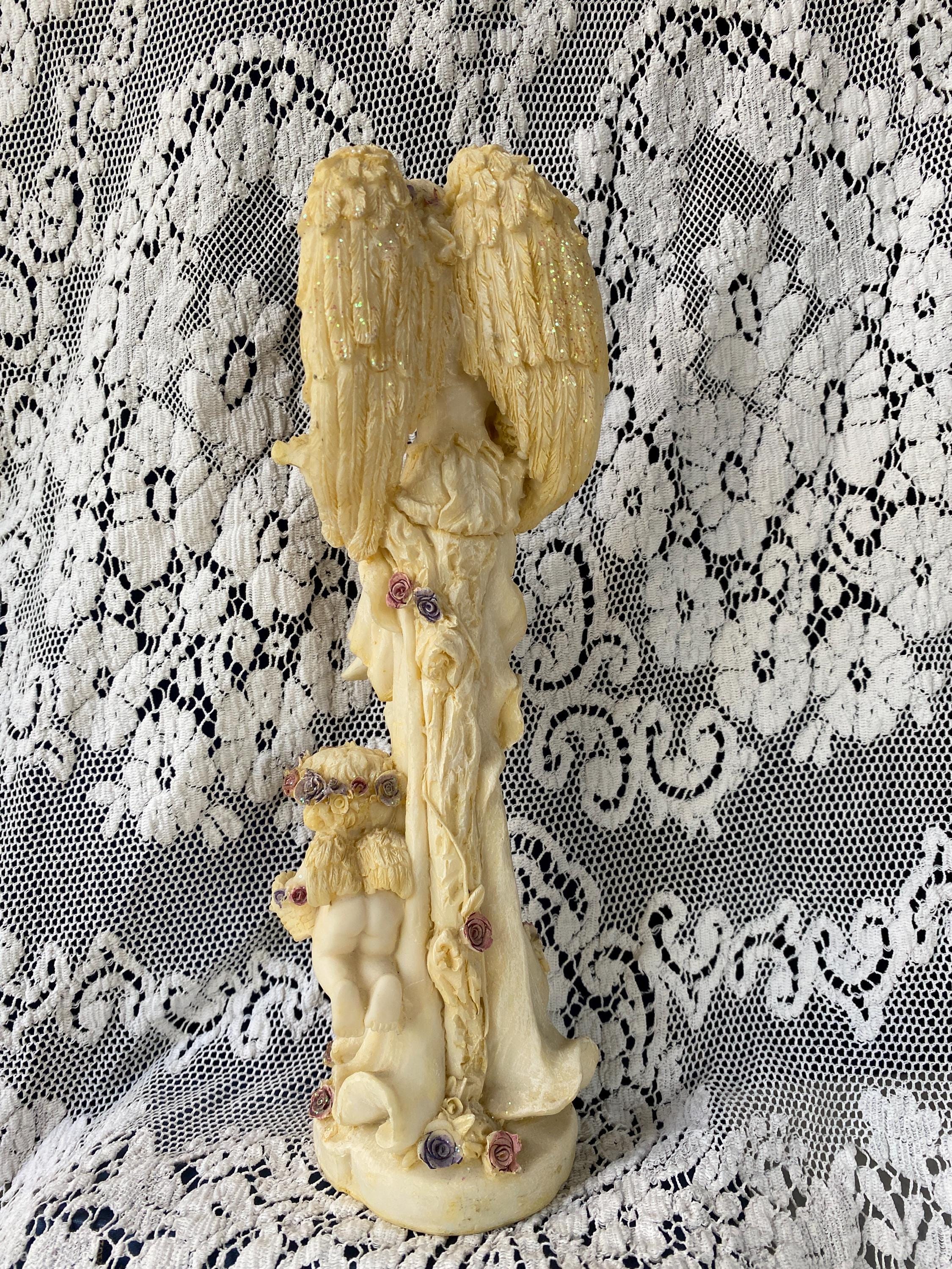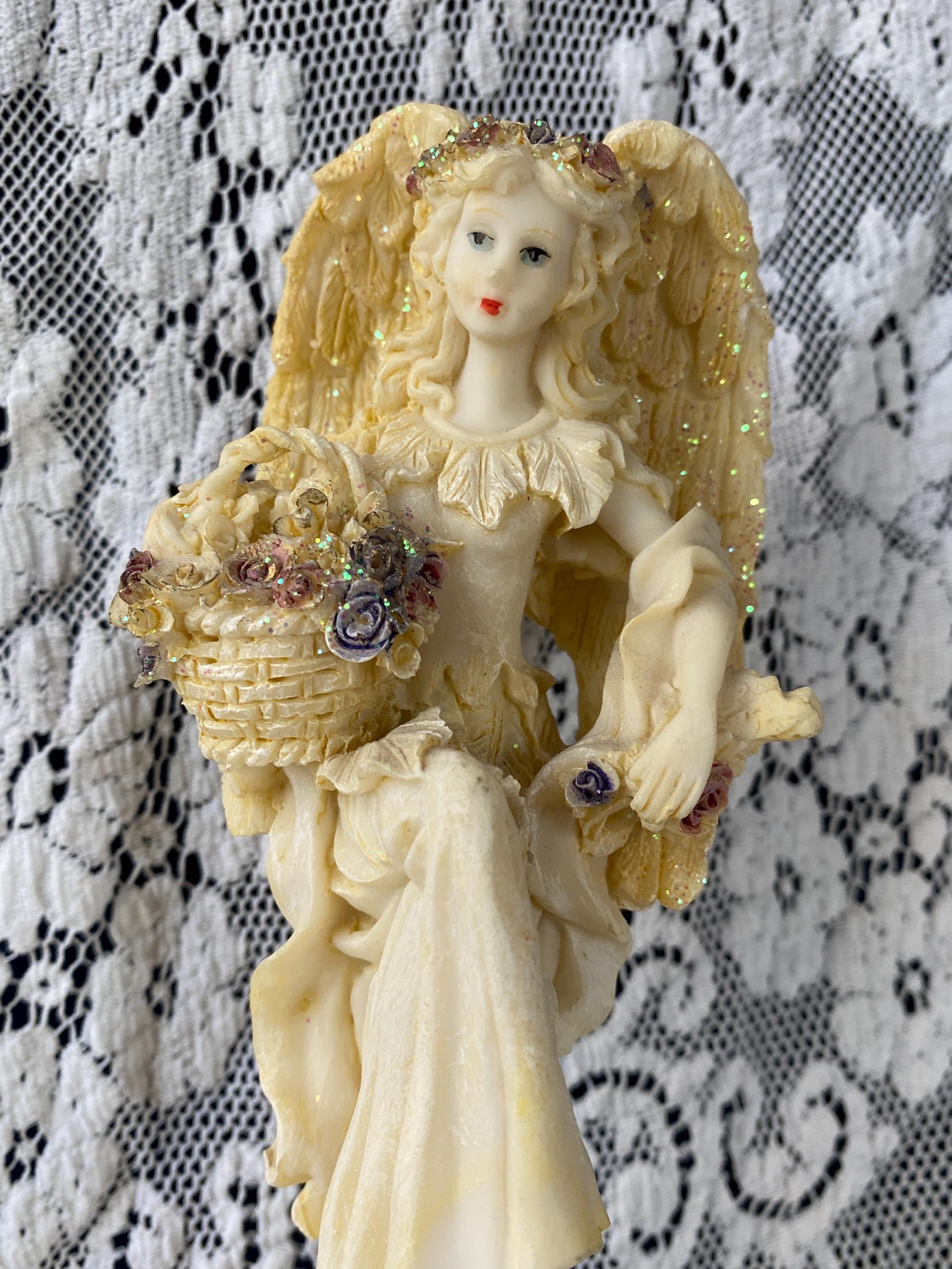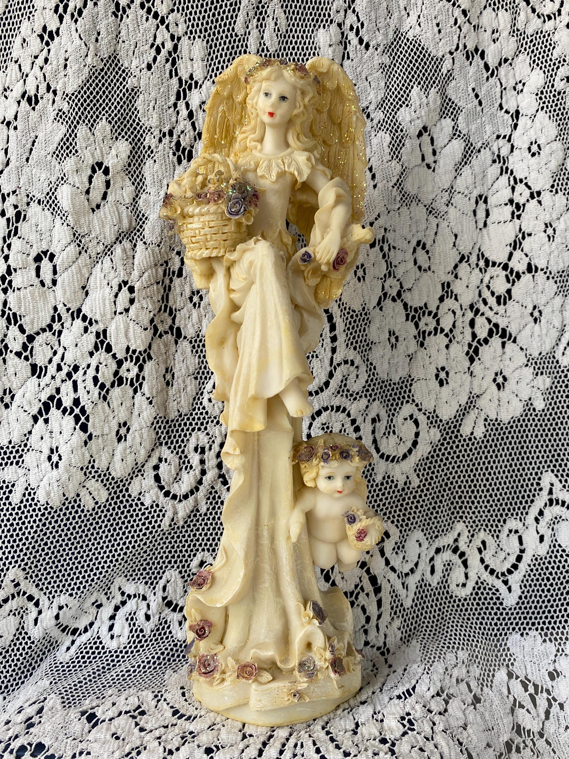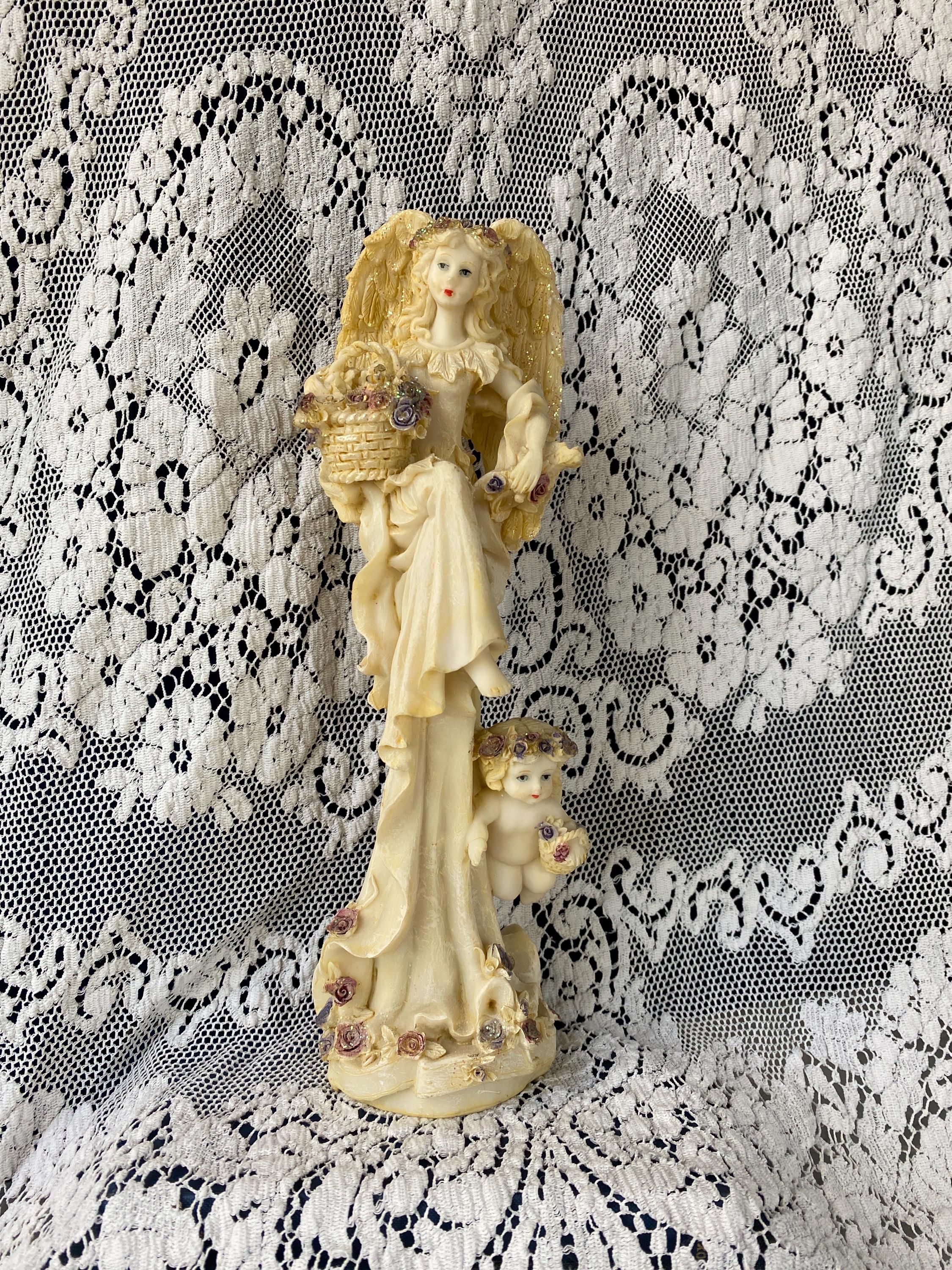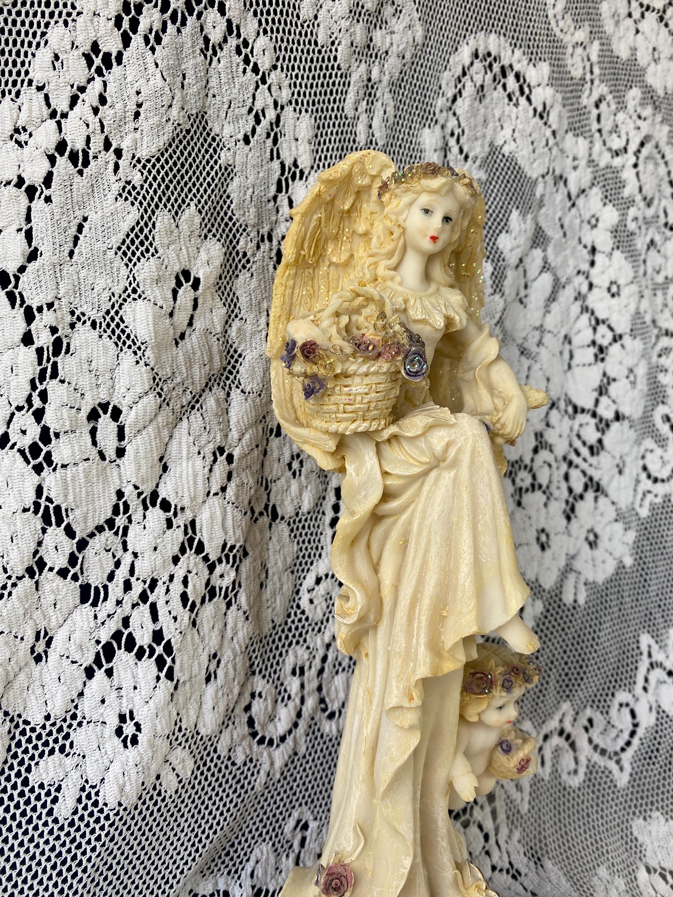 This pretty angel with glittery wings is made of cream colored resin, holds a basket of flowers, and is joined by a little cherub. Some rough spots/ chips on bottom along edge/ see last photo. 3X2X9.5 inches.