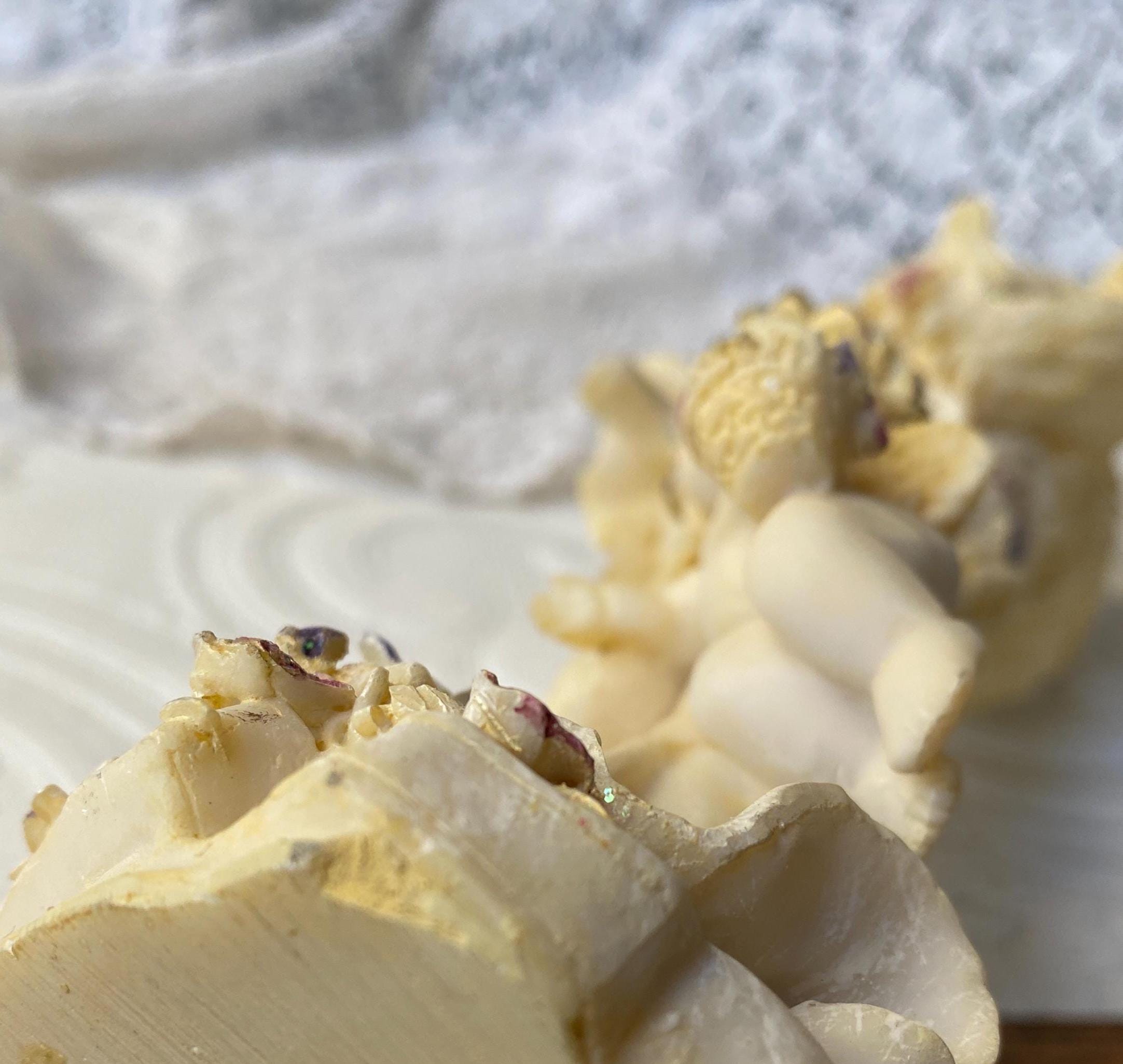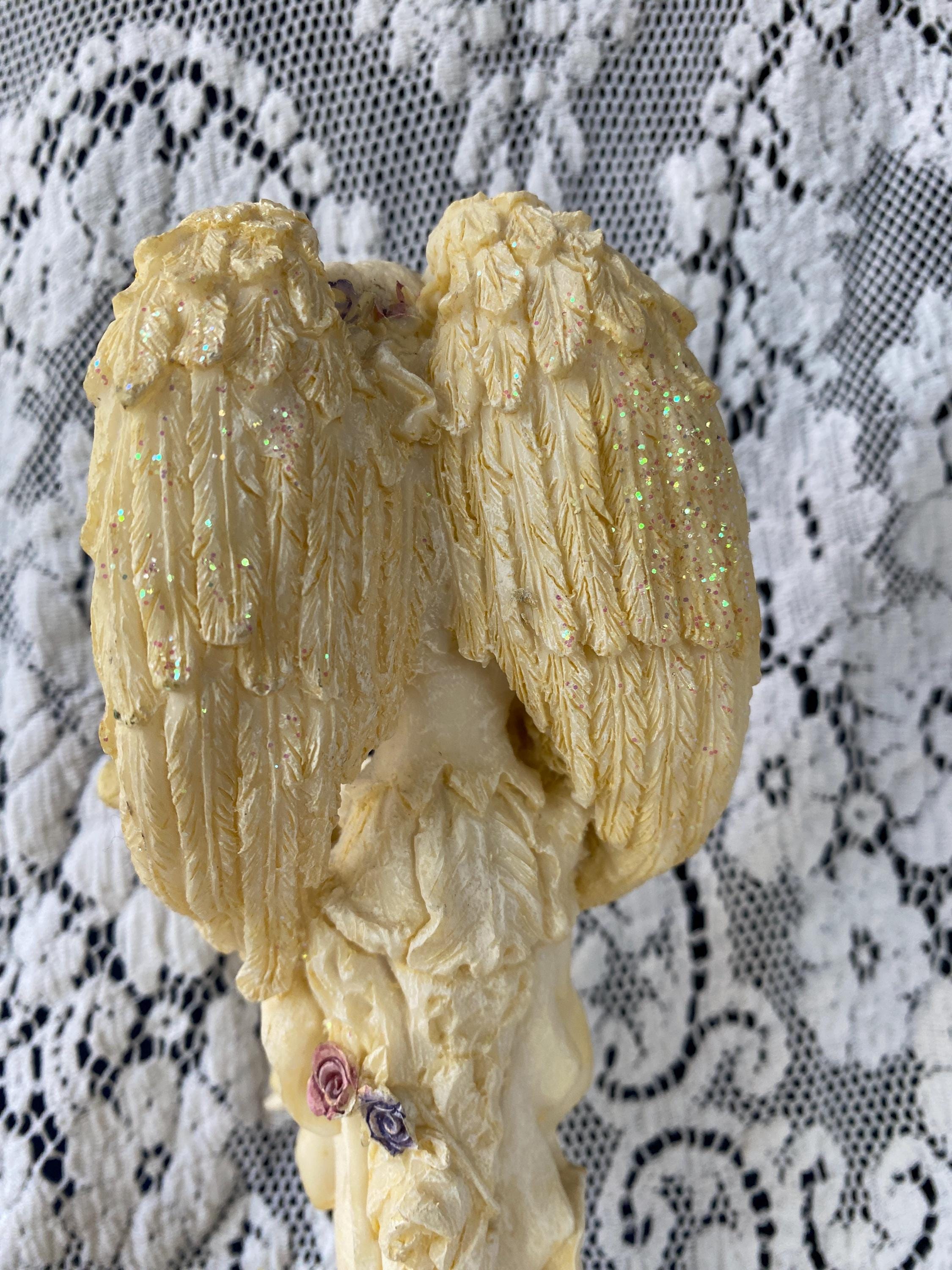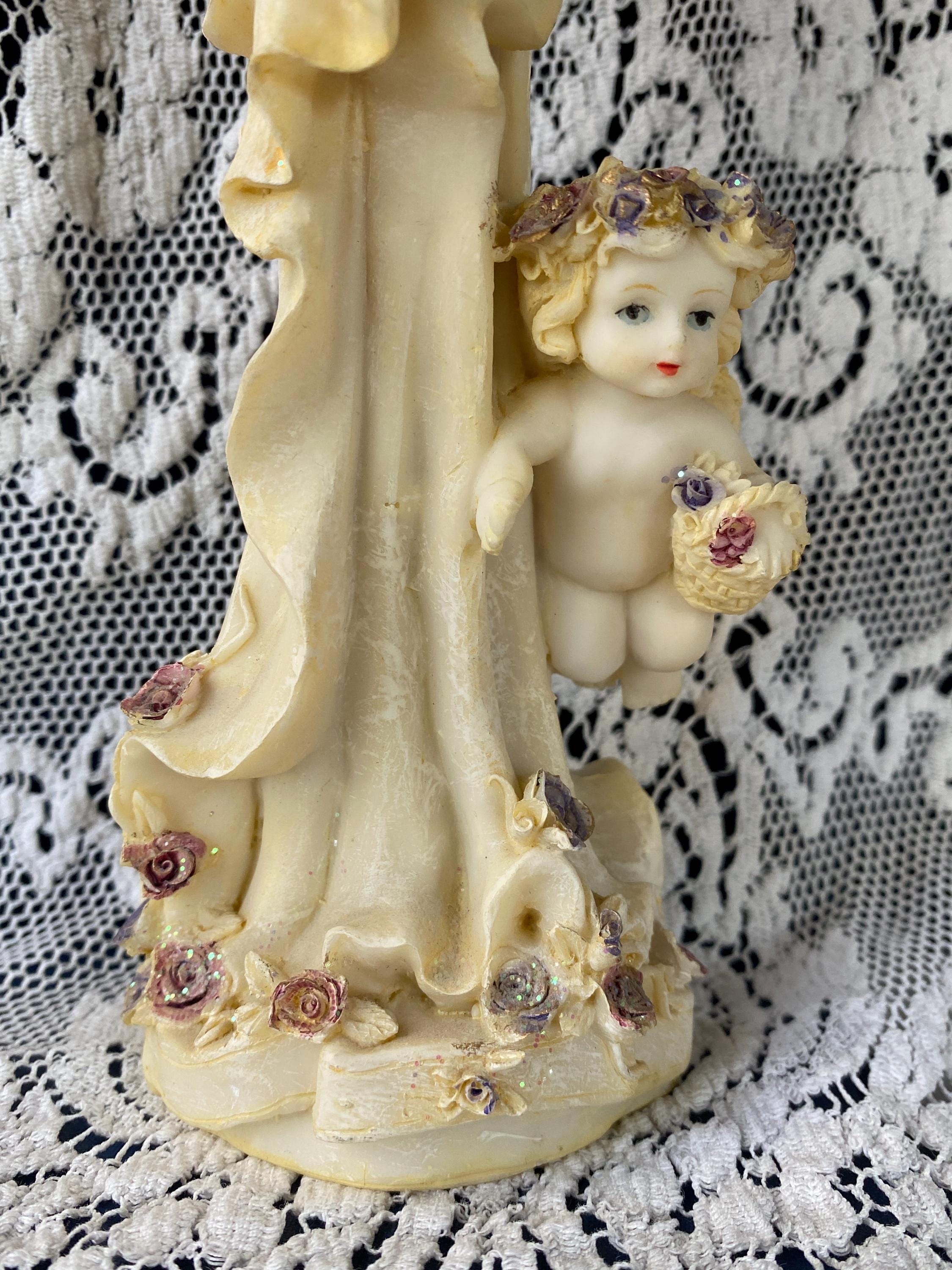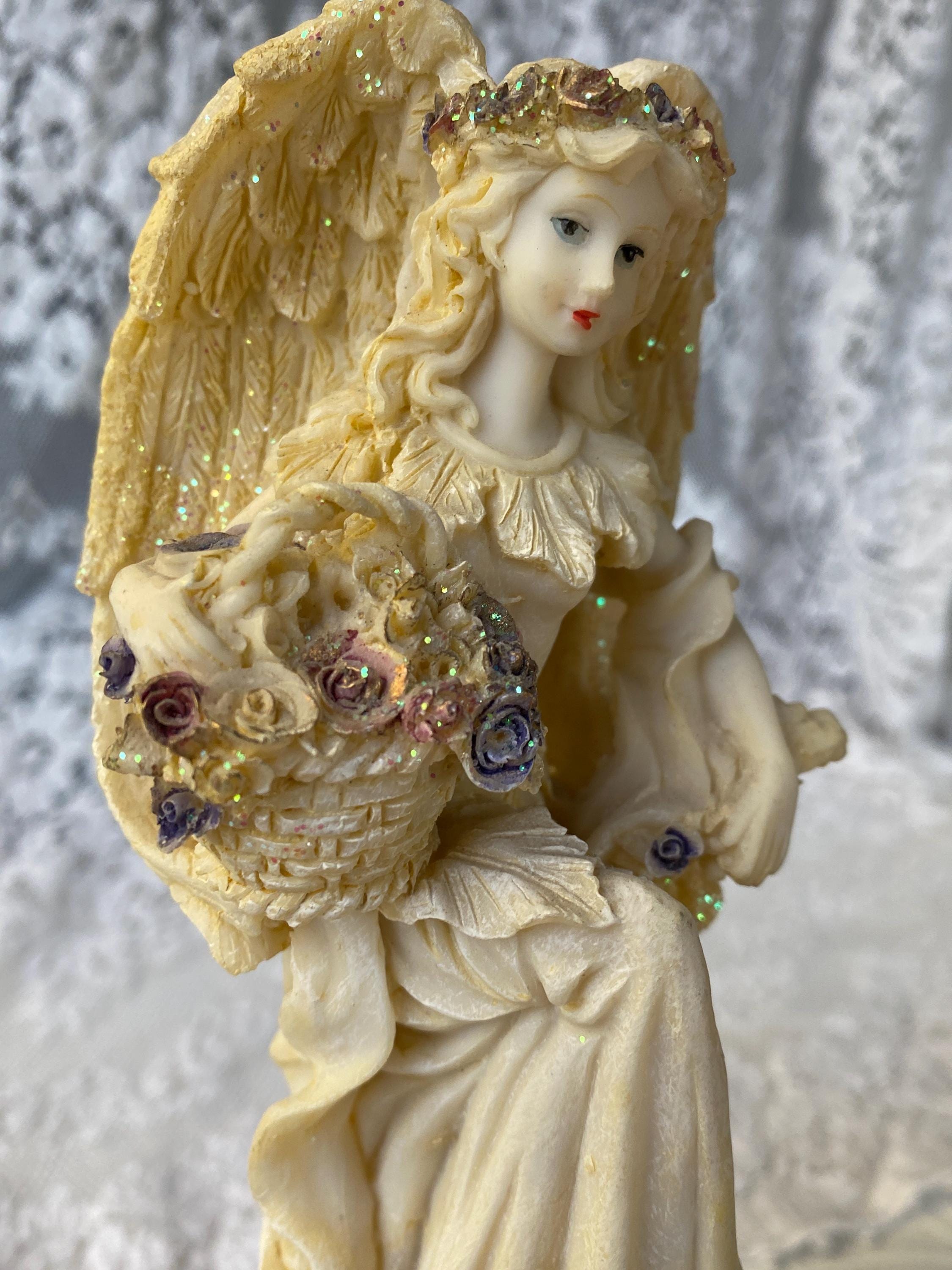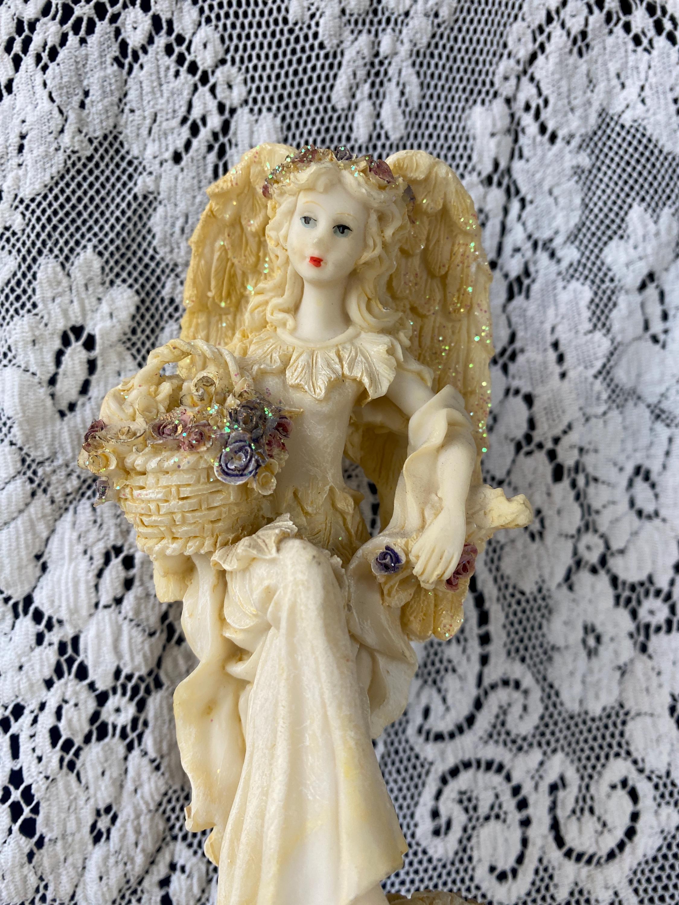 This pretty angel with glittery wings is made of cream colored resin, holds a basket of flowers, and is joined by a little cherub. Some rough spots/ chips on bottom along edge/ see last photo. 3X2X9.5 inches.