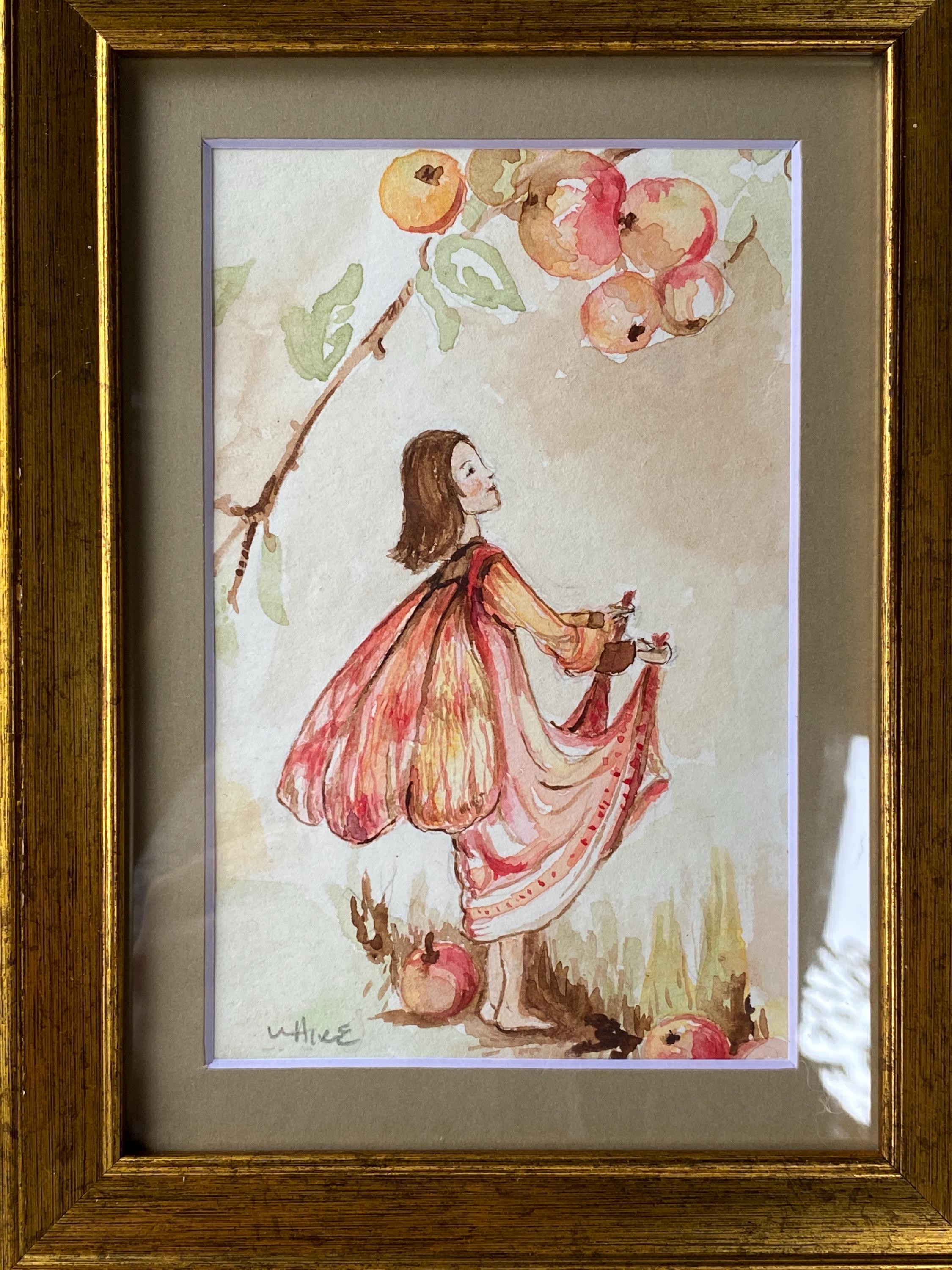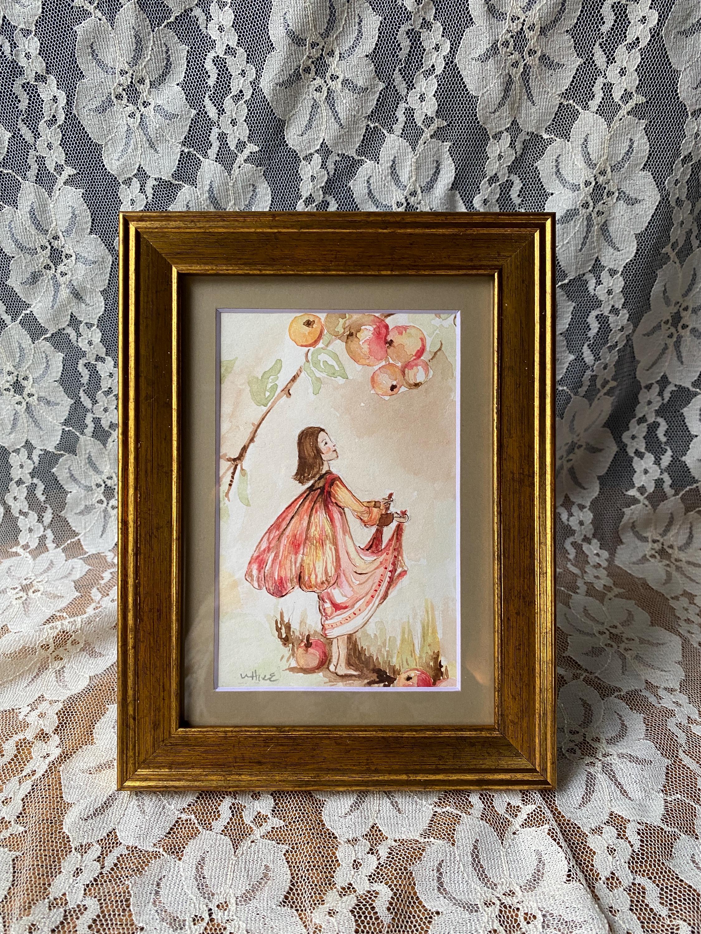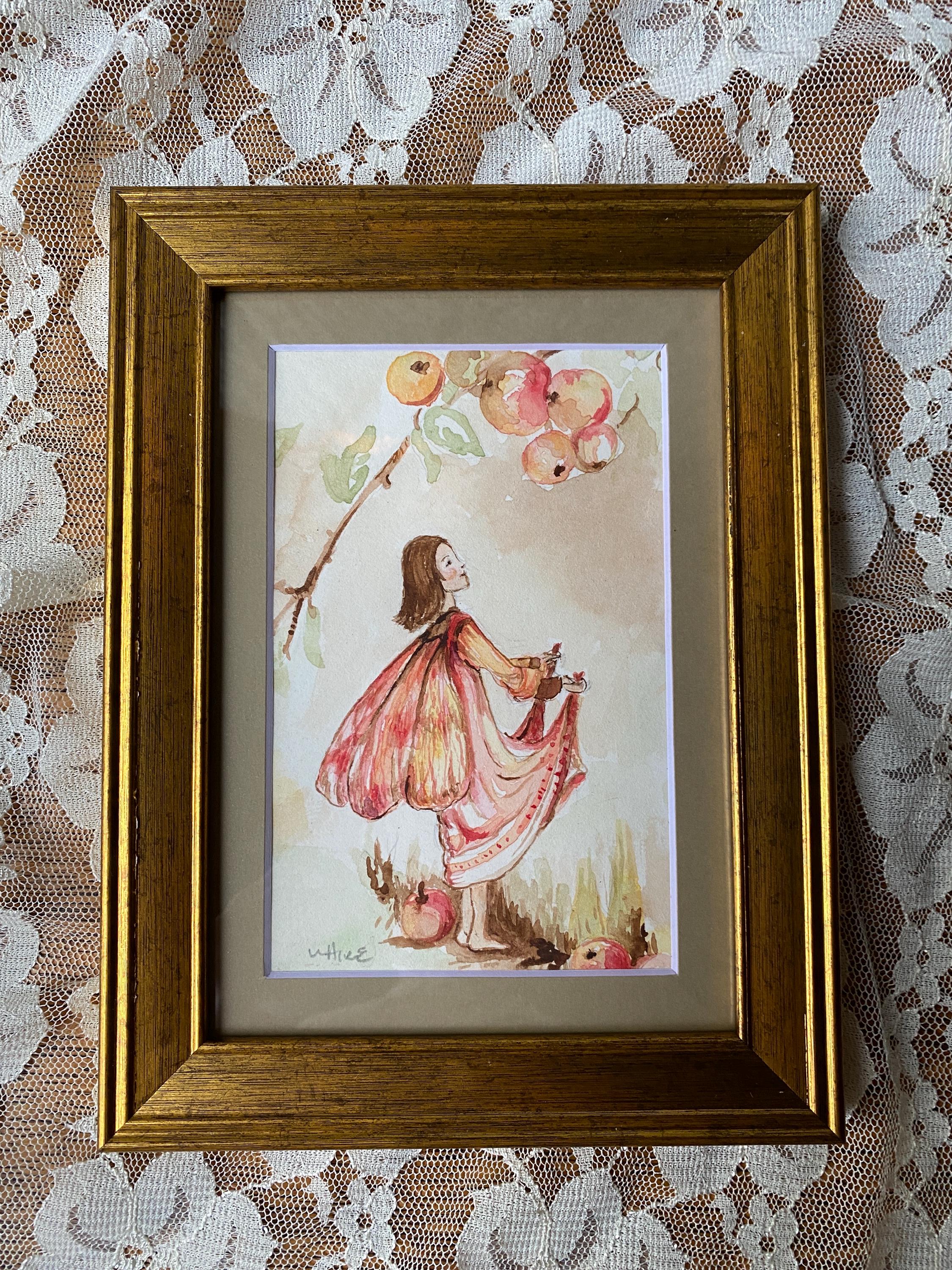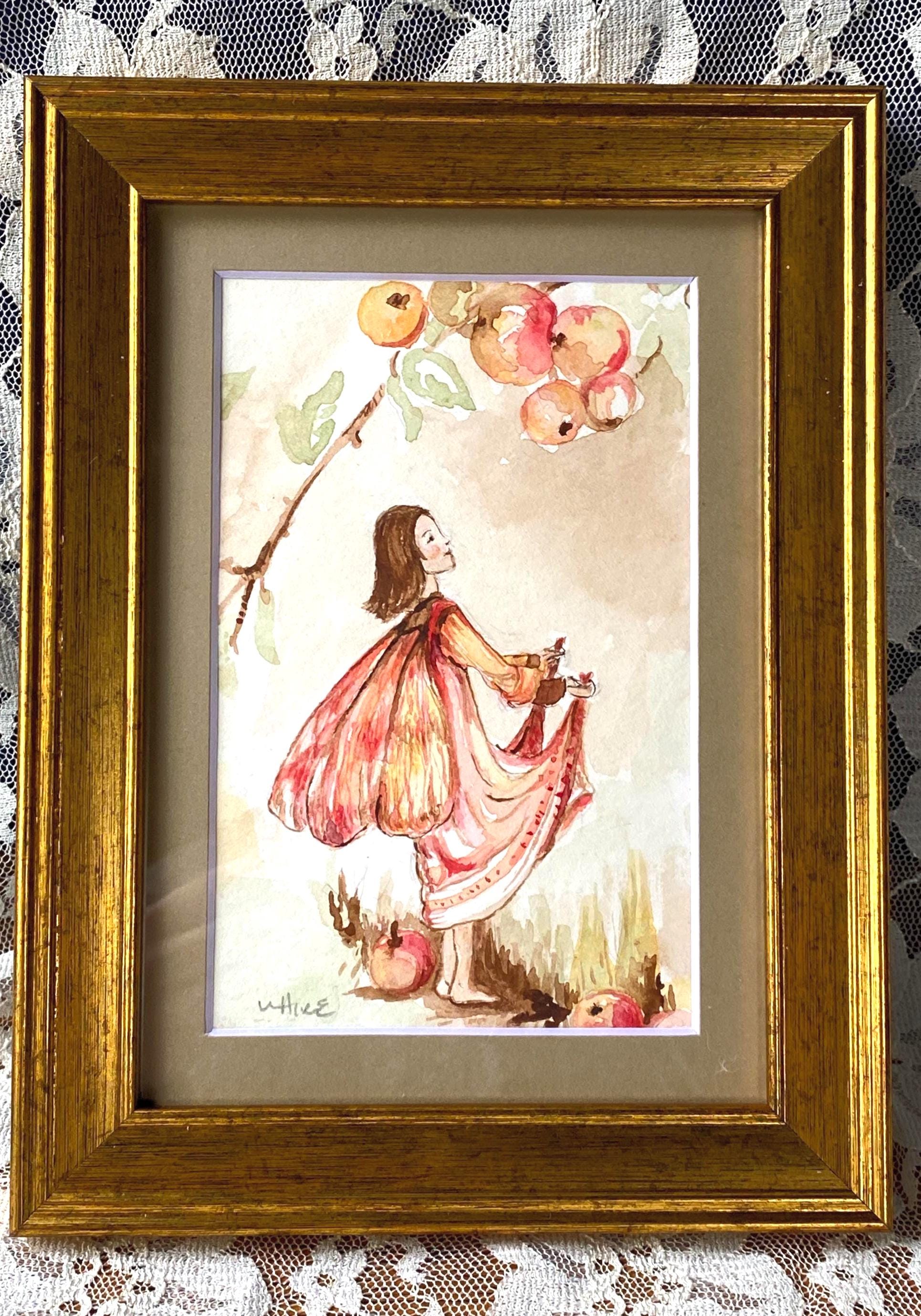 Inspired by the work of Cicely Mary Barker, this adorable little fairy is dressed in autumn colors and is busy gathering apples. I really enjoyed painting this and hope you love it too! She comes in a vintage style (lightweight) gold frame, 5X7 inches.