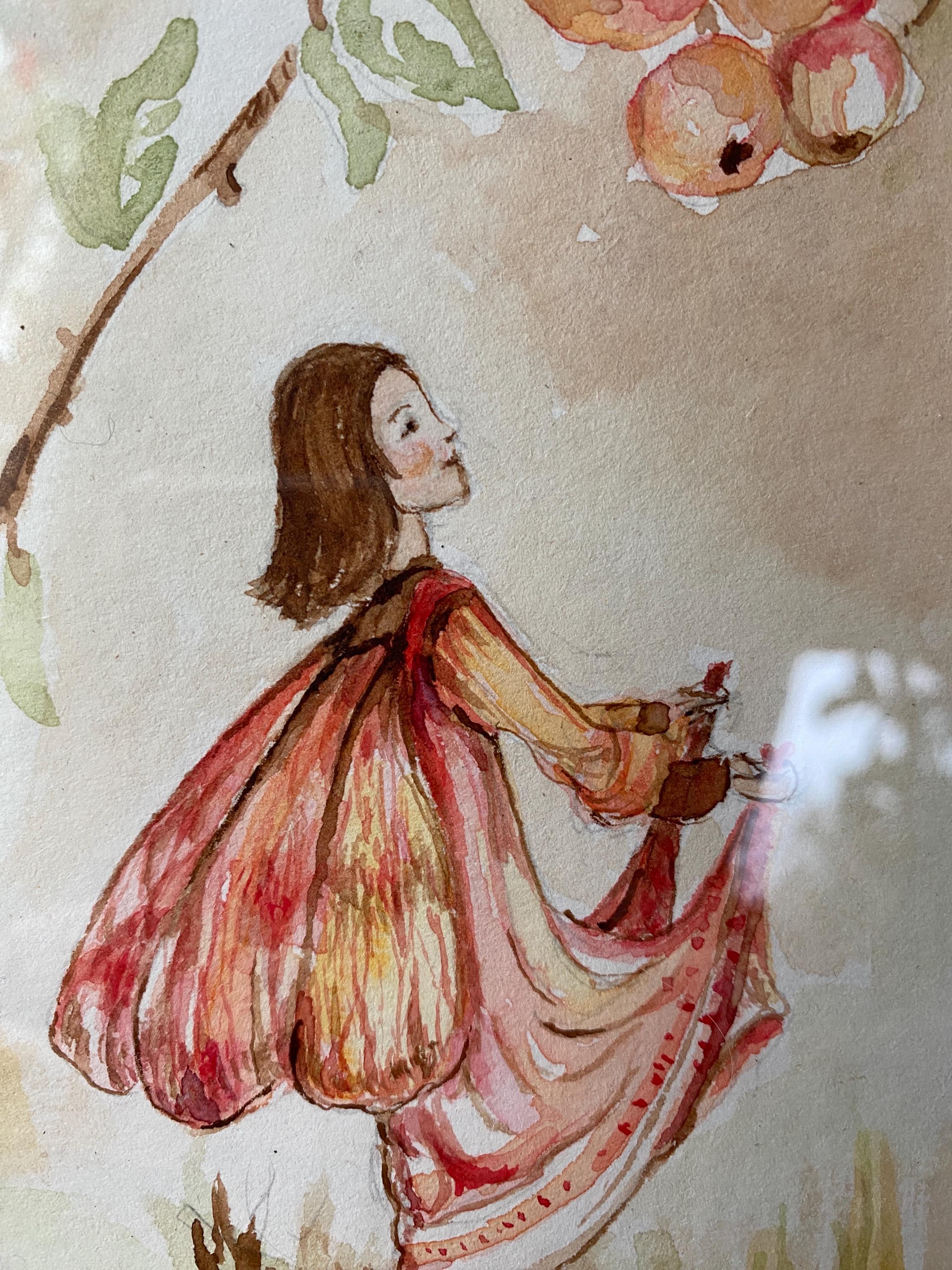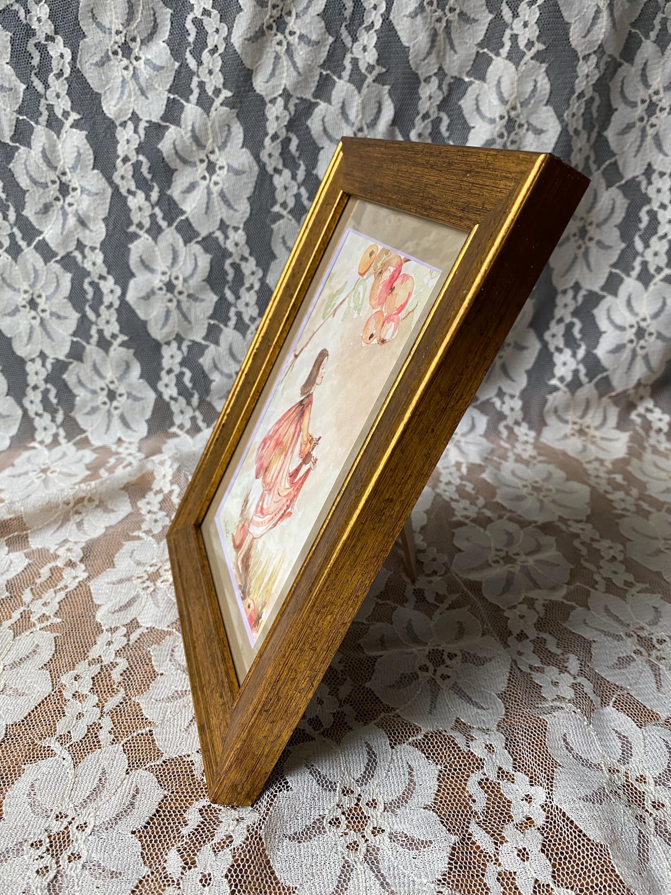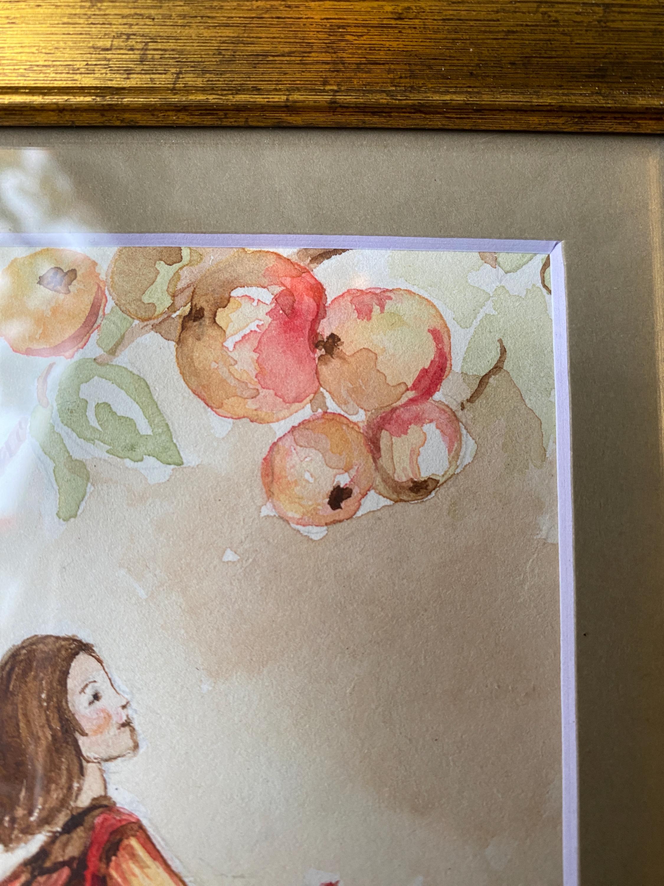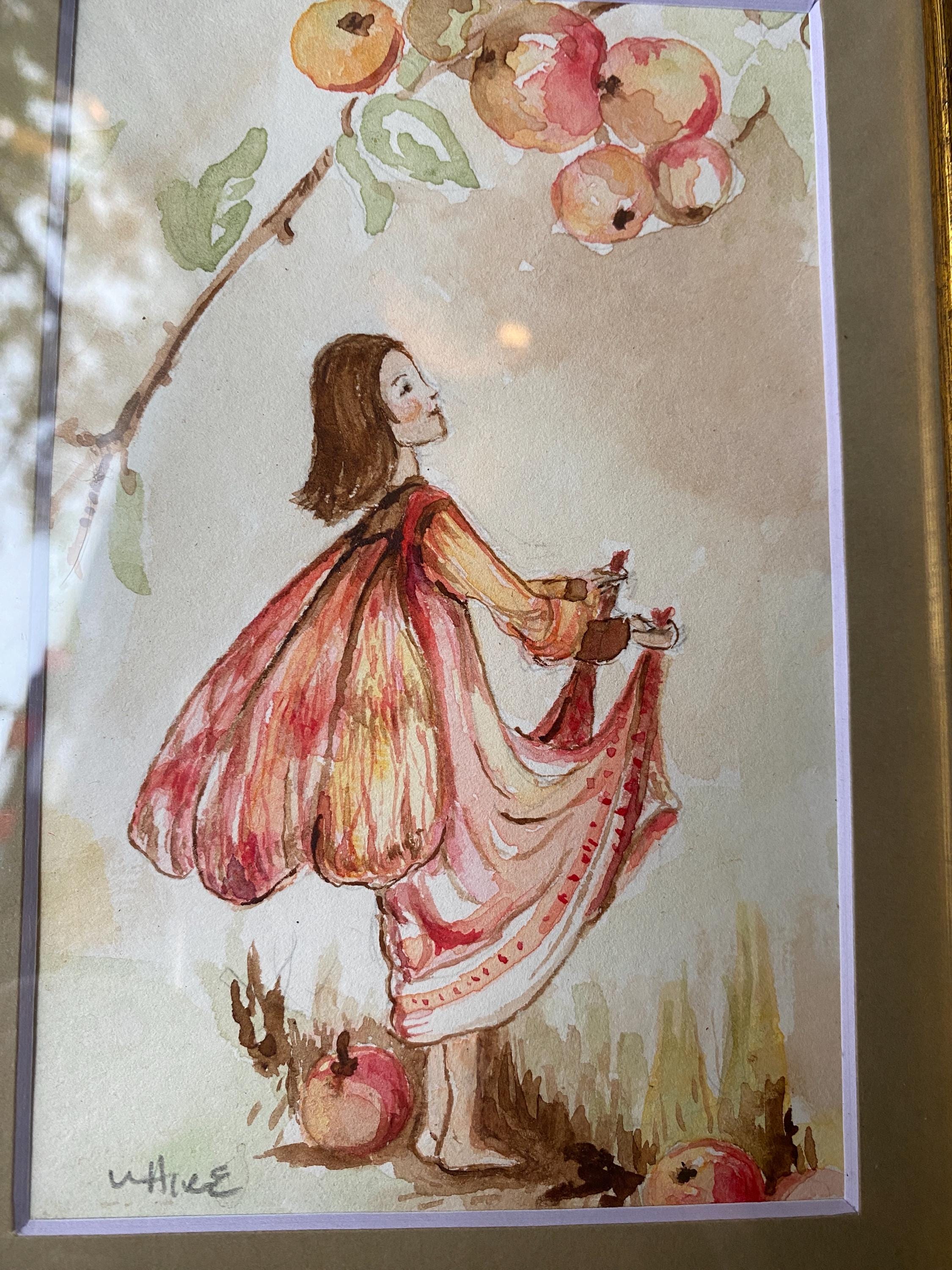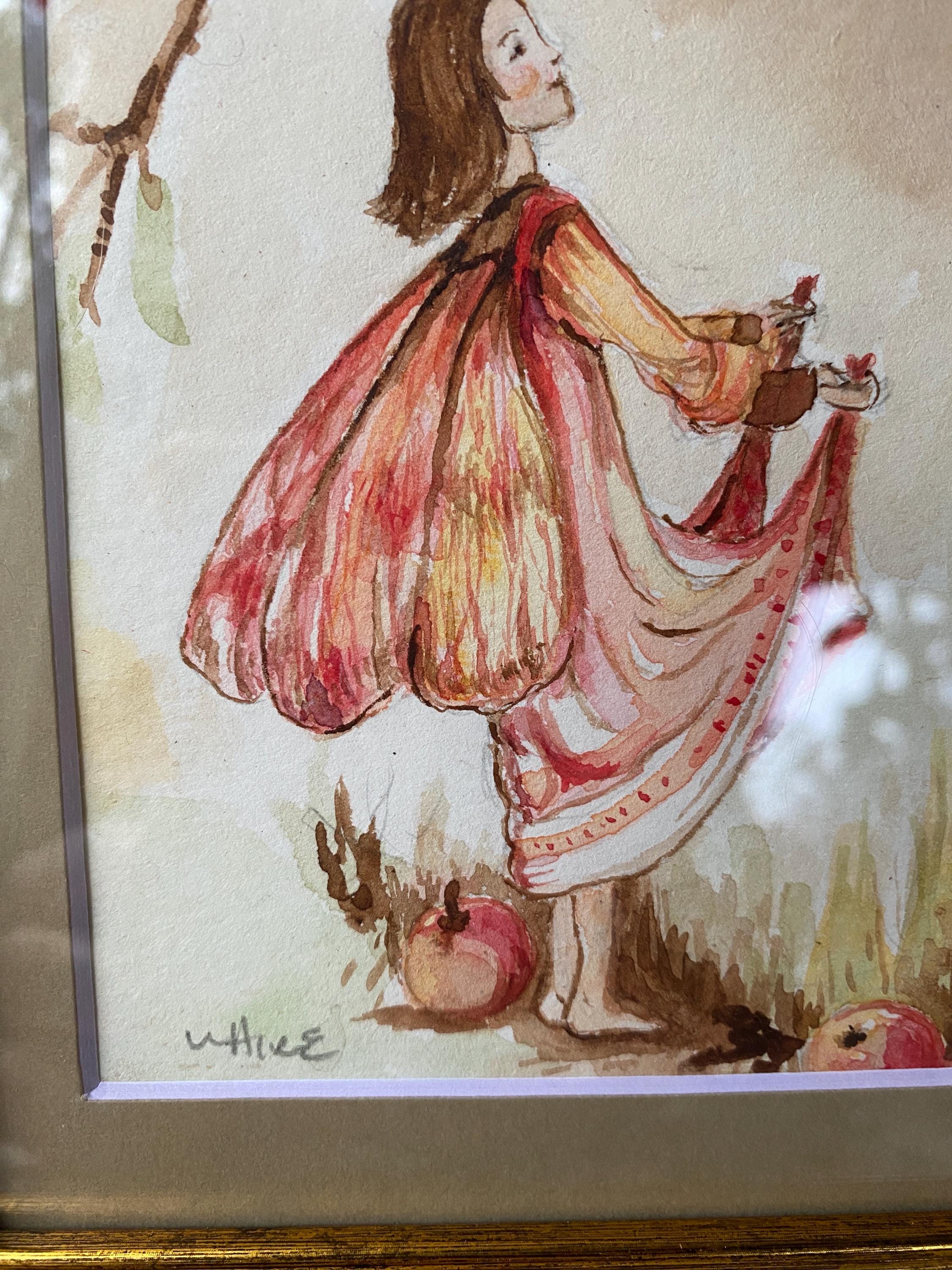 Inspired by the work of Cicely Mary Barker, this adorable little fairy is dressed in autumn colors and is busy gathering apples. I really enjoyed painting this and hope you love it too! She comes in a vintage style (lightweight) gold frame, 5X7 inches.