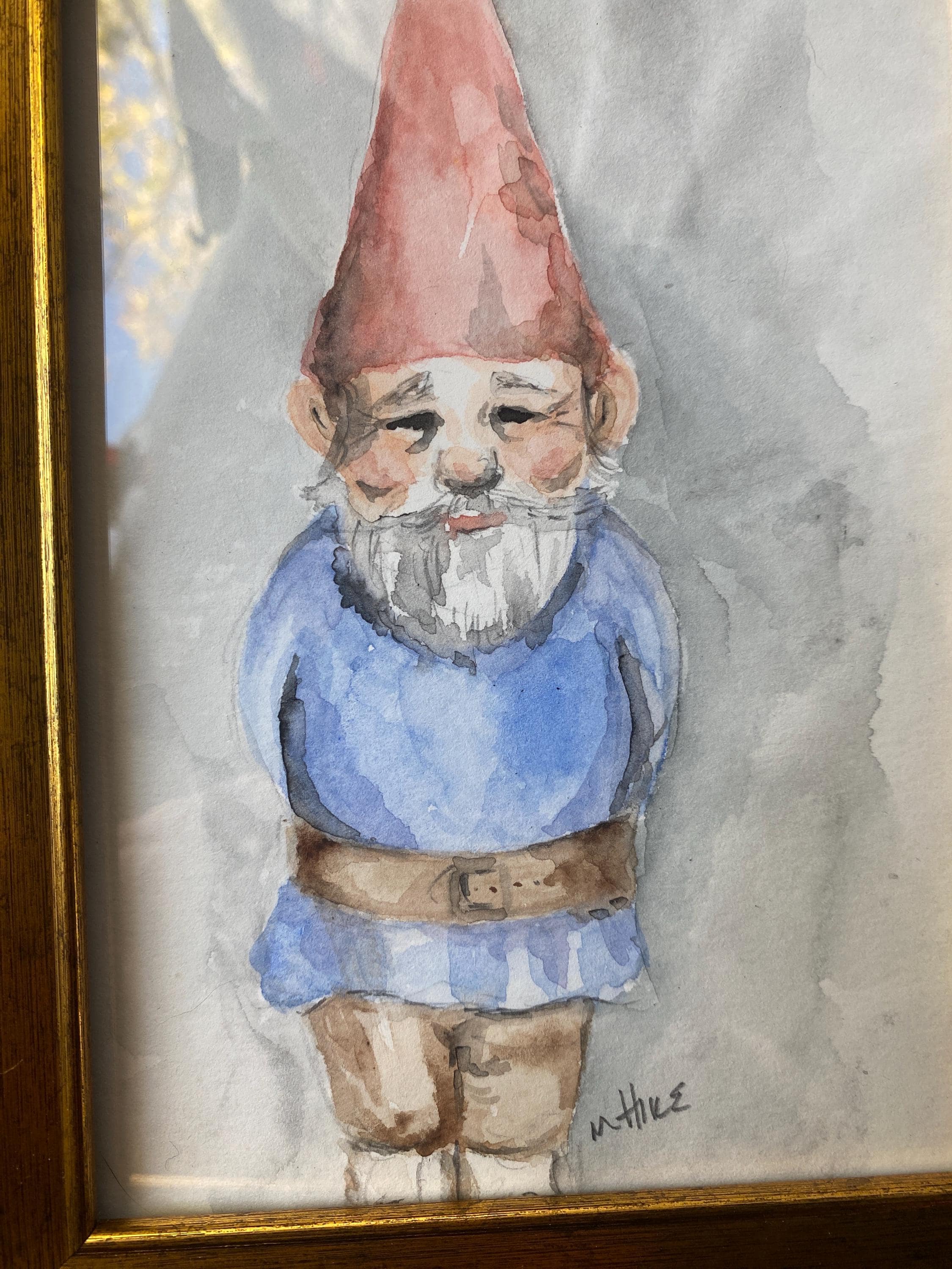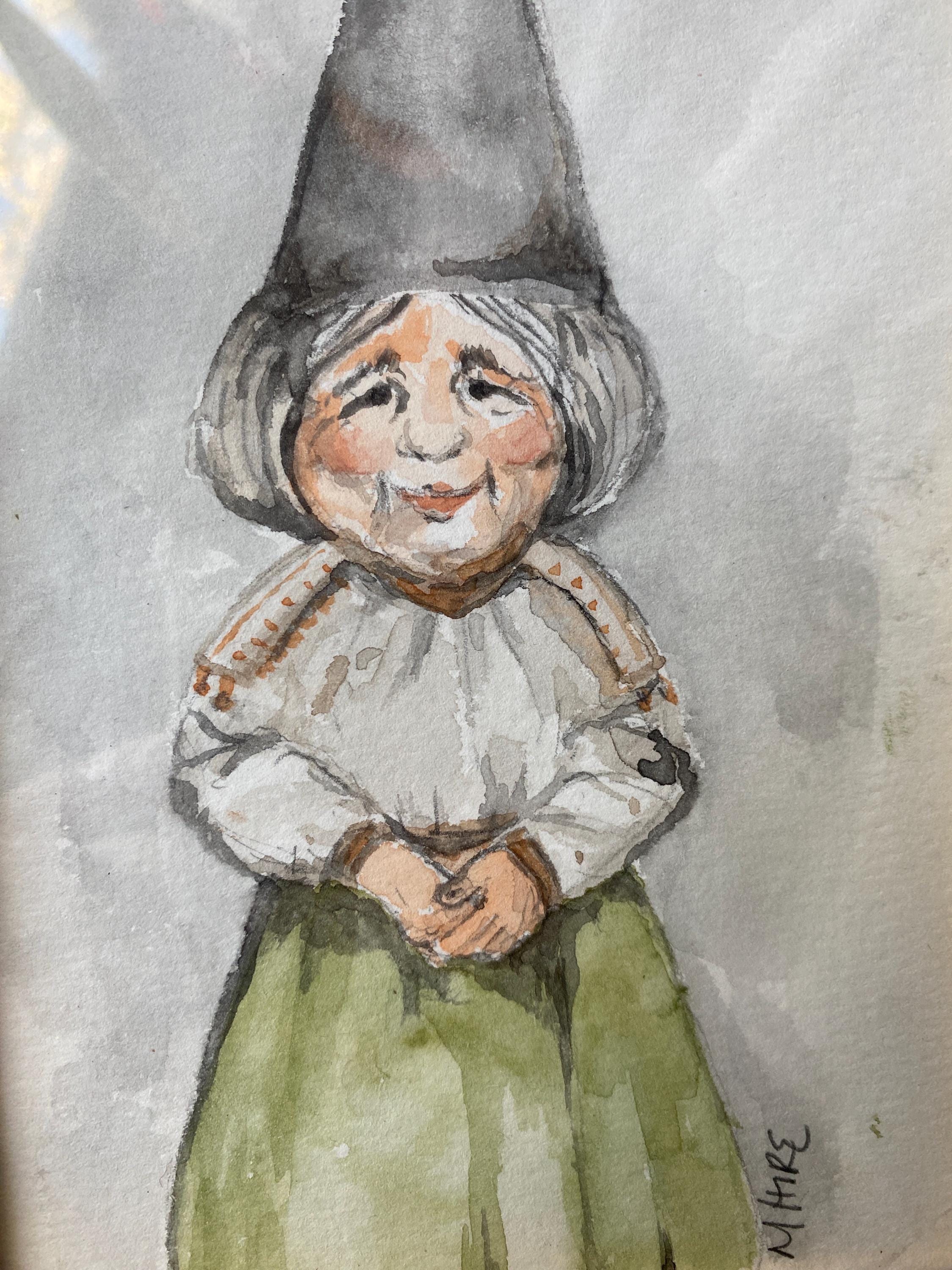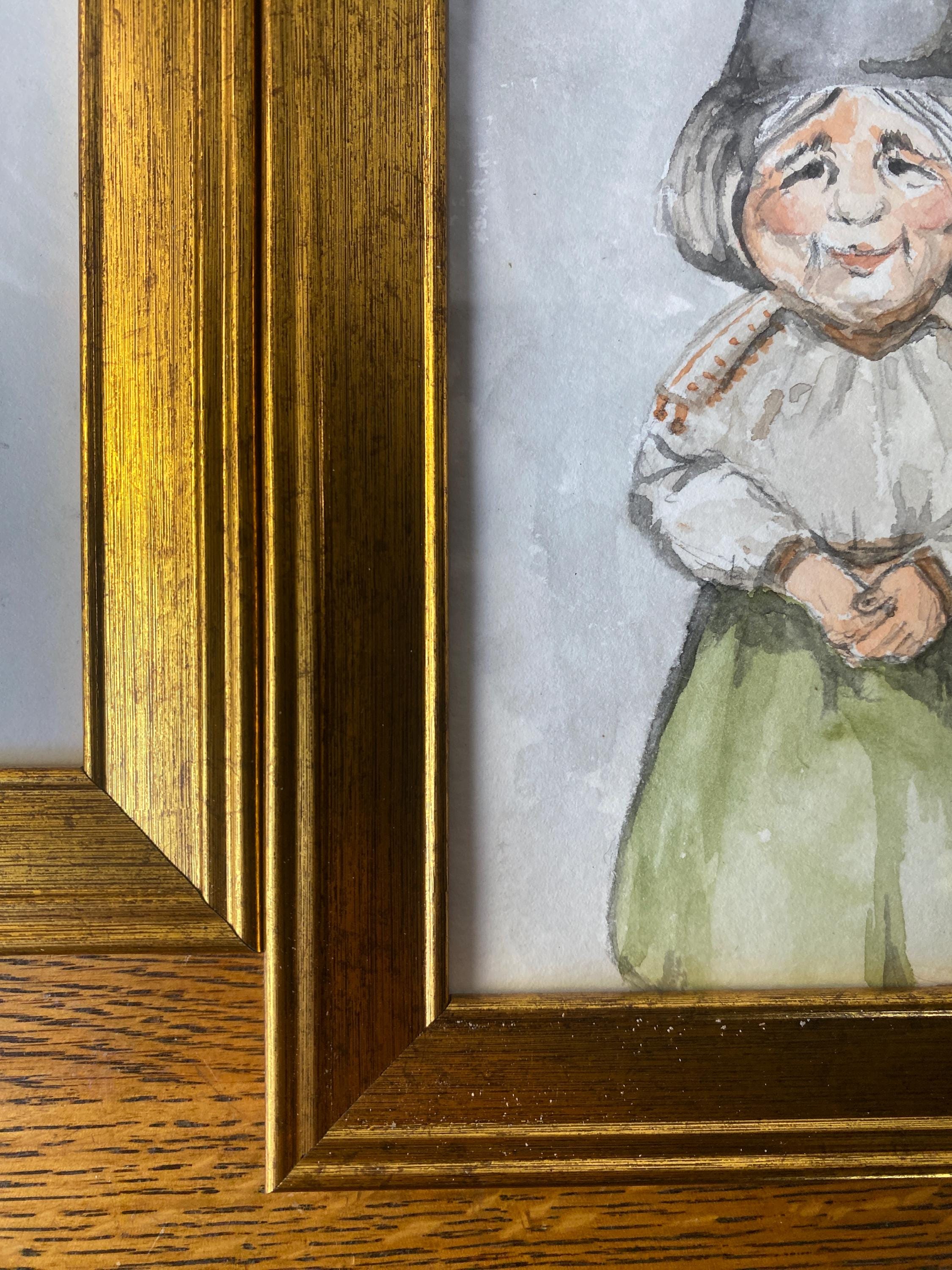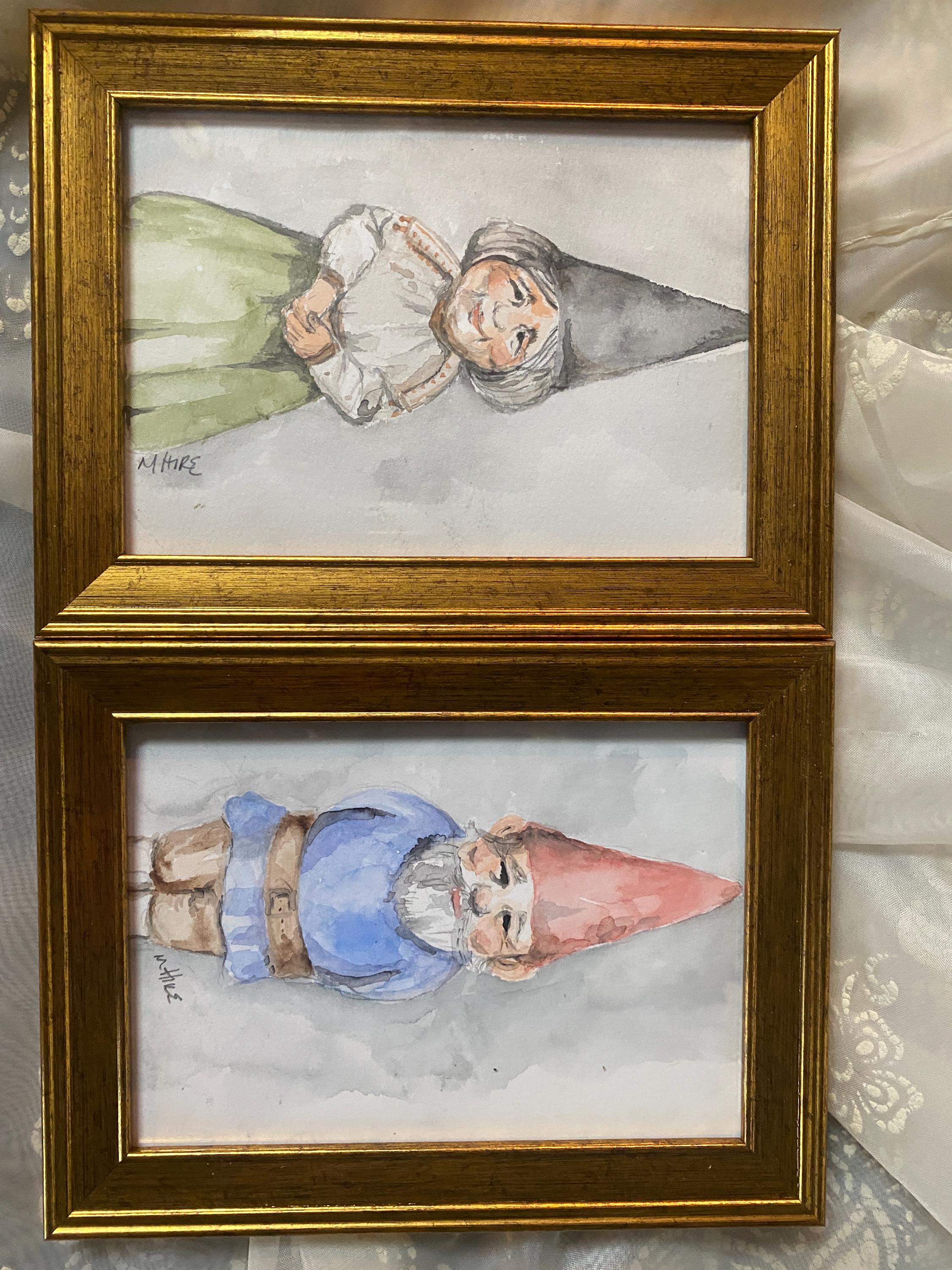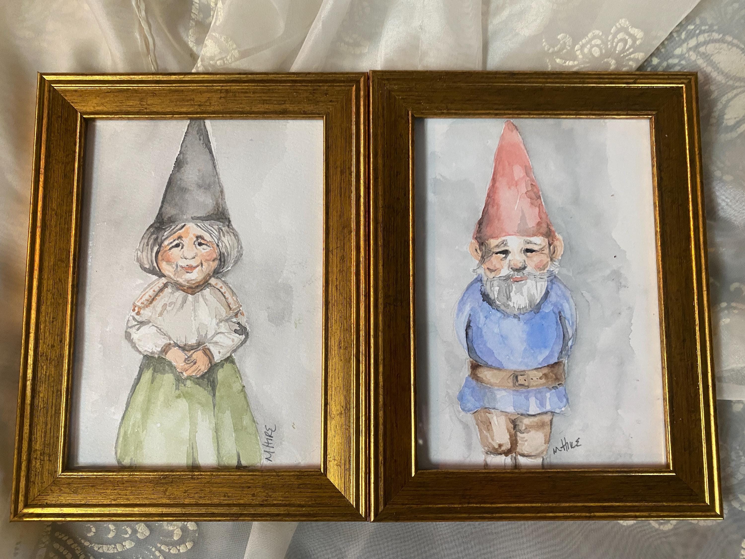 Two hand-painted, signed watercolors one of a gnome man and one of a gnome woman. Framed in vintage style (lightweight) gold frame. 5X7 inches each.