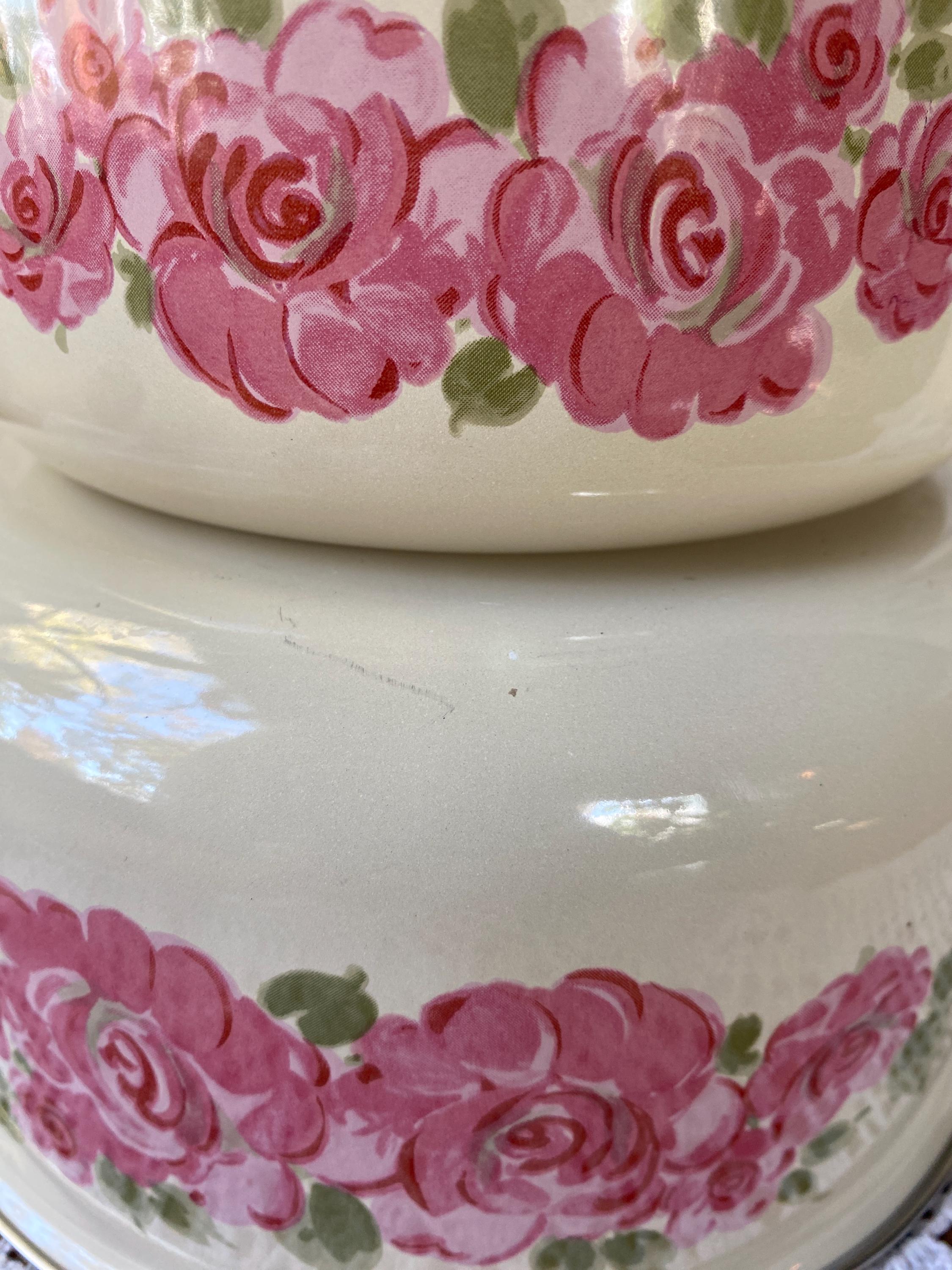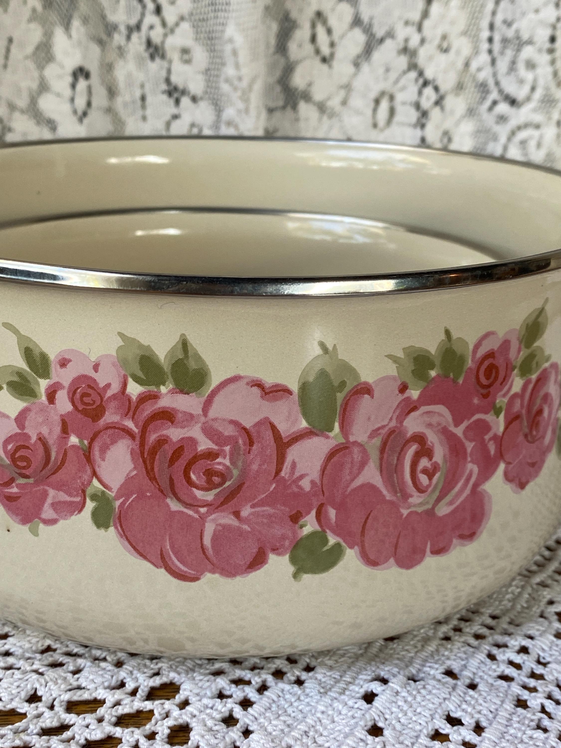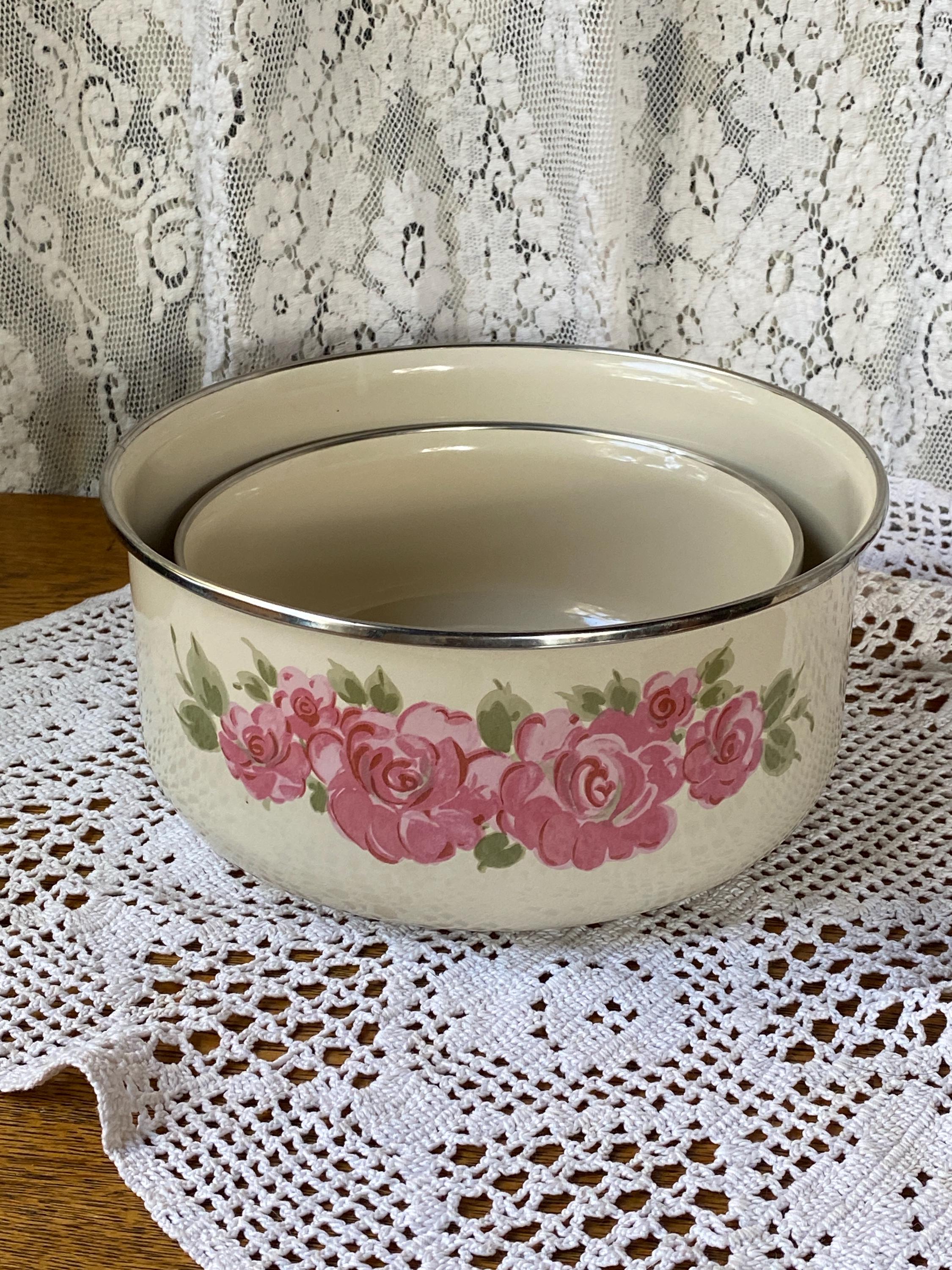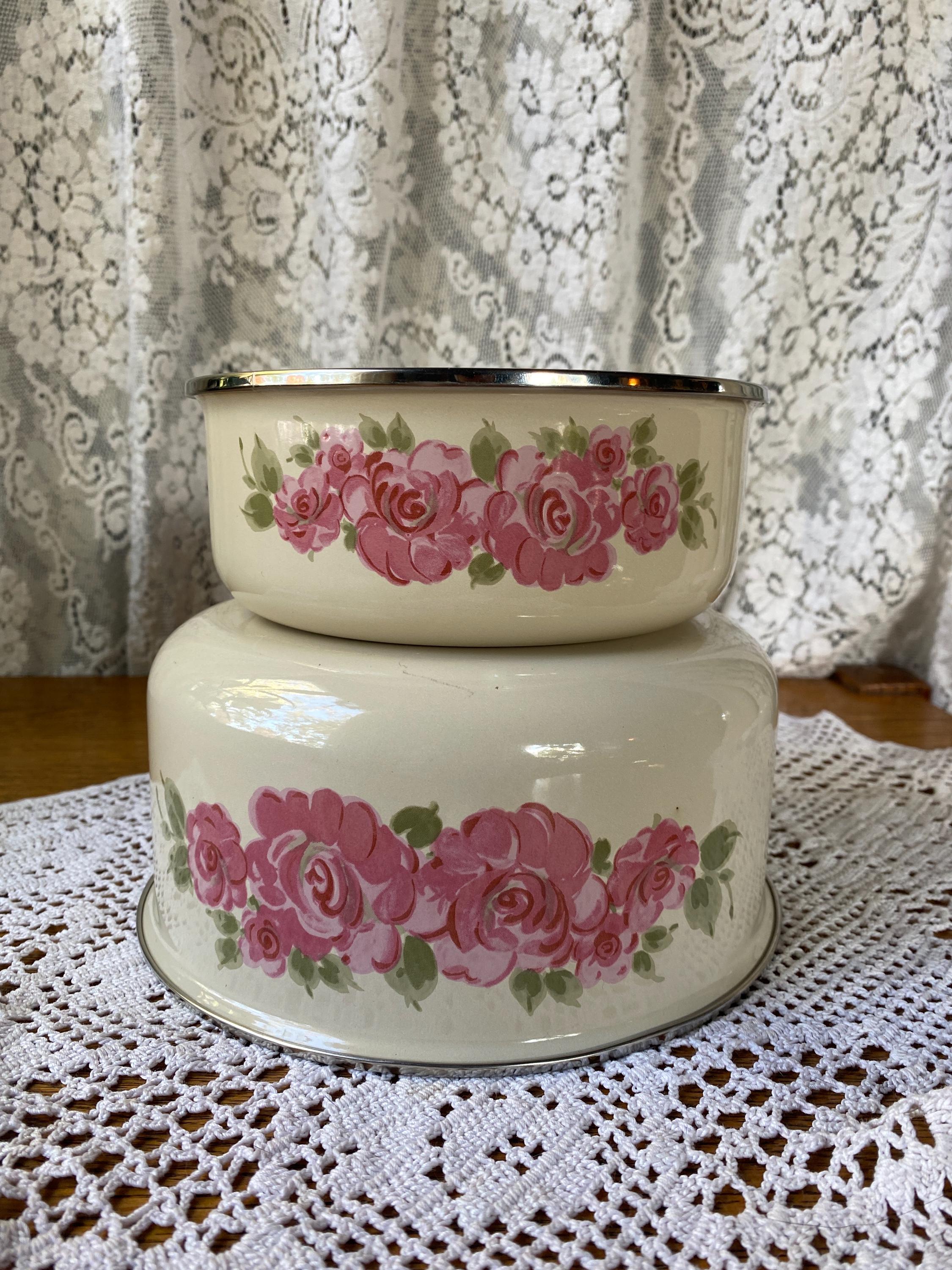 A pretty prink floral pattern on a cream background, perfect for mixing, serving, or storing. Small bowl is 6.5X2.5 inches, large bowl is 8X3 inches. Some small scratches on enamel, see last photo or example. All items in my shop are vintage or handmade and may have signs of use, wear, or variation consistent with age or hand production. Please review the photos and video carefully and message me with any questions on condition.
