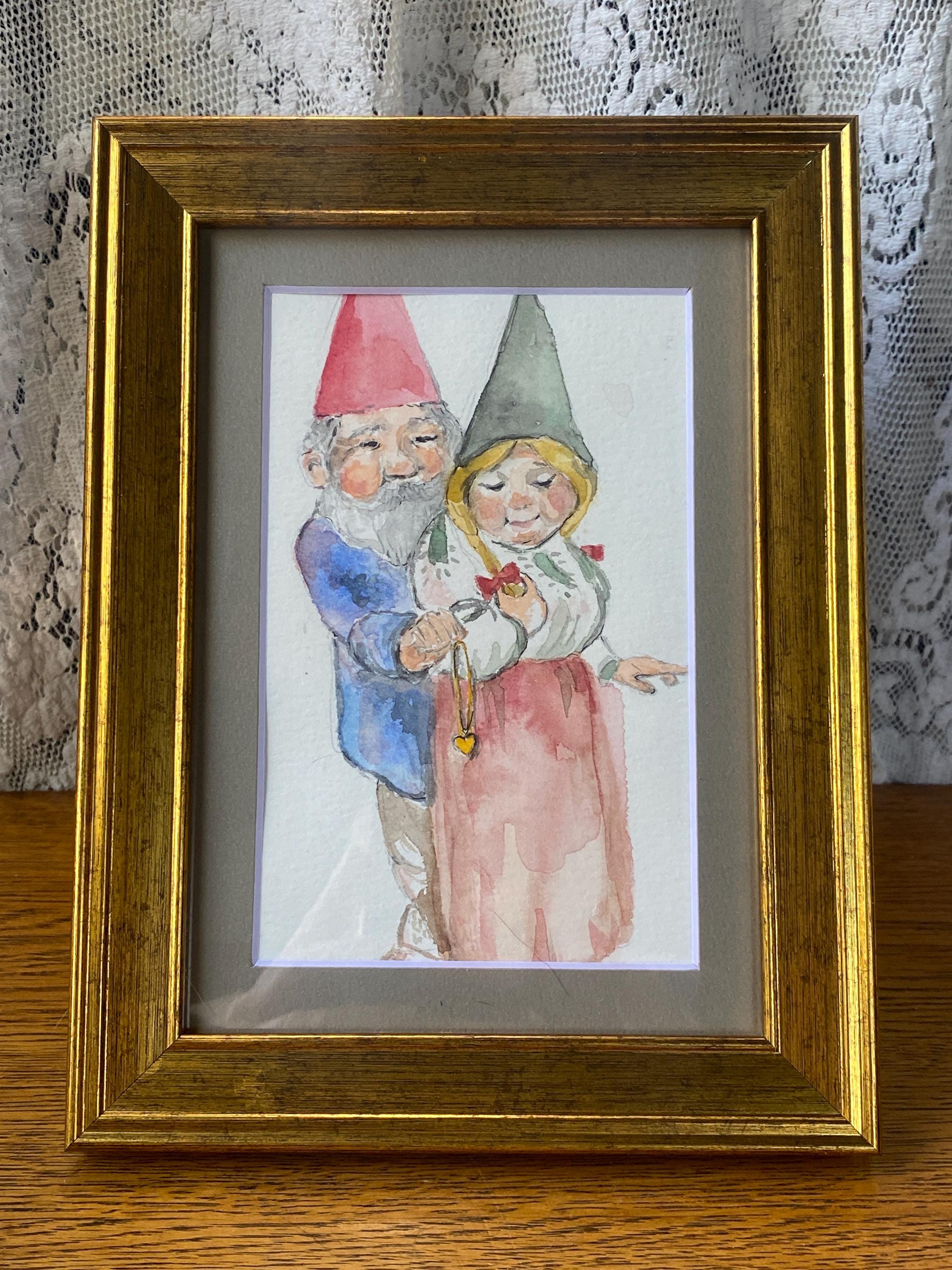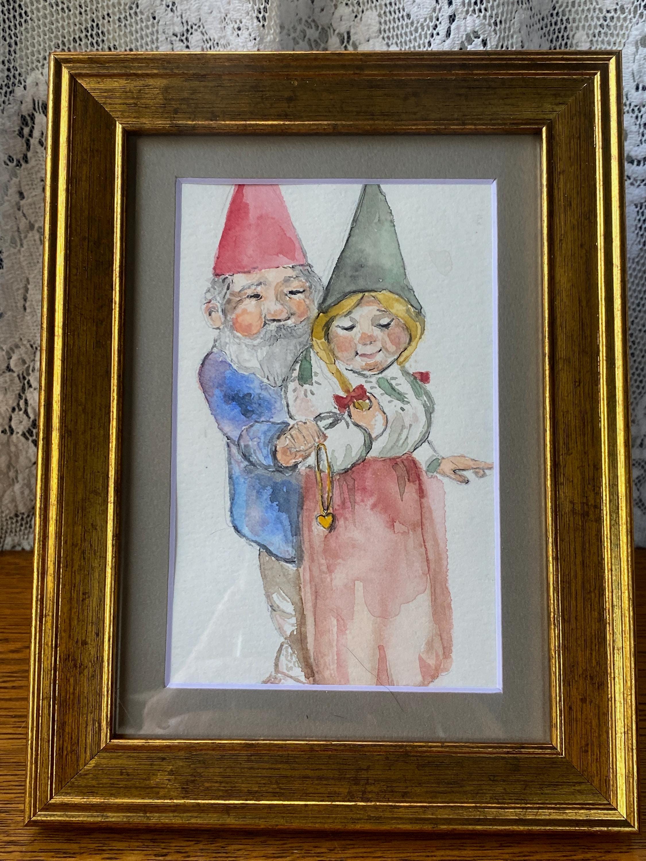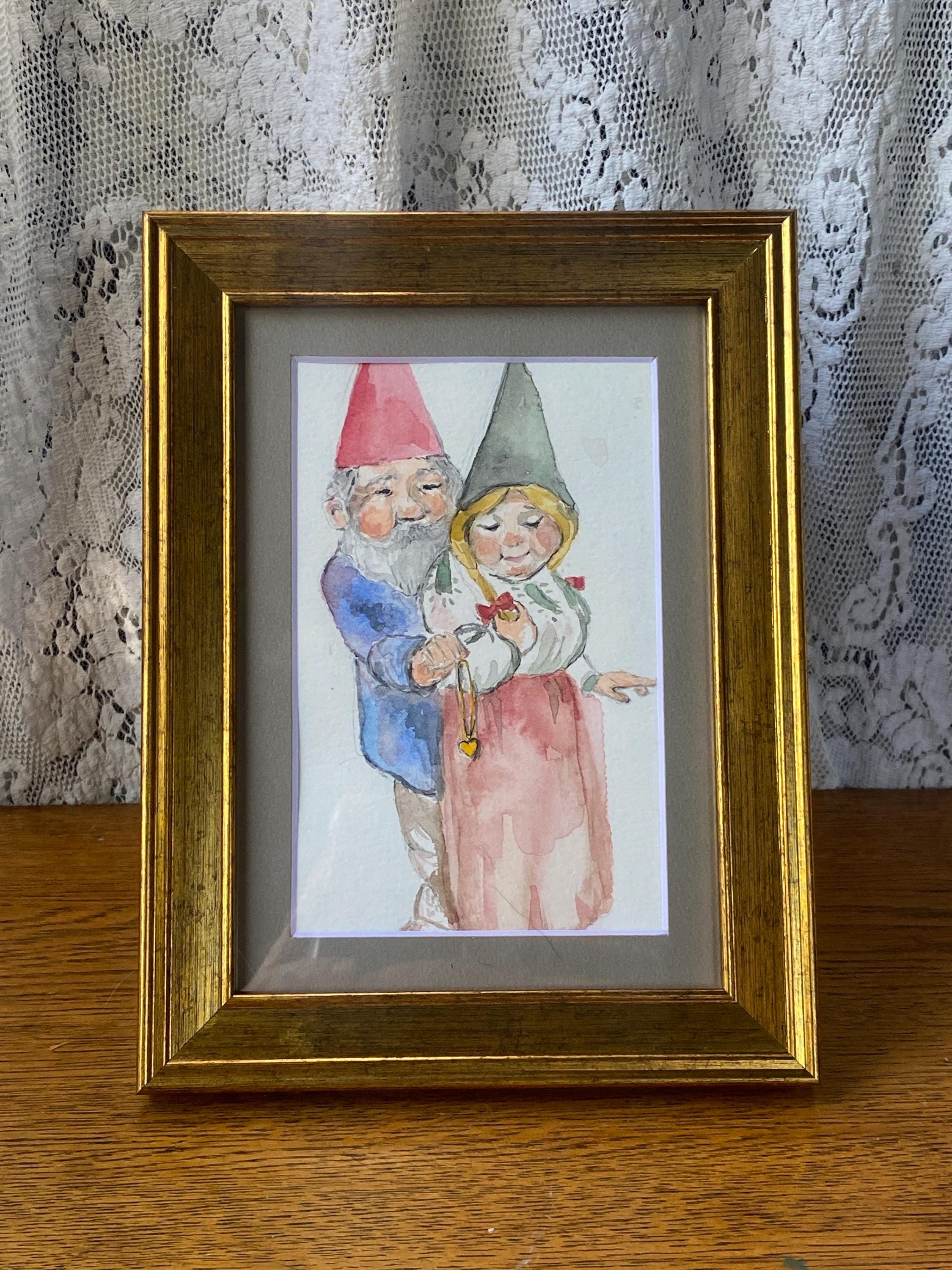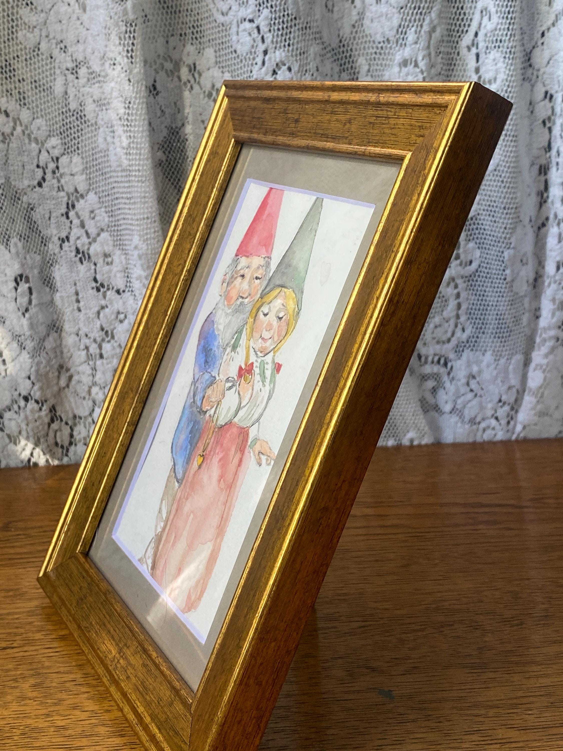 This cute little gnome couple would make a charming addition to a gallery wall! Painting in blue, red, and green with a touch of yellow. Original, signed painting/ not a print. 5X7 inches, matted and framed. Frame is vintage style, not vintage, and is lightweight. Better for hanging than standing.