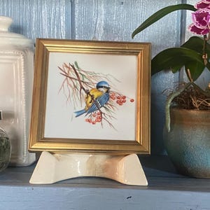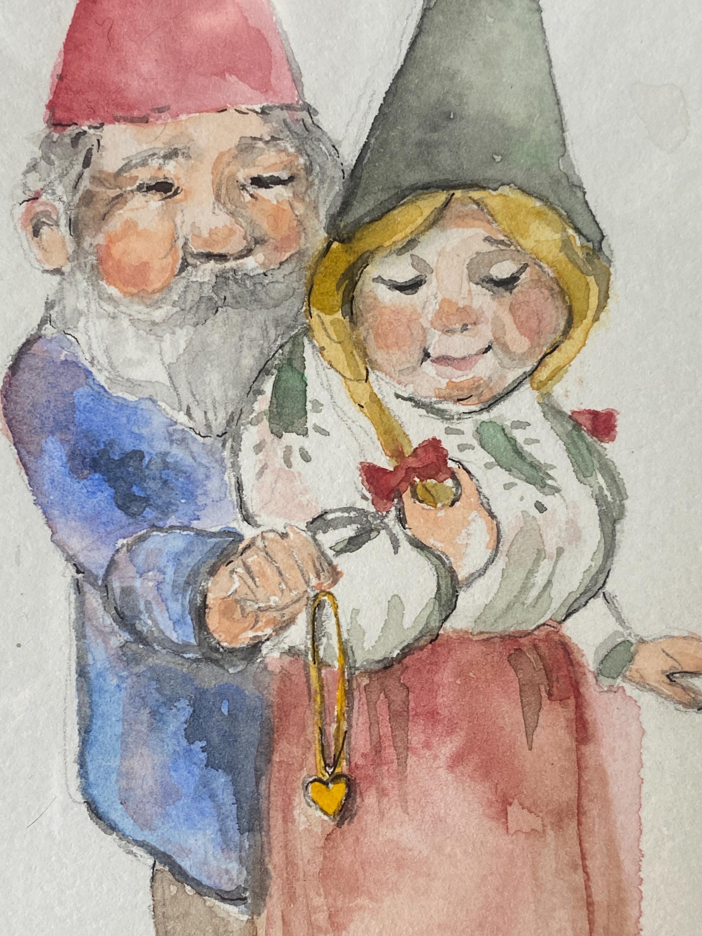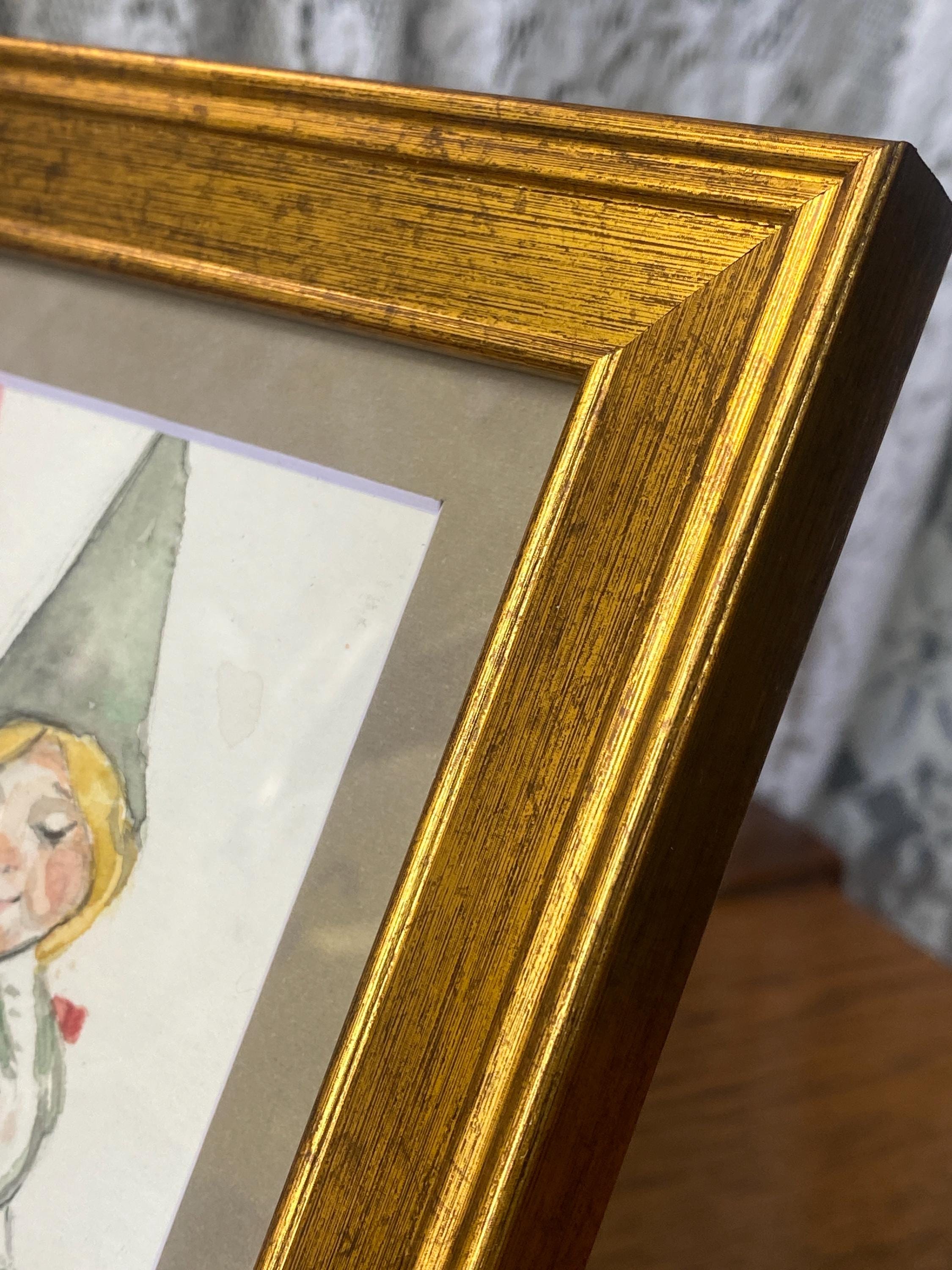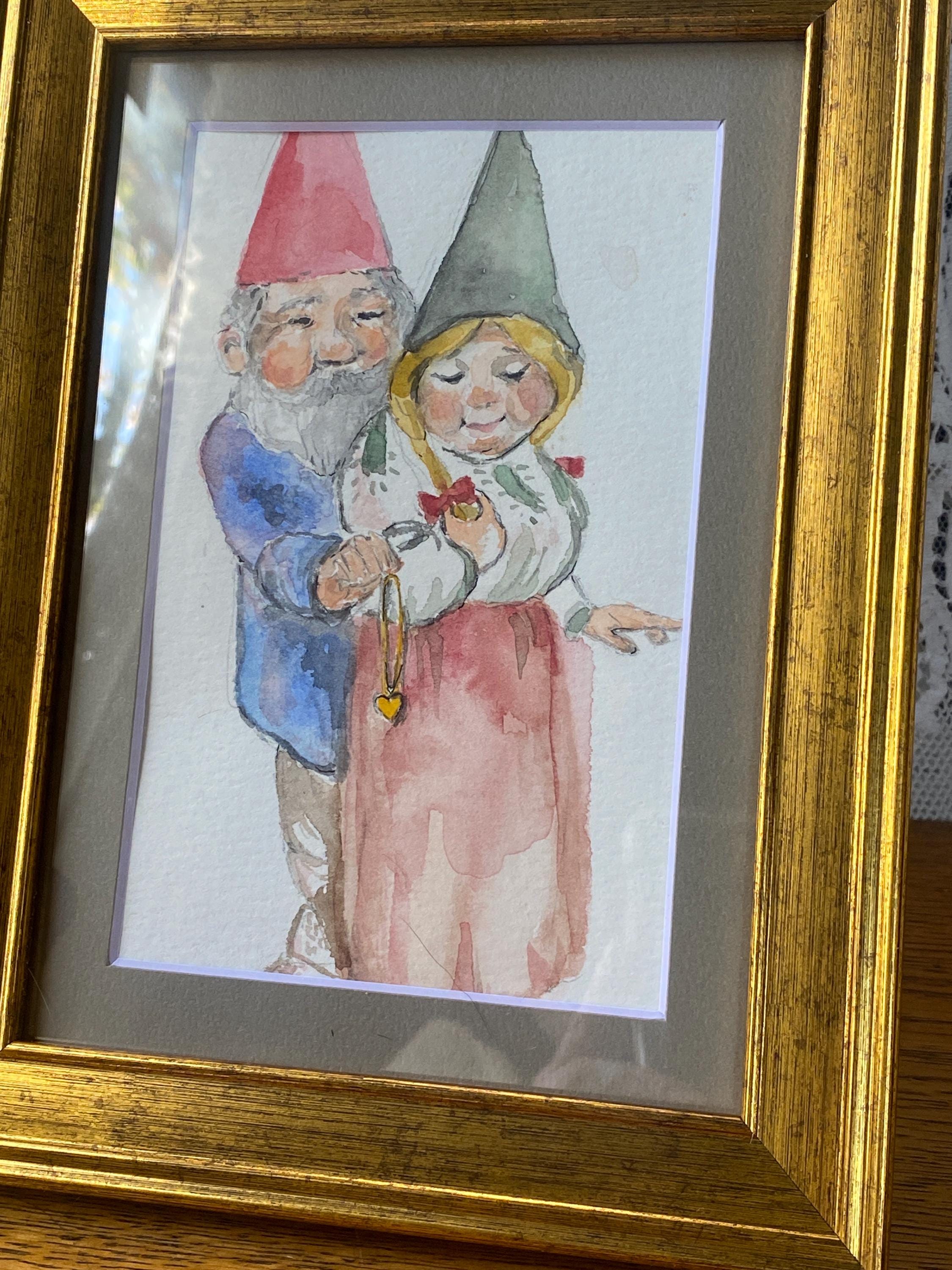 This cute little gnome couple would make a charming addition to a gallery wall! Painting in blue, red, and green with a touch of yellow. Original, signed painting/ not a print. 5X7 inches, matted and framed. Frame is vintage style, not vintage, and is lightweight. Better for hanging than standing.