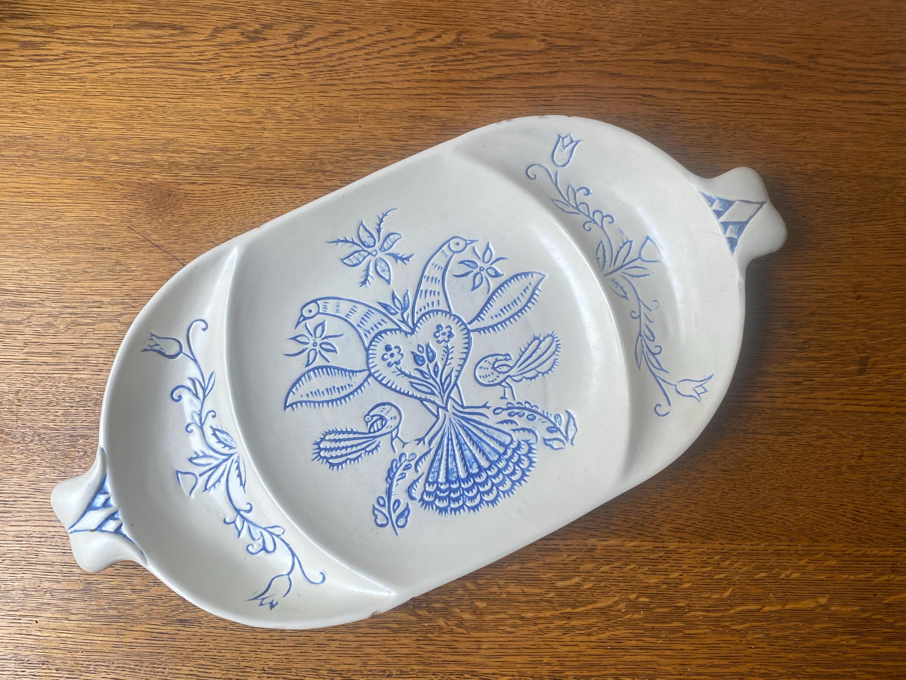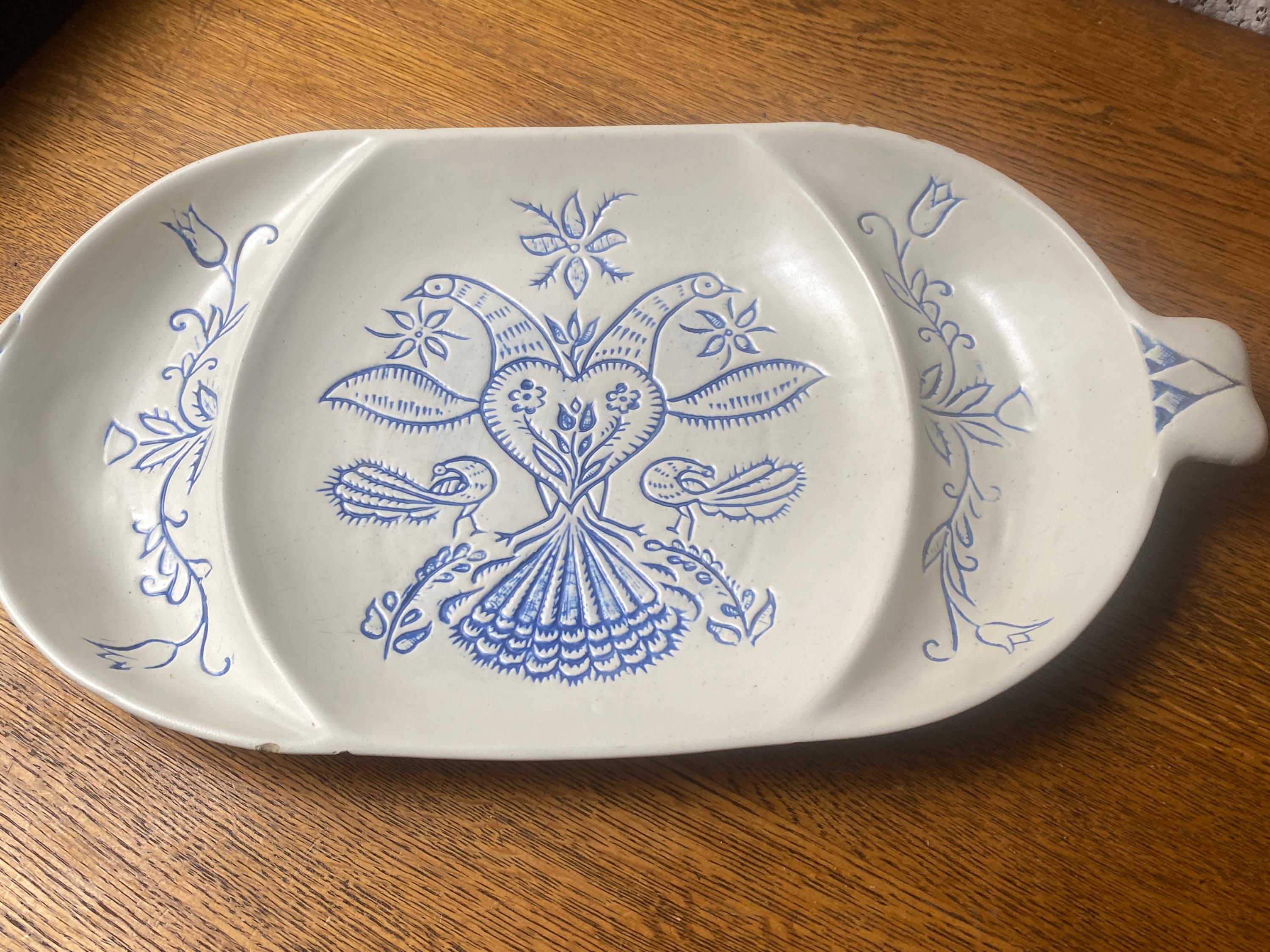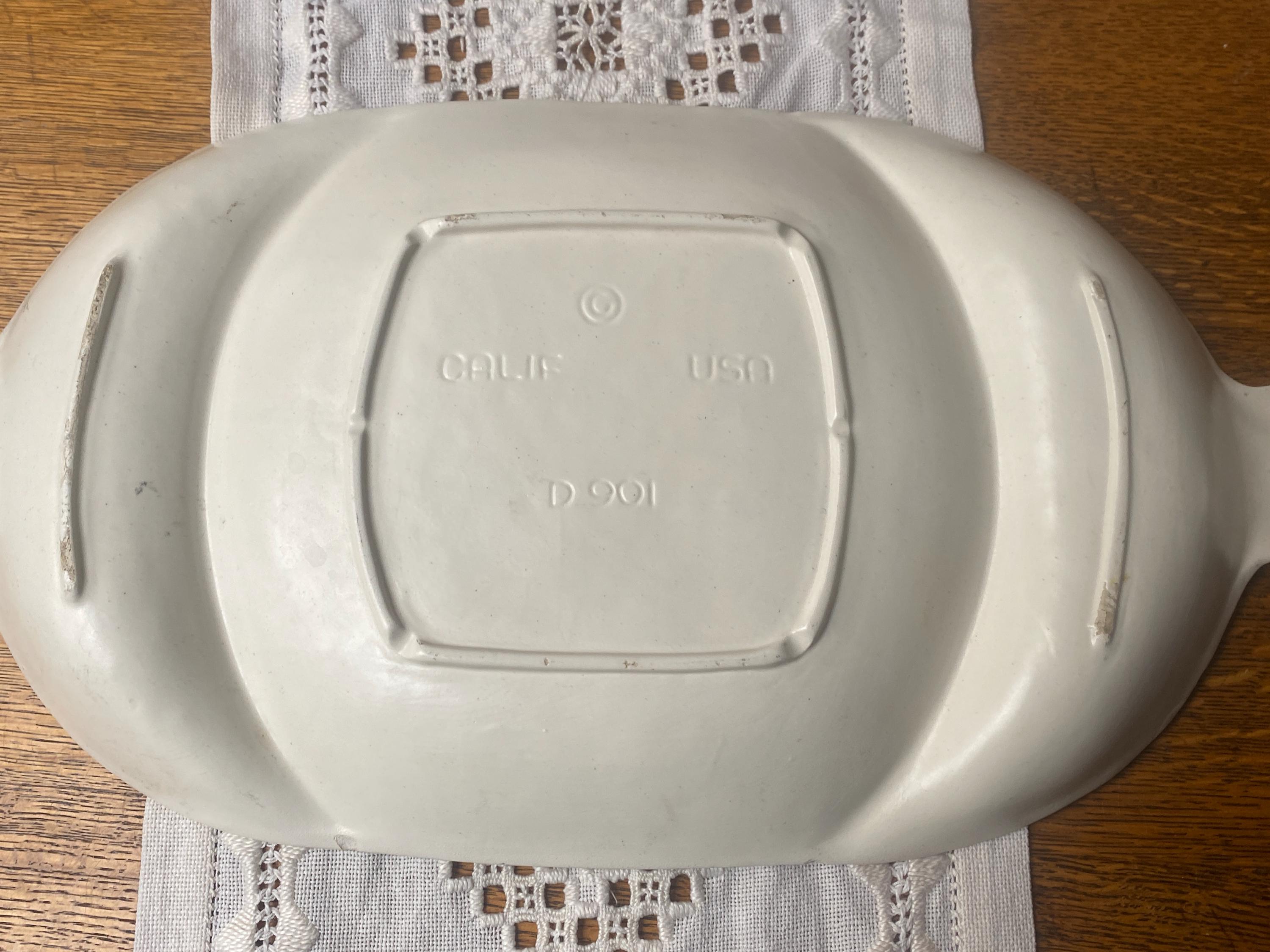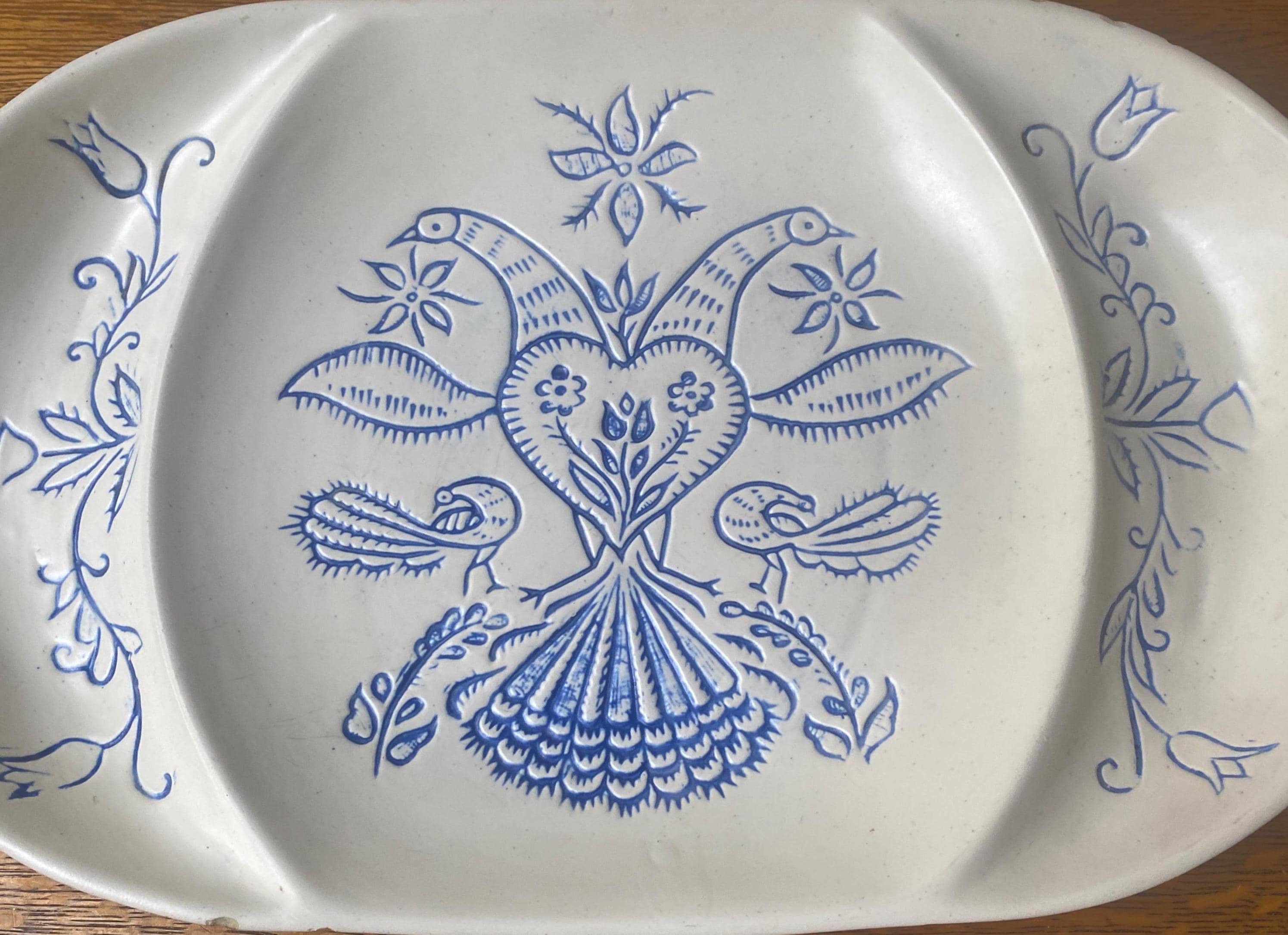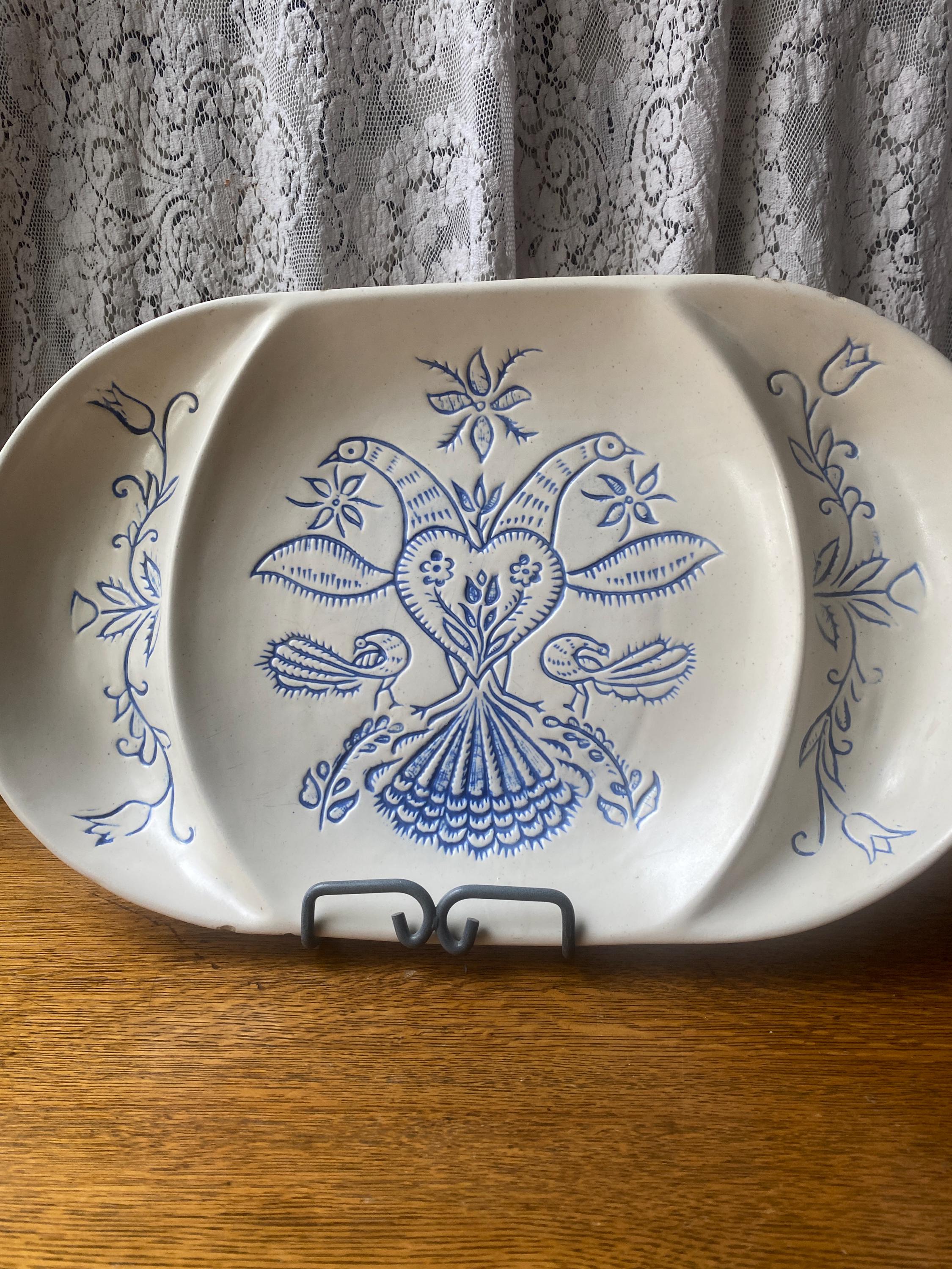 Cute vintage California Pottery platter (D901) in a folk art blue pattern on white background. It has some chips along edges and on bottom (please see photos). Approximately 20X10X1.5